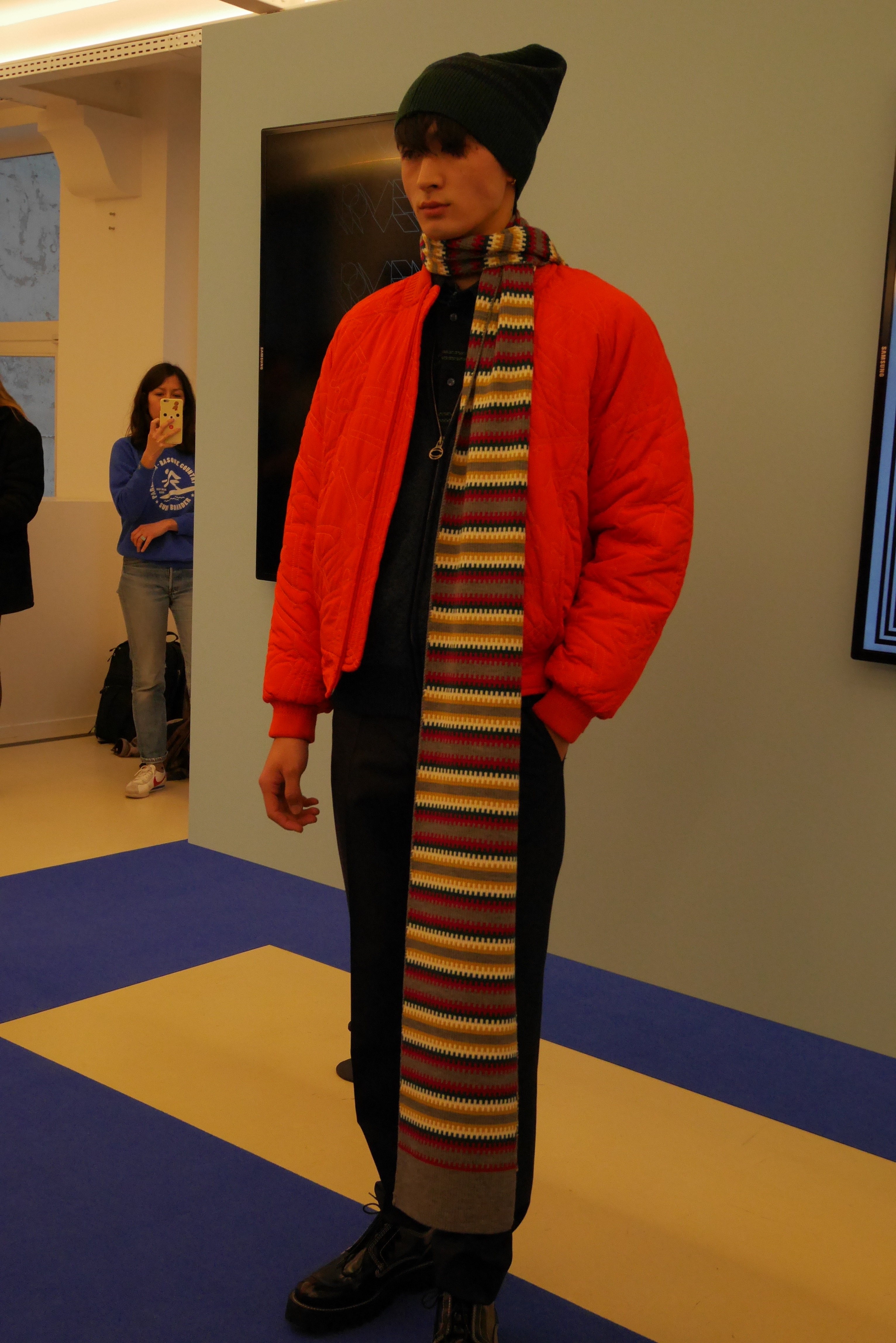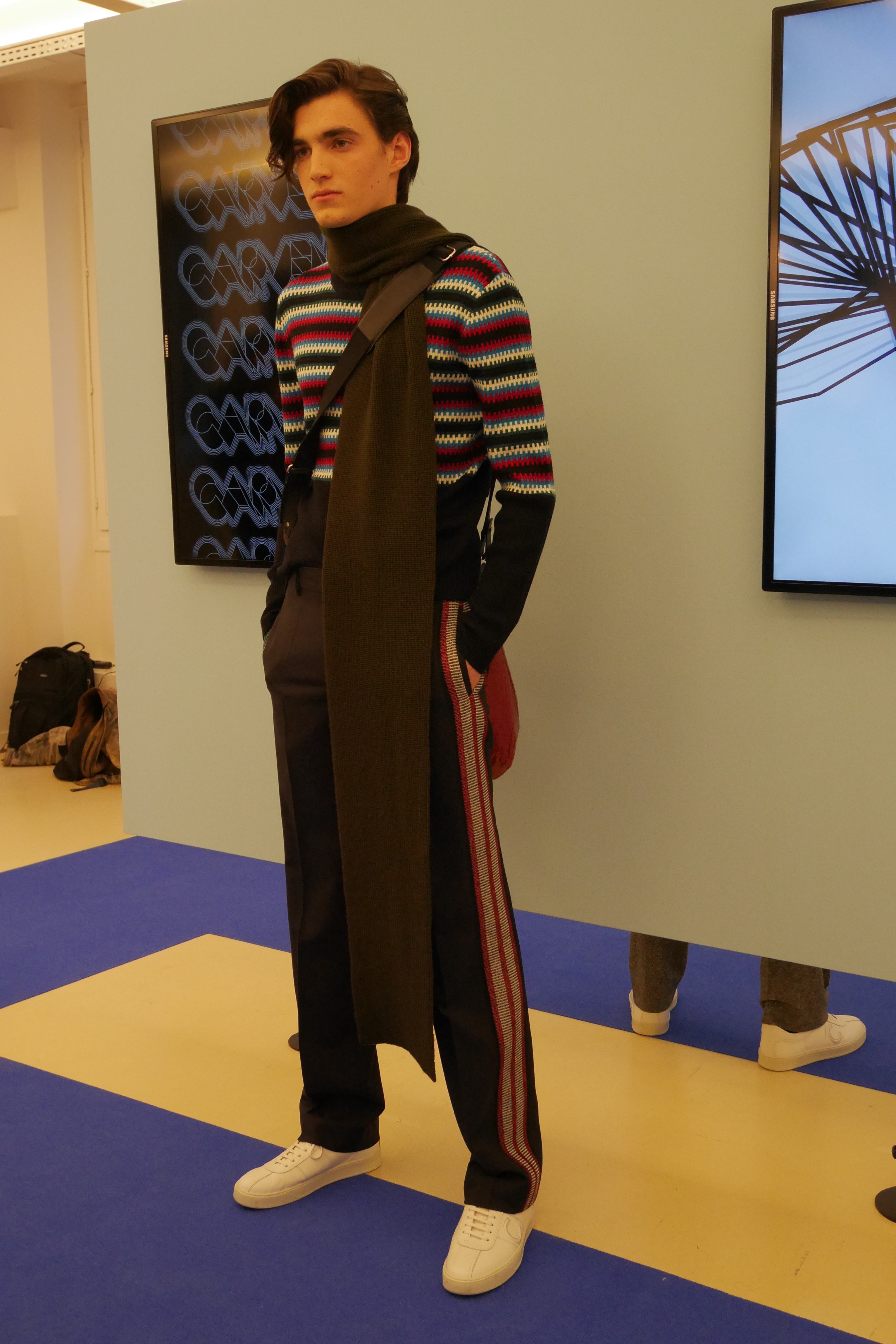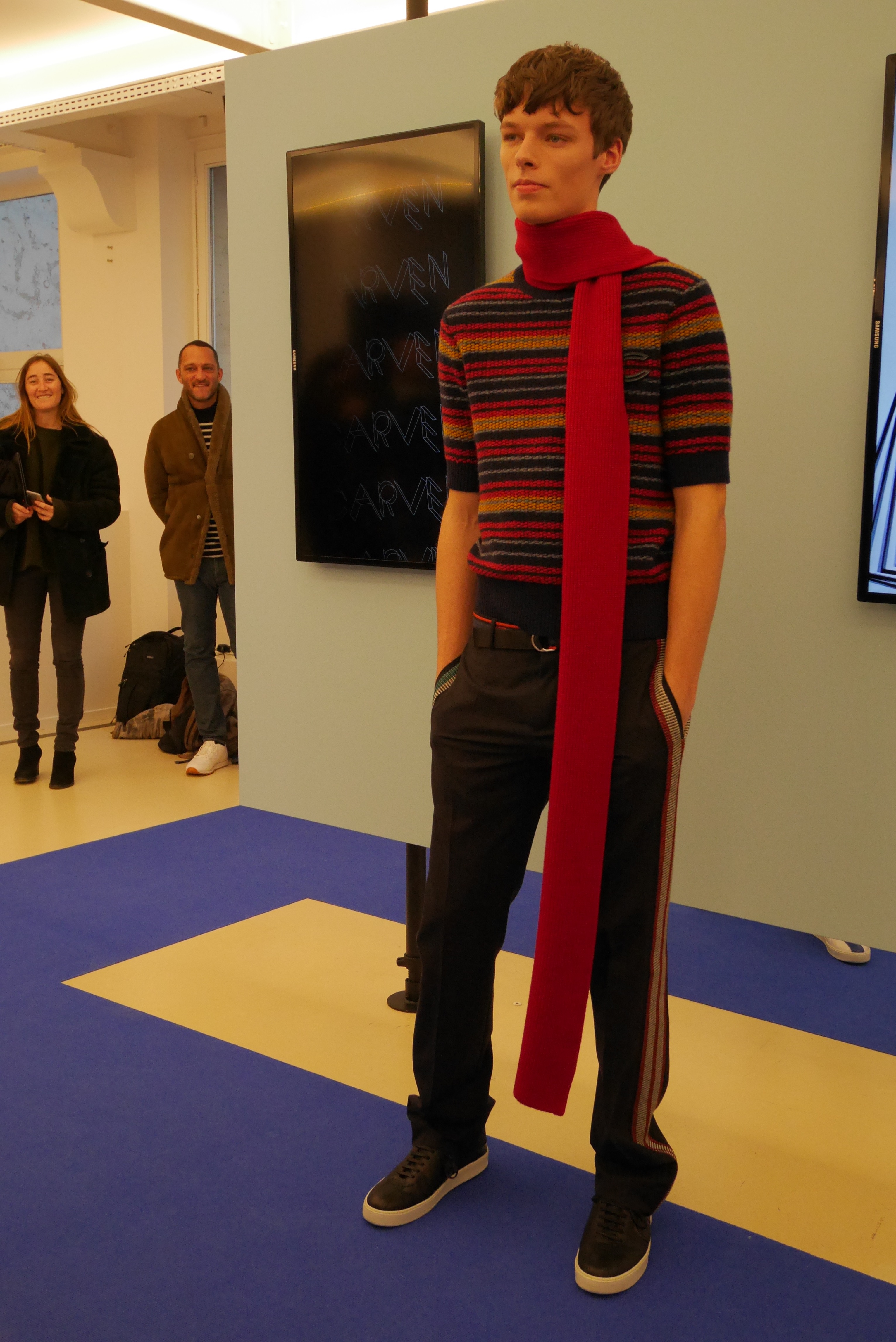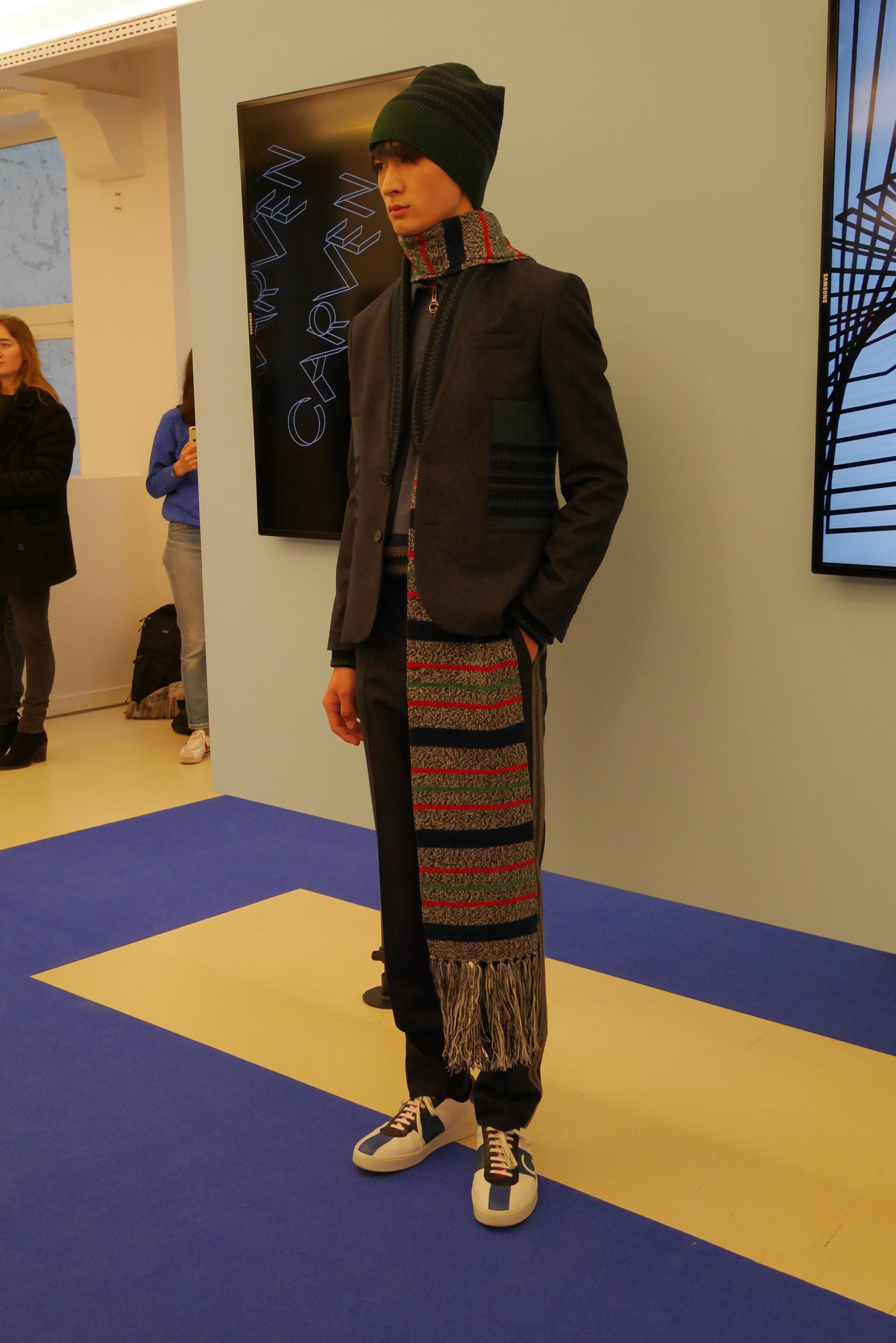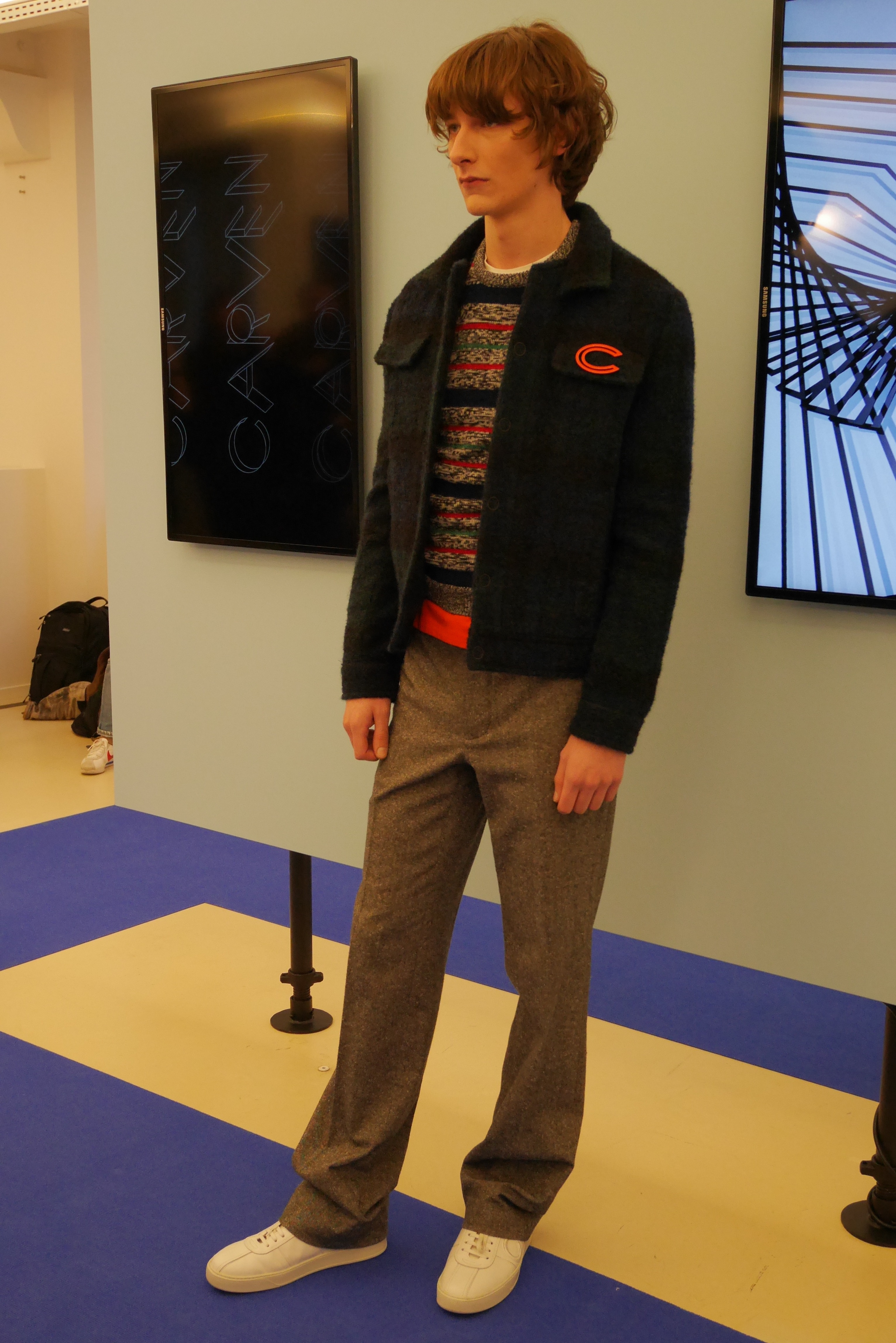 The Carven look gives men a modern, contemporary allure. It’s truly a collection that can be worn every day. The silhouettes are deeply “so British”, casual/sport chic, with a color palette that includes strong oranges, fir green, red, hard blue, gray and mustard yellow. In terms of materials and patterns, we mainly feature chunky knits and stripes.