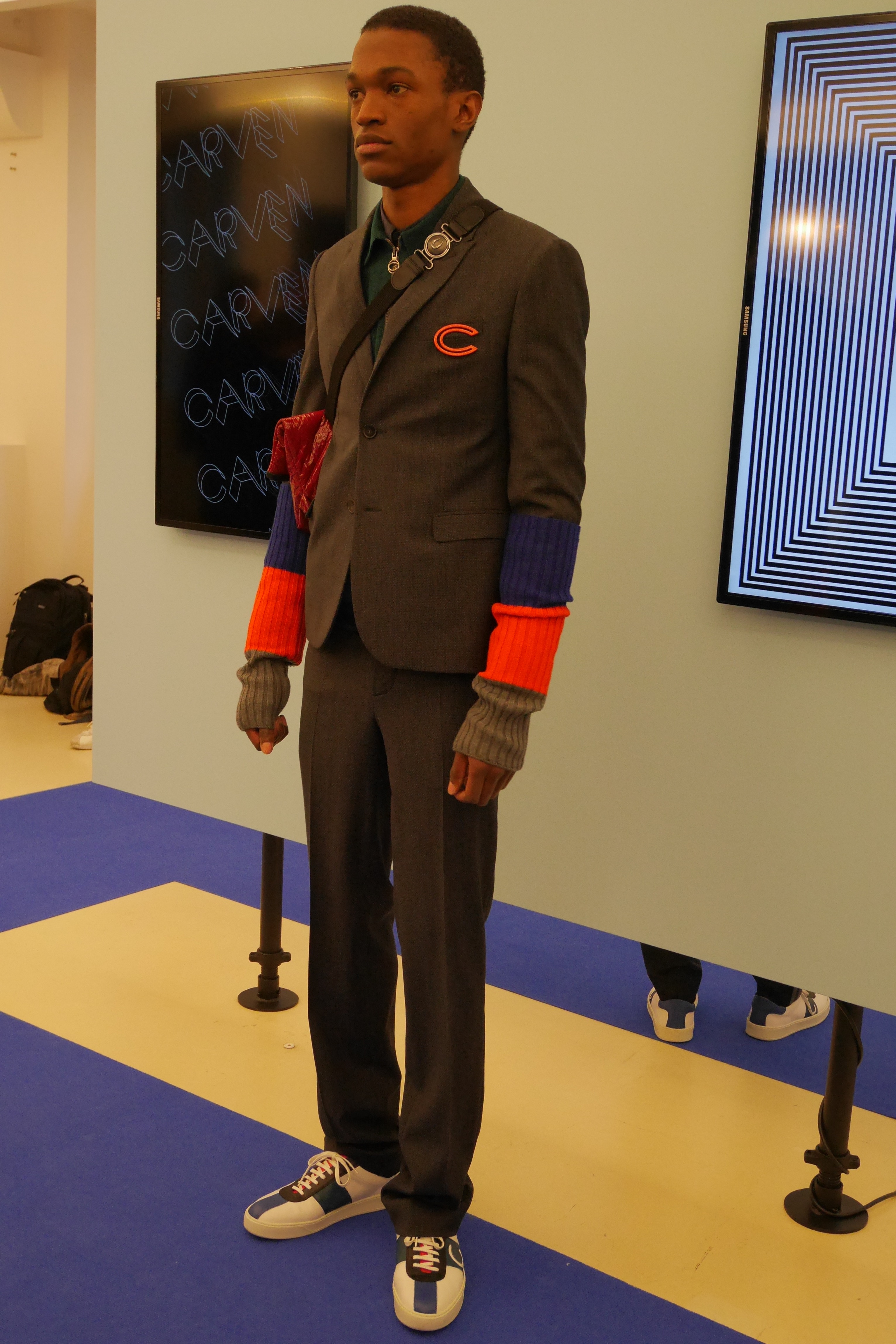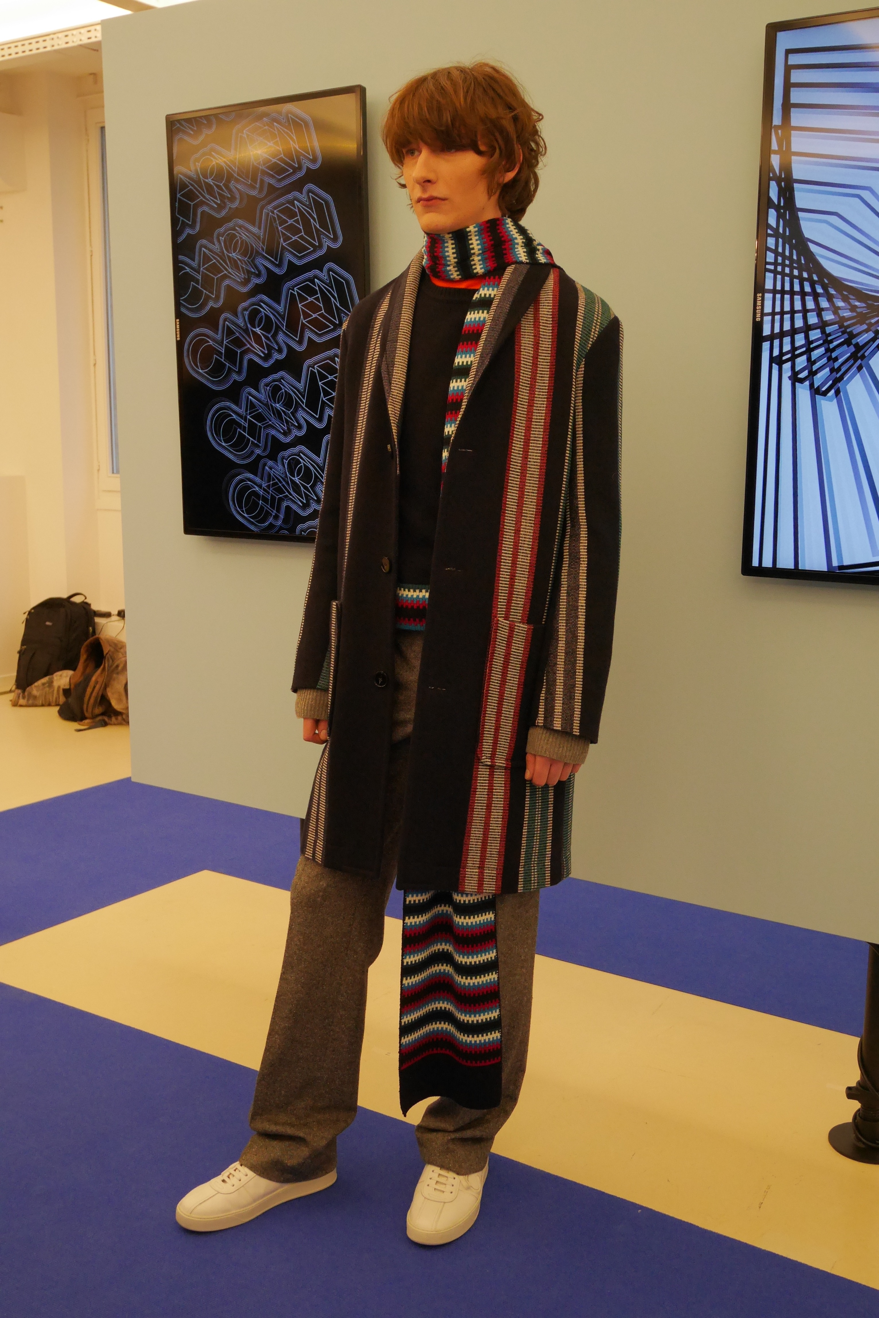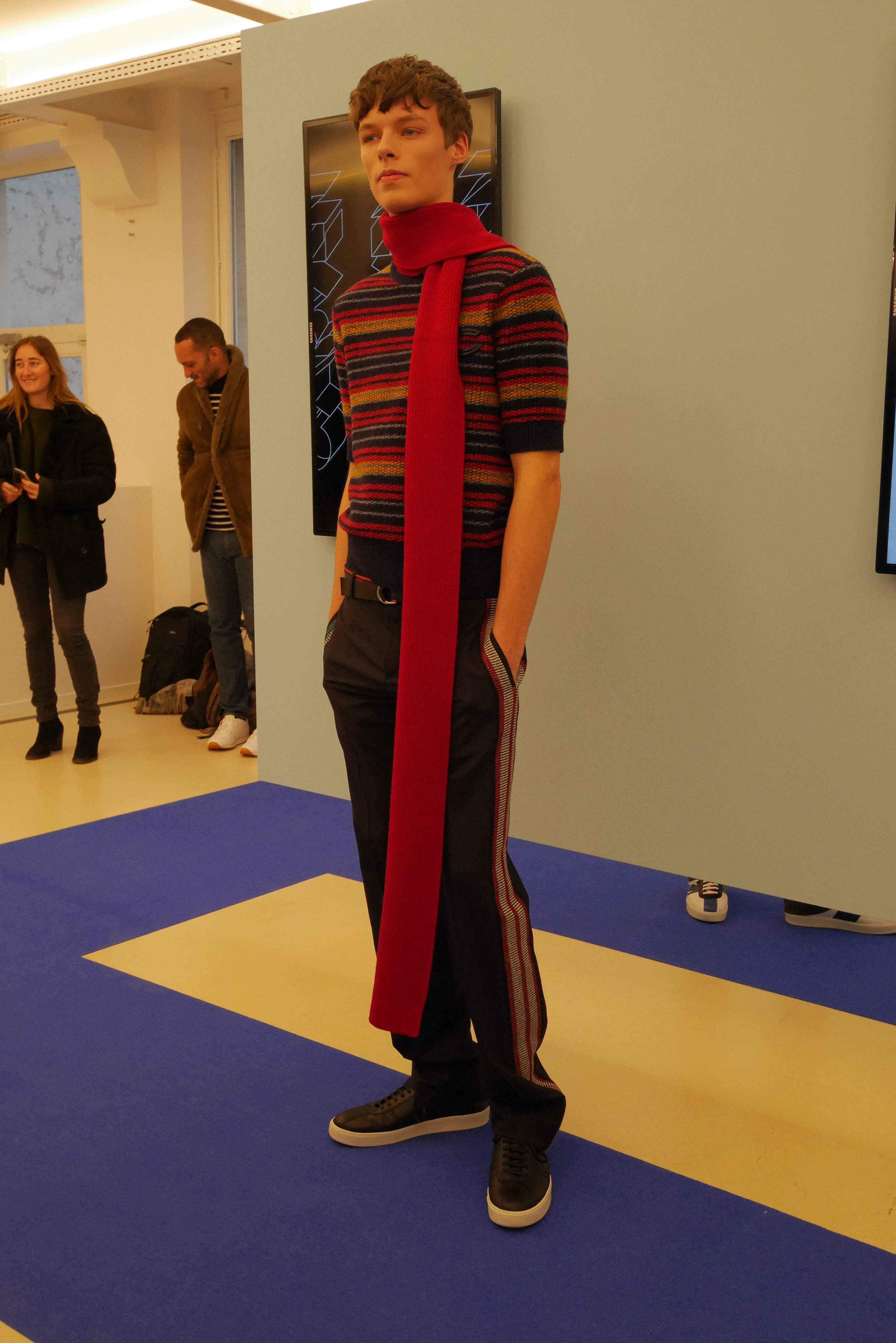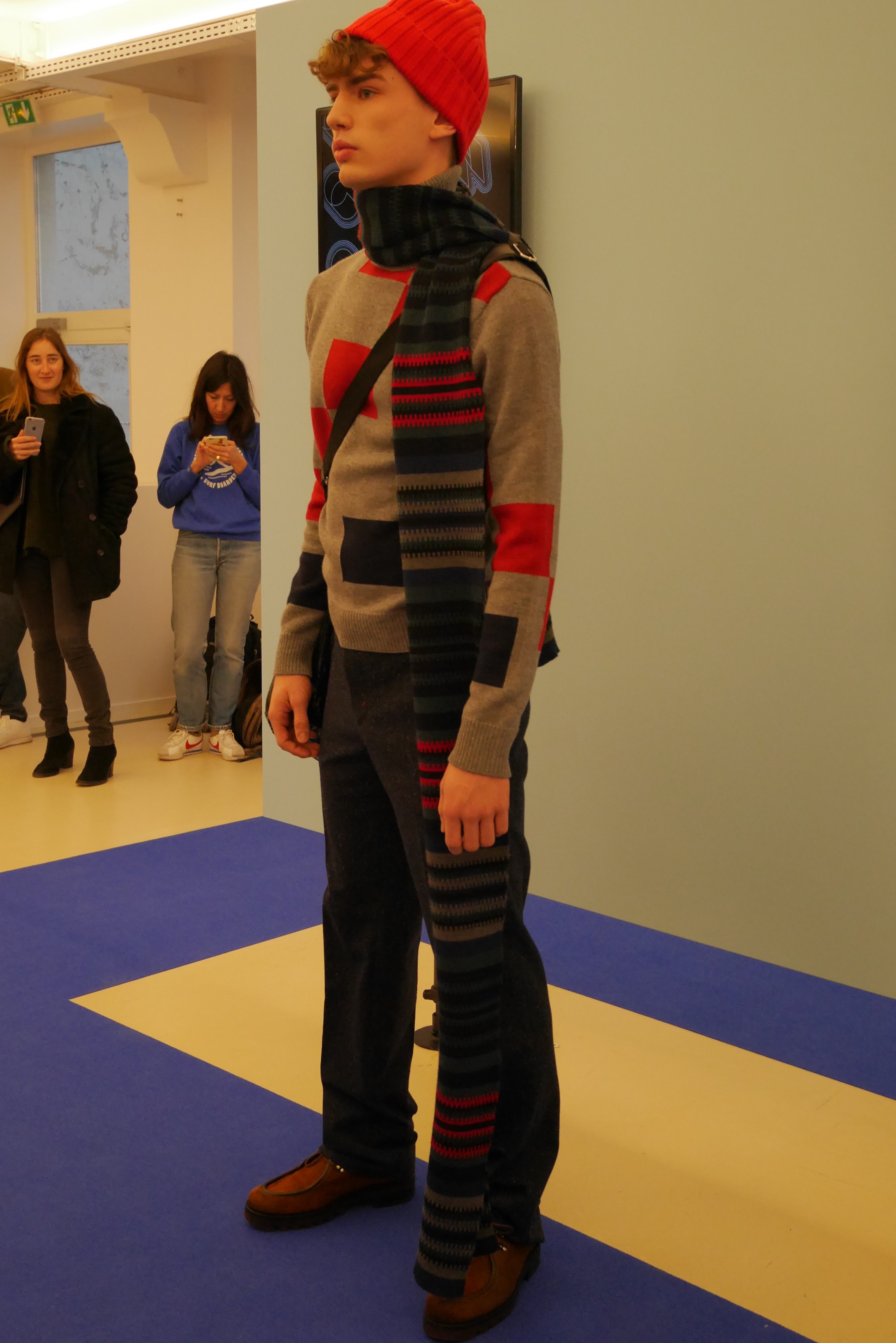 The Carven look gives men a modern, contemporary allure. It’s truly a collection that can be worn every day. The silhouettes are deeply “so British”, casual/sport chic, with a color palette that includes strong oranges, fir green, red, hard blue, gray and mustard yellow. In terms of materials and patterns, we mainly feature chunky knits and stripes.