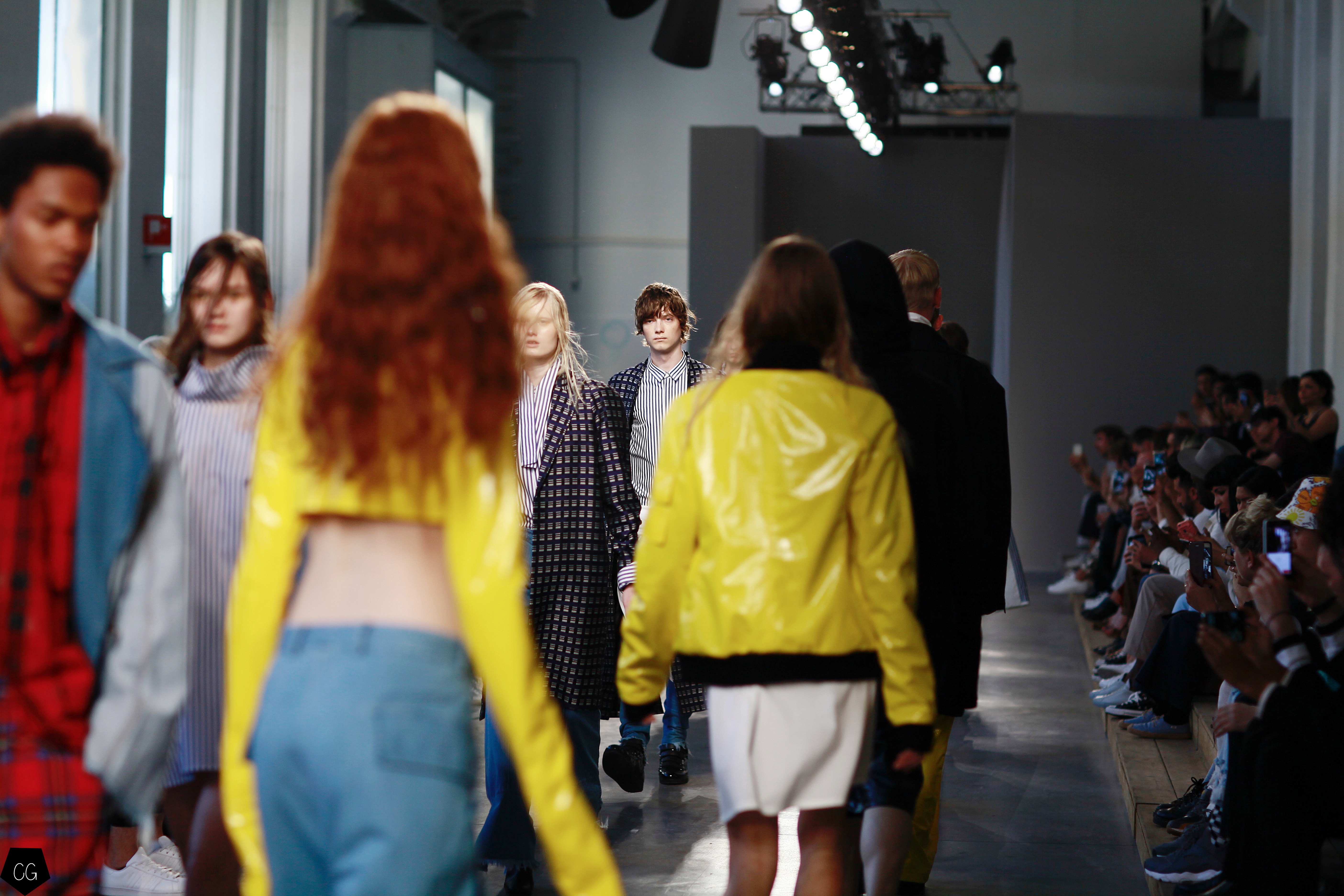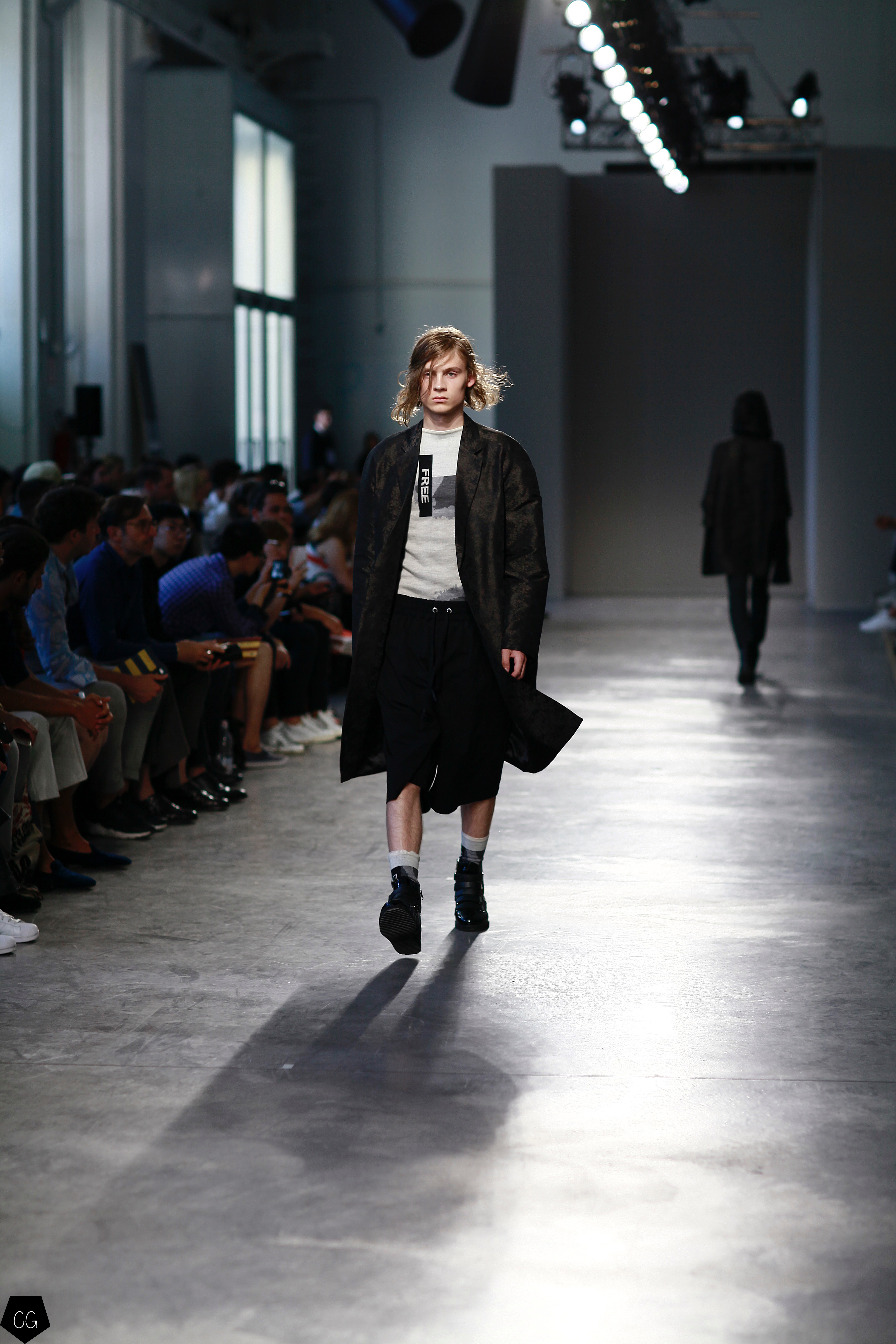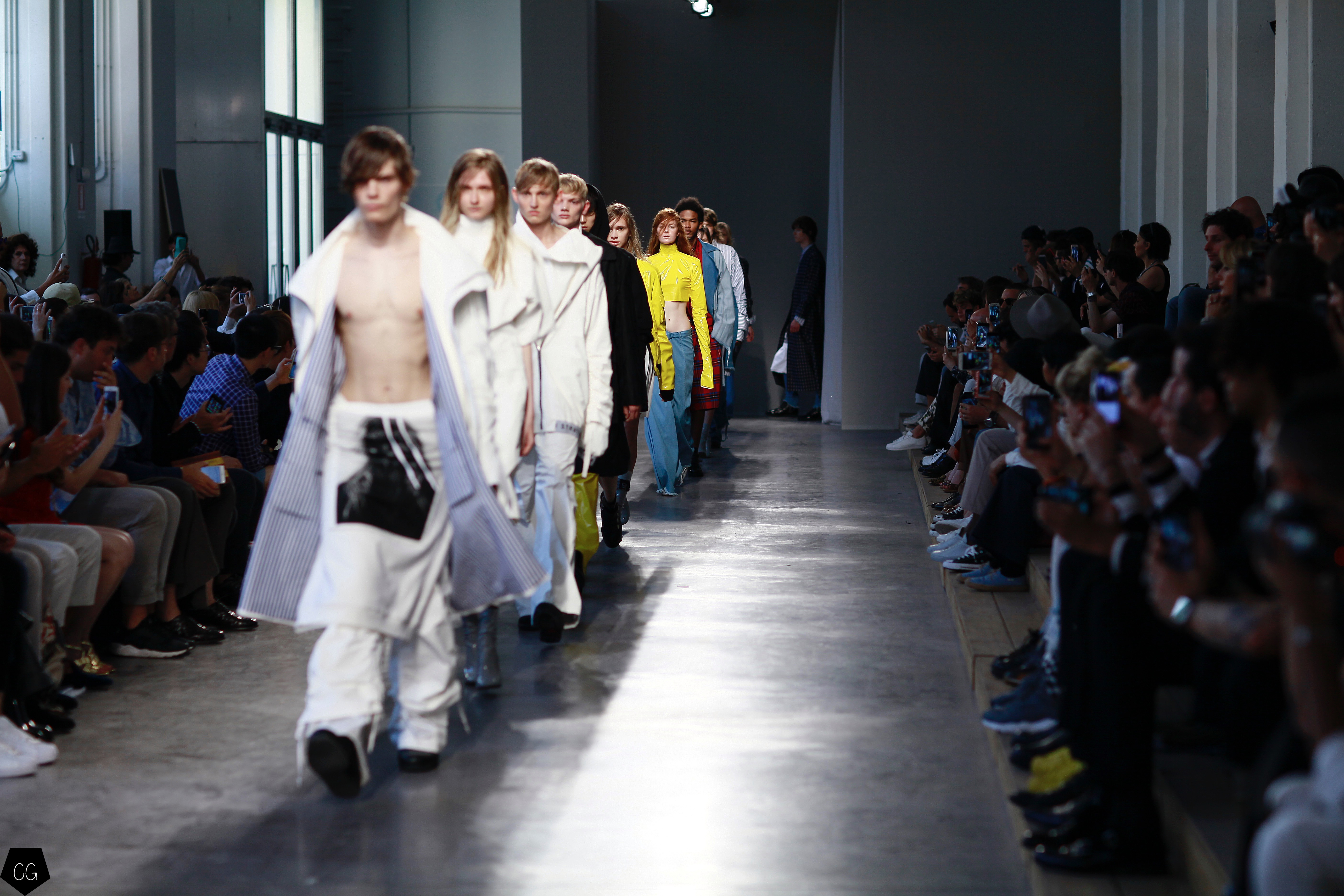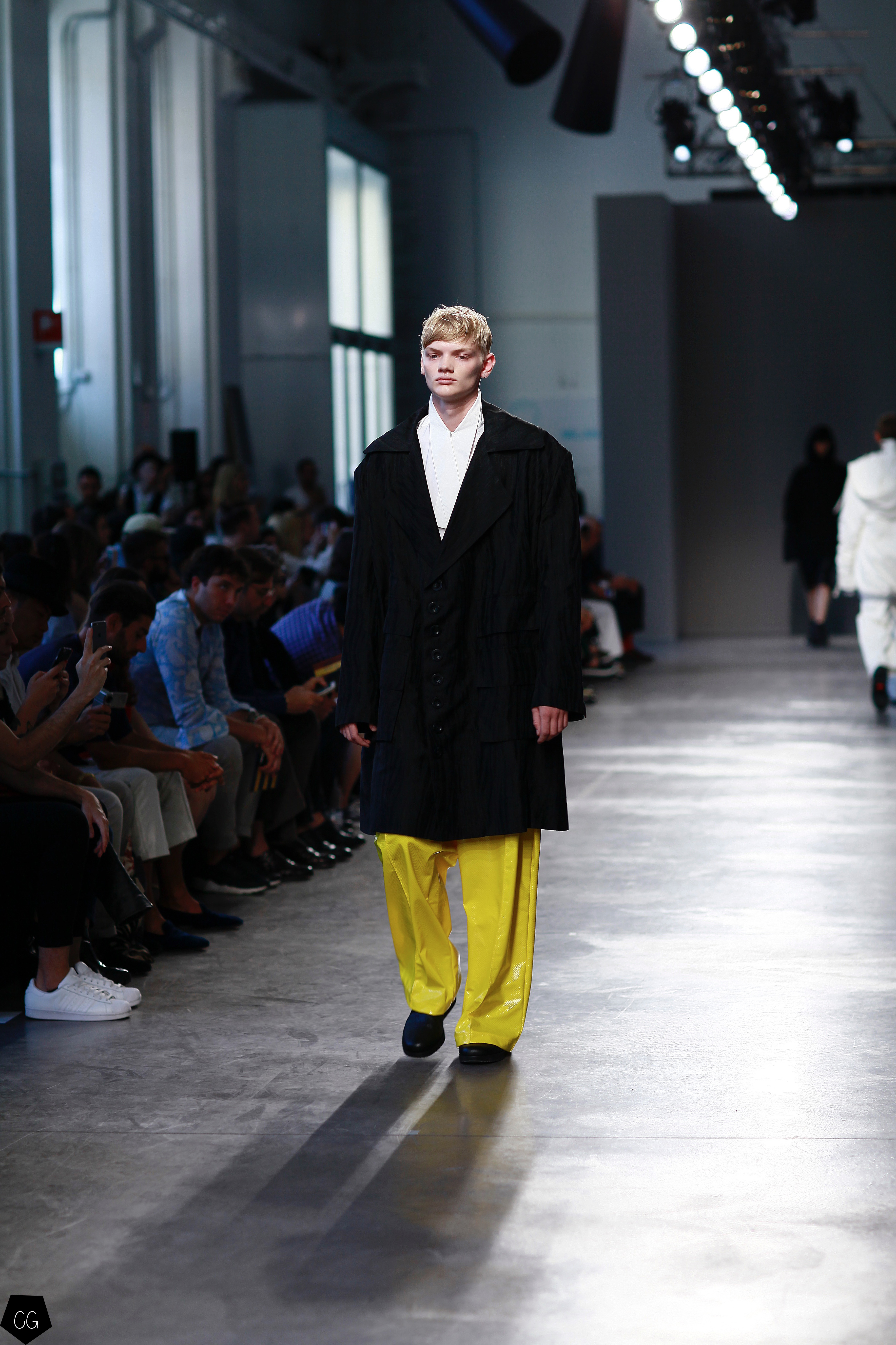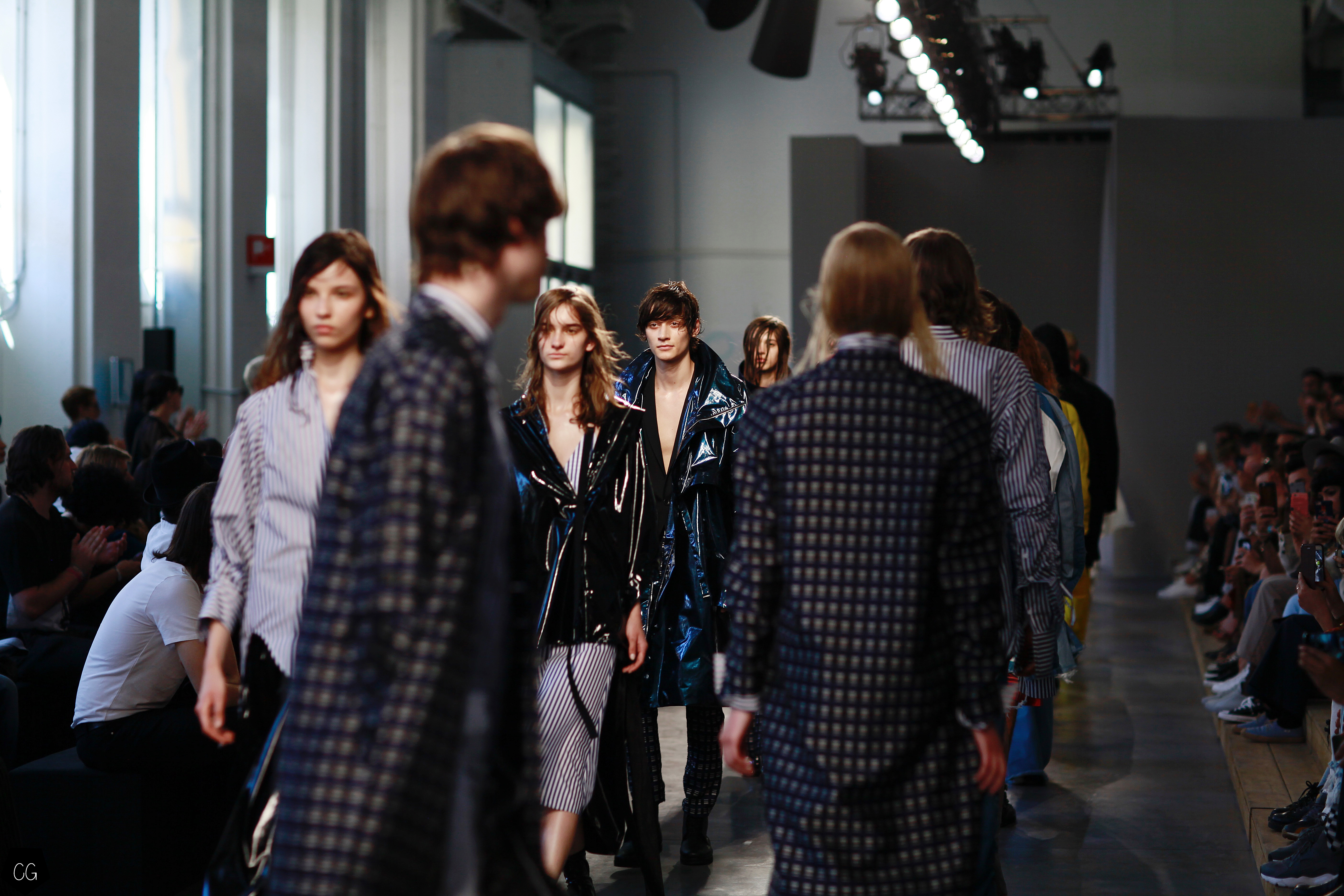 They invented a new masculine silhouette where genders blurred, masculine and feminine codes disappeared. The preferred colors were white, black, blue and gray, with a few models in bright yellow, mustard yellow and red tartan. The show featured a series of relaxed silhouettes, with oversized waists, long coats, zip-up jackets, long tunics, long sweaters and ultra-long sleeves, worn on their own or over pants or Bermuda shorts.
