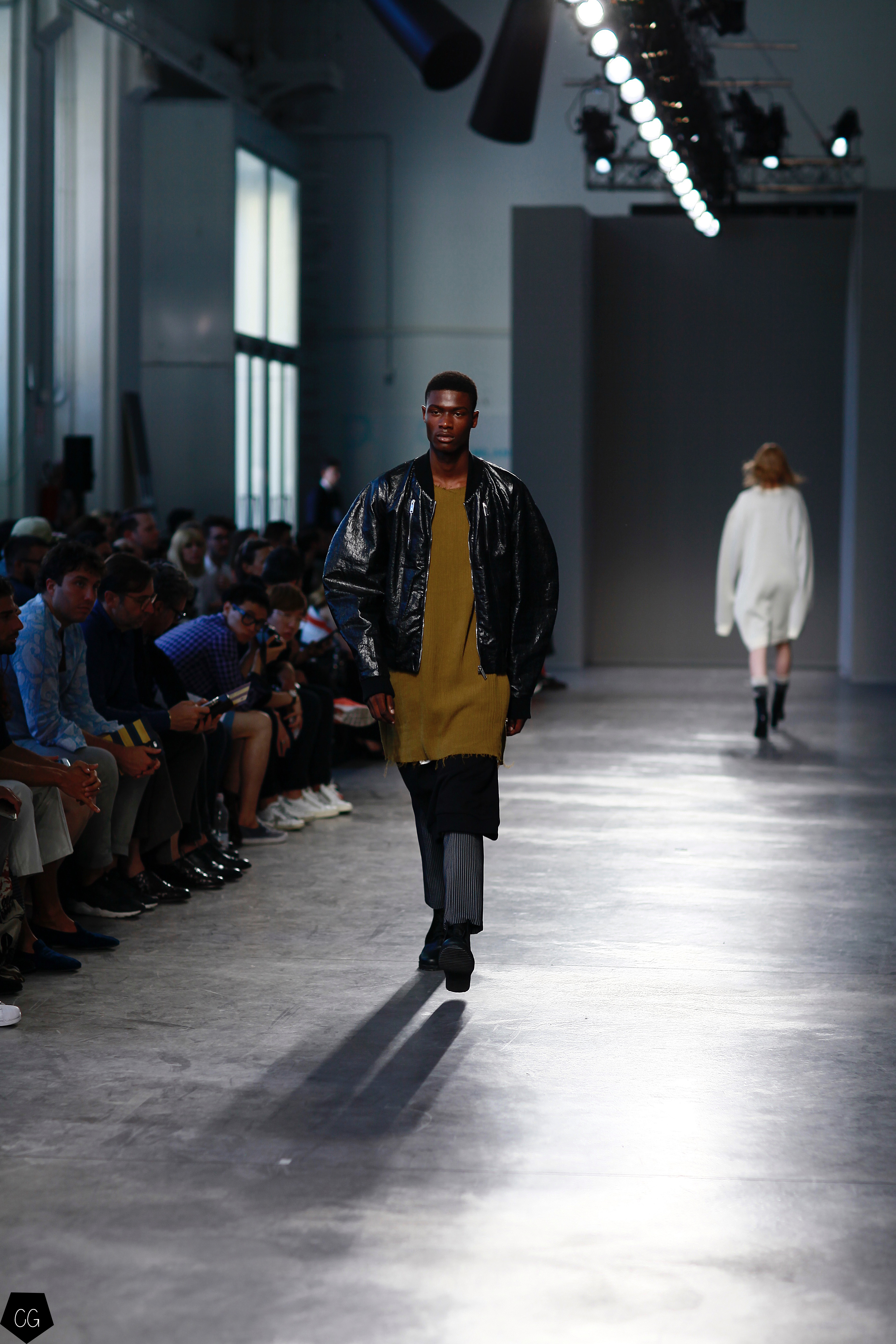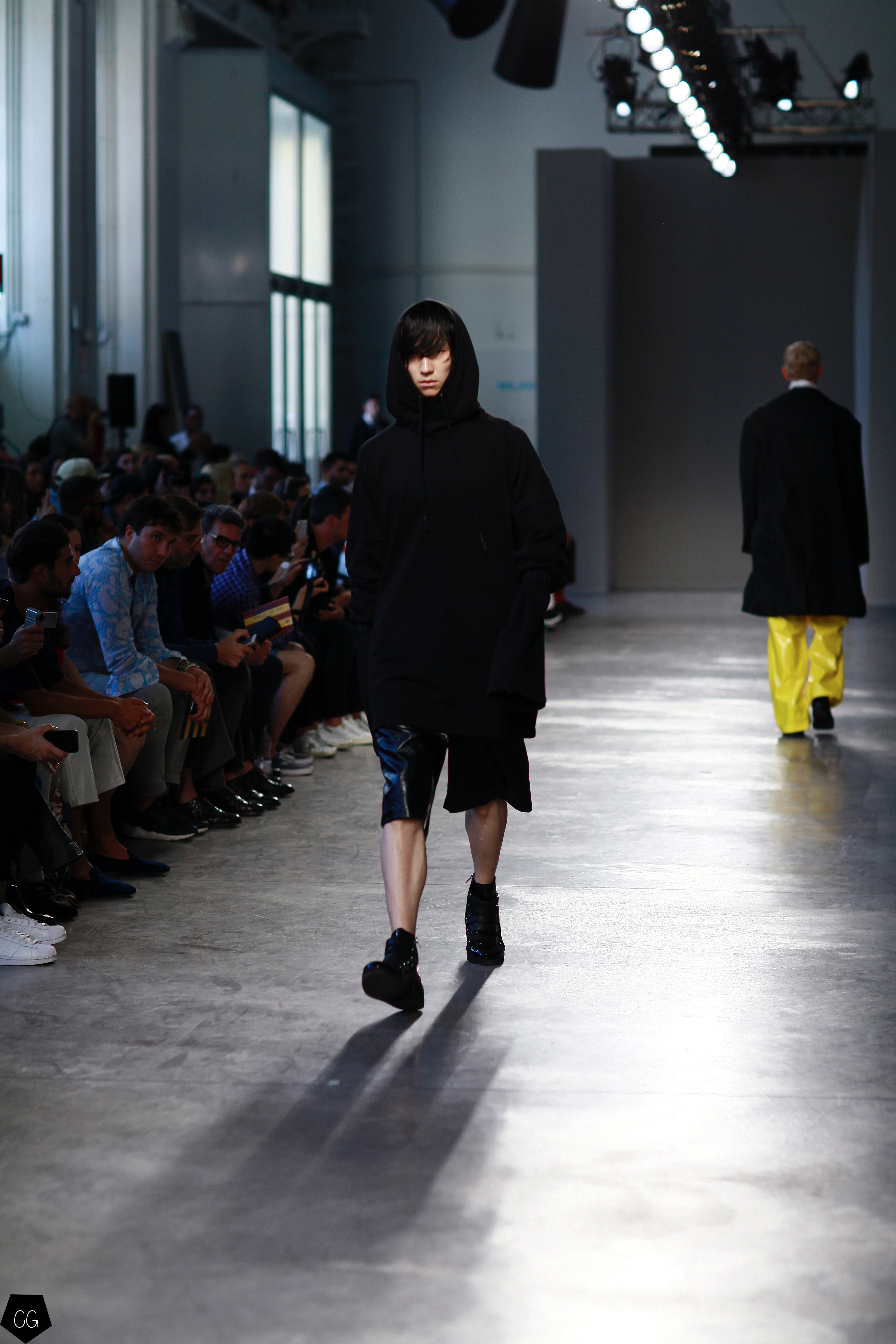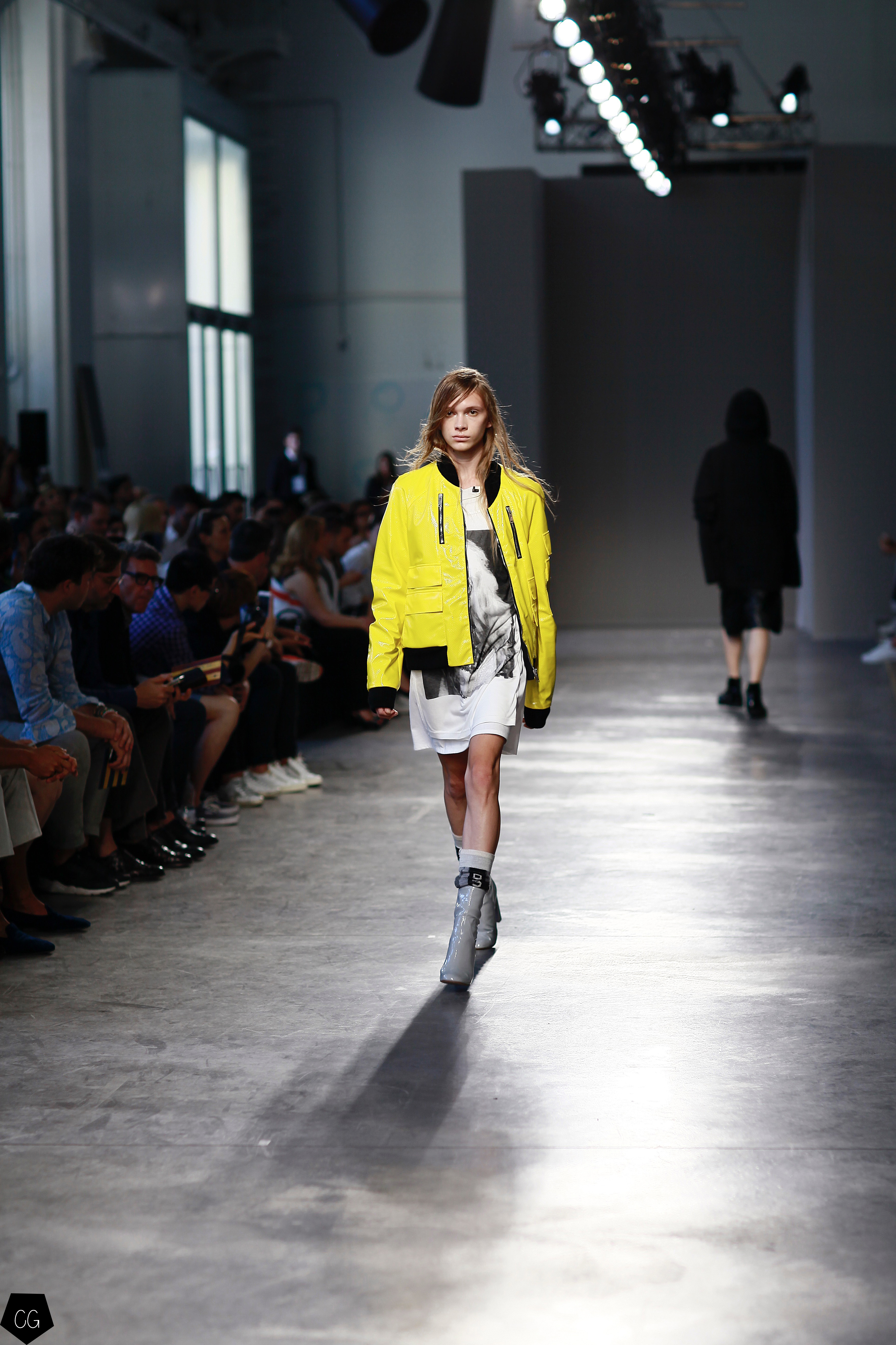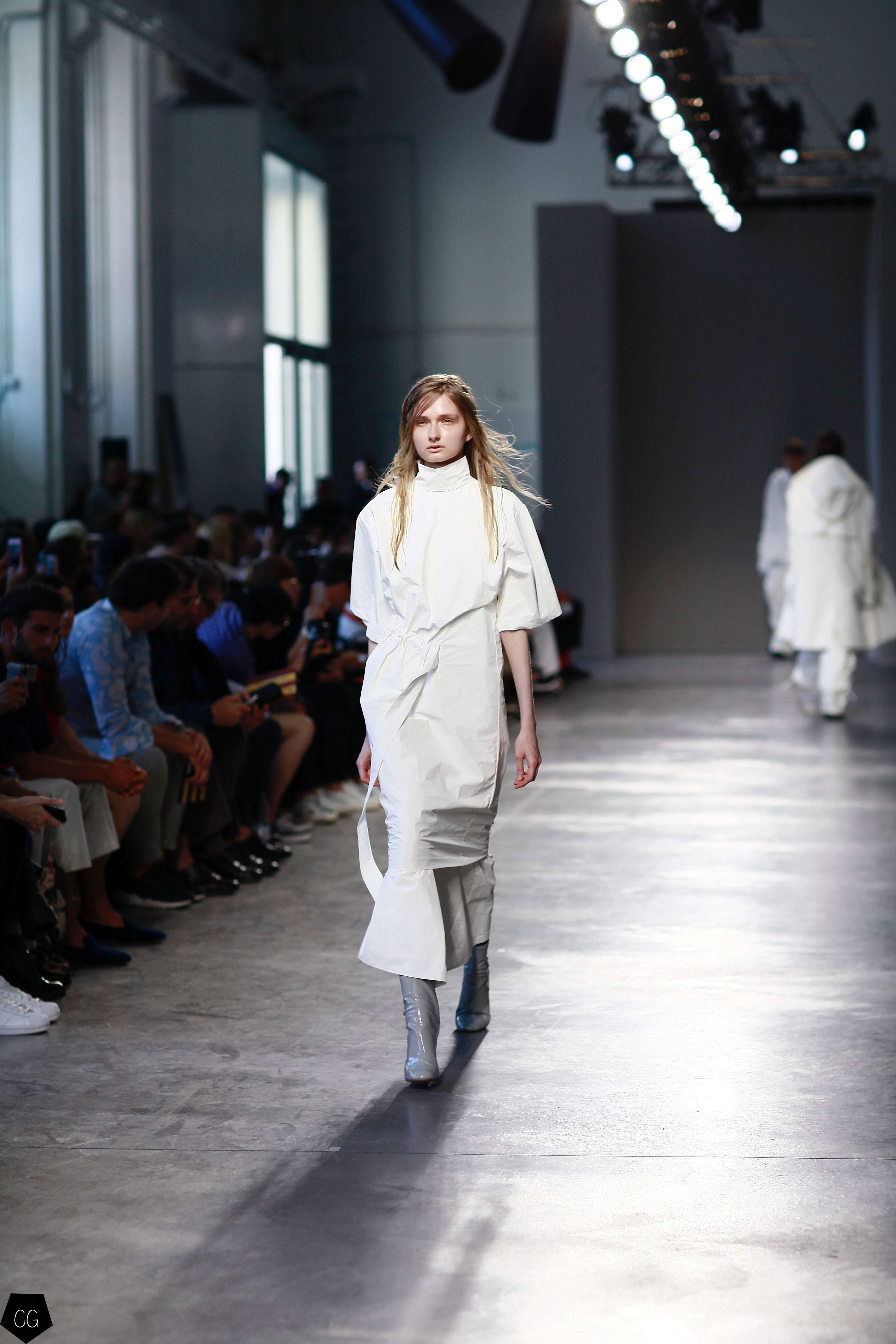 They invented a new masculine silhouette where genders blurred, masculine and feminine codes disappeared. The preferred colors were white, black, blue and gray, with a few models in bright yellow, mustard yellow and red tartan. The show featured a series of relaxed silhouettes, with oversized waists, long coats, zip-up jackets, long tunics, long sweaters and ultra-long sleeves, worn on their own or over pants or Bermuda shorts.