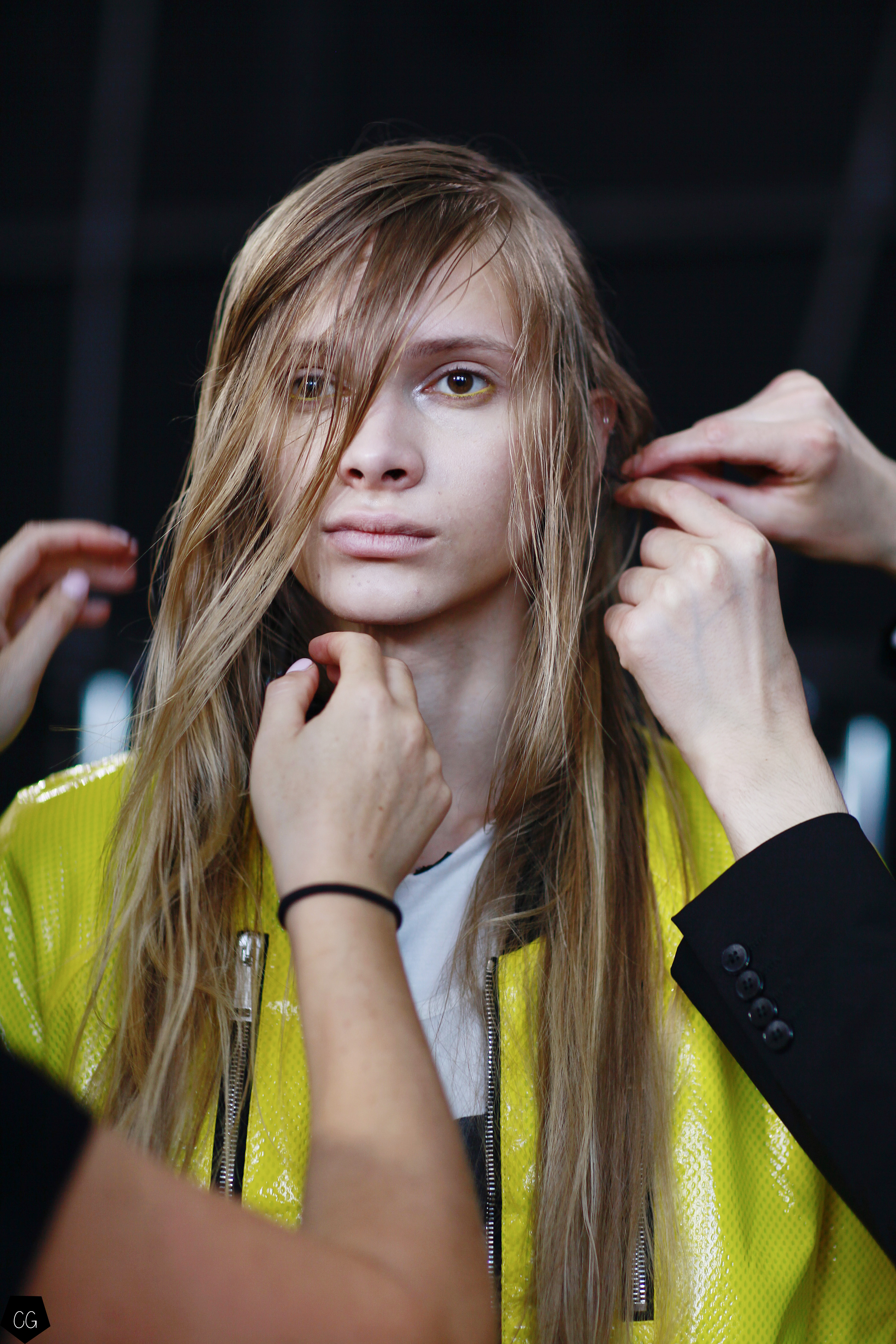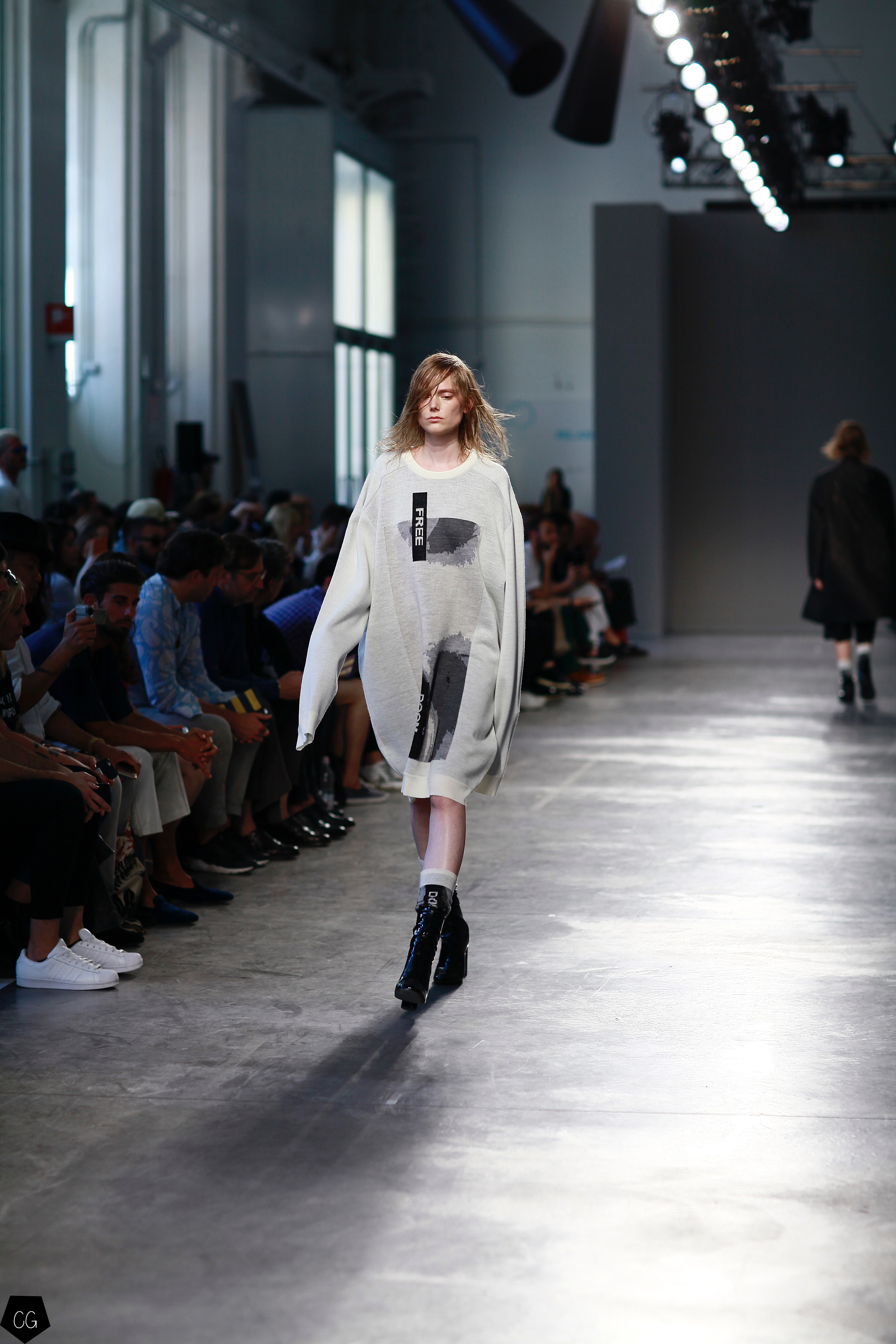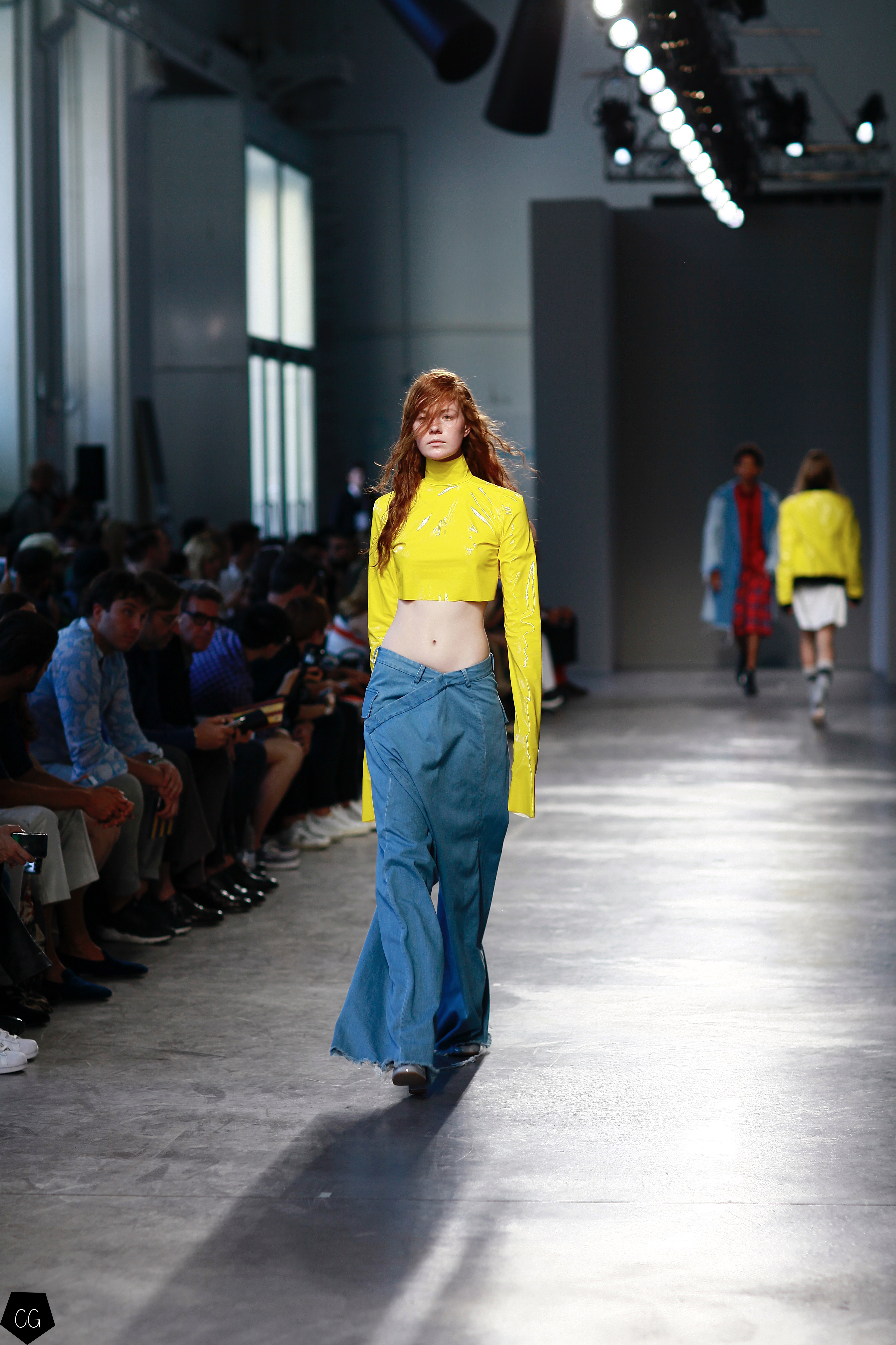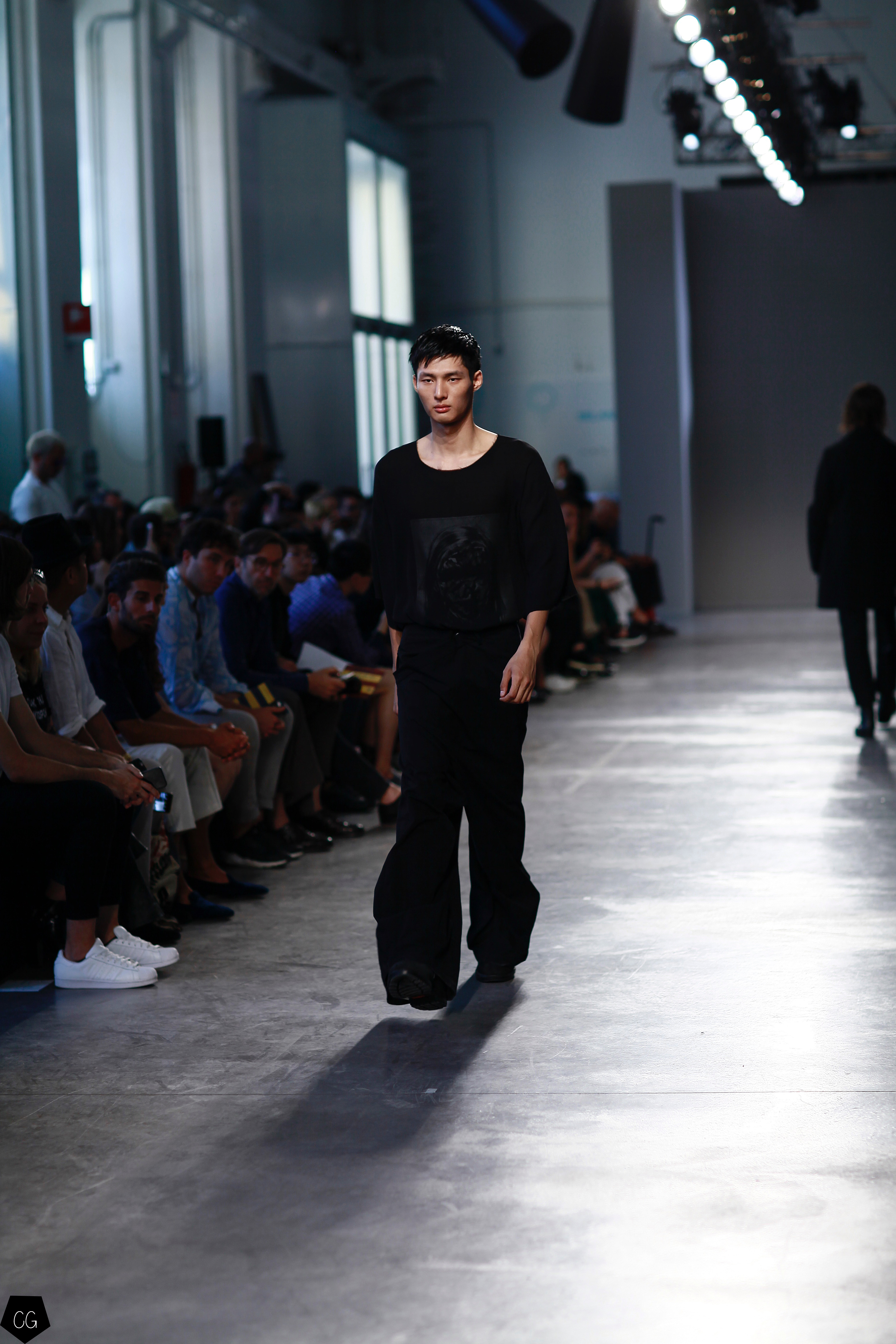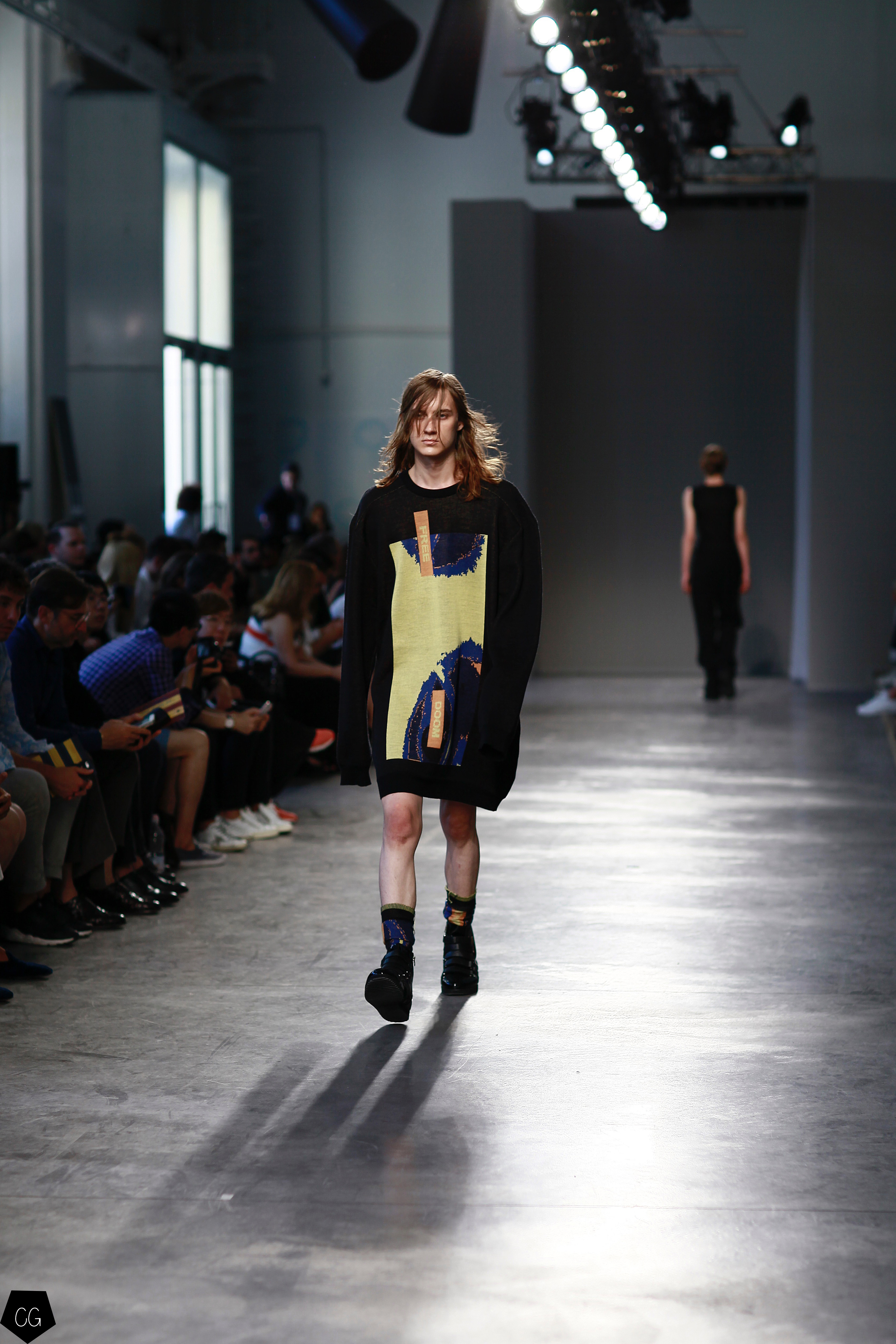 They invented a new masculine silhouette where genders blurred, masculine and feminine codes disappeared. The preferred colors were white, black, blue and gray, with a few models in bright yellow, mustard yellow and red tartan. The show featured a series of relaxed silhouettes, with oversized waists, long coats, zip-up jackets, long tunics, long sweaters and ultra-long sleeves, worn on their own or over pants or Bermuda shorts.