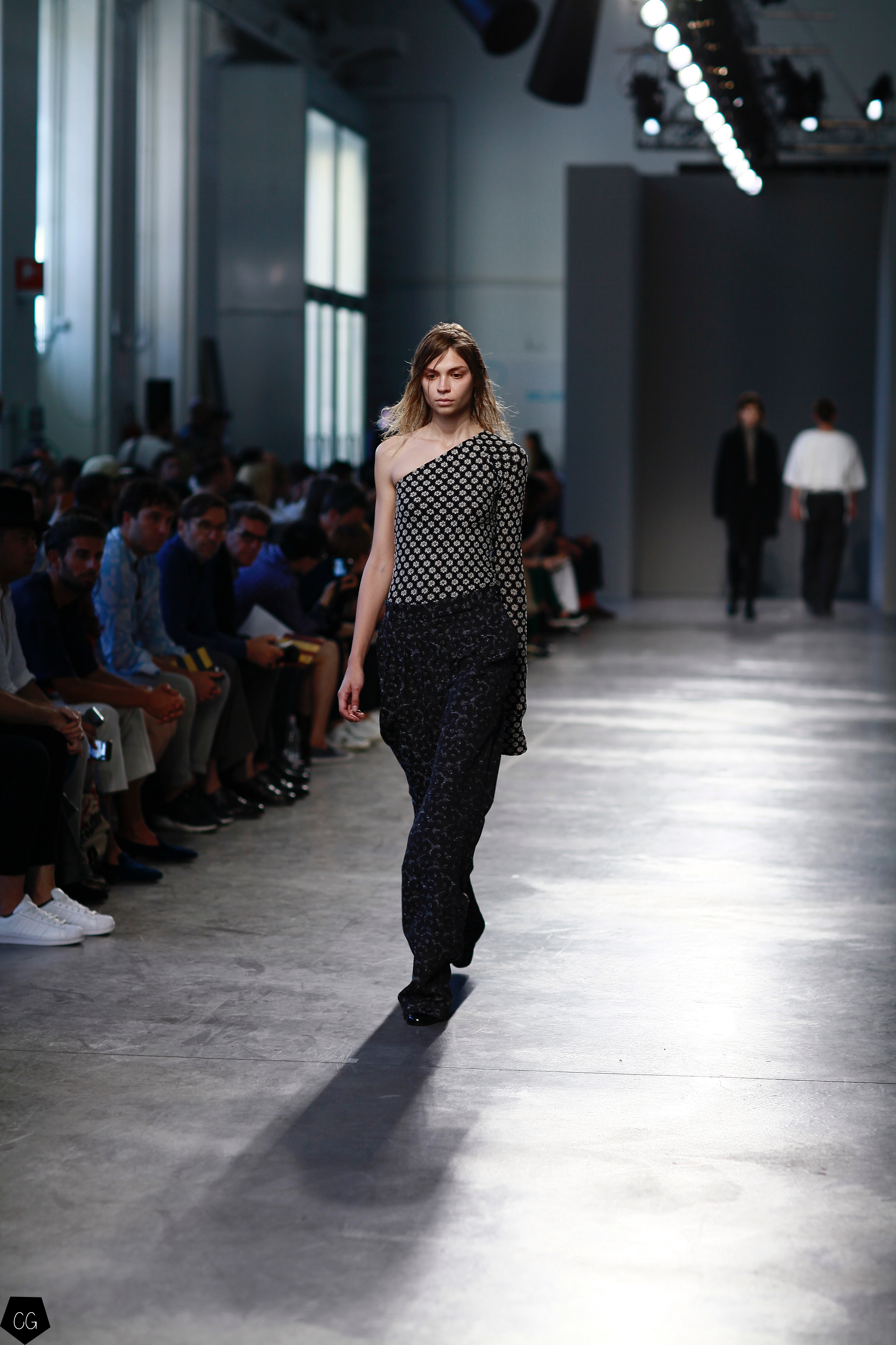 The originality of this collection lies in the combination of sportswear and luxury couture. The key words are superimpositions, minimalism tinged with sophisticated details, destructured and asymmetrical cuts. Garments are used in unusual ways. For example, the long, patterned surcoat worn knotted over pants as an apron tied around the hips.