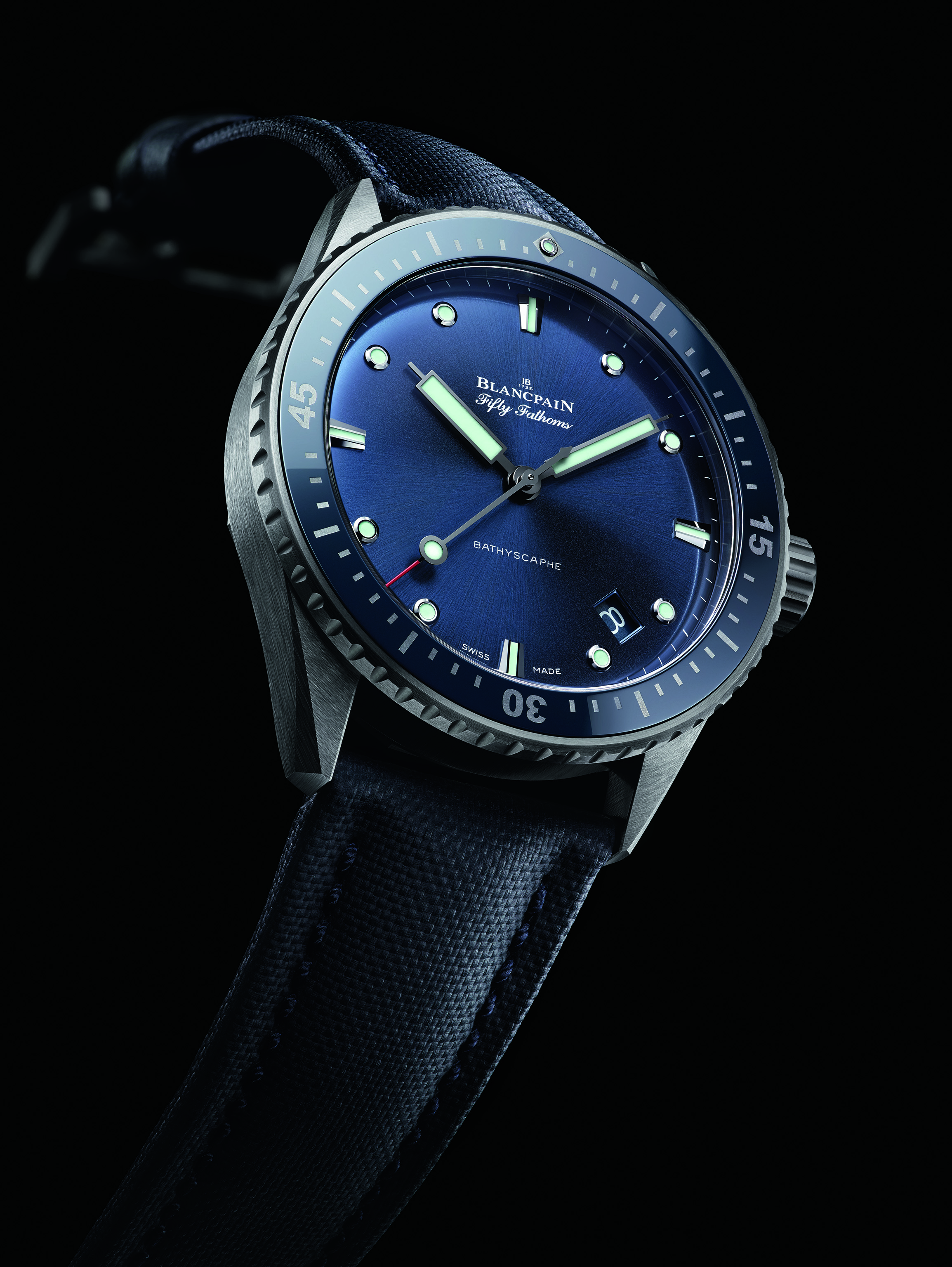 Blancpain’s Fifty Fathoms Bathyscaphe 3-hand watch features for the first time a grey plasma ceramic case.
