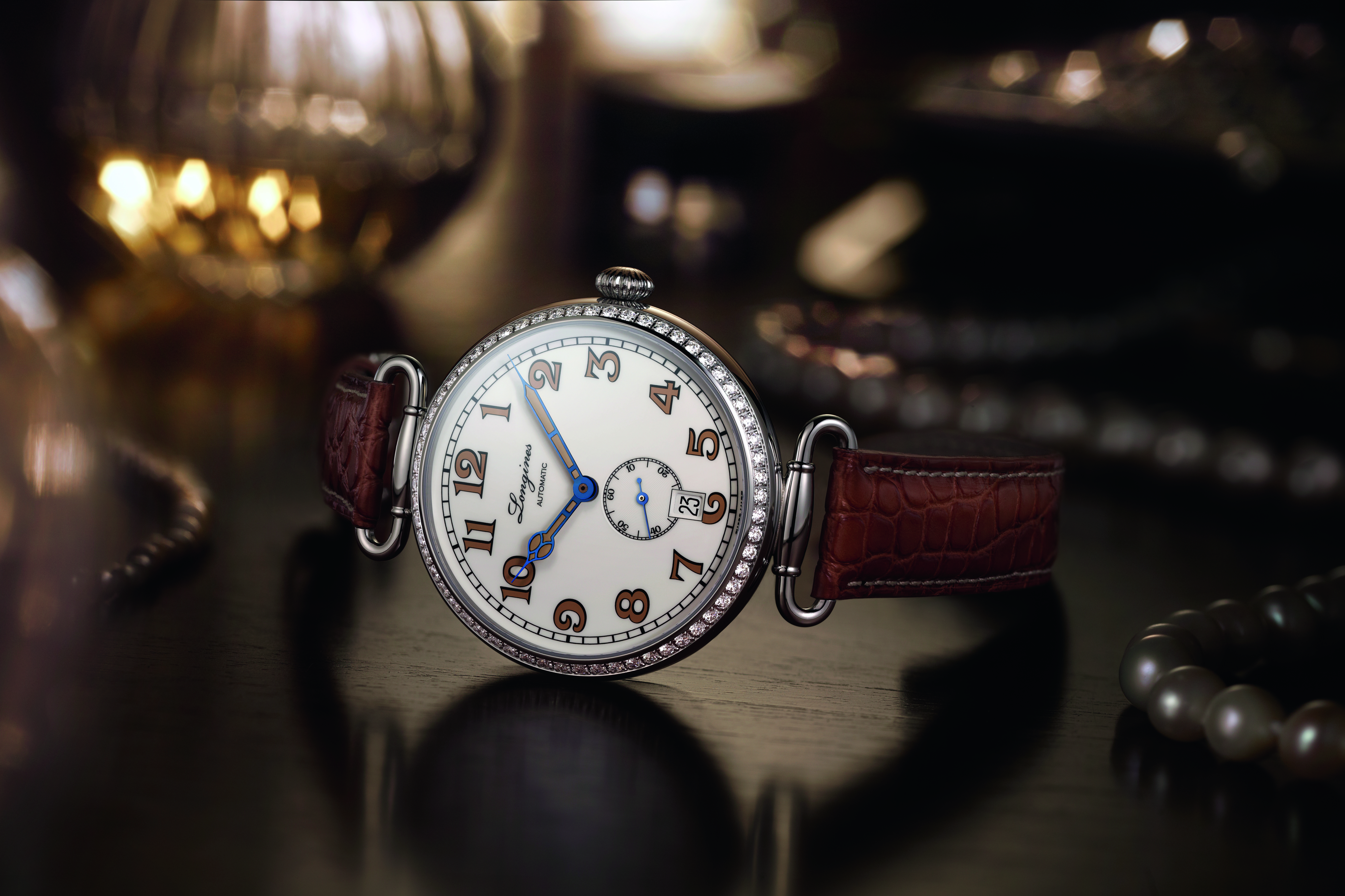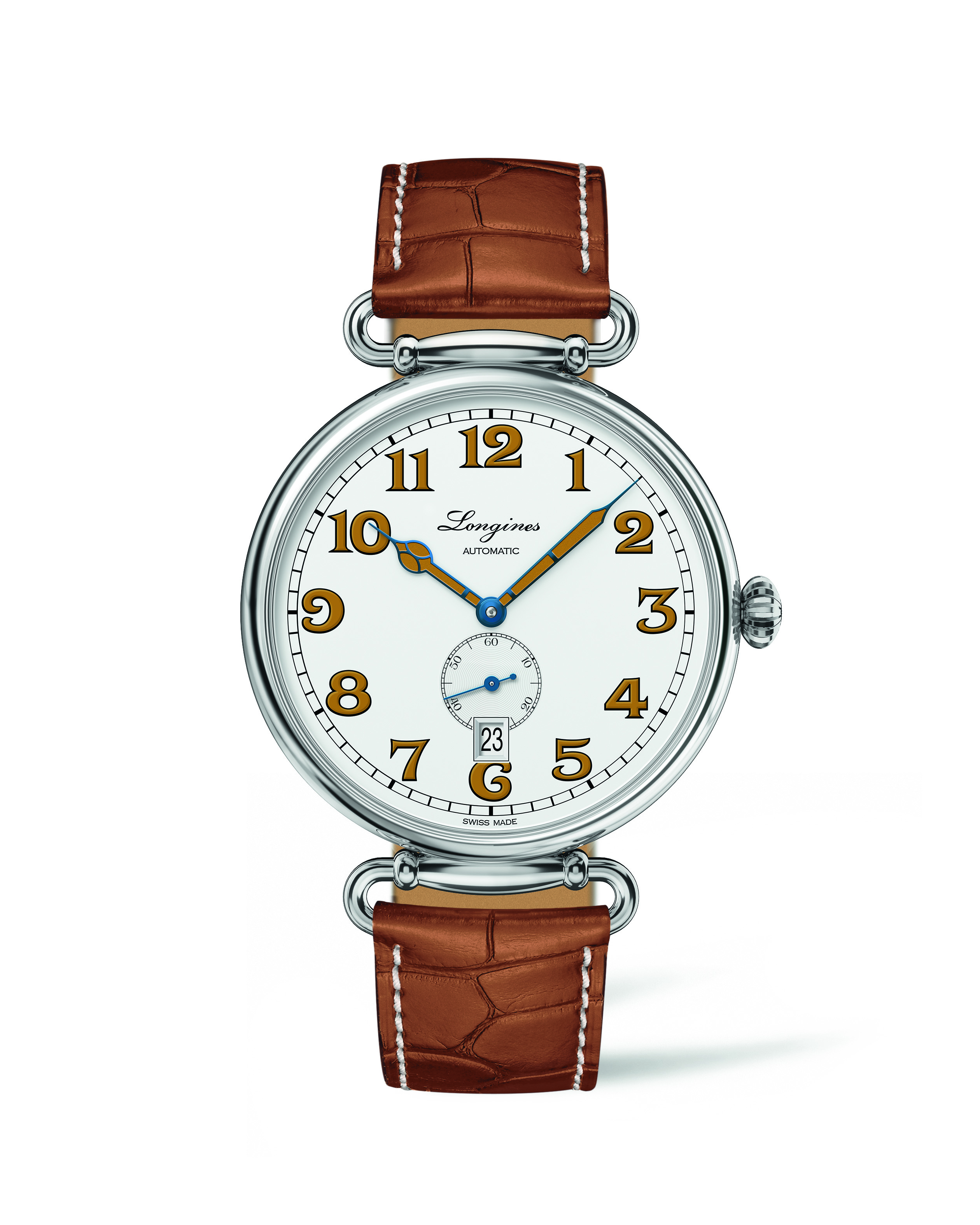 Distinctive blued steel and honey-varnished hands mark the hours and minutes on the polished lacquered white dial of this reissue, while the small seconds at 6 o’clock contrast with the blue color specific to Longines. The honey hue is also found on the dial’s large painted numerals, lending a particularly successful balance to this timepiece with its emblematic early twentieth-century design.