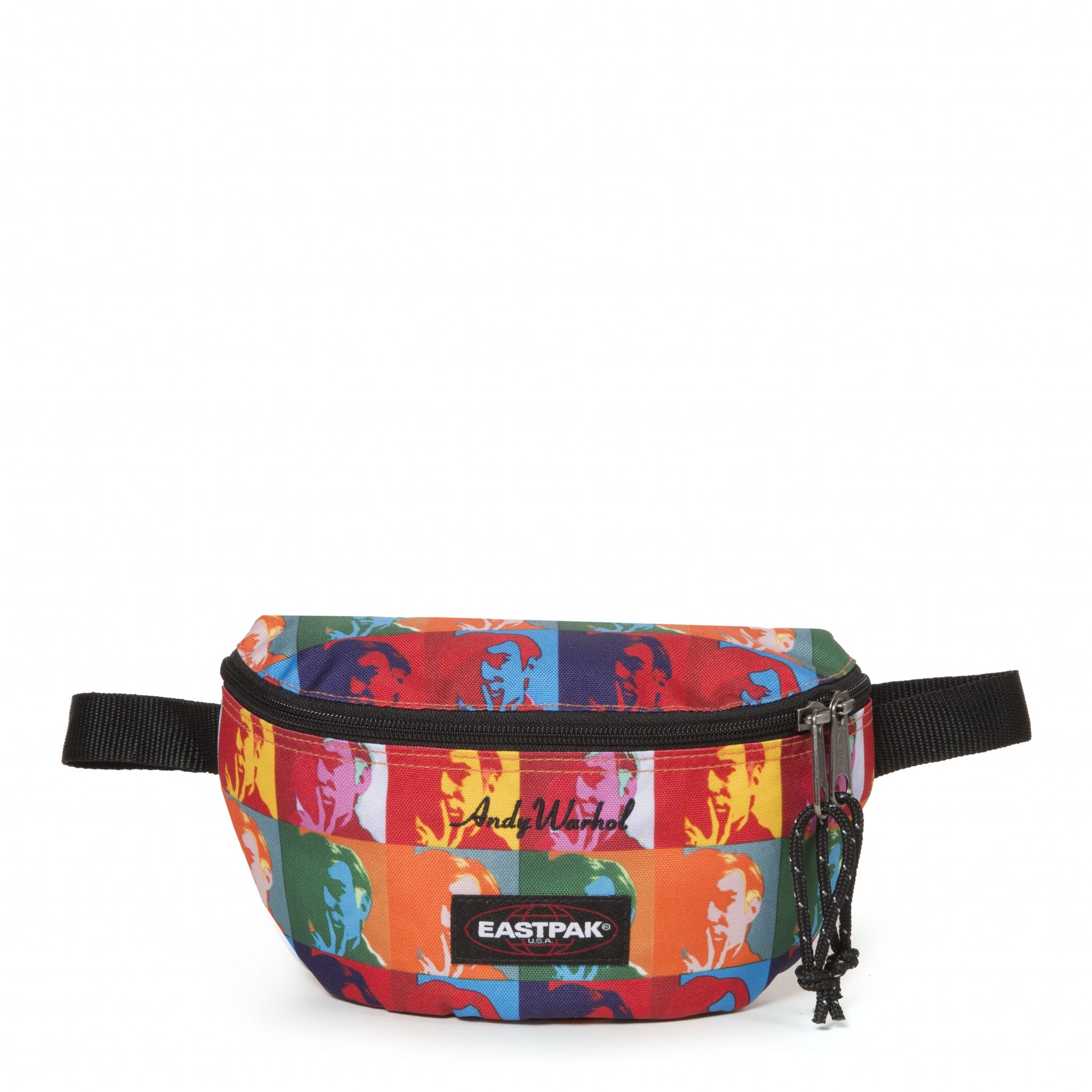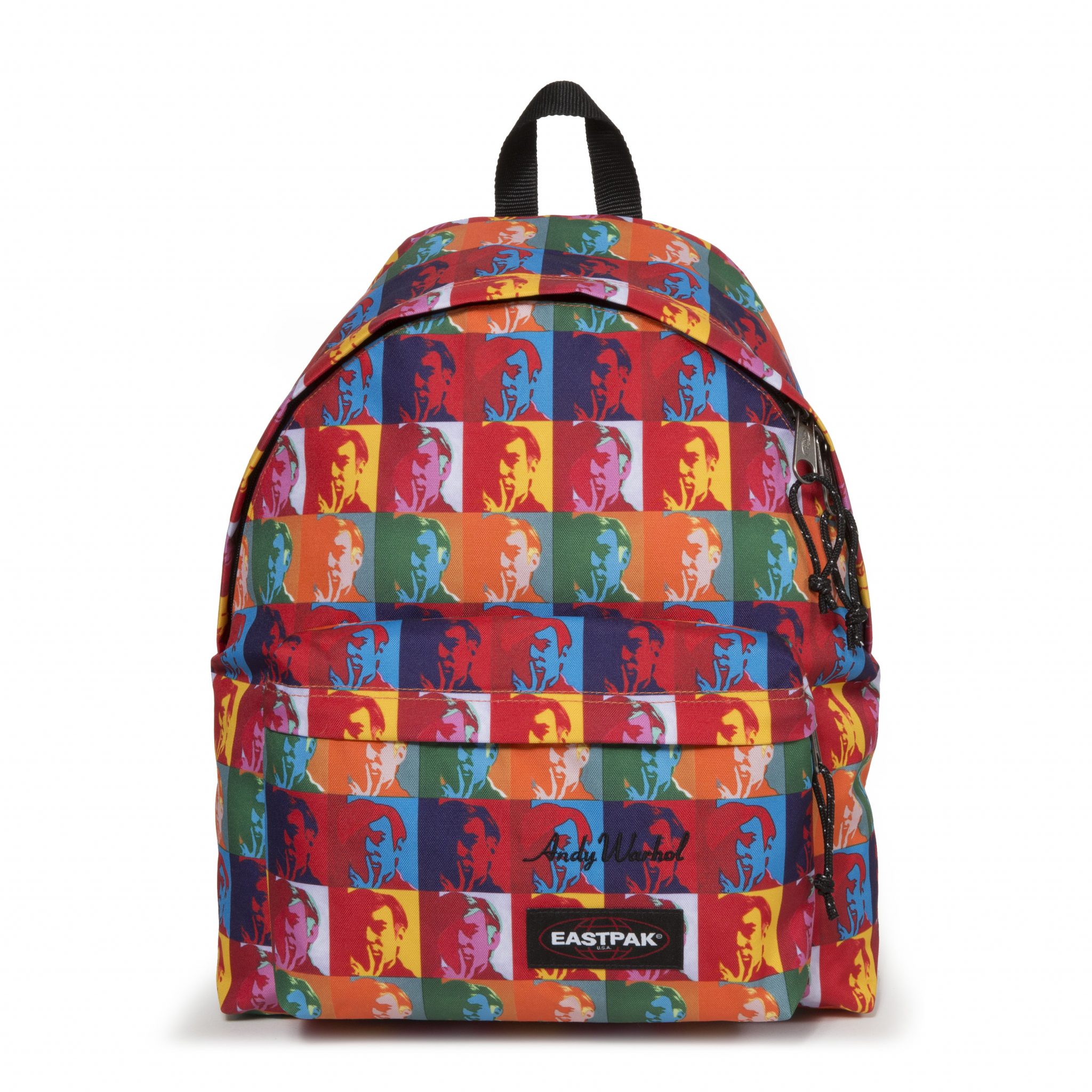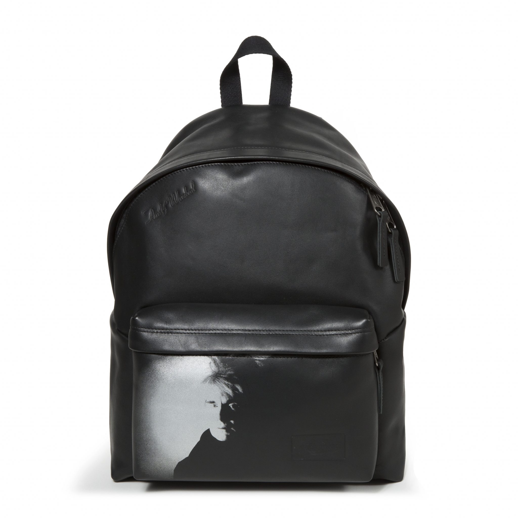 Warhol was often photographed carrying the Padded Pak’r®. This Eastpak bag, his favorite, here in black leather, is revisited in his image and through pop-art prints.