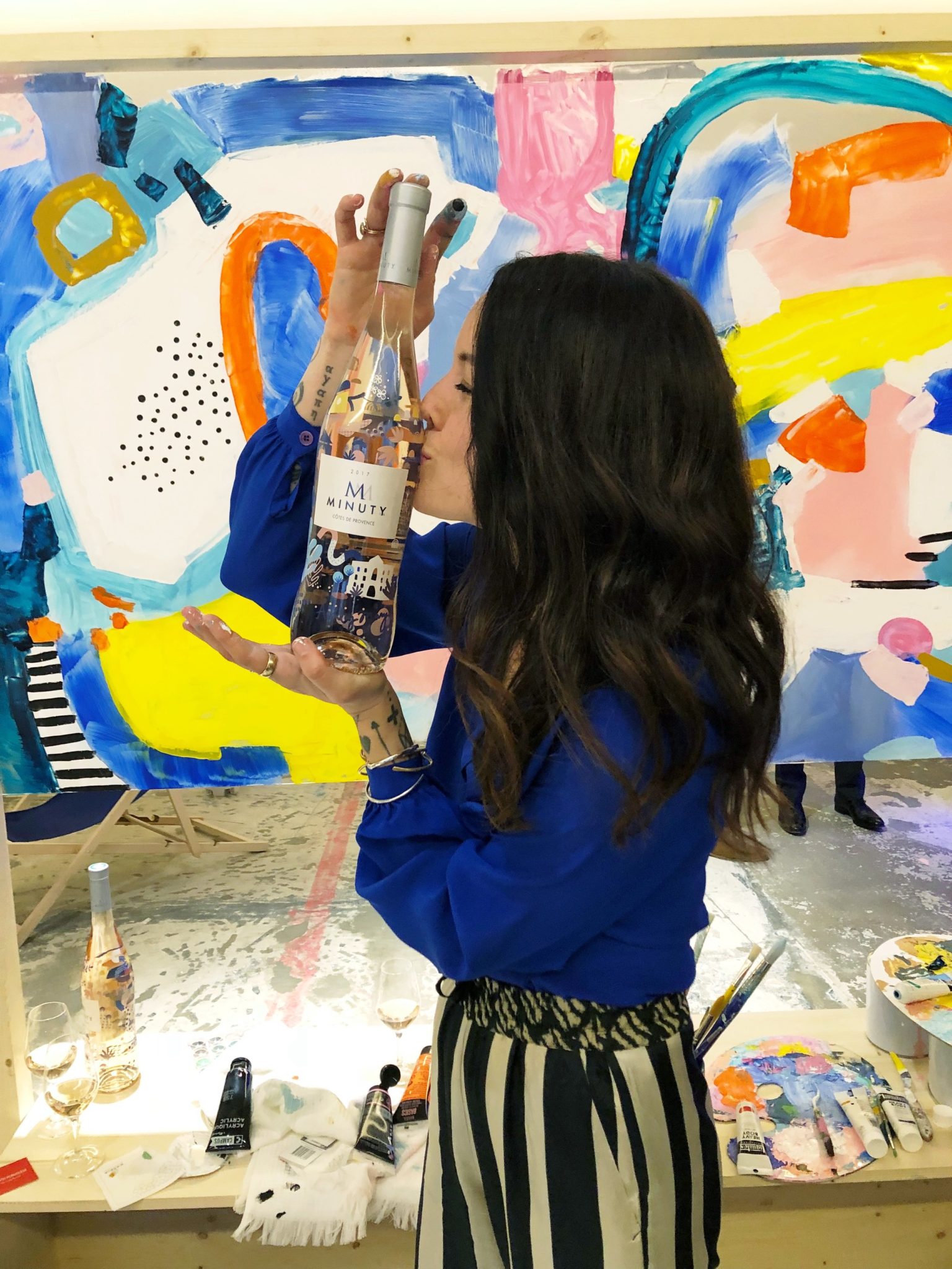 LʼHISTORY OF MINUTY COLLABORATION BY ASHLEY MARY With her paint palette in one hand and a pair of scissors in the other, Ashley Mary visited the estate and Saint-Tropez last summer: a visit to the market, lunch at Sénéquier’s, an evening at Club 55, Nikki Beach… Her work is a constant exploration, made of serendipity, compositions full of life and positive energy that she wishes to spread around her. This bottle tells the story of Saint-Tropez, its architecture and its famous bell tower, its waterfront and beaches, and of course the Minuty vineyard! Minuty is a modern and aesthetic domain. And Saint-Tropez is a magical place. A tropical universe, a little hidden, romantic and soothing, which contrasts as soon as the day falls with a lively nightlife, as if the city never sleeps. Ashley Mary