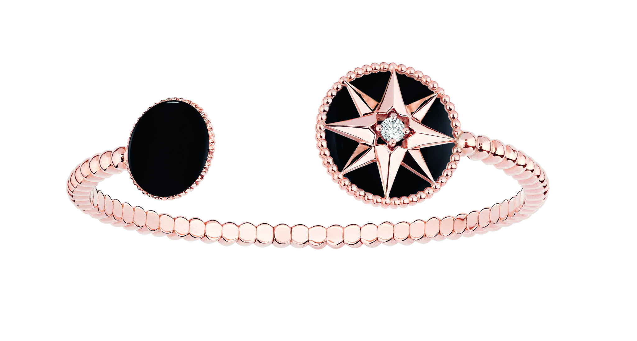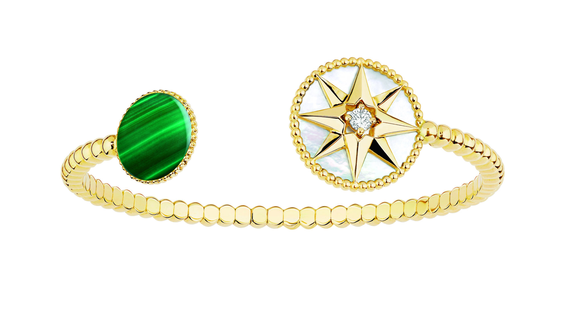From the garden of Granville, in Normandy, to 30, avenue Montaigne, in Paris, the Rose des vents collection imagined by Victoire de Castellane, Artistic Director of Dior Joaillerie, is an odyssey along the four winds in the history of the House. This new lucky charm comes in a delicate bead decorated with two pastilles in mother-of-pearl, malachite, pink opal or onyx, one of which is adorned with the couturier’s signature star. The grain-of-rice twist in yellow or pink gold that encircles the wrist echoes the rope of navigators and the desire for journeys, both real and imaginary.