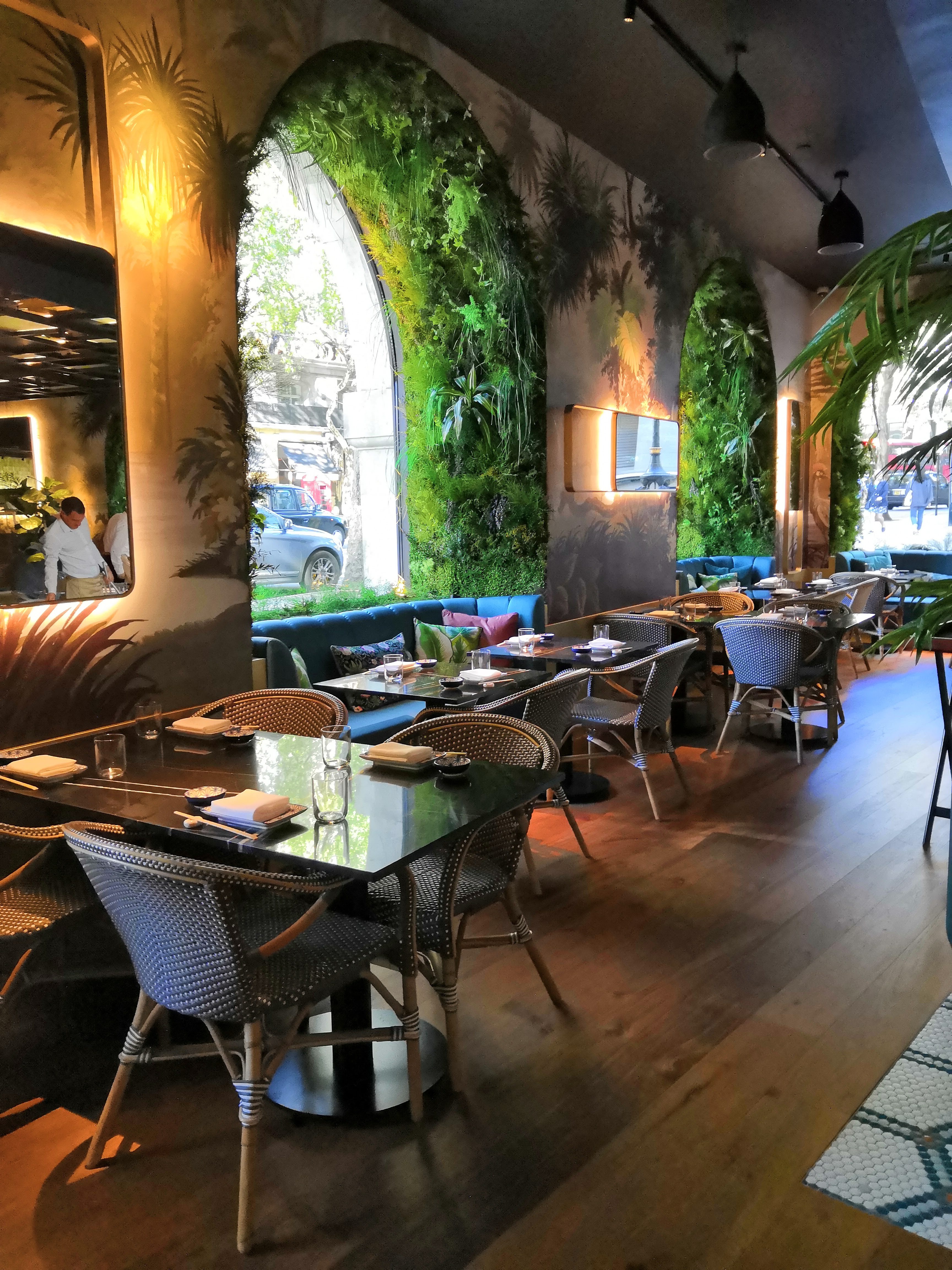 This Diego Gronda studio concept has its own signature: abundant vegetation, intimate alcoves, Spanish-influenced tiles, bamboo furniture, palm tree wallpaper… During the day, large windows flood the space with natural light; in the evening, subdued lighting creates an ambience more in tune with the DJ.