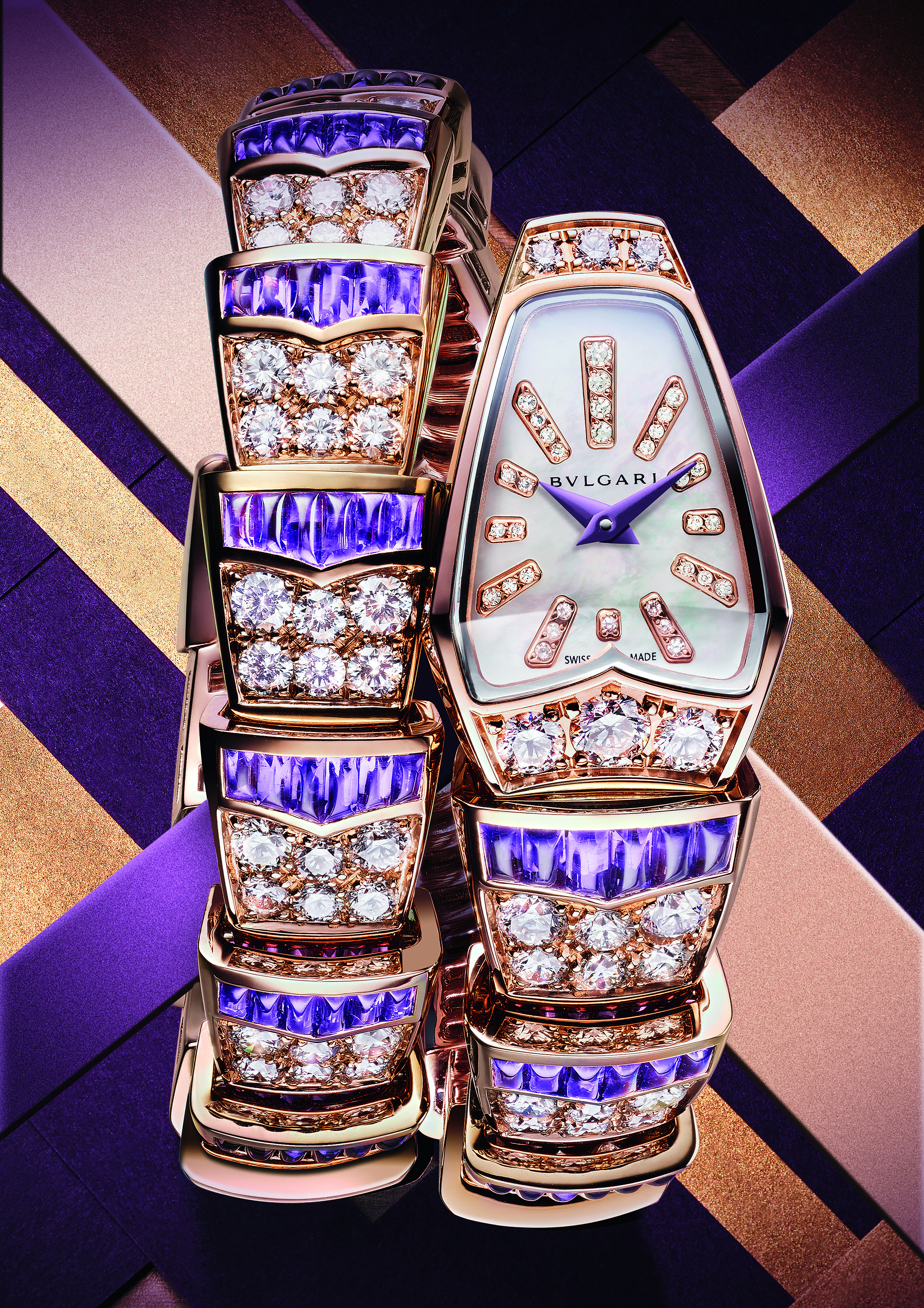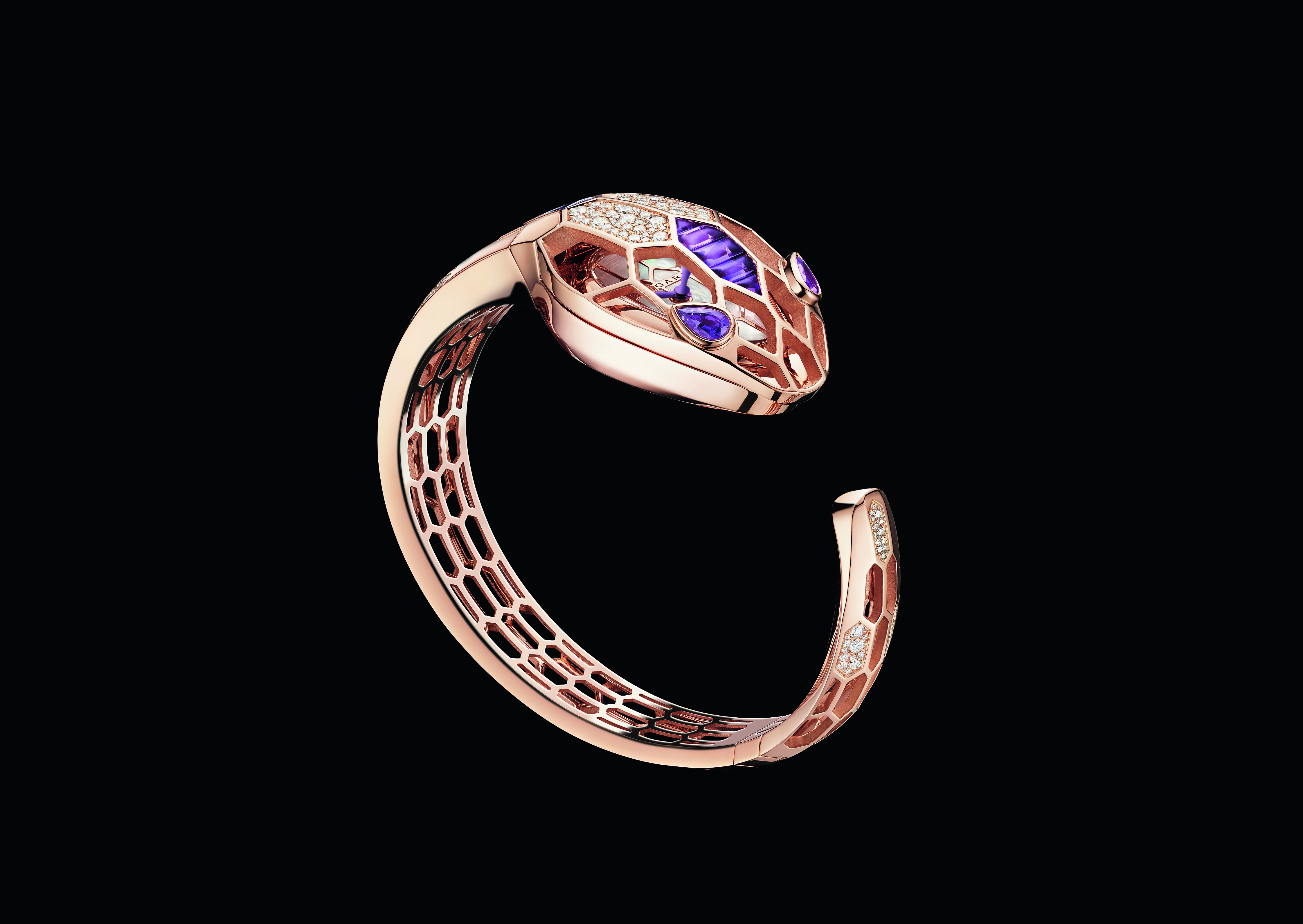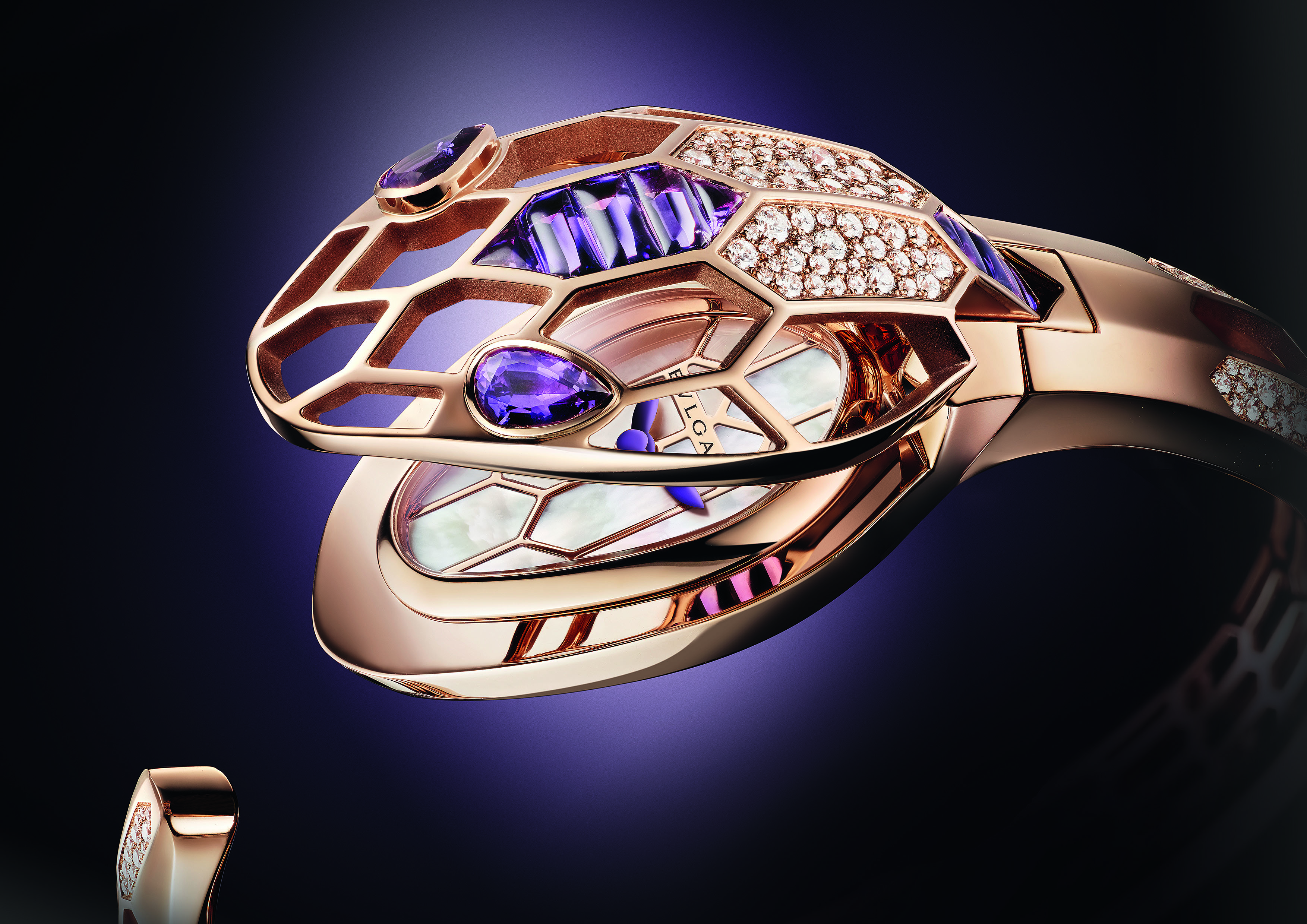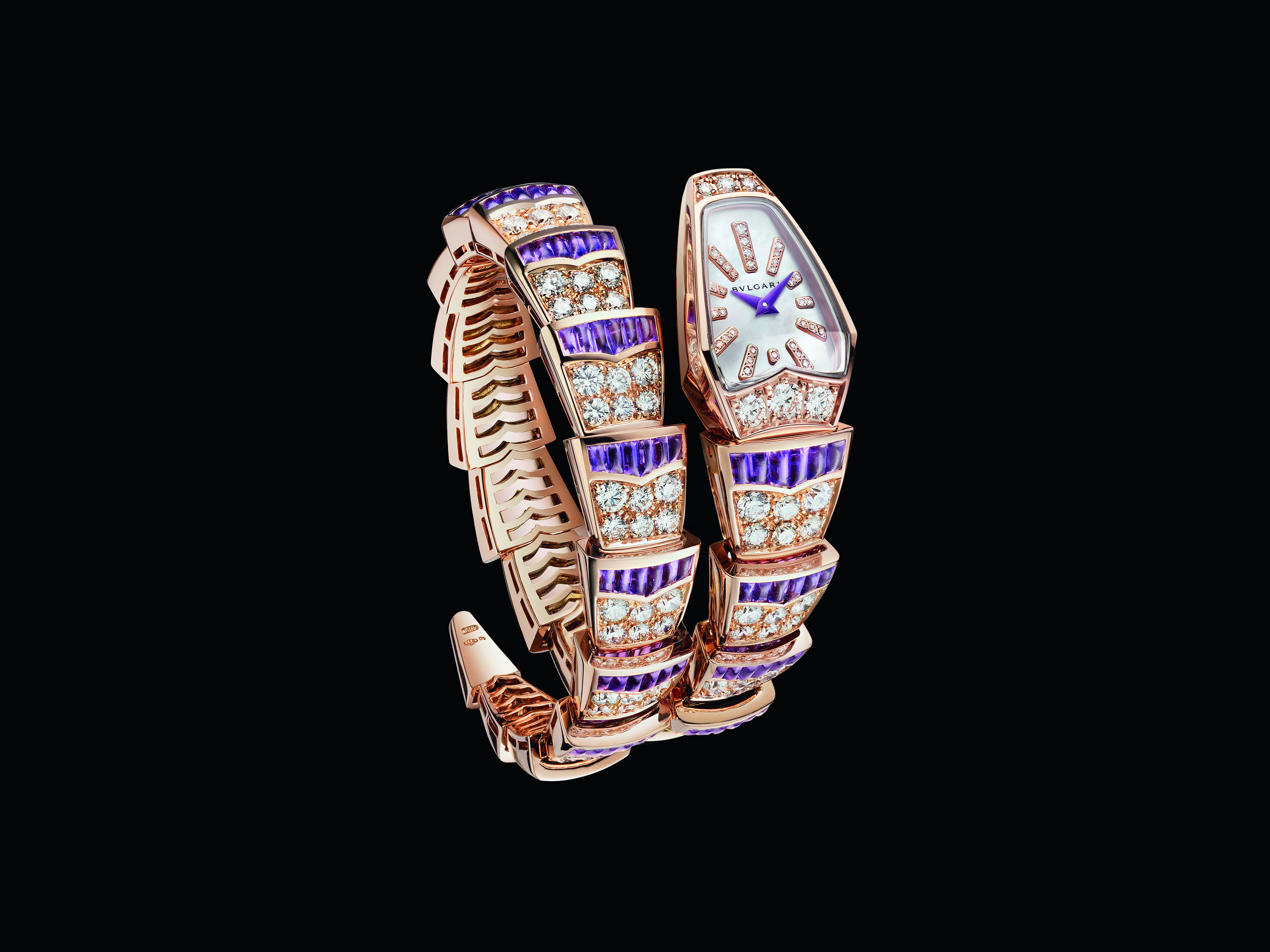 The watch Serpenti Scaglie made its debut in 2009 and was instantly elevated to iconic status thanks to its bracelet that wraps around the wrist and its dial in the shape of a snake’s head. It is reinterpreted with suiffed amethysts set in rose gold and sublimated by brilliant-cut diamonds to resemble scaglie, the Italian word for scales. The 126 amethysts represent a total weight of 6.65 carats. The purple of the hands forms a striking contrast with the white mother-of-pearl of the dial.