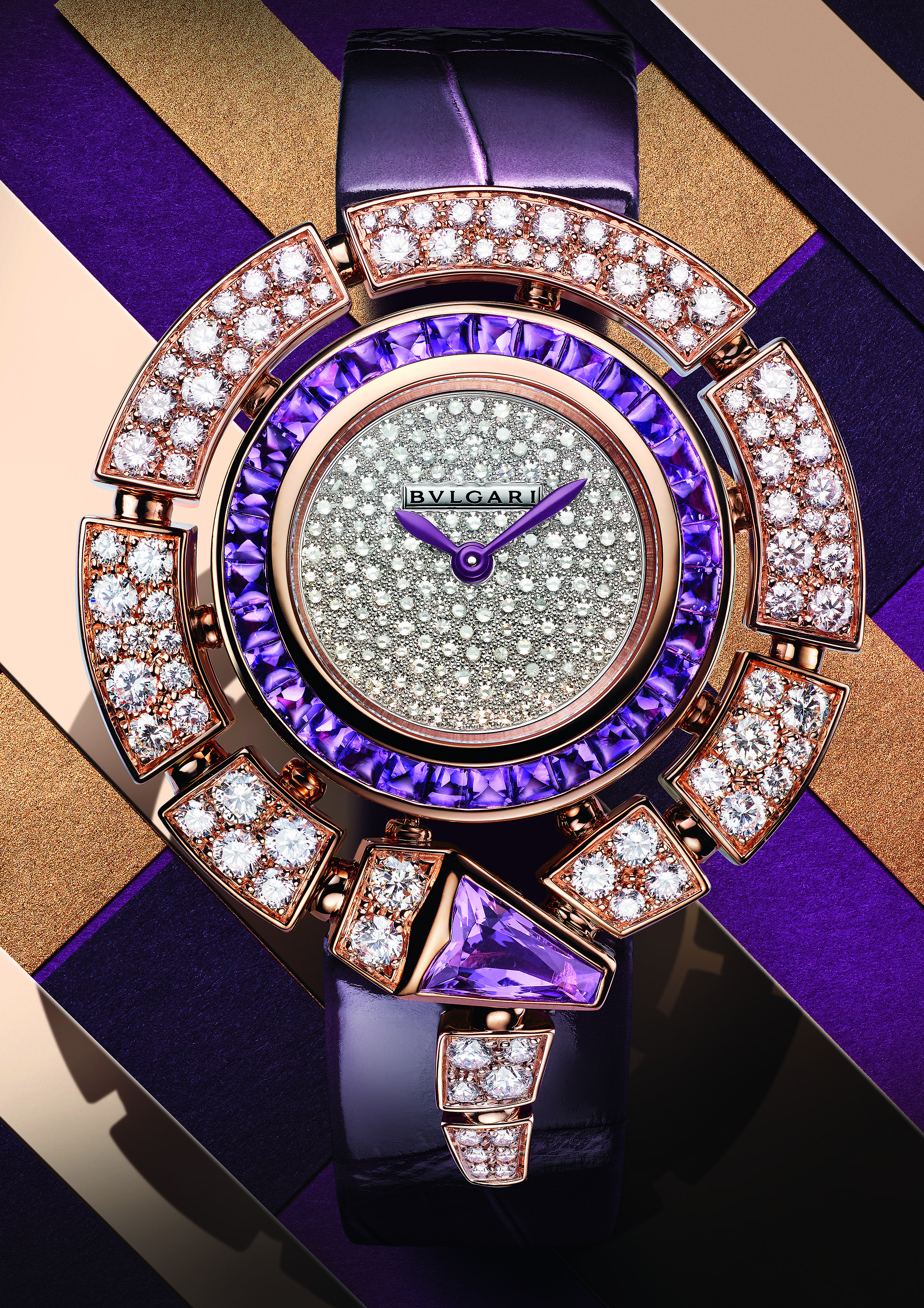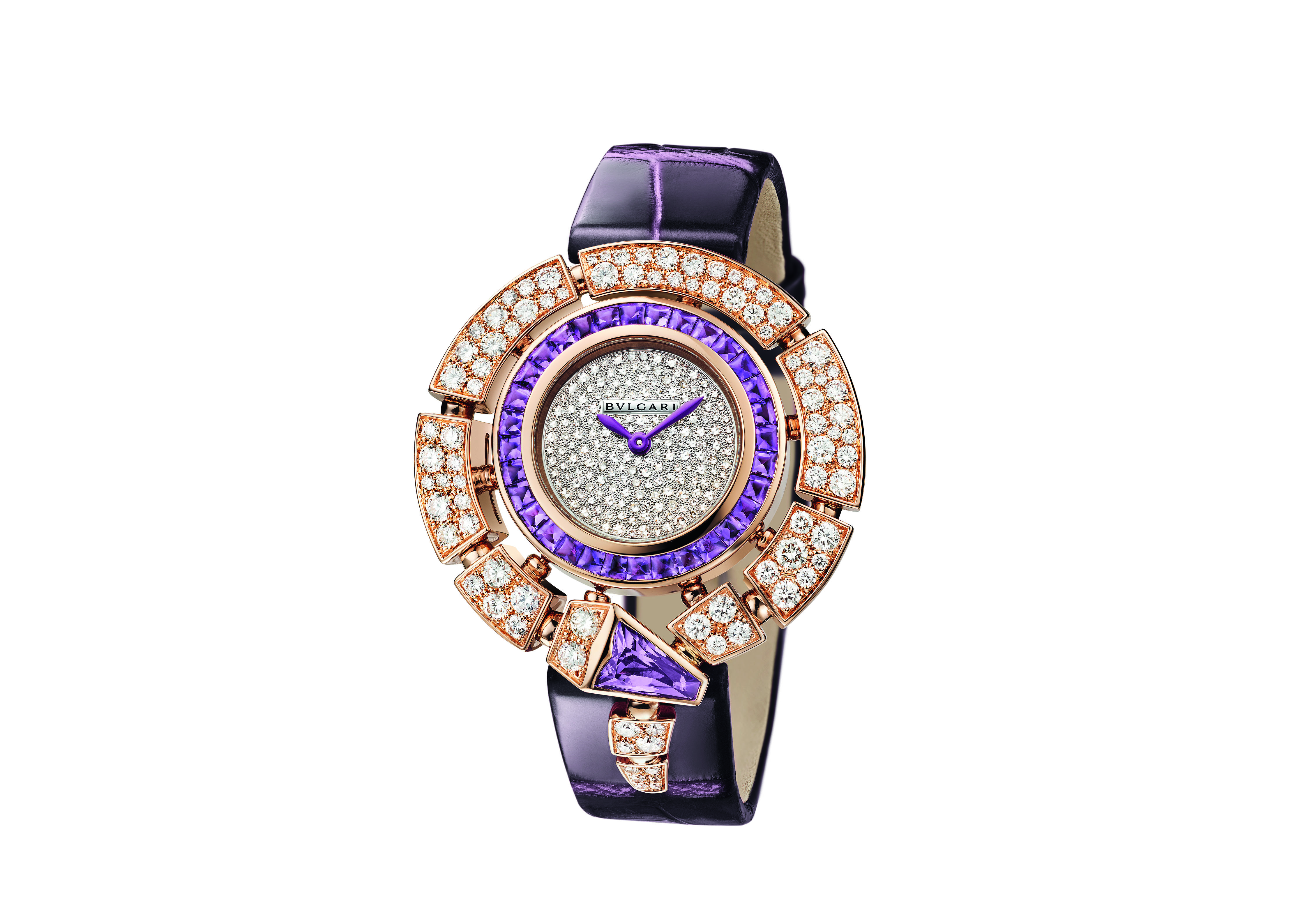 La Serpenti Incantati was launched in 2016. Its new interpretation features a rose gold case set with diamonds and 33 amethysts for a total of 2.45 carats. The alligator strap and hands are also adorned with a deep, intense violet hue.