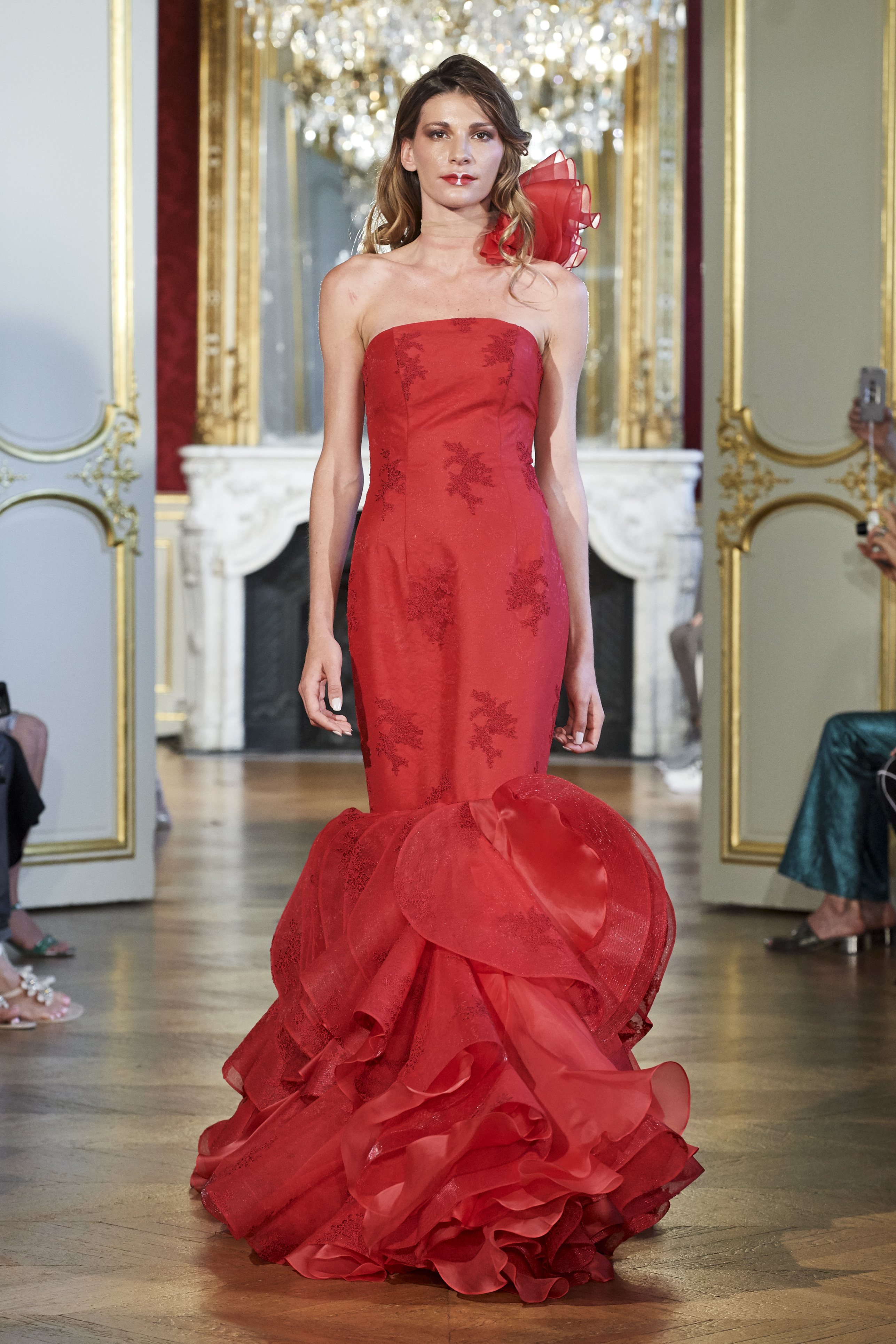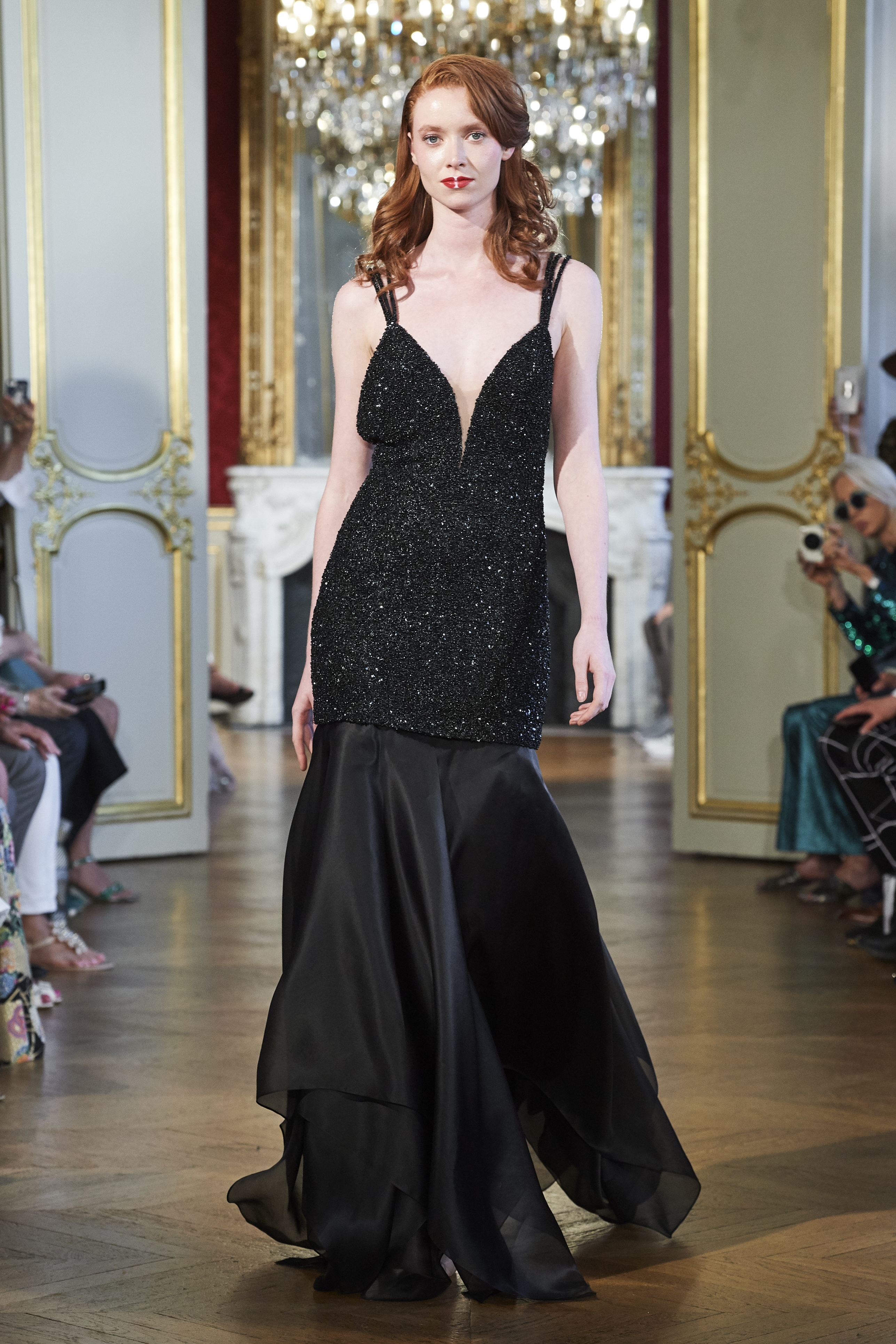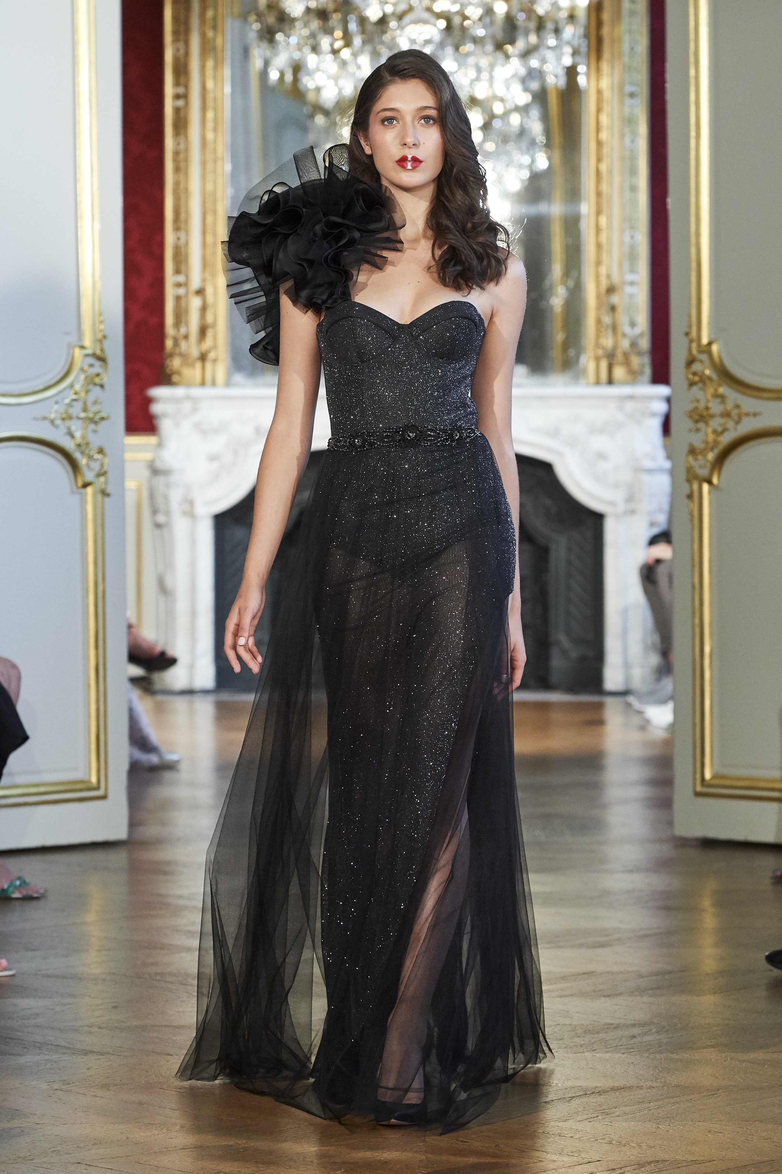 Emphasizing the body, embracing the silhouette, revealing the sensuality of a self-fulfilled, confident yet dual woman with a mysterious personality… Deep, sequined blacks, veils, ivory and golden softness on the wings of angels… and red love.
