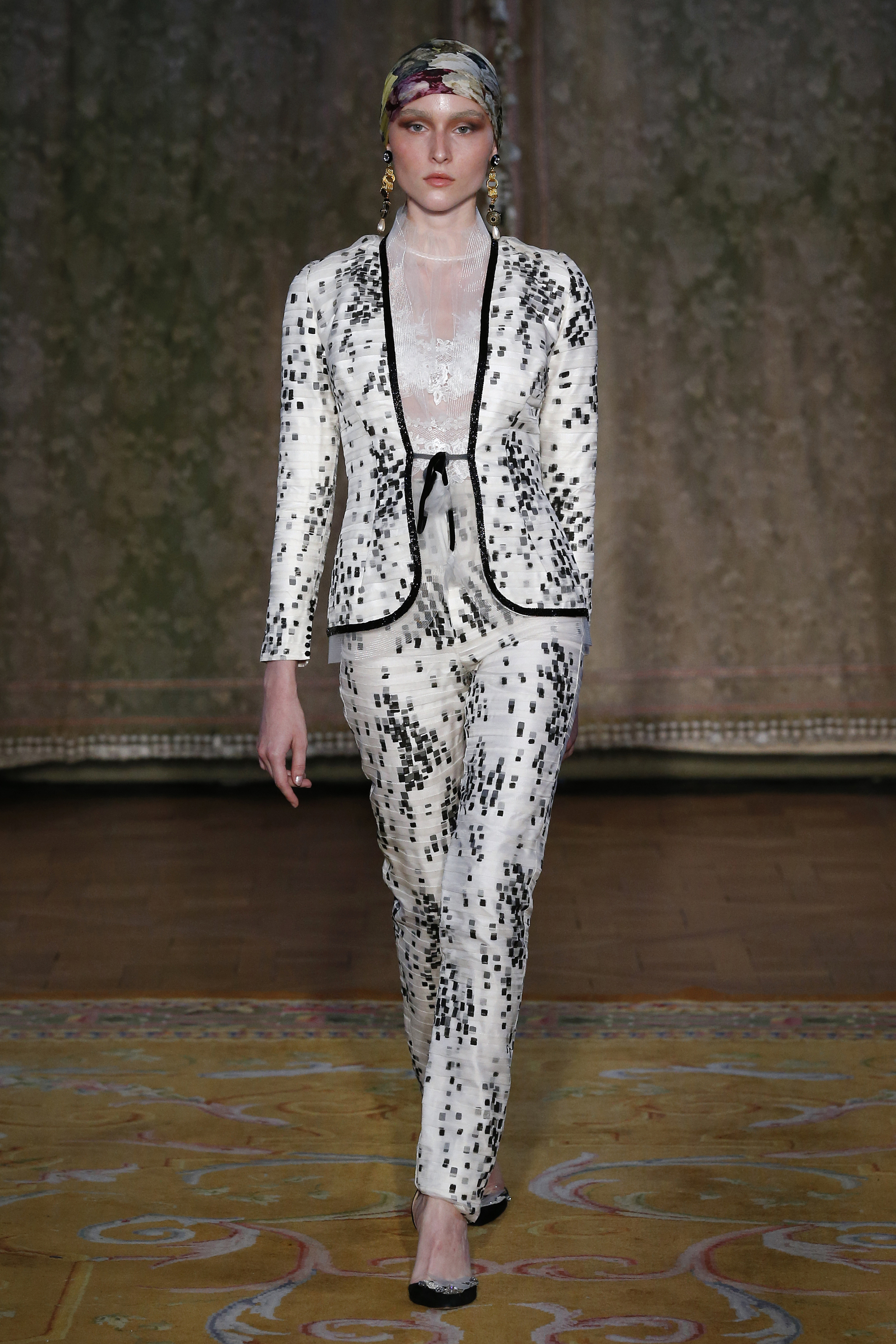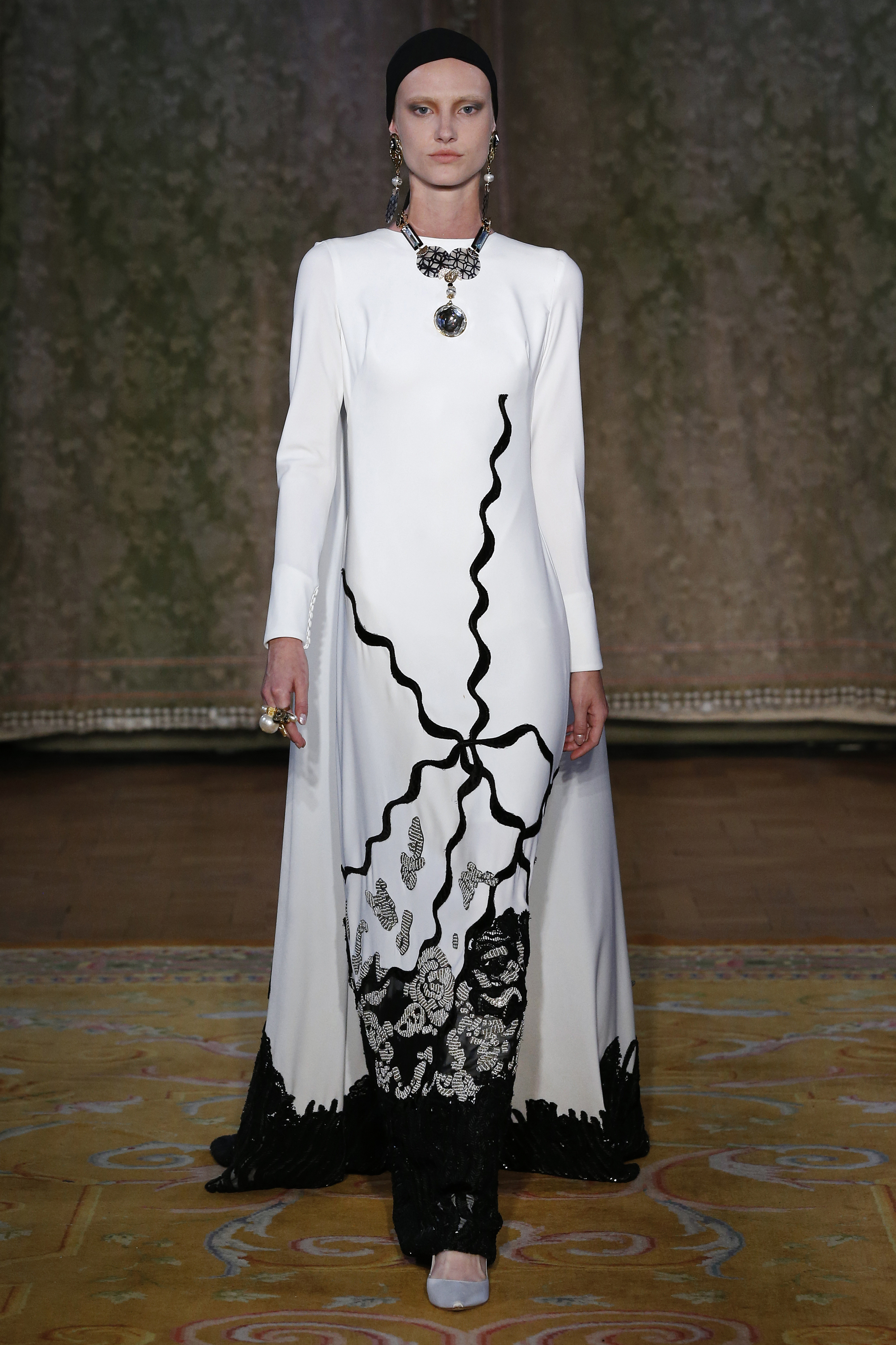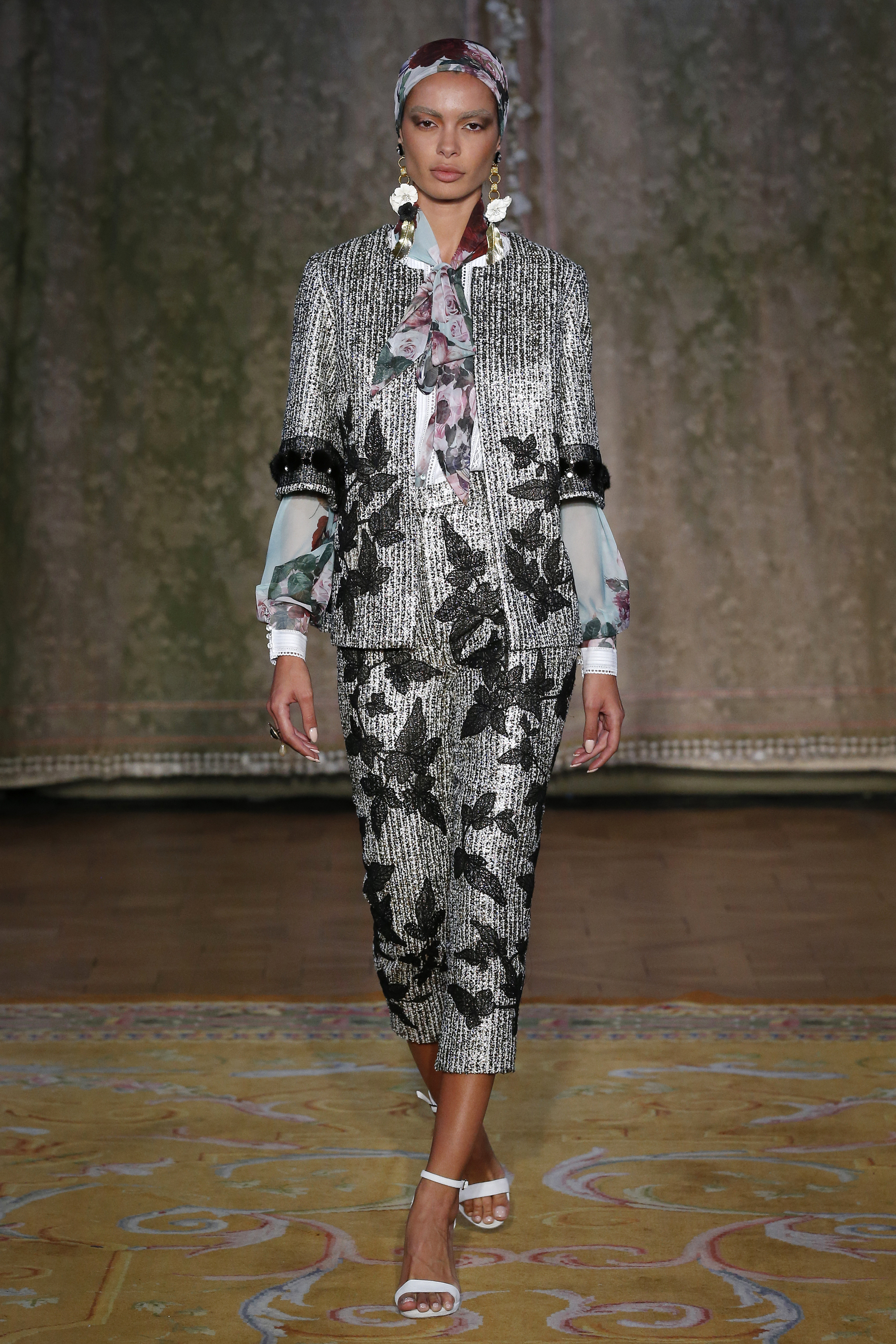 Along with Art Nouveau and Arts & Crafts, the other most important influence of the creative director Yolanda Pérez are the decades of the 60s and 70s of the 20th century. The black and white binomial of the collection has its point in common with the op art of the 60s, being the graphics of the French designer Louis Féraud a reference point in conceiving and creating the ornamentations of the pieces of the collection with abundant embroideries and hand-sewn rhinestones.
