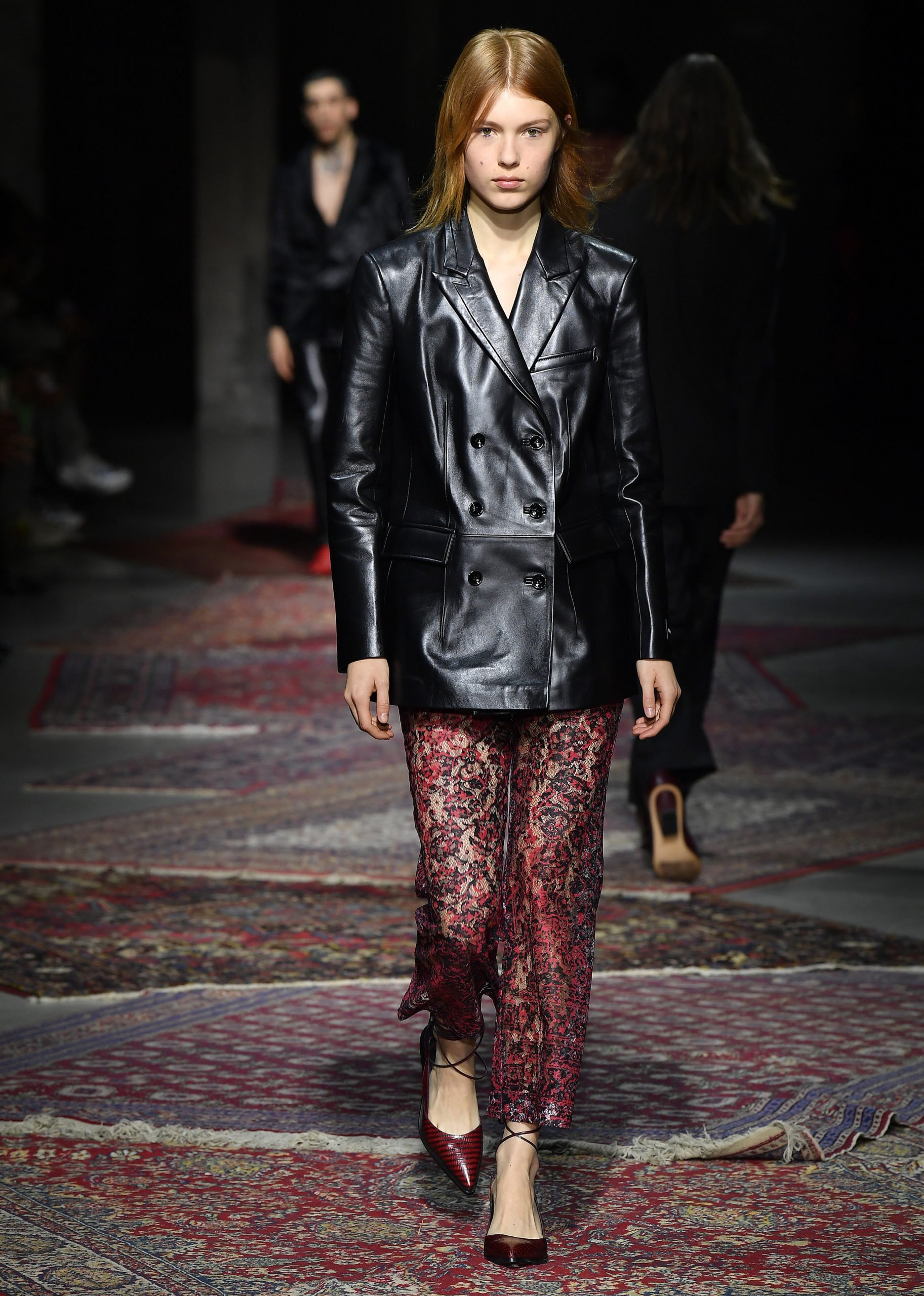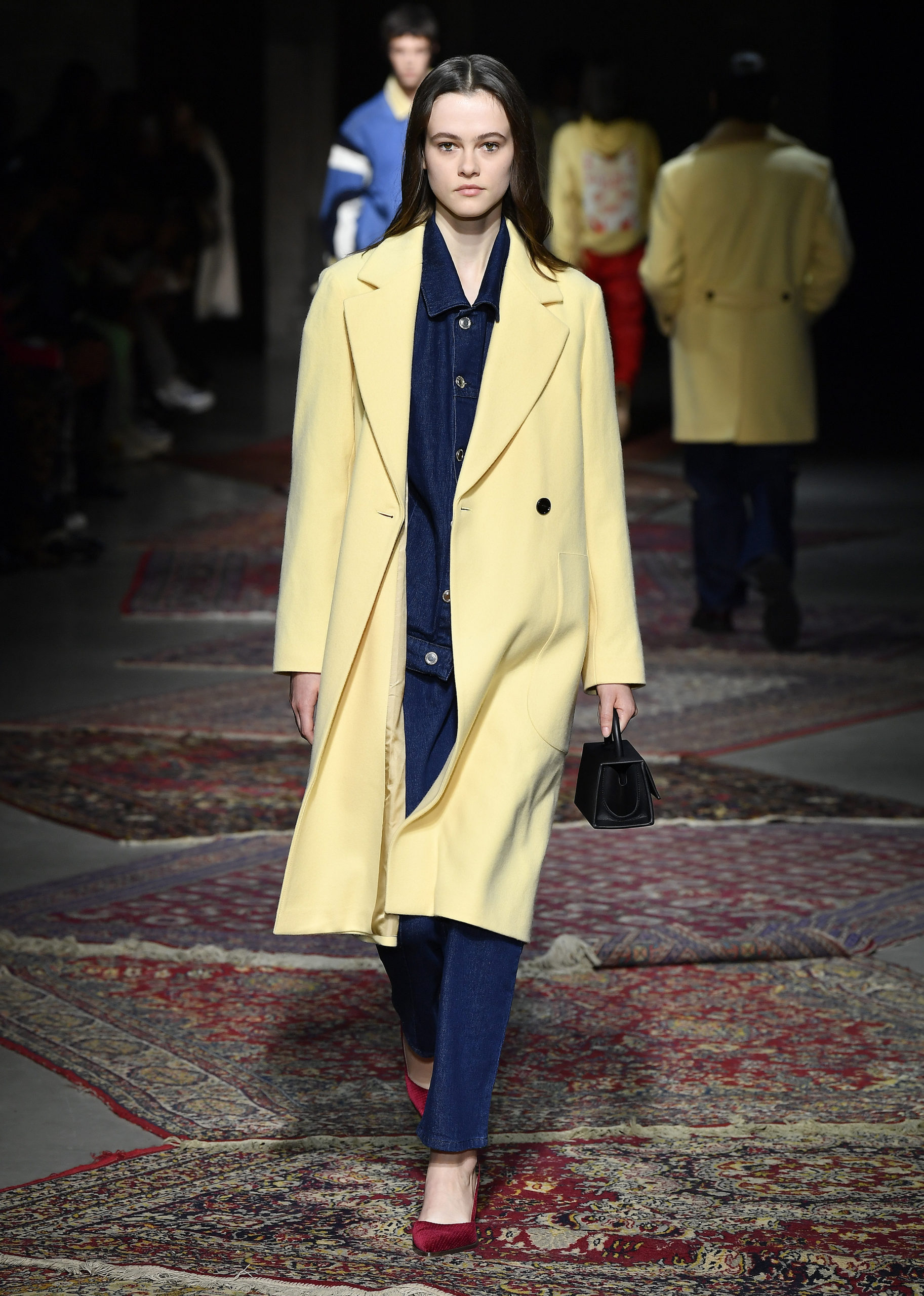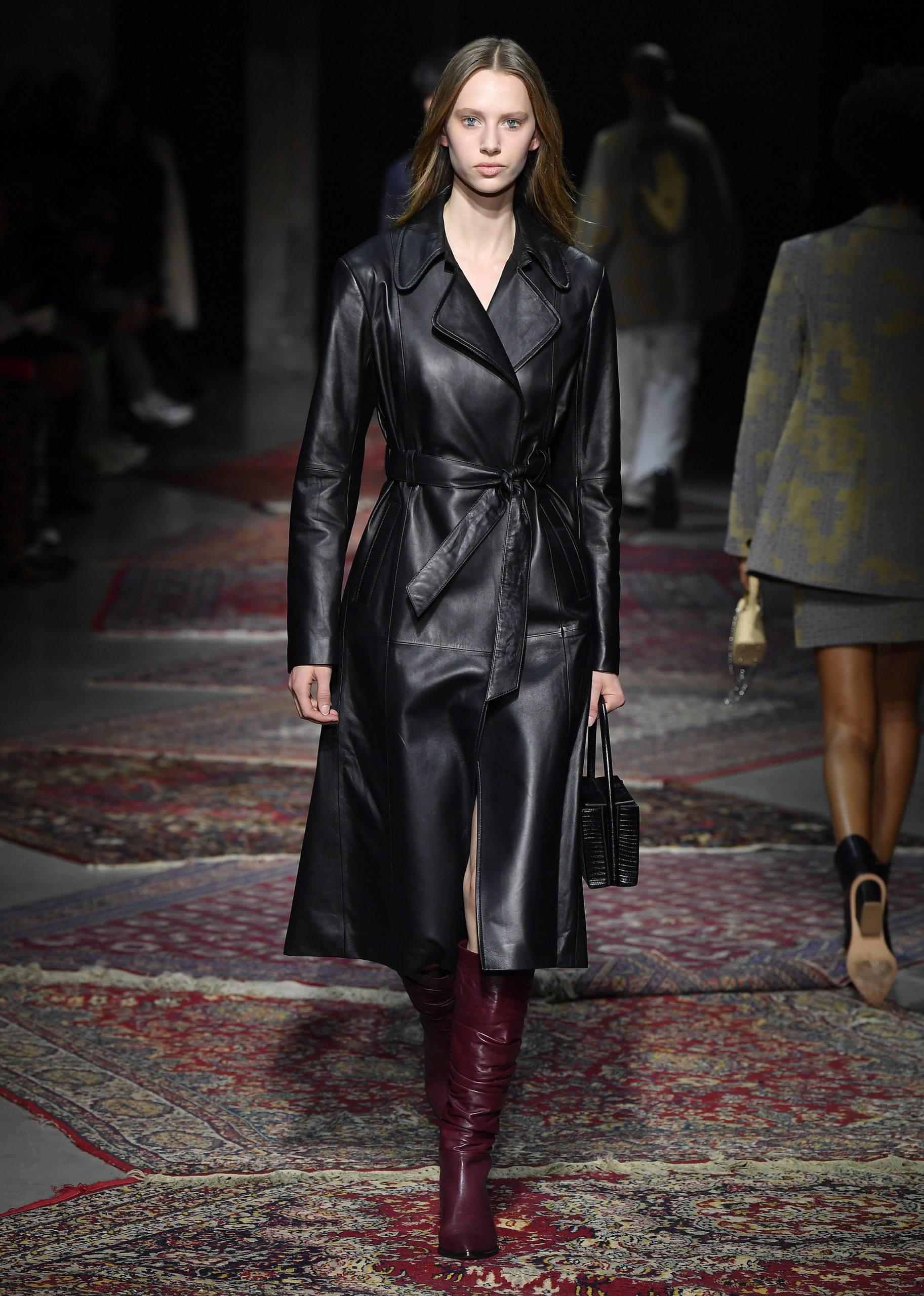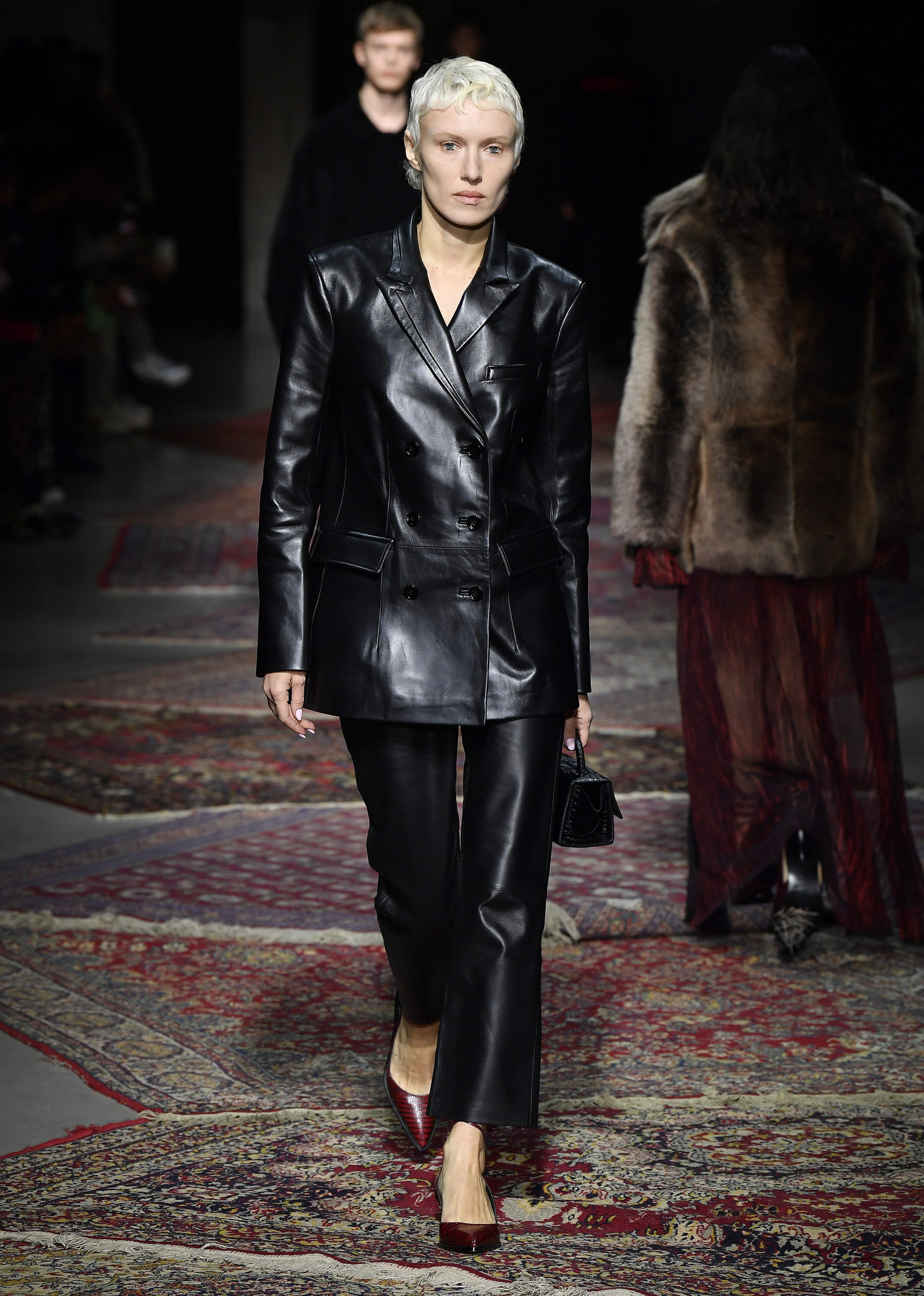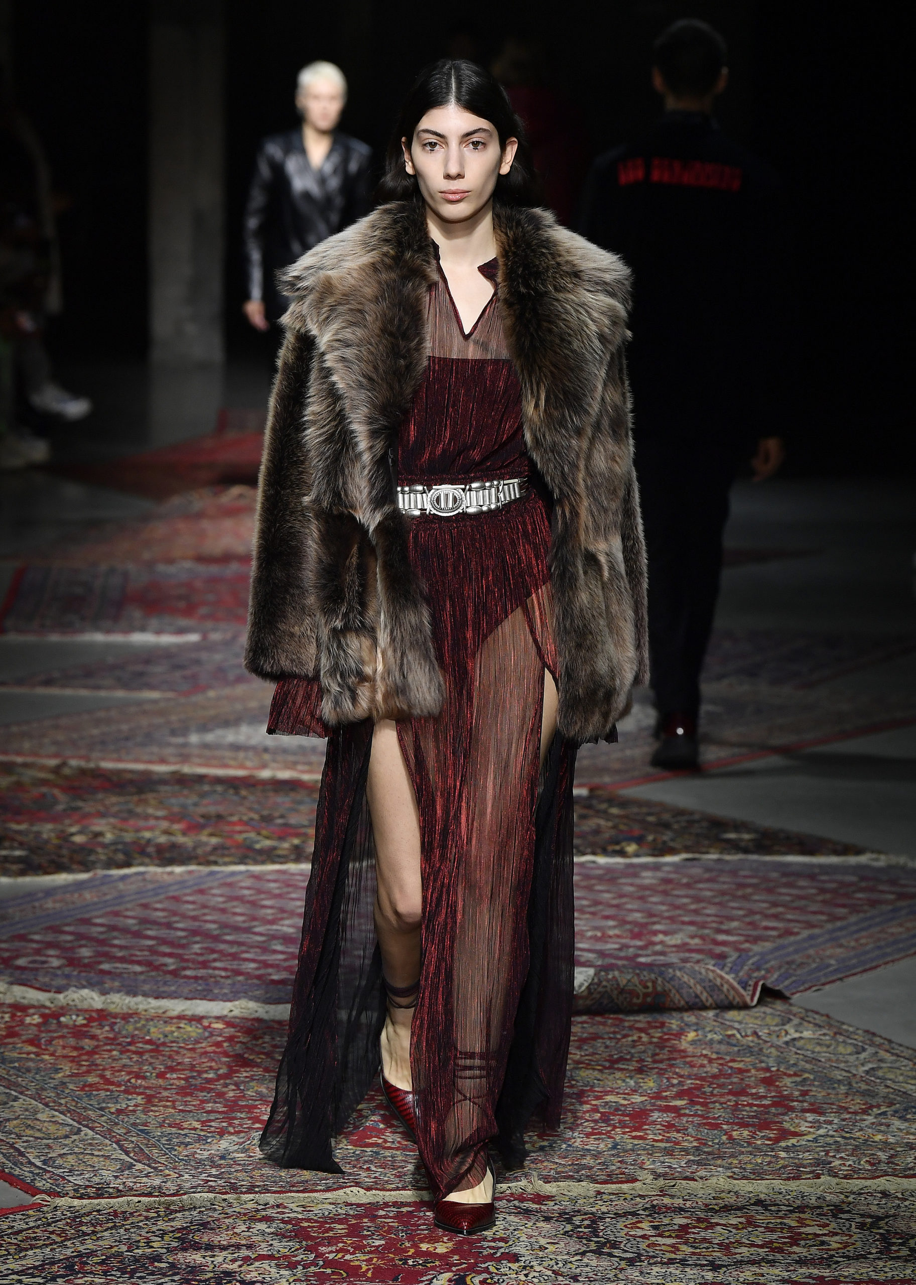 Merging directional and casual pieces with authentic techniques and new fabric developments, subtle nods to Anatolian culture can be found throughout in colours that warm from icy grey and pale corn yellow through pomegranate and denim blue. The red tulips of Istanbul are traced in thread embroidery across velvet or printed over cotton shirting, and the signature Les Benjamins carpet motif becomes jacquard knit dresses, scarves, and plush sweaters. A dusted flocking mimics a tapestry effect in soft mustard across grey wool suiting and outerwear, as intarsia knits and prints evoke Mount Nemrut and the Kackar mountains. In a collage of textiles, the contoured panels of sleeves and trousers recall the psychedelic graphics of 70s vinyl covers. Rock tropes continue in archetypal details and silhouettes, from smooth leather trench coats to a bootcut leg, fringed sleeve trims, and the glam touch of appliqué crystal or shaggy fake fur.