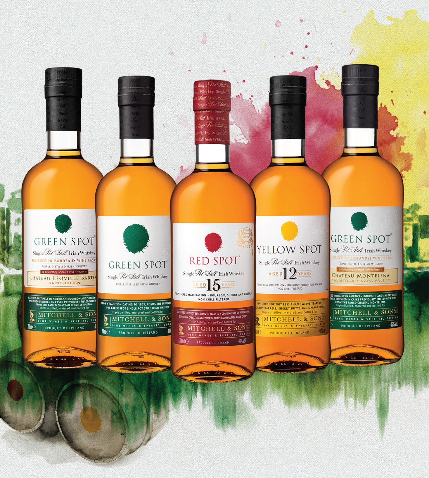 Produced at the Midleton distillery near Cork, Single Pot Still Green Spot (7 yo), Yellow Spot (12 yo) and Red Spot (15 yo) are distilled three times in pot stills from malted and unmalted barley.