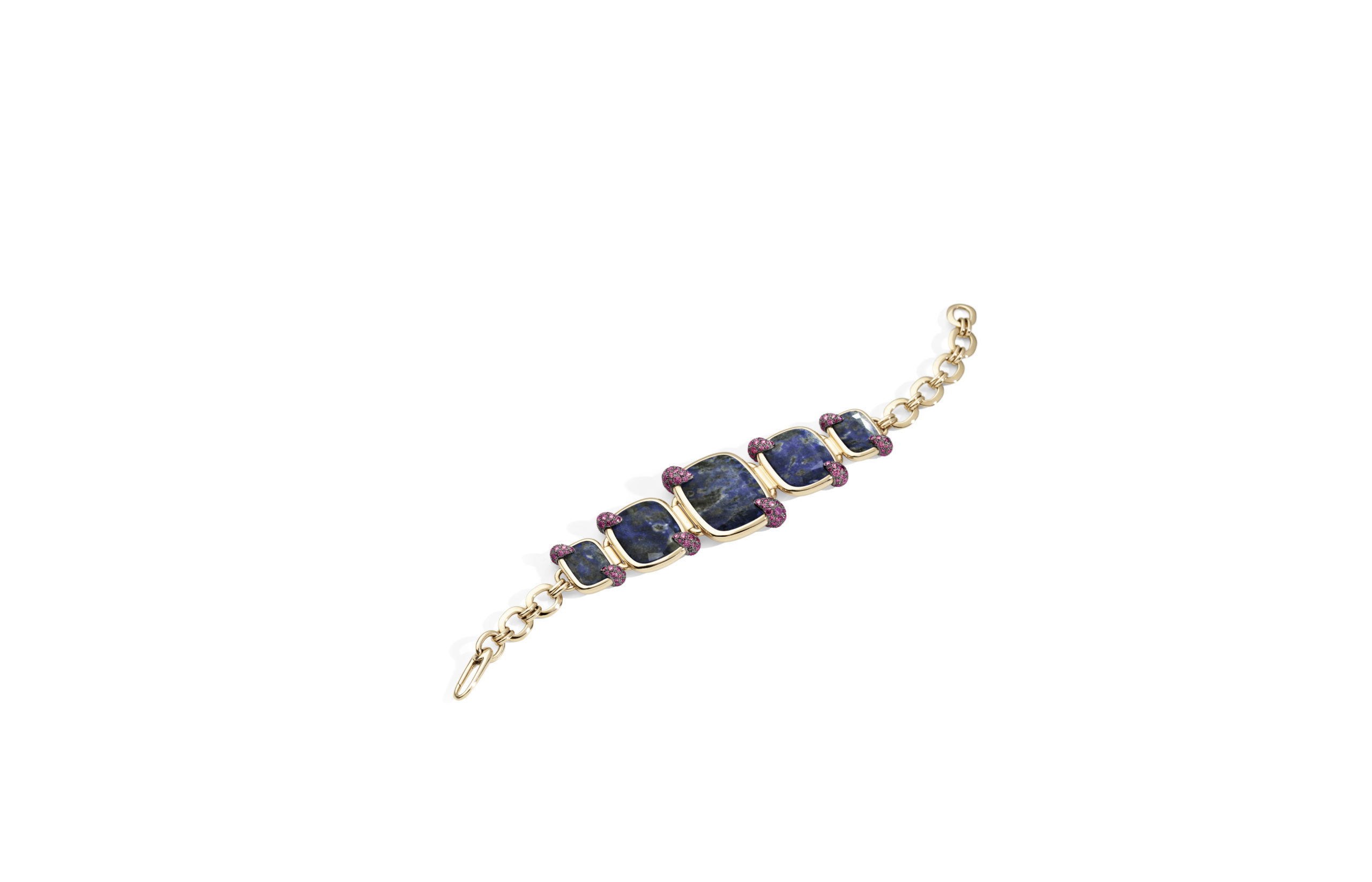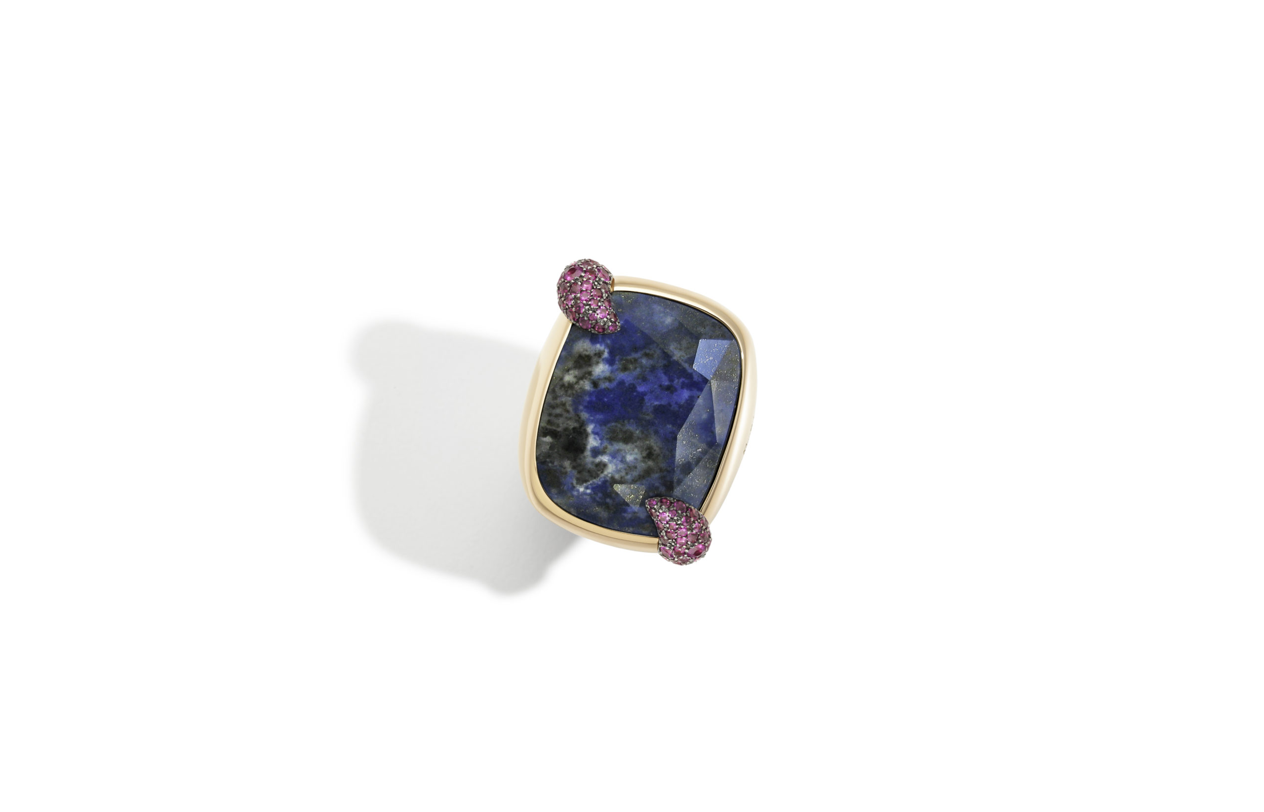 Lapis lazuli has been delicately faceted in the characteristic style of the Ritratto collection, revealing the stone’s intriguing natural beauty. Set with rubies sourced from sustainable resources in Tanzania, two refined claws wrap seductively around the lapis lazuli’s corners as if they were gently caressing it.