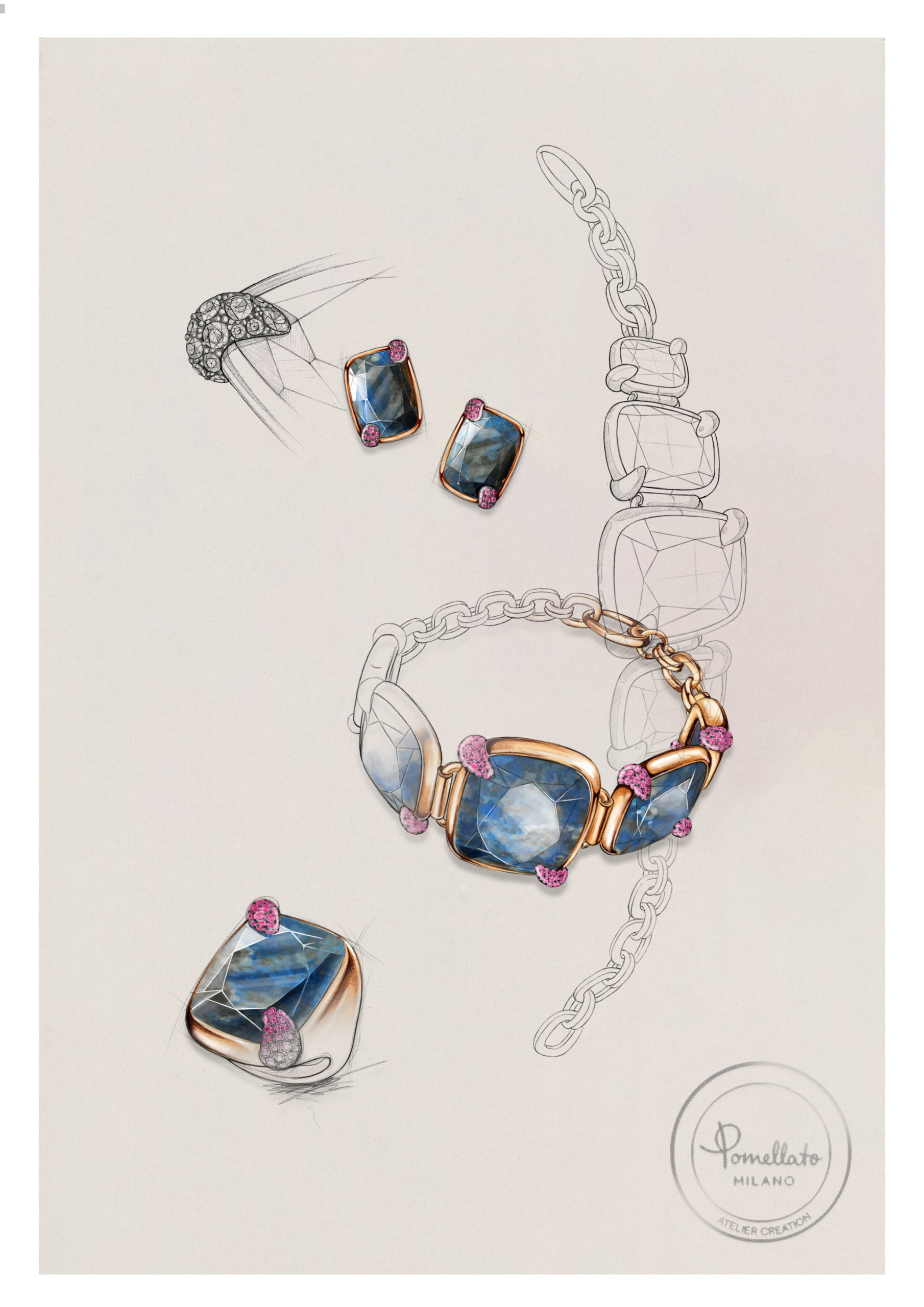 The project began with an idea from the Kering Award for Sustainable Fashion 2018 event, held at the London College of Fashion. Winner of the competition, Chilean student María Teresa Flores proposed creating jewelry using lapis lazuli sourced from sustainable resources in her native country. Interested in the idea, Pomellato investigated further and discovered the company Las Flores de los Andes, which supplies lapis lazuli. The stone is sustainably extracted in the company’s high-altitude artisanal mine, which is the only one of its kind in this South American country. The lapis lazuli was meticulously selected by Pomellato’s team of gem-buying experts for its high percentage of lazurite, which infuses the opaque stone with a deep blue color and a most seductive texture truly reminiscent of beloved jeans.
