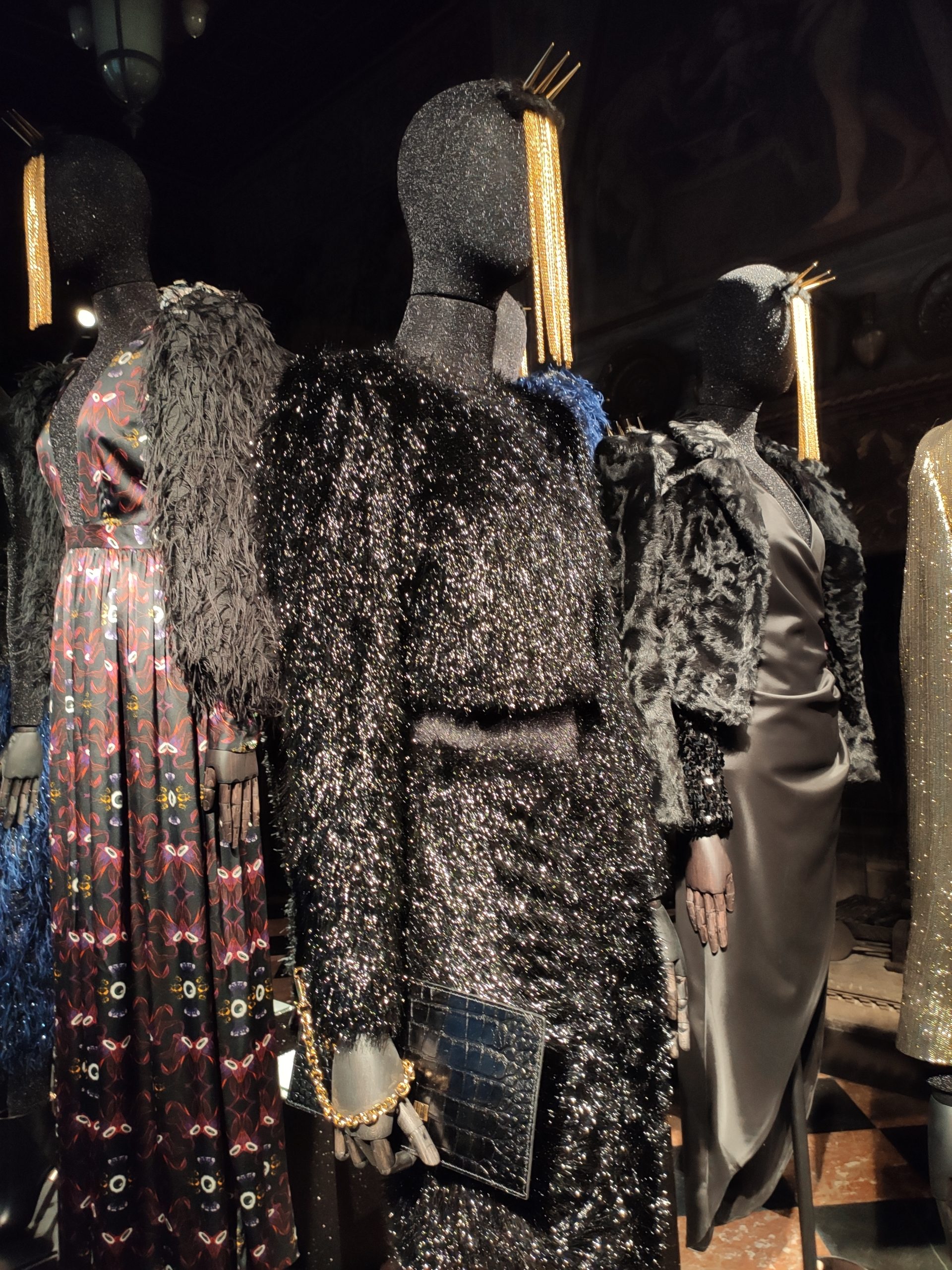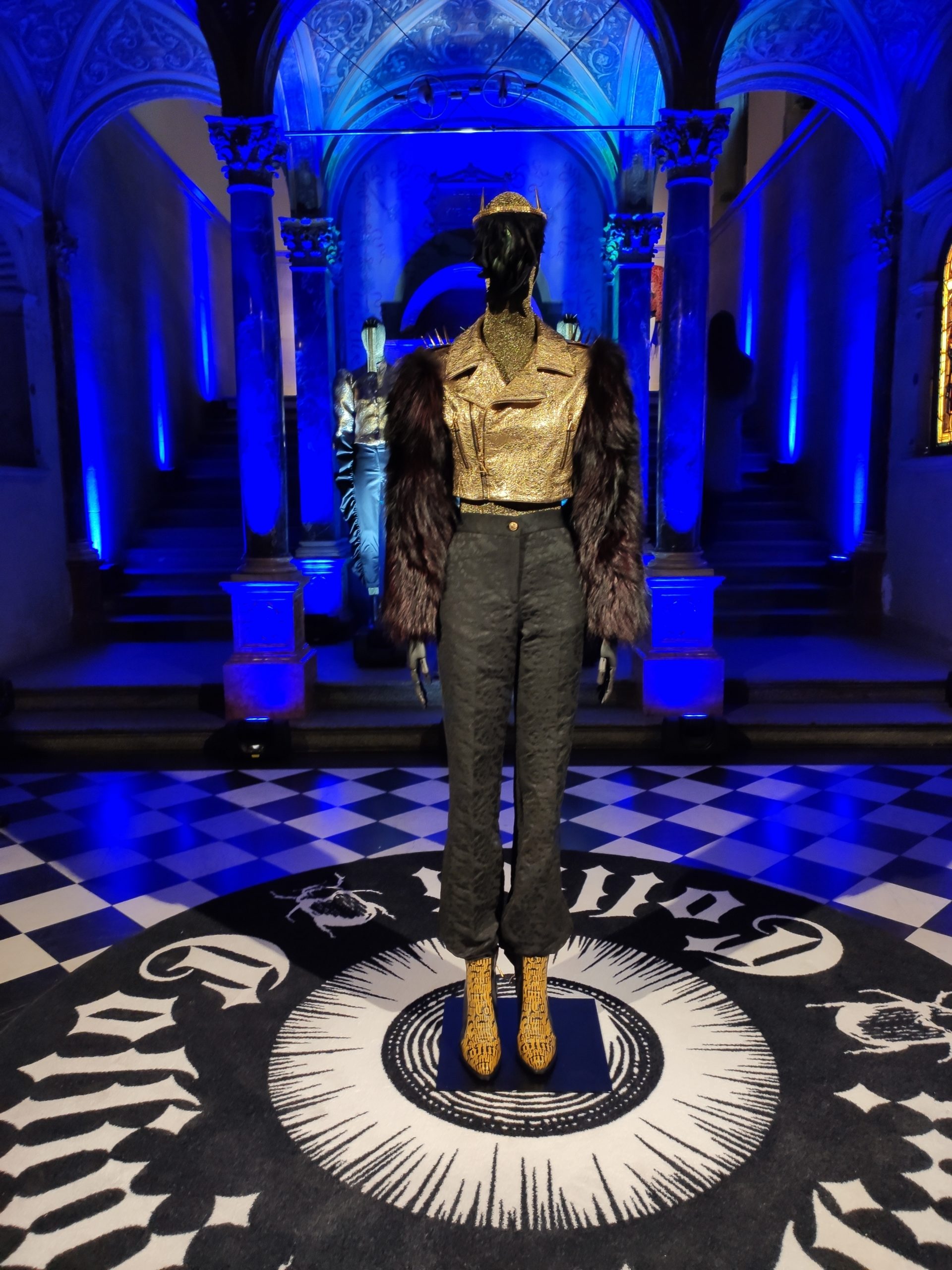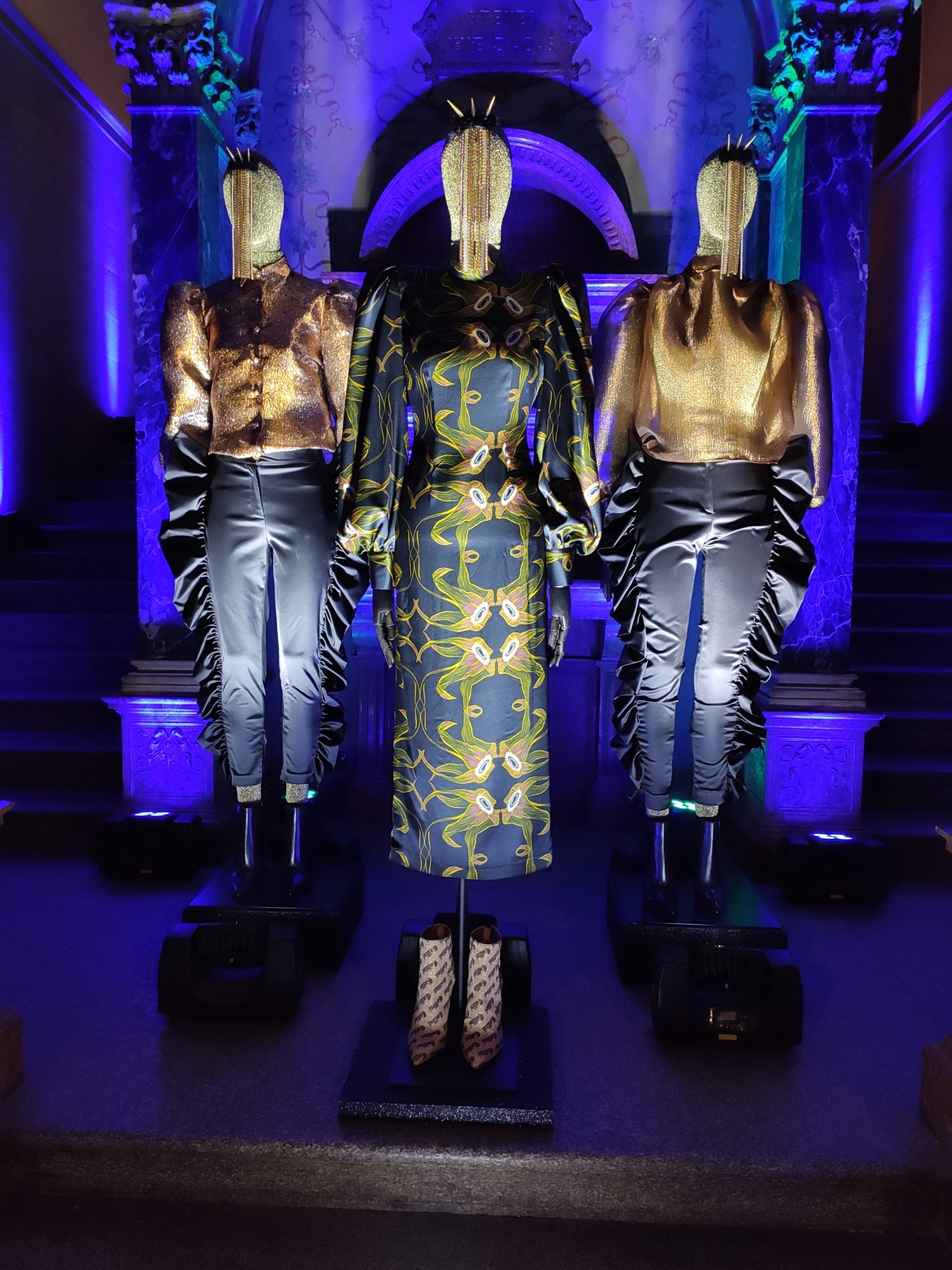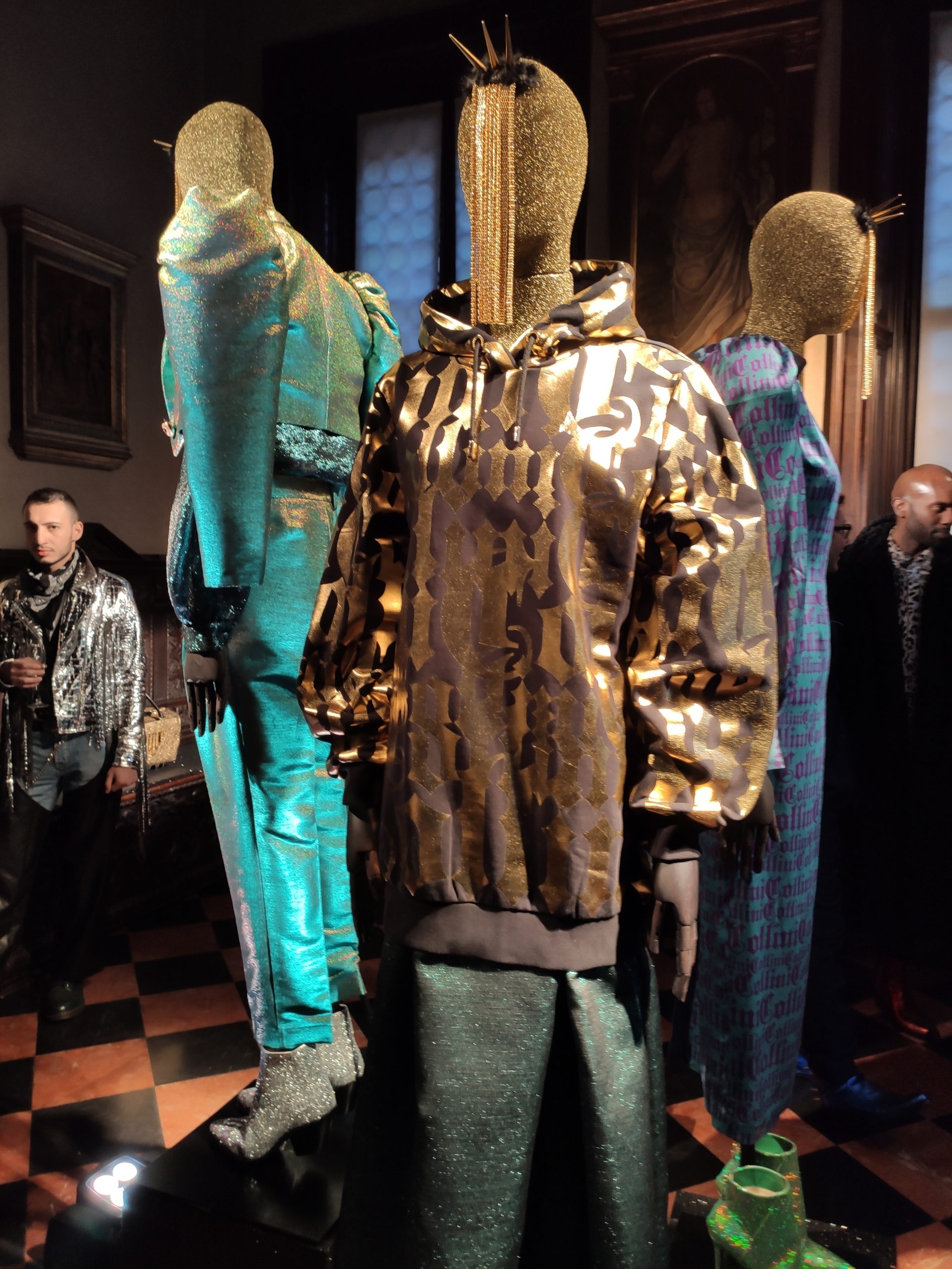 interprets daywear utilizing Golden Gothic incantations that embellish daytime sweatshirts paired with flowing leafy green metallic maxi skirts. Graphic incantations also for the seemingly prim and proper high necked silk midi dress, to be worn under a colorful Collini no kill 100% upcycled fur coat, worthy of a modern day rock star.