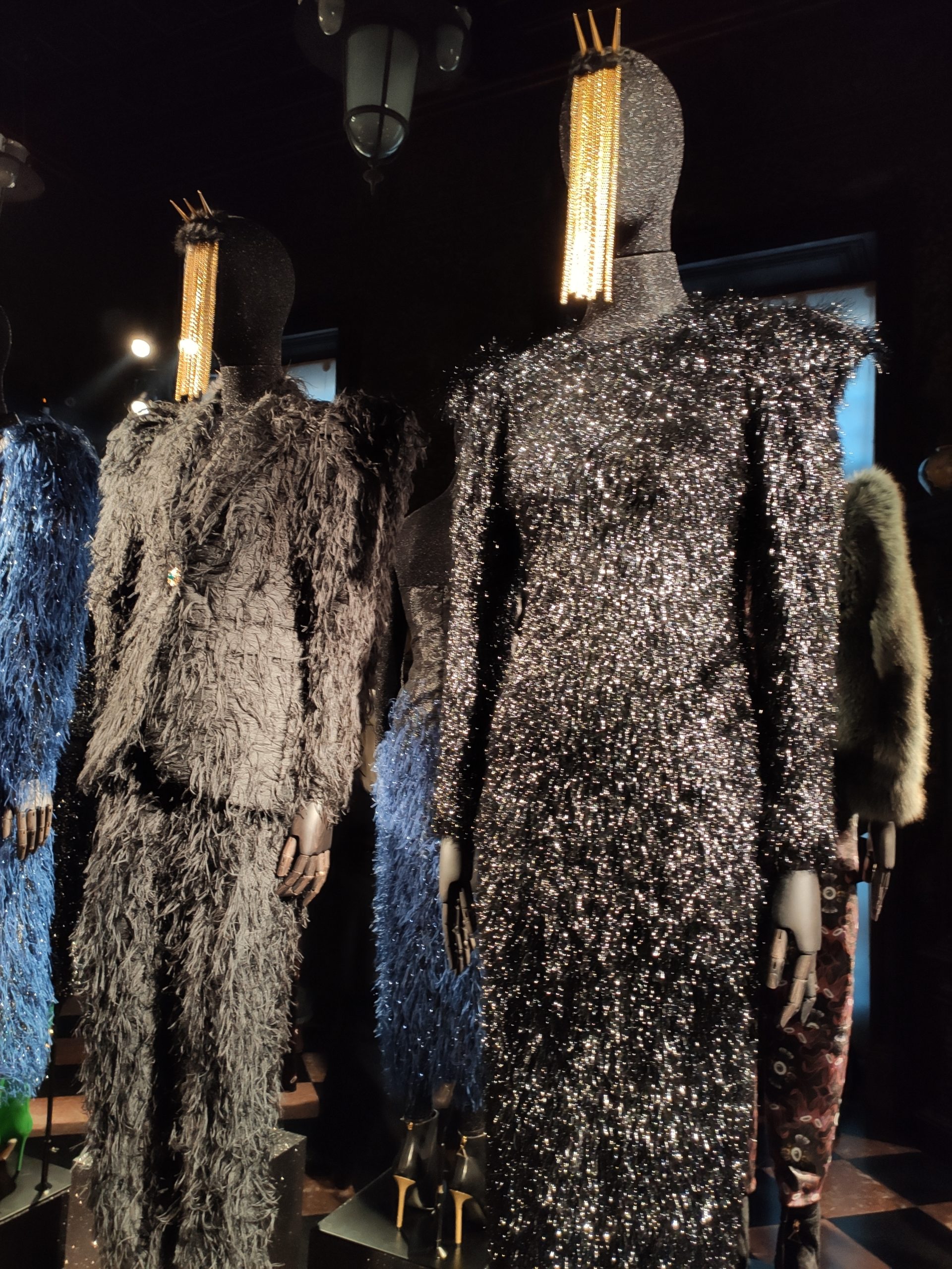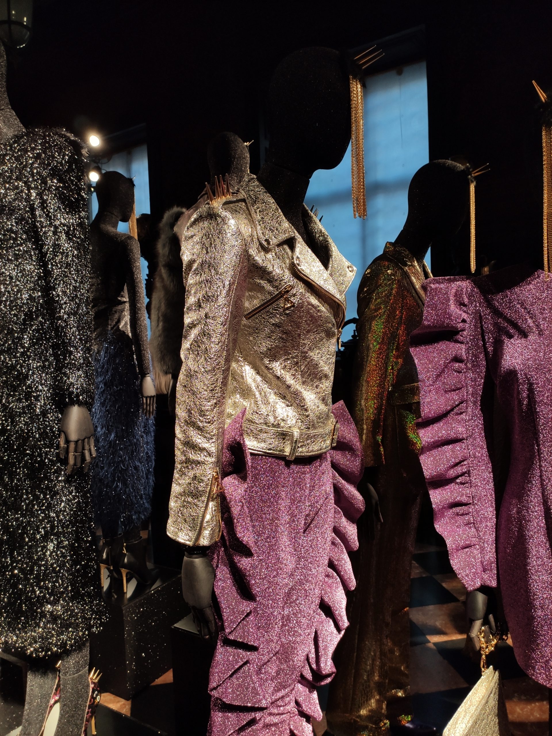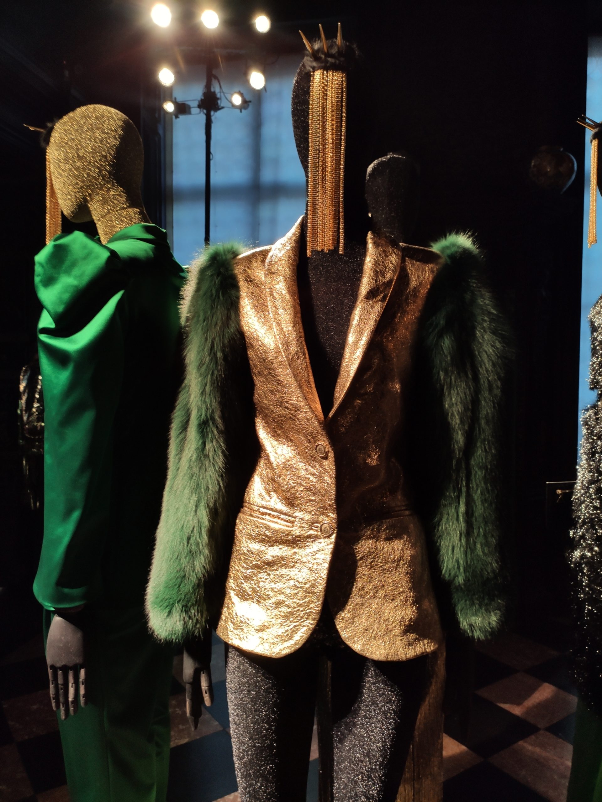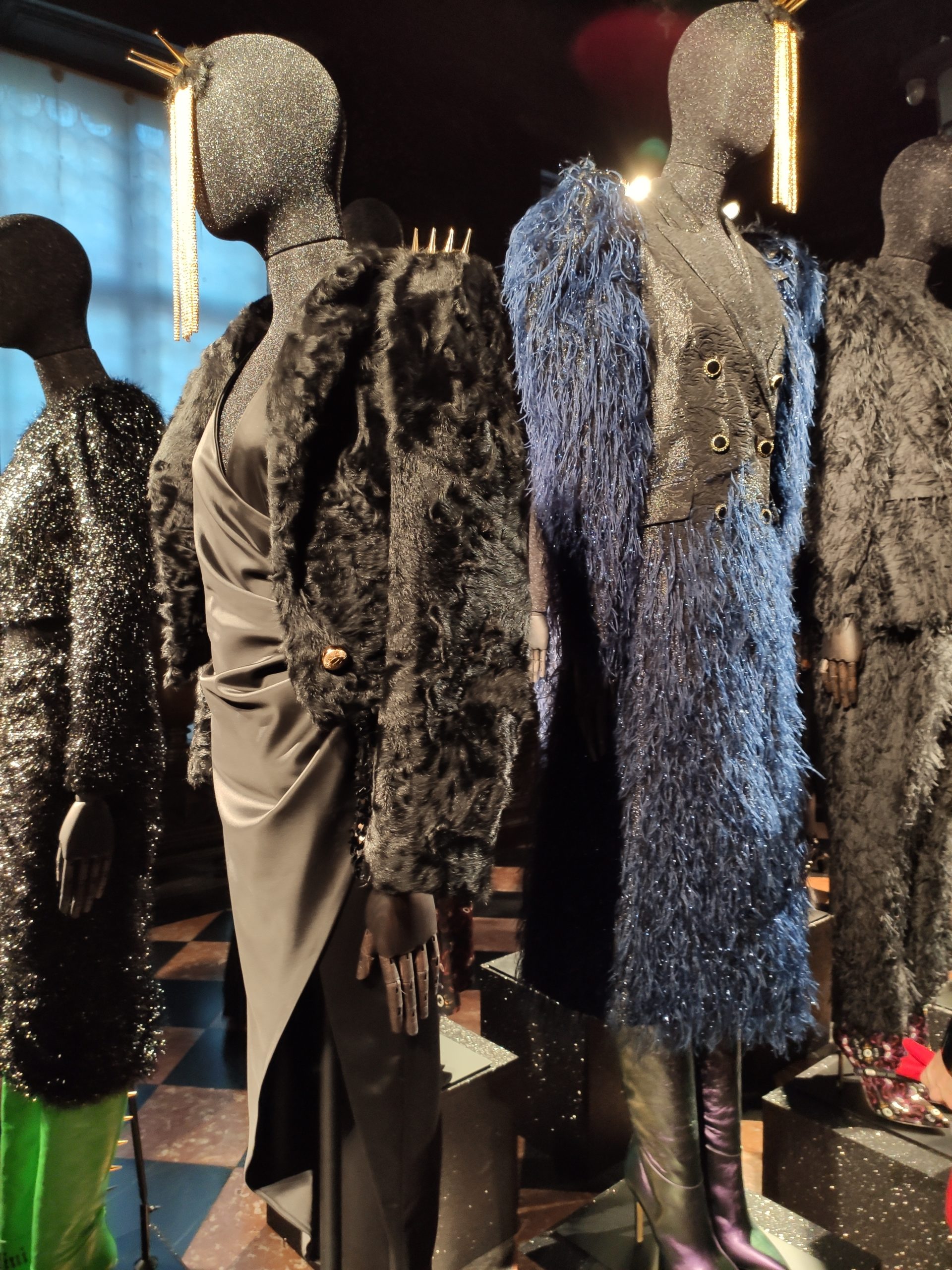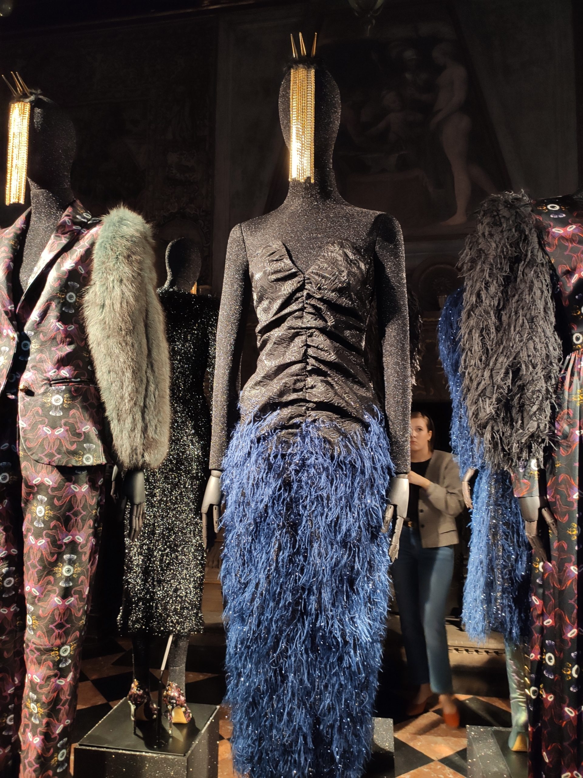 interprets daywear utilizing Golden Gothic incantations that embellish daytime sweatshirts paired with flowing leafy green metallic maxi skirts. Graphic incantations also for the seemingly prim and proper high necked silk midi dress, to be worn under a colorful Collini no kill 100% upcycled fur coat, worthy of a modern day rock star.