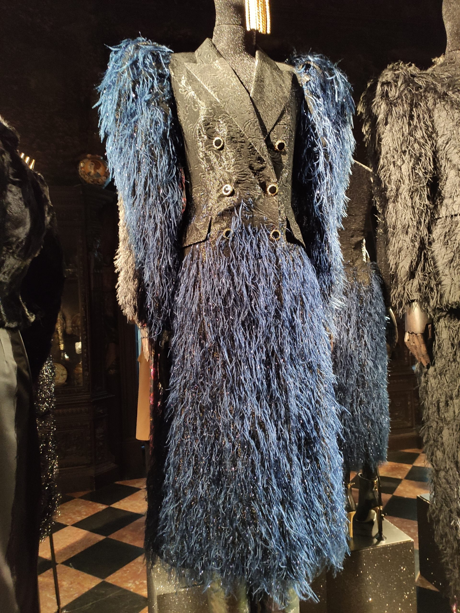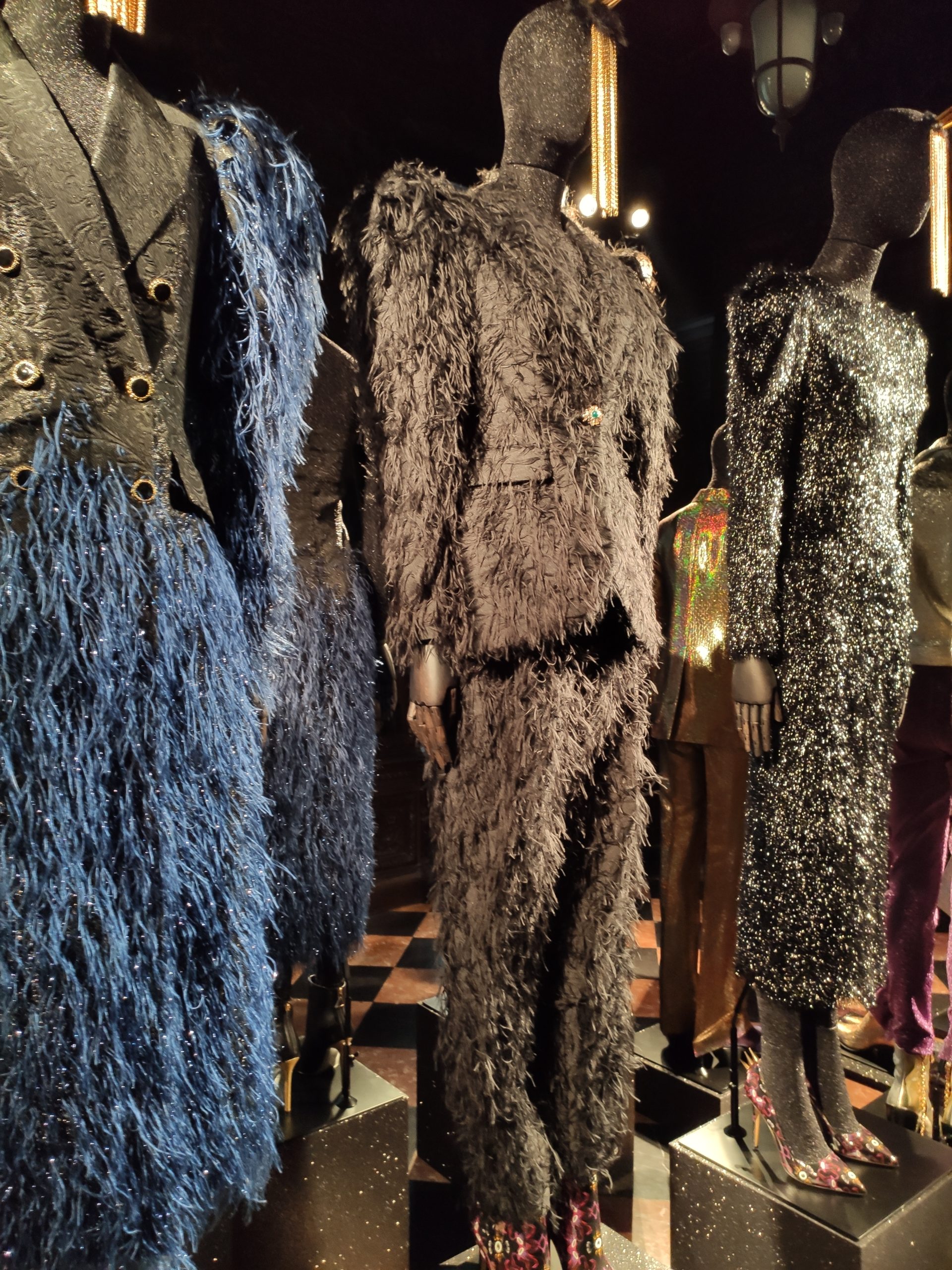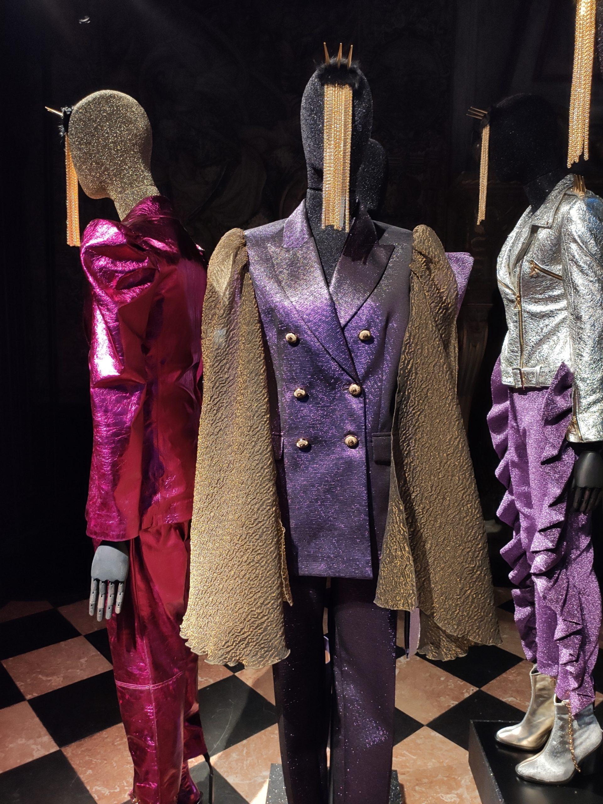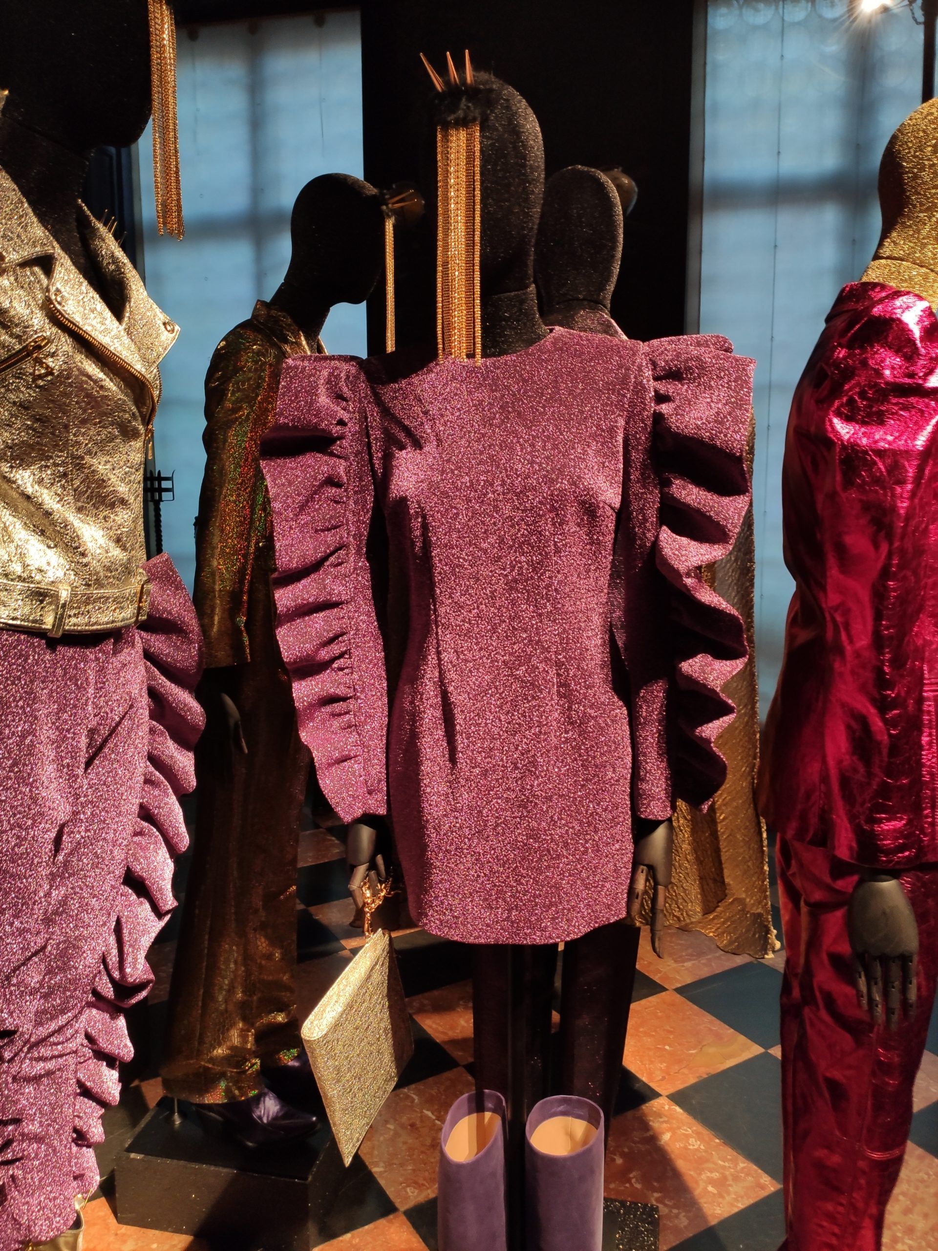 interprets daywear utilizing Golden Gothic incantations that embellish daytime sweatshirts paired with flowing leafy green metallic maxi skirts. Graphic incantations also for the seemingly prim and proper high necked silk midi dress, to be worn under a colorful Collini no kill 100% upcycled fur coat, worthy of a modern day rock star.