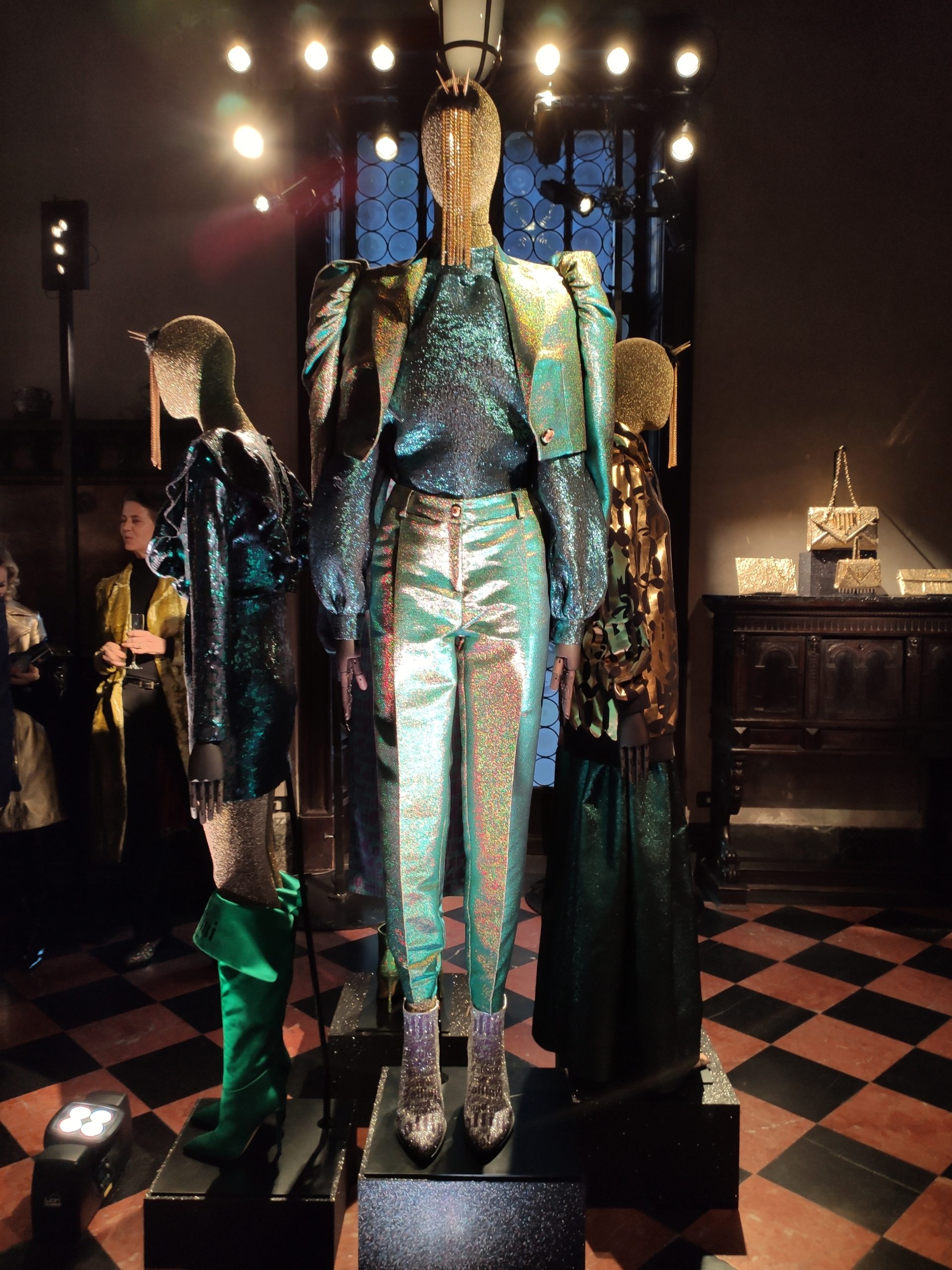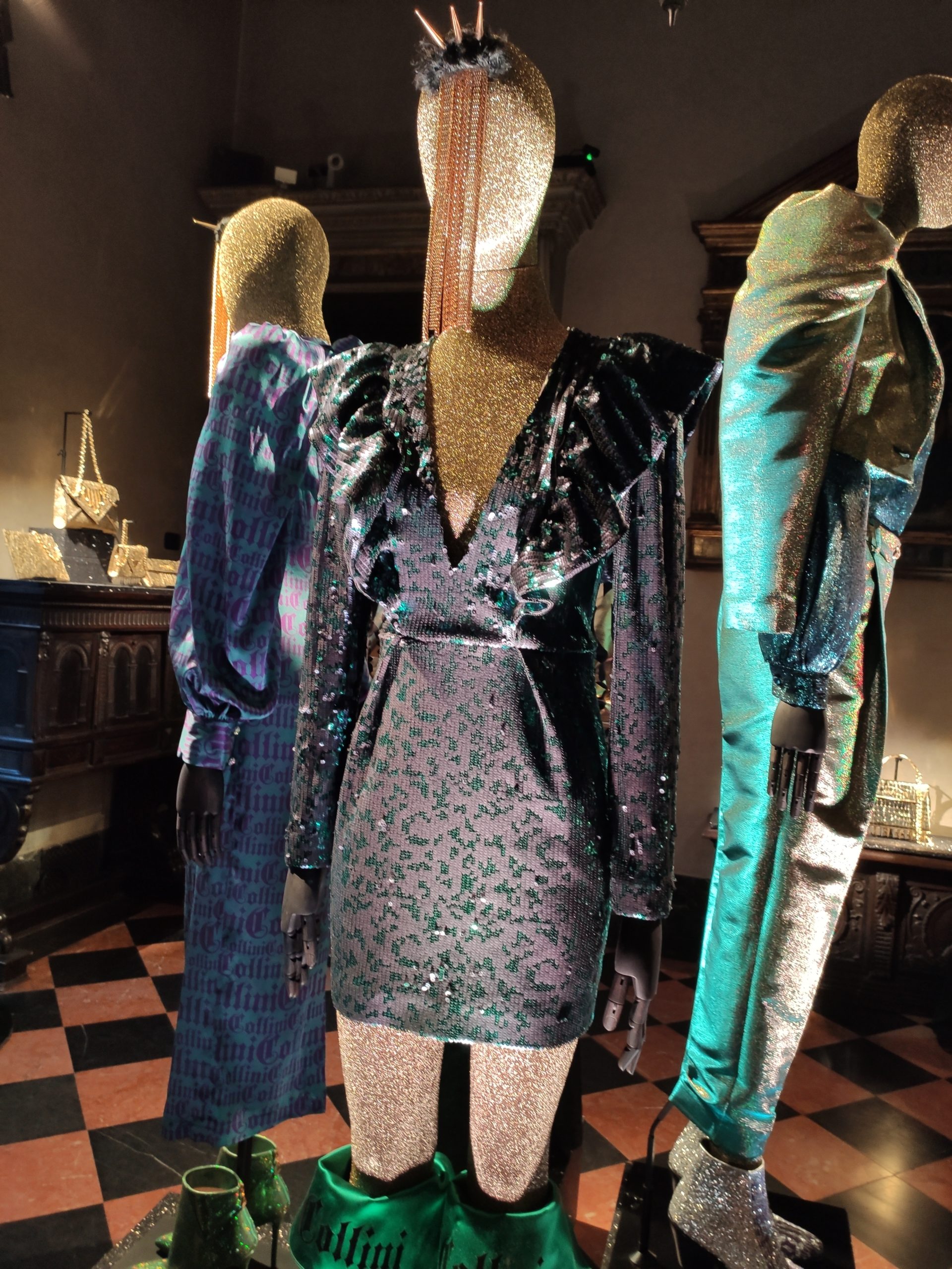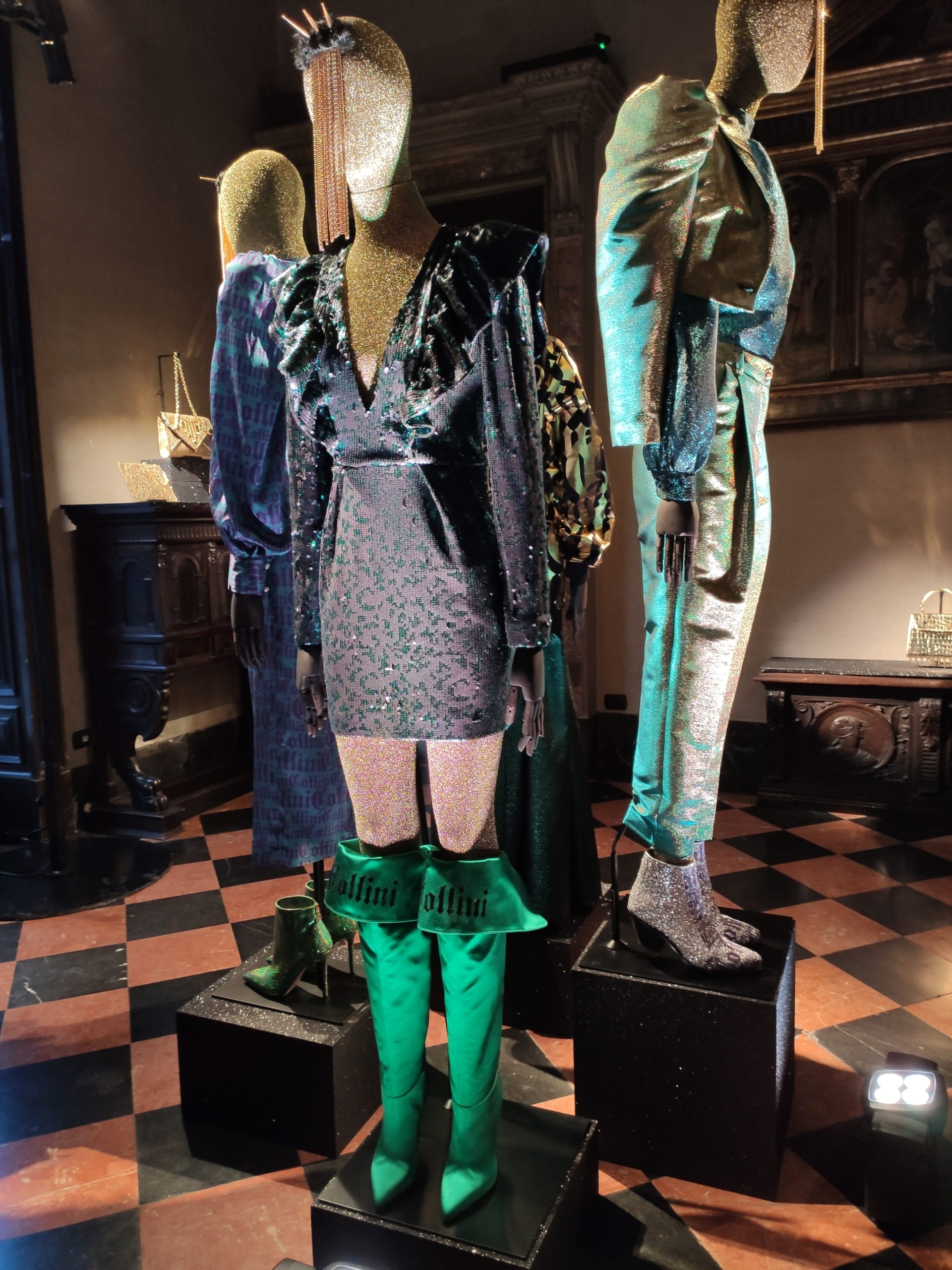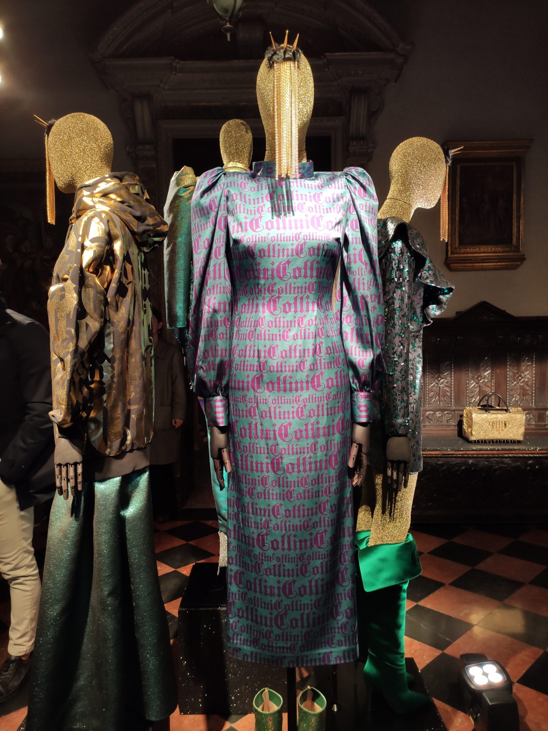 power suits construed of golden bark, or sexy strapless cocktail dresses part luxurious brocade , part fuzzy animal paired with metallic pirate boots in bottle green. Alchemy and Irreverence are keywords in the surreal universe of the Collini Milano woman FW 2020/21.