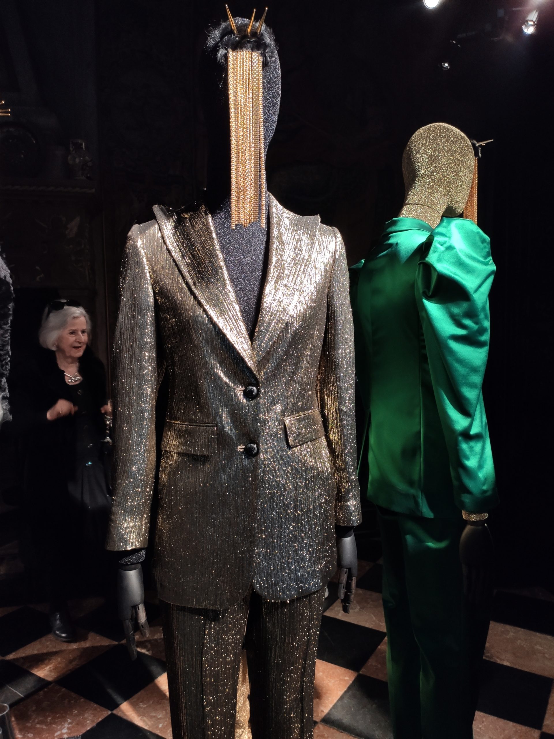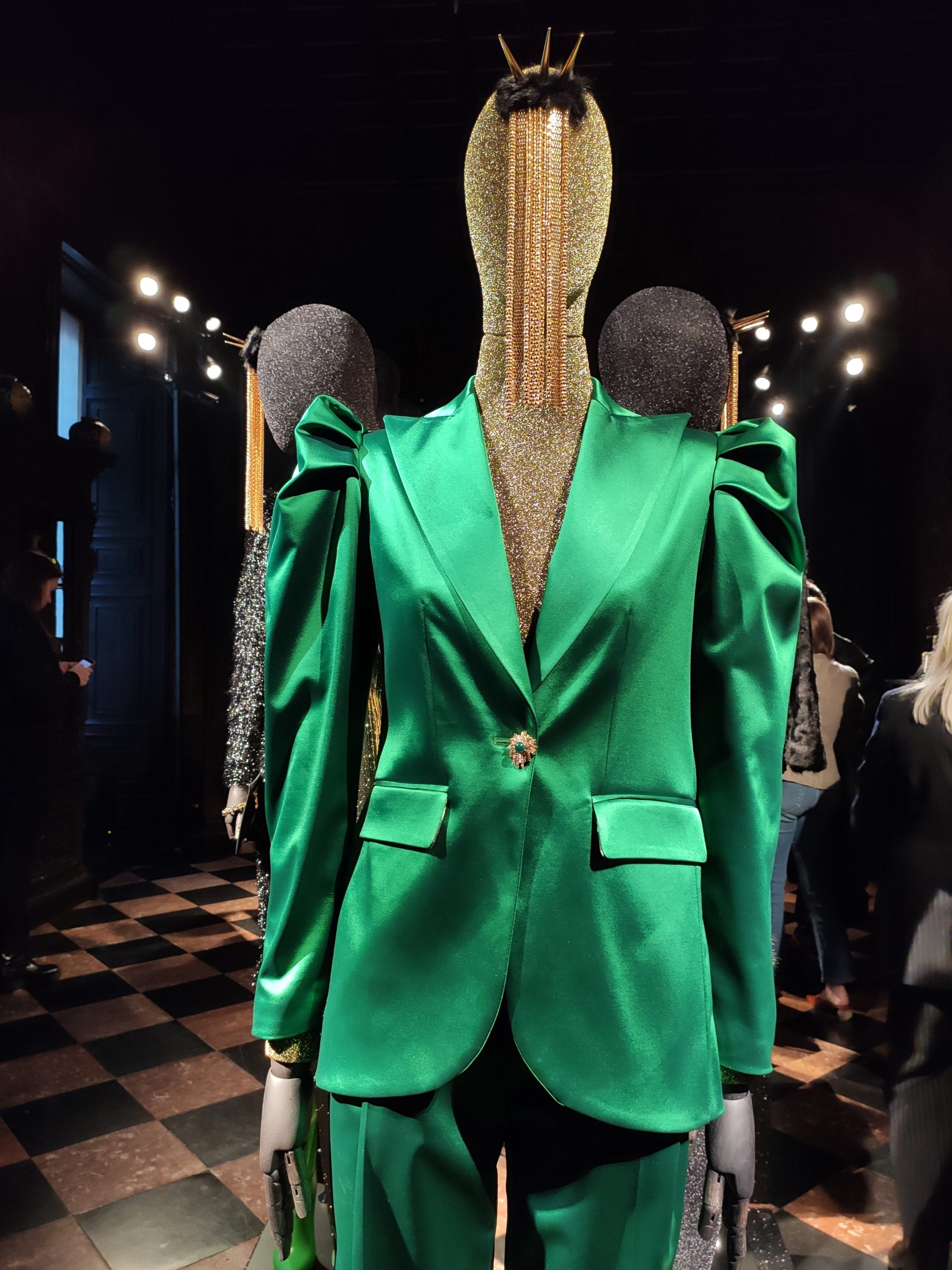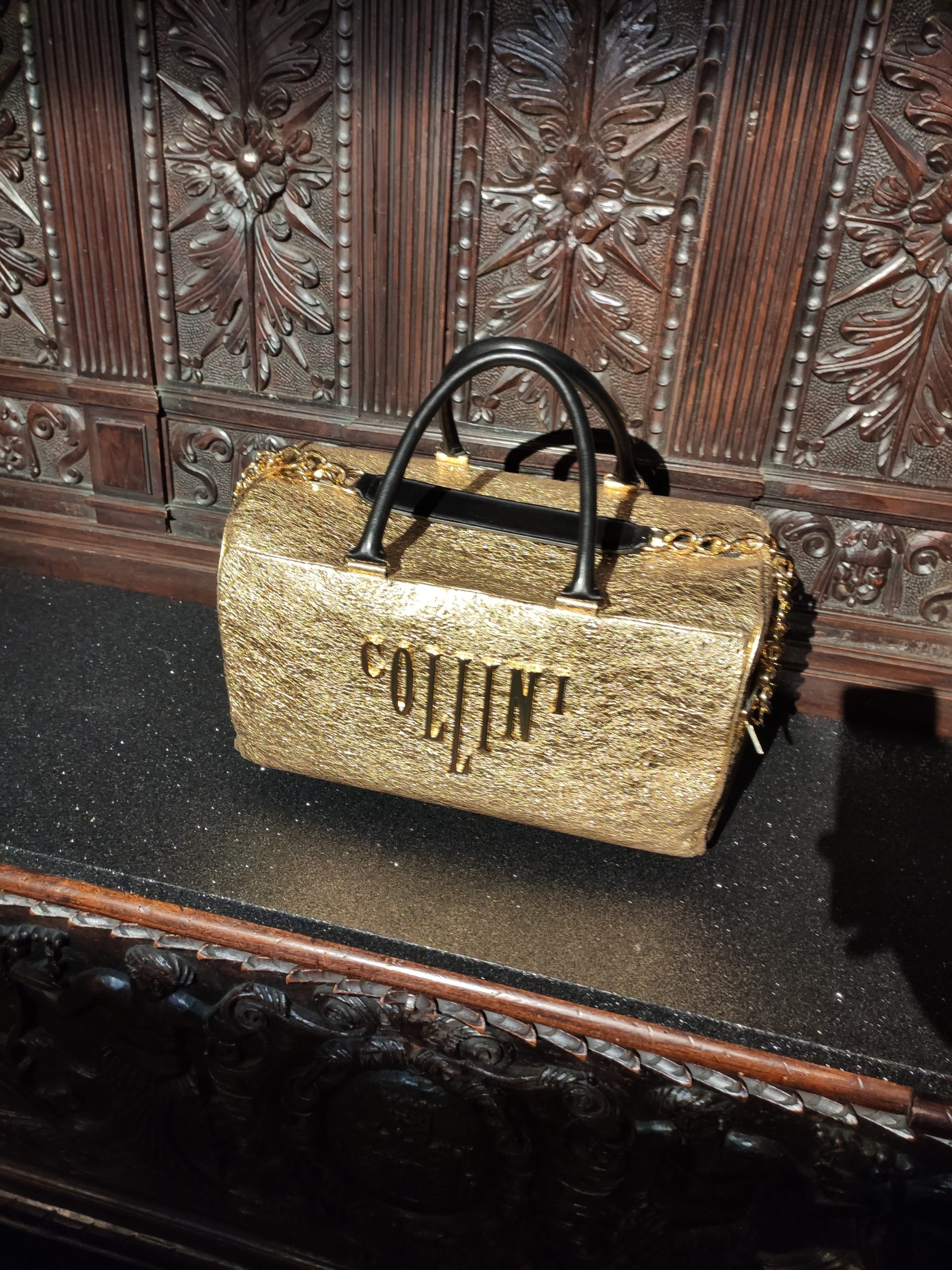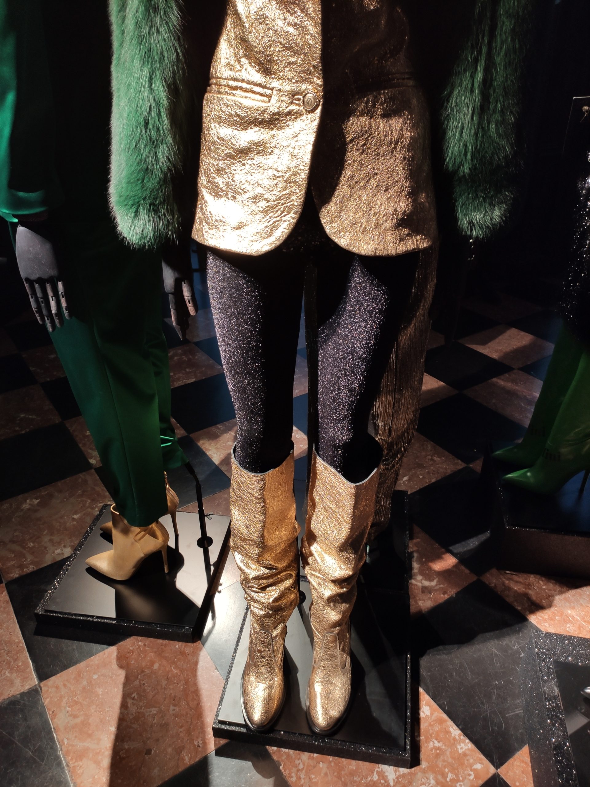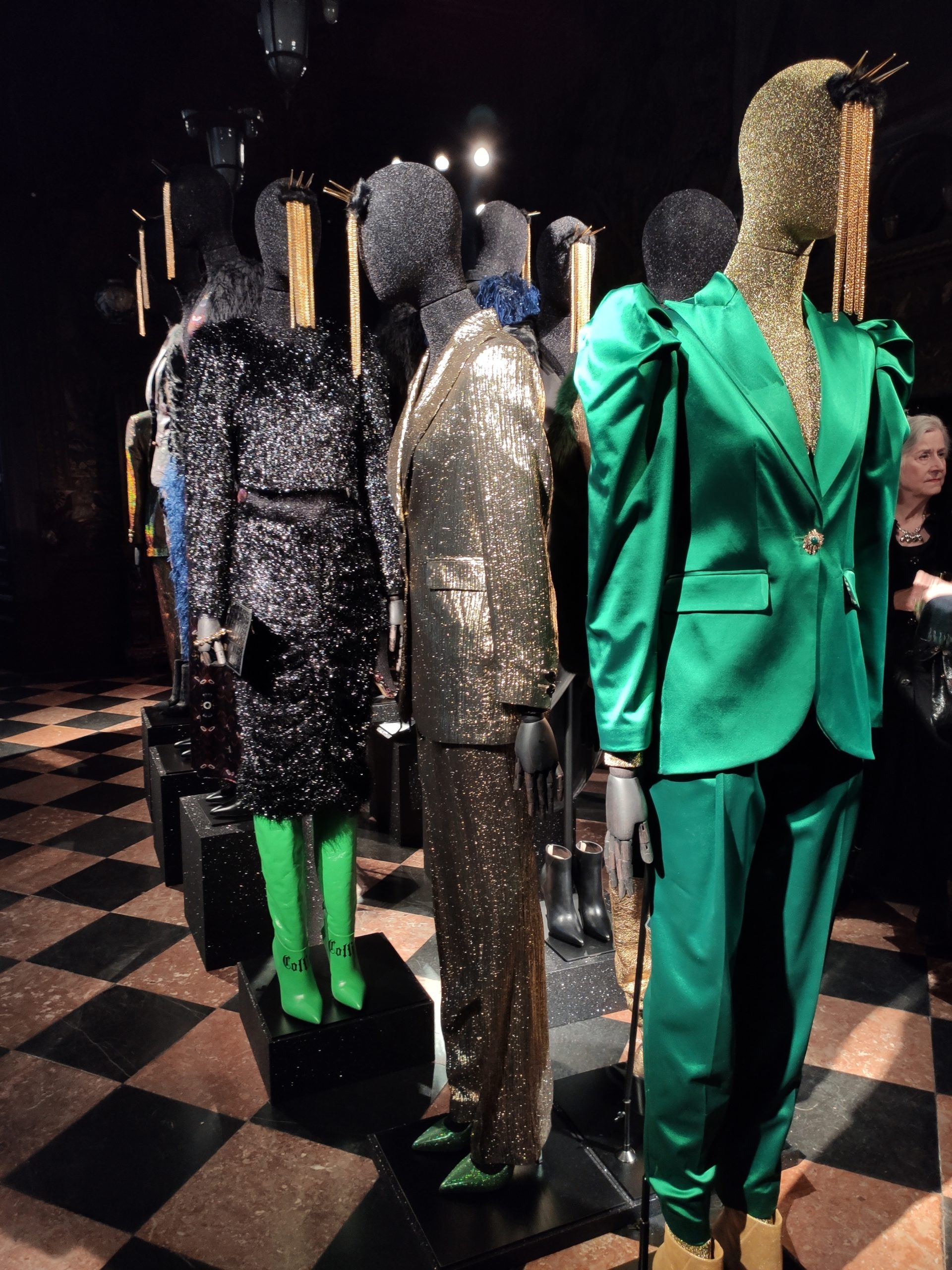 power suits construed of golden bark, or sexy strapless cocktail dresses part luxurious brocade , part fuzzy animal paired with metallic pirate boots in bottle green. Alchemy and Irreverence are keywords in the surreal universe of the Collini Milano woman FW 2020/21.