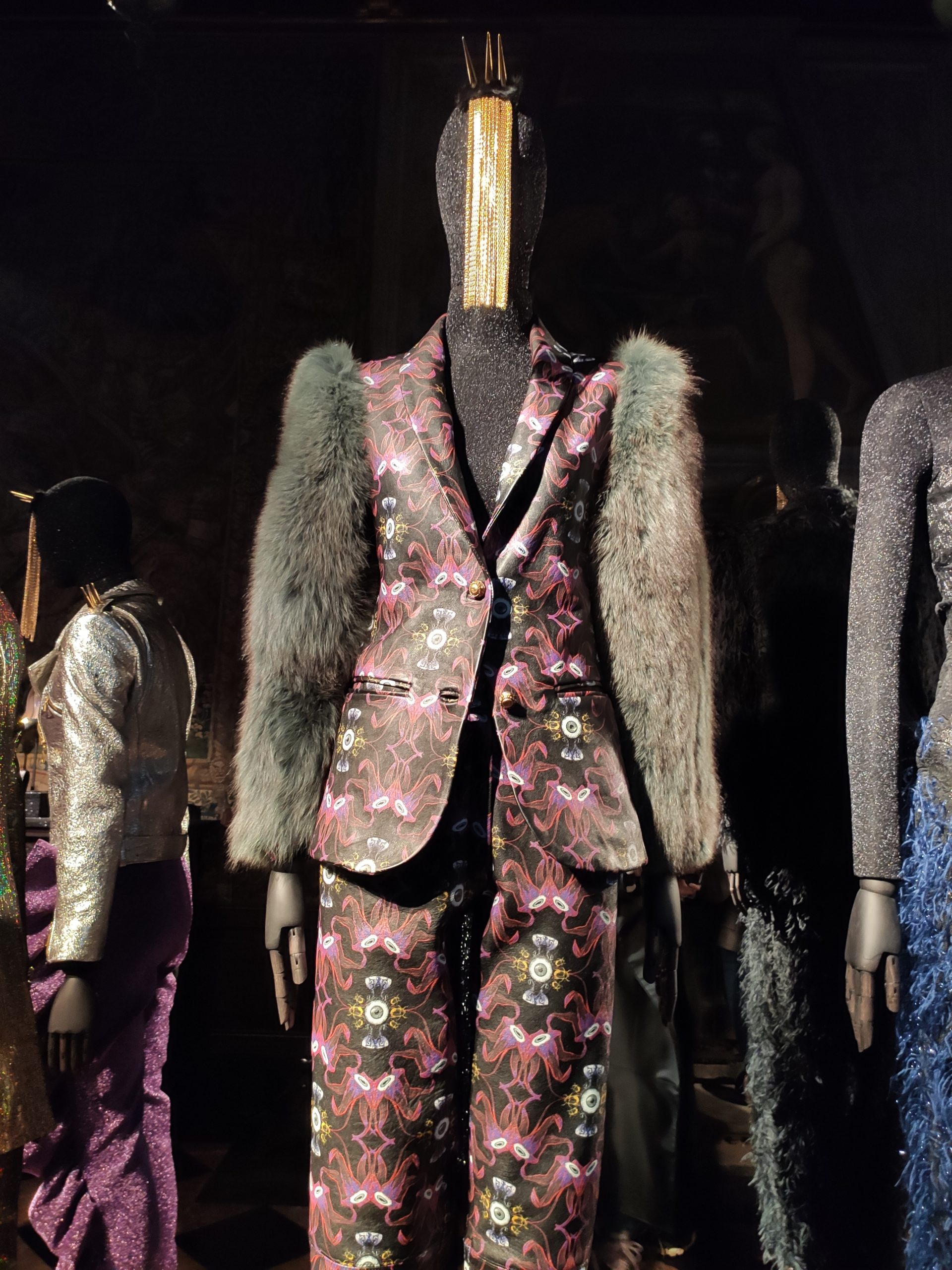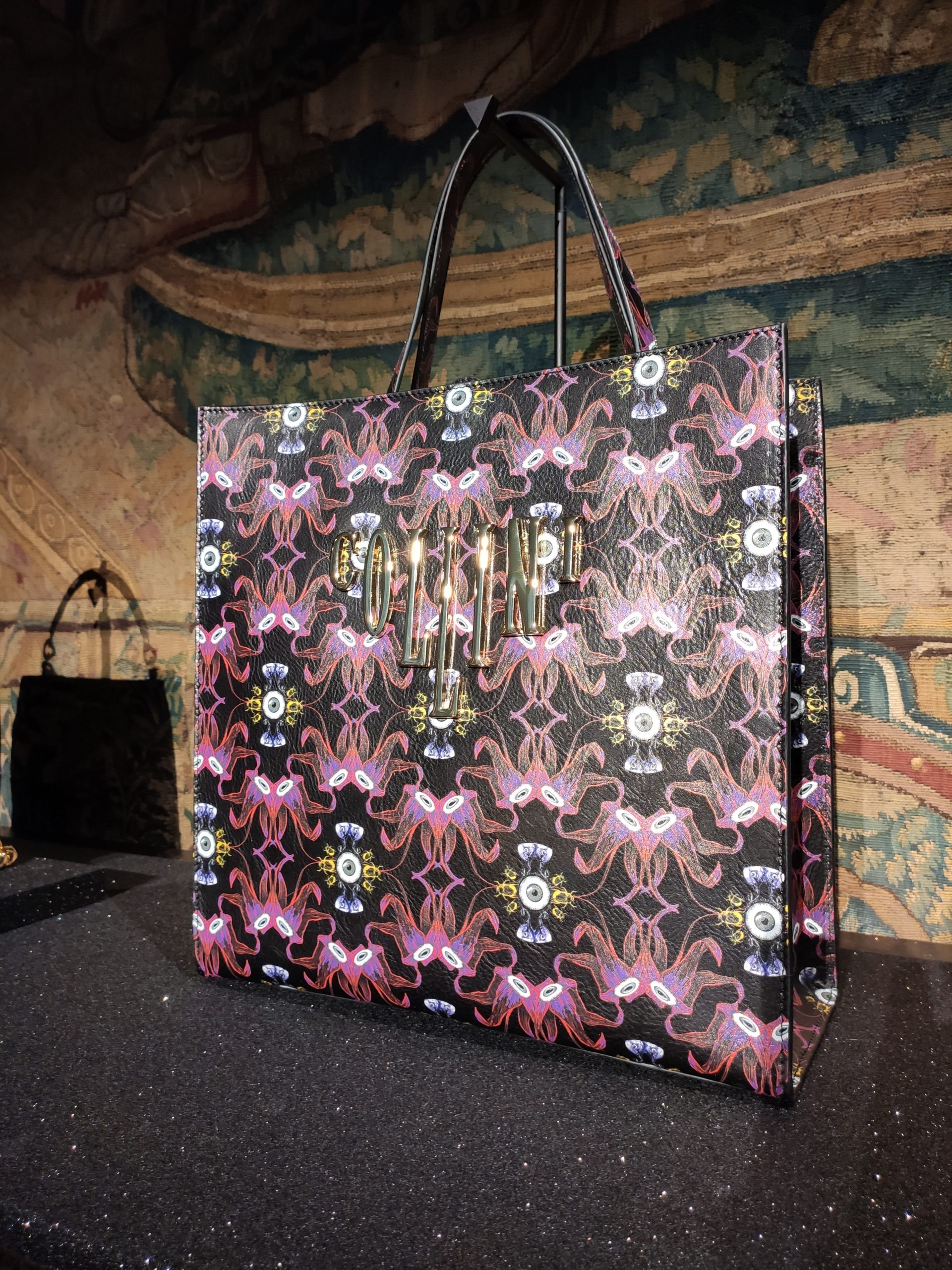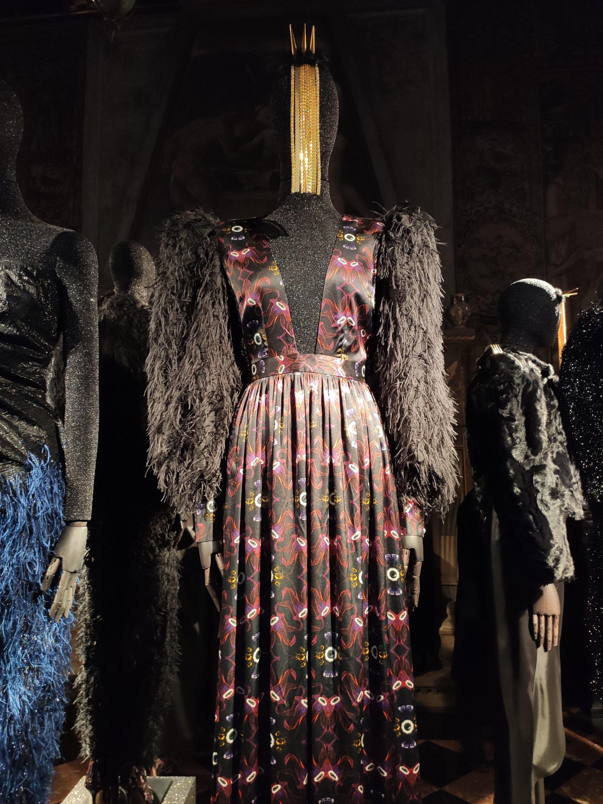 Prints pay homage to ancient symbolism, an eye here , a beetle there, and form flowing silk gowns with plunging necklines or leather jackets with matching trousers, both featuring unexpected furry sleeves. Collini