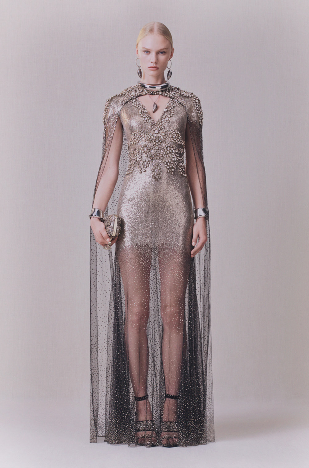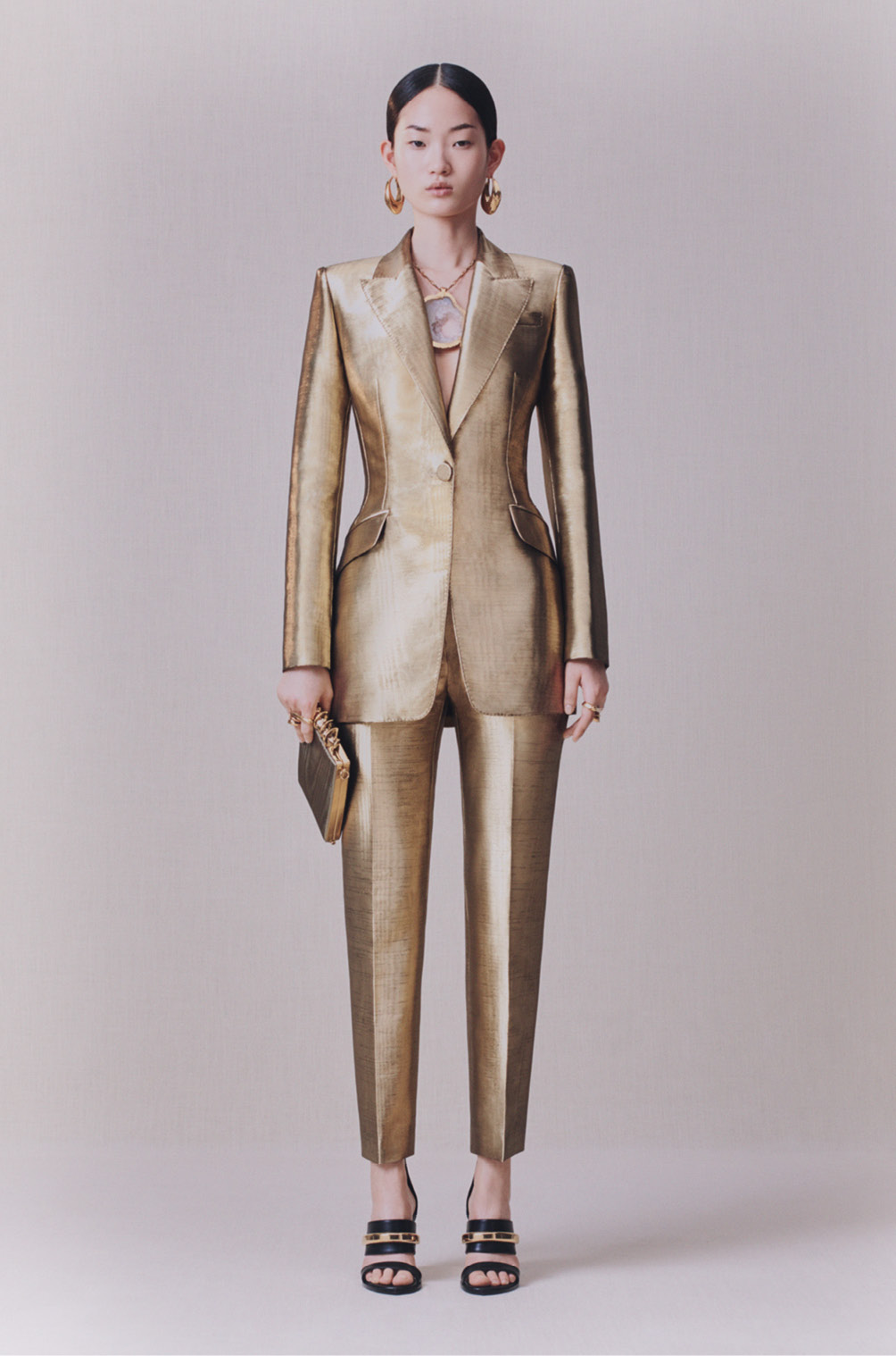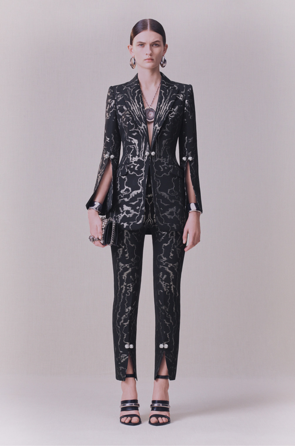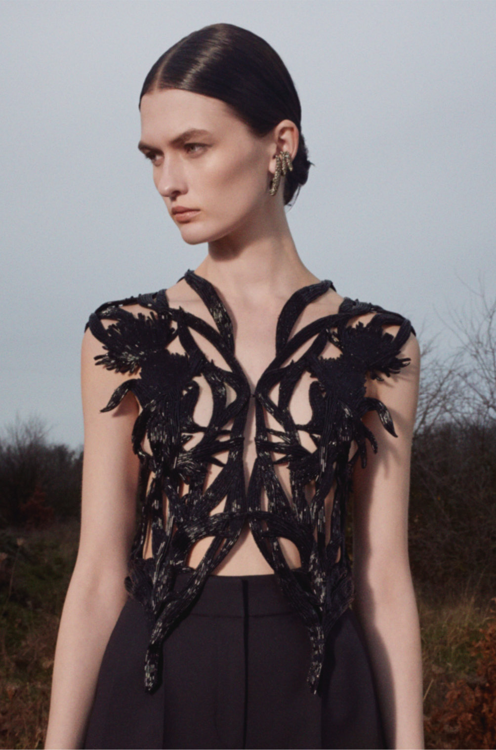 British art nouveau and craftsmanship, the understated elegance of modernism: sinuous iris, proud thistle and Glasgow rose. The windswept earth and landscapes of the North have been laid bare. The heart of the earth and the treasures hidden beneath its surface. Metallic minerals: rich seams of gold, silver and copper everywhere. Mineralogy: crystal, agate, flint, rock; opaque and sculptural on the outside, jewel-like and reflective on the inside. The juxtaposition between sobriety and seduction, the raw and the refined, the textured and the smooth, light and dark, all contrast with the handwriting of the House of Alexander McQueen.