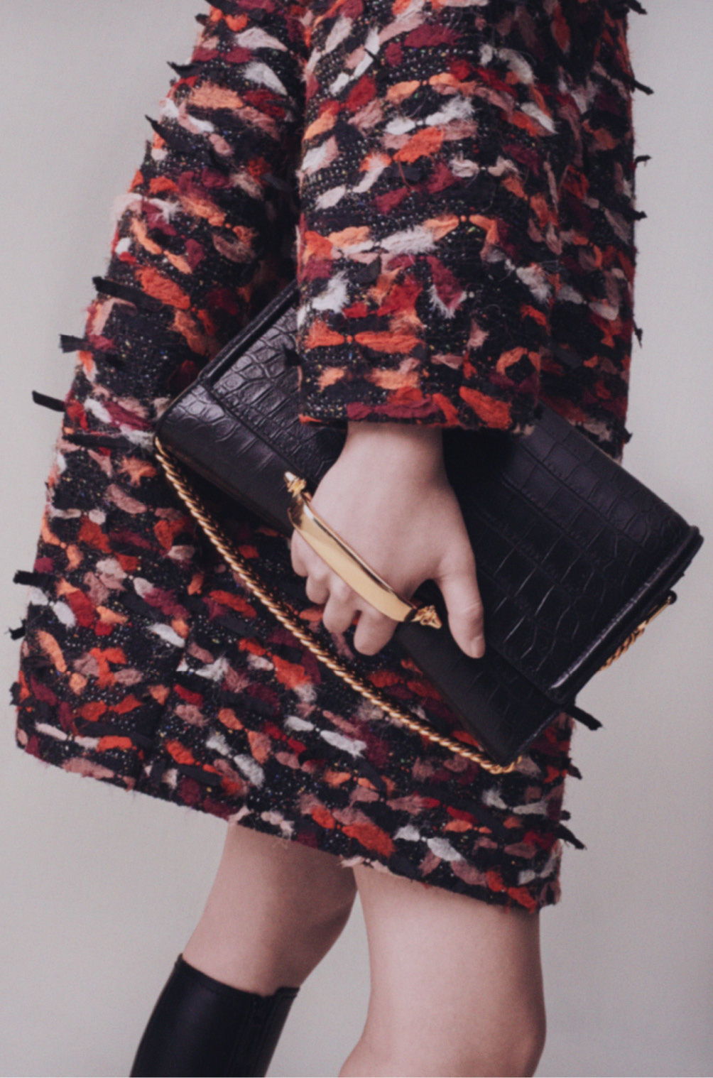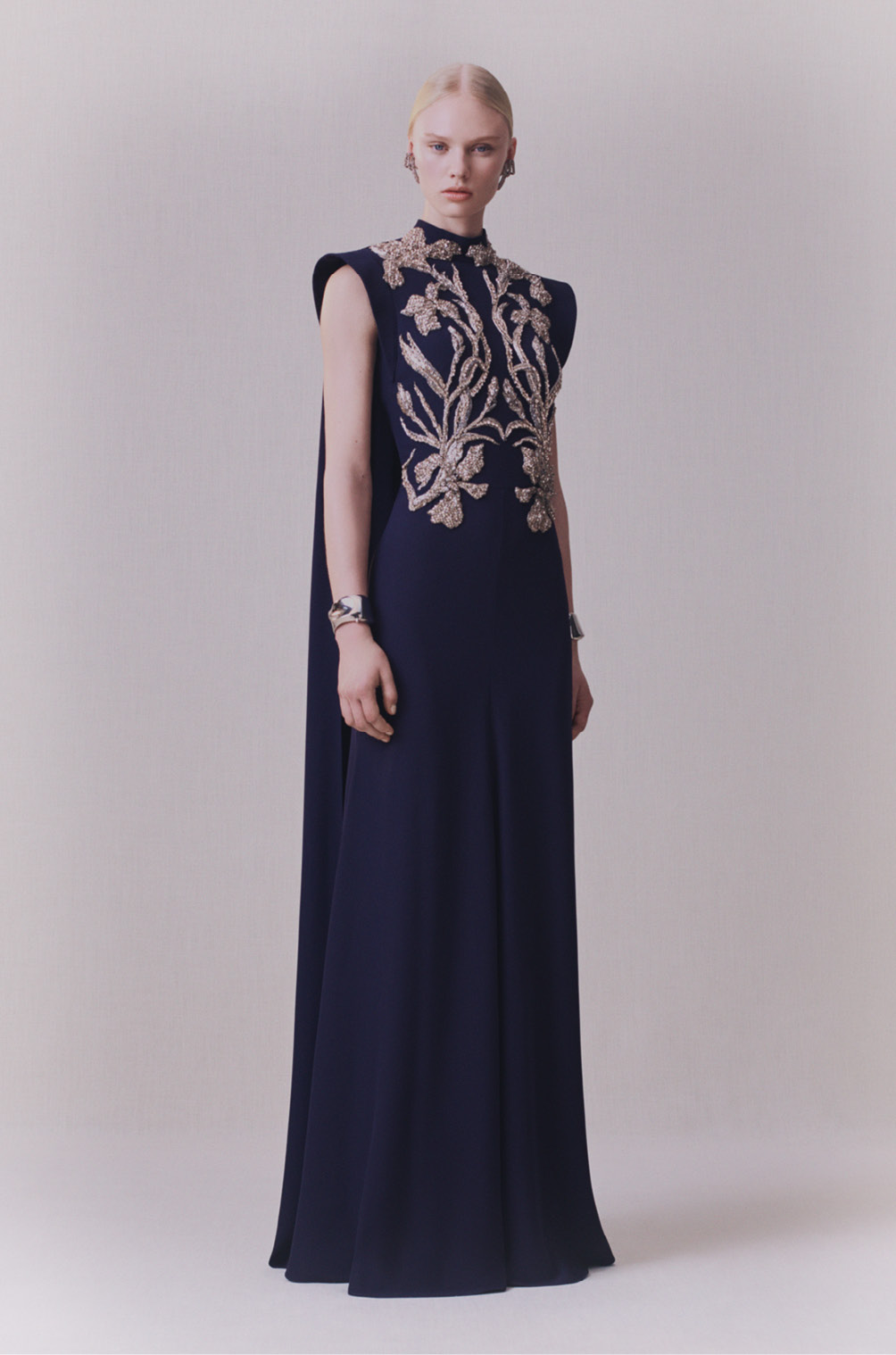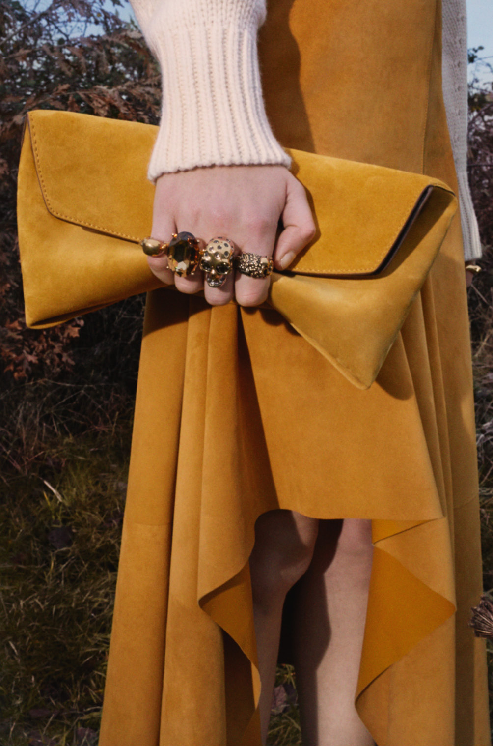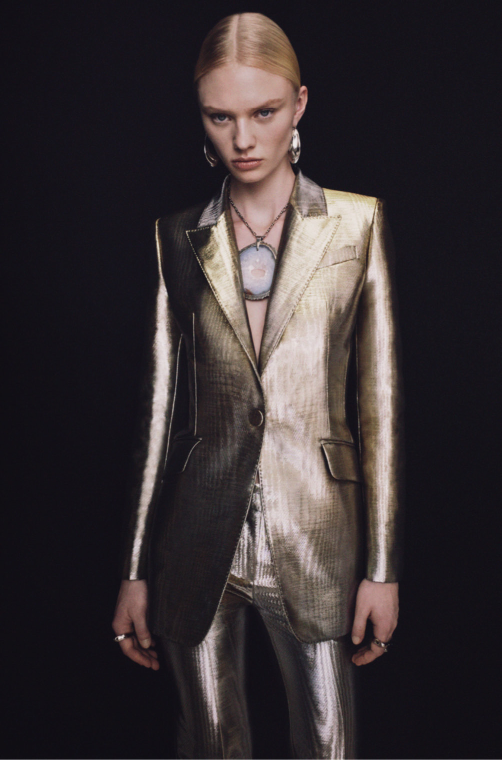 British art nouveau and craftsmanship, the understated elegance of modernism: sinuous iris, proud thistle and Glasgow rose. The windswept earth and landscapes of the North have been laid bare. The heart of the earth and the treasures hidden beneath its surface. Metallic minerals: rich seams of gold, silver and copper everywhere. Mineralogy: crystal, agate, flint, rock; opaque and sculptural on the outside, jewel-like and reflective on the inside. The juxtaposition between sobriety and seduction, the raw and the refined, the textured and the smooth, light and dark, all contrast with the handwriting of the House of Alexander McQueen.