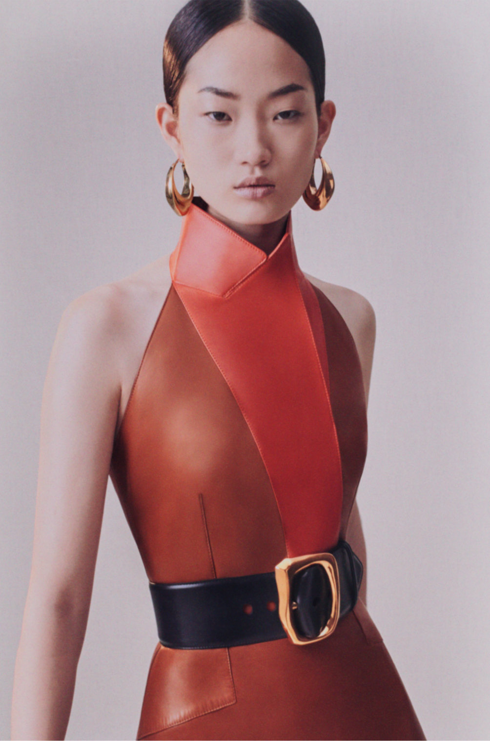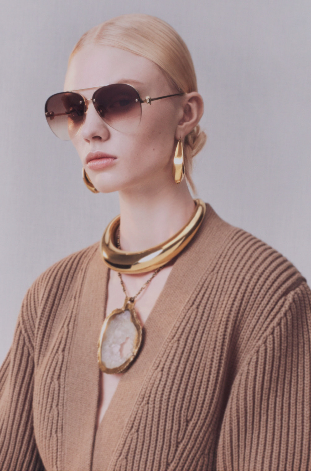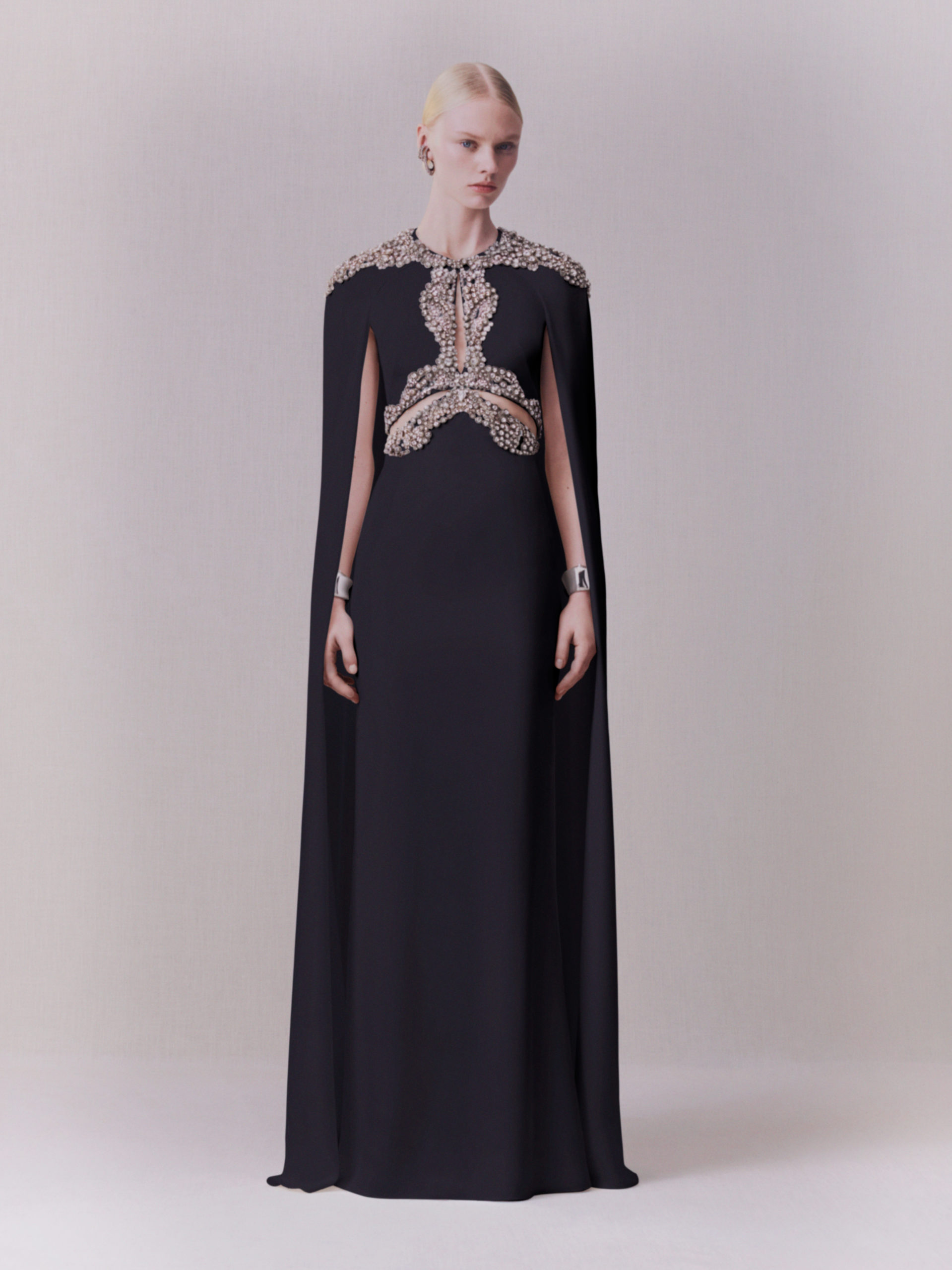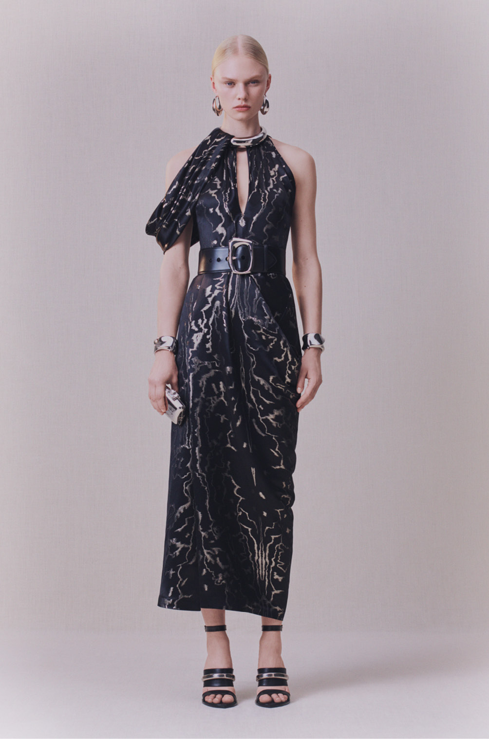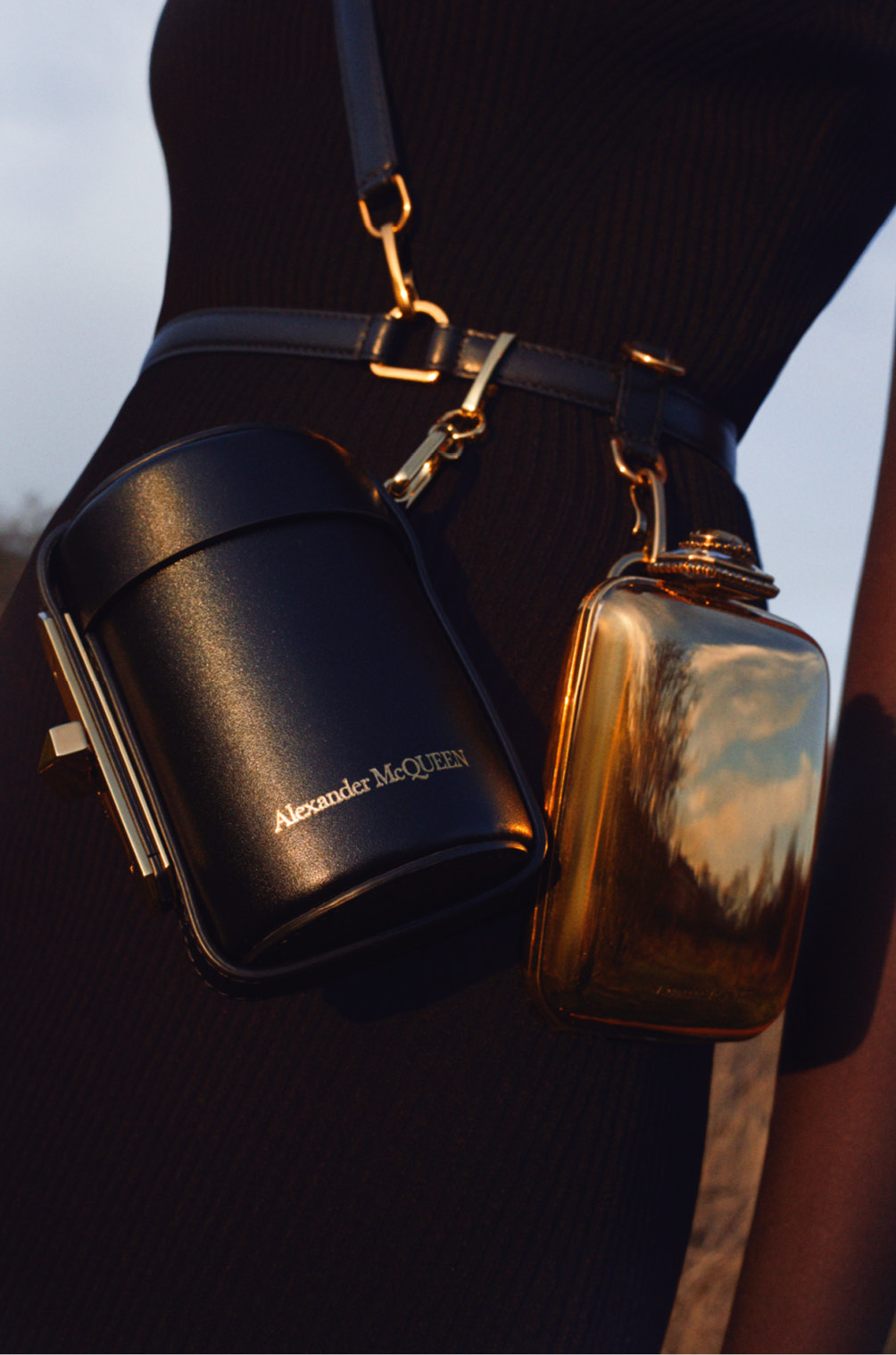 British art nouveau and craftsmanship, the understated elegance of modernism: sinuous iris, proud thistle and Glasgow rose. The windswept earth and landscapes of the North have been laid bare. The heart of the earth and the treasures hidden beneath its surface. Metallic minerals: rich seams of gold, silver and copper everywhere. Mineralogy: crystal, agate, flint, rock; opaque and sculptural on the outside, jewel-like and reflective on the inside. The juxtaposition between sobriety and seduction, the raw and the refined, the textured and the smooth, light and dark, all contrast with the handwriting of the House of Alexander McQueen.