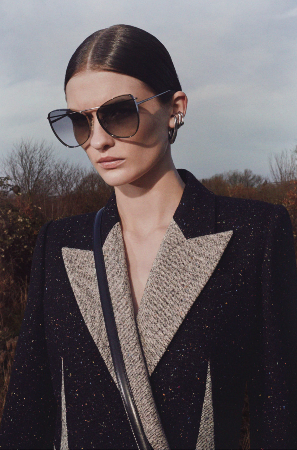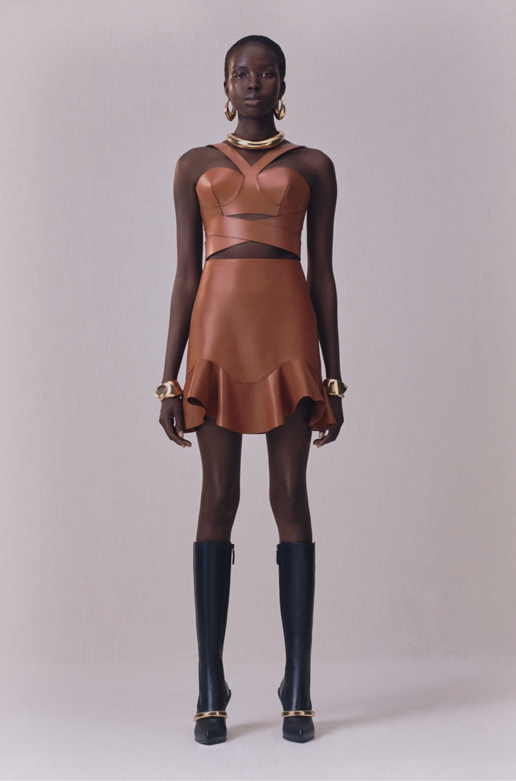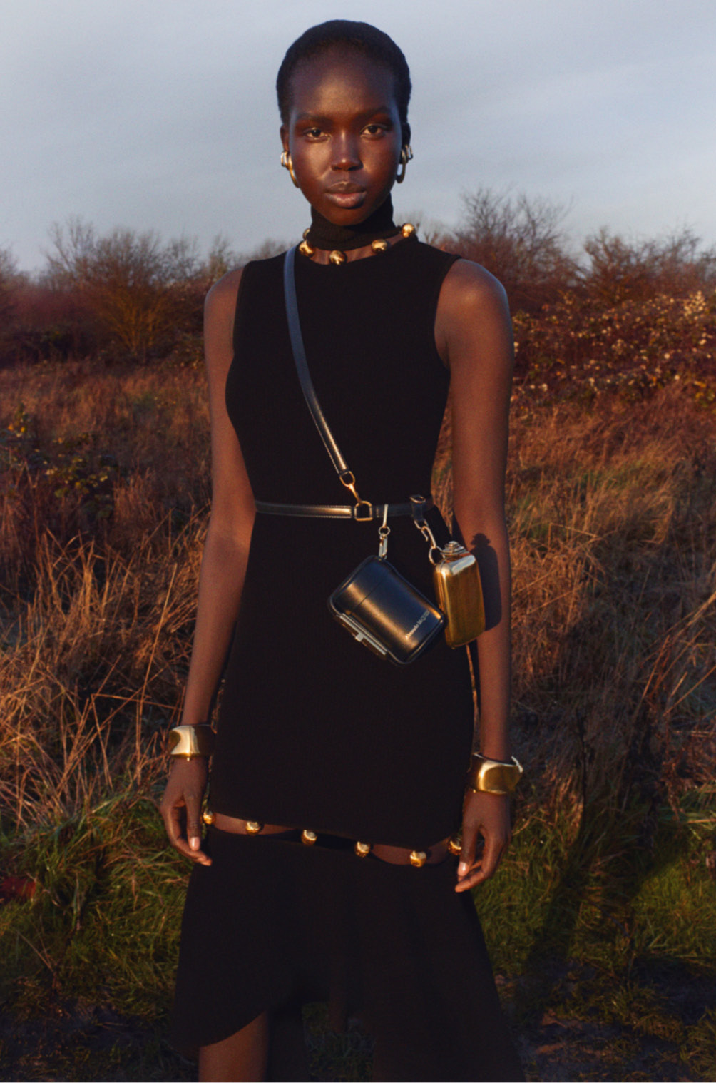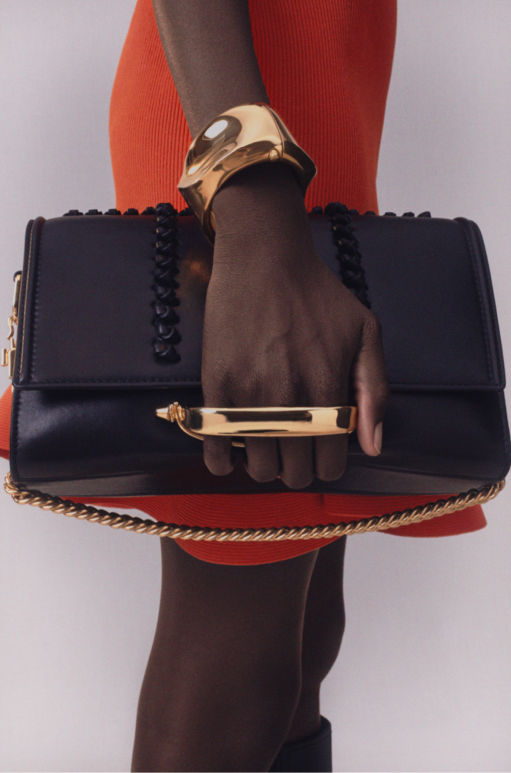 British art nouveau and craftsmanship, the understated elegance of modernism: sinuous iris, proud thistle and Glasgow rose. The windswept earth and landscapes of the North have been laid bare. The heart of the earth and the treasures hidden beneath its surface. Metallic minerals: rich seams of gold, silver and copper everywhere. Mineralogy: crystal, agate, flint, rock; opaque and sculptural on the outside, jewel-like and reflective on the inside. The juxtaposition between sobriety and seduction, the raw and the refined, the textured and the smooth, light and dark, all contrast with the handwriting of the House of Alexander McQueen.