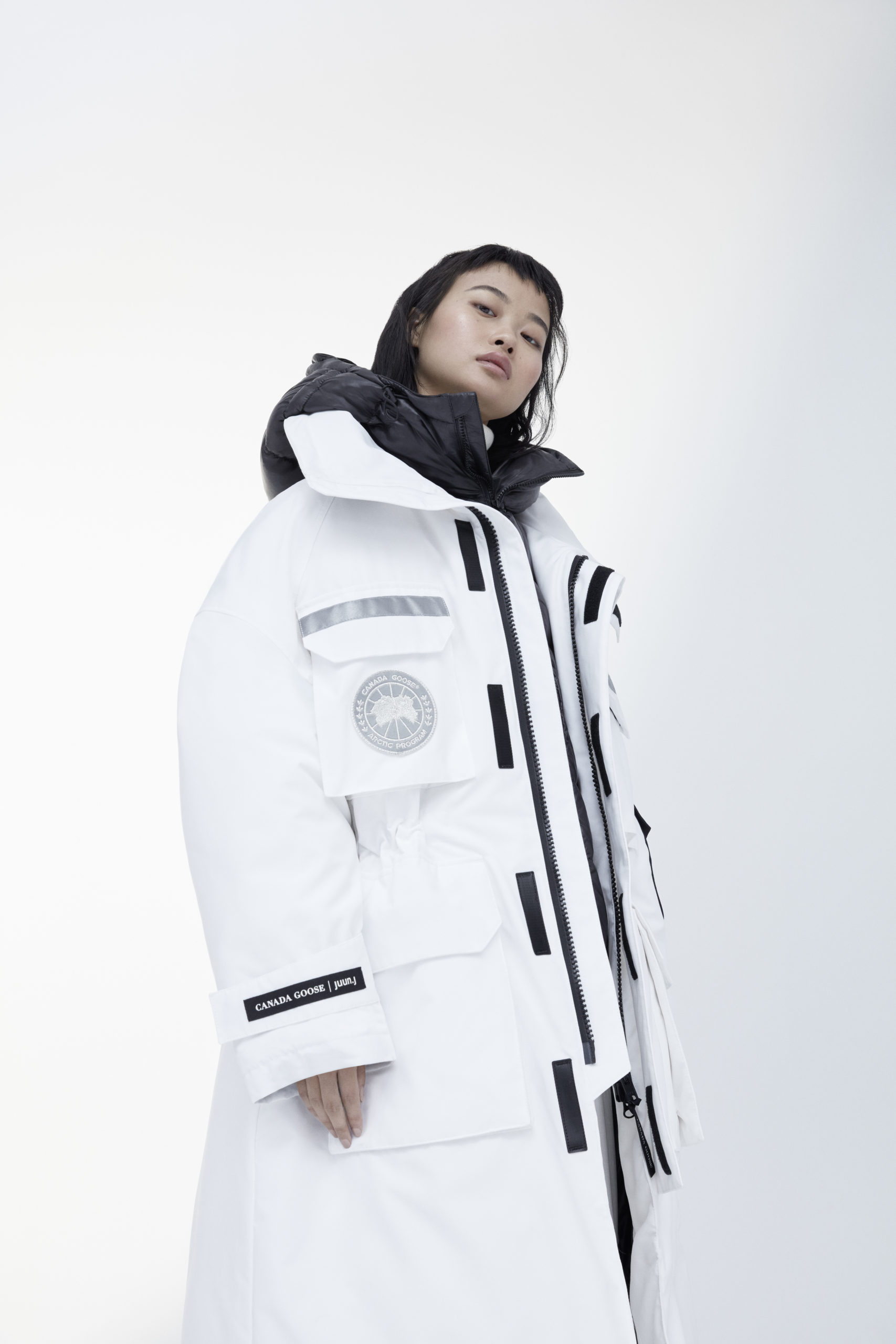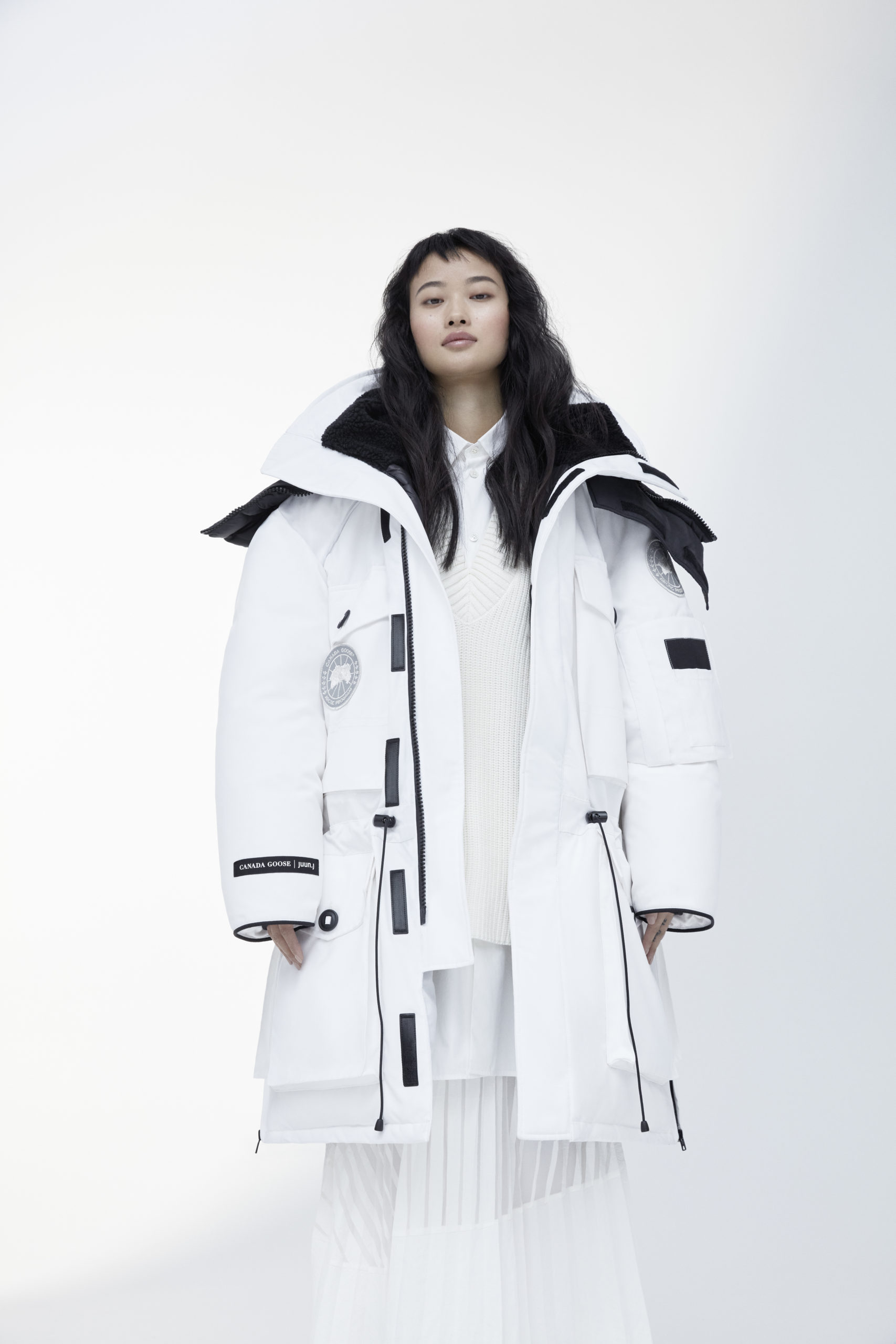 The Canada Goose x juun.j collection, made up of all unisex pieces, is the simple combination of juun.j’s avant-garde aesthetic and Canada Goose’s design focus on function. juun.j re-imagines the pieces with larger-than-life designs and exaggerated proportions. Each coat has its own unique touch, such as the 3-in-1 layered approach for the Resolute, an inner and outer hood for the Expedition and a fleece-lined neck guard for the Snow Mantra.