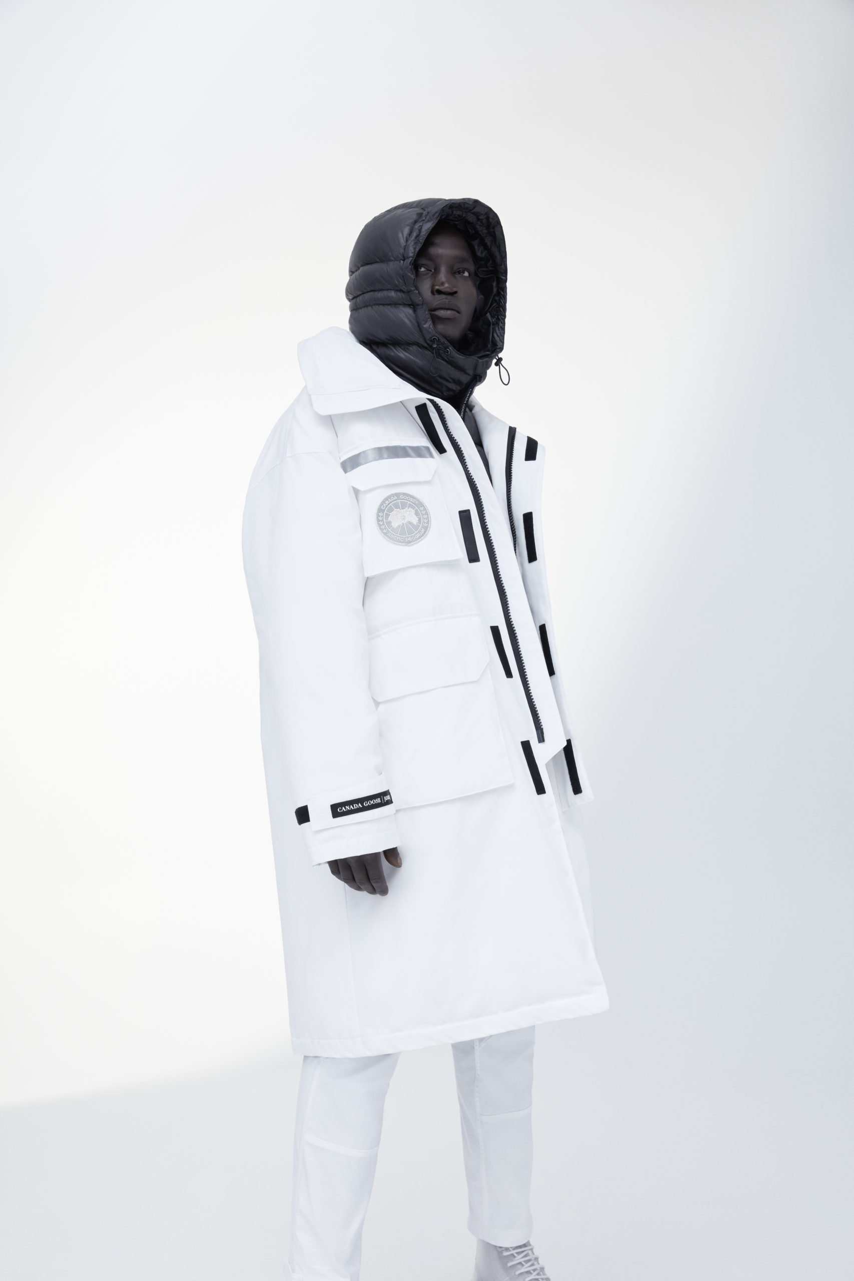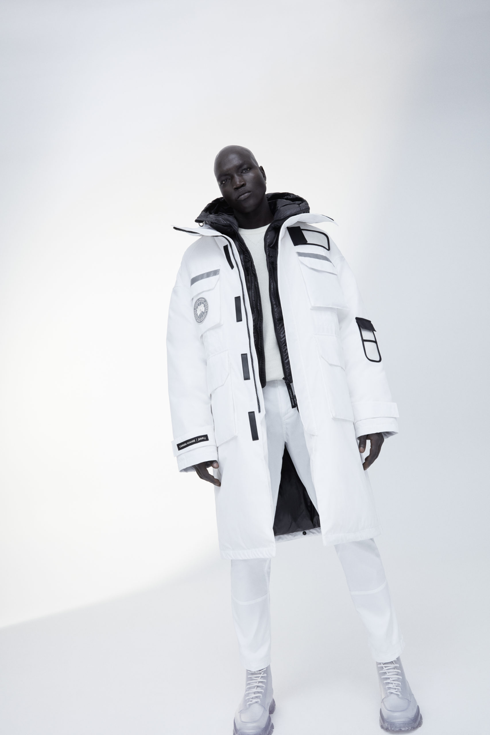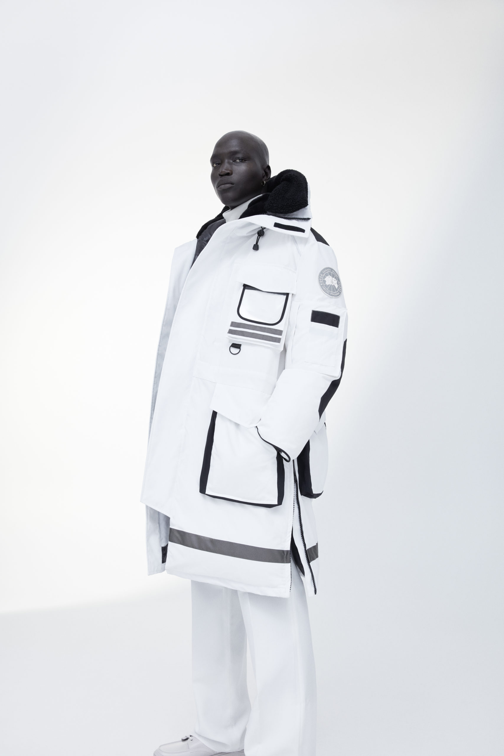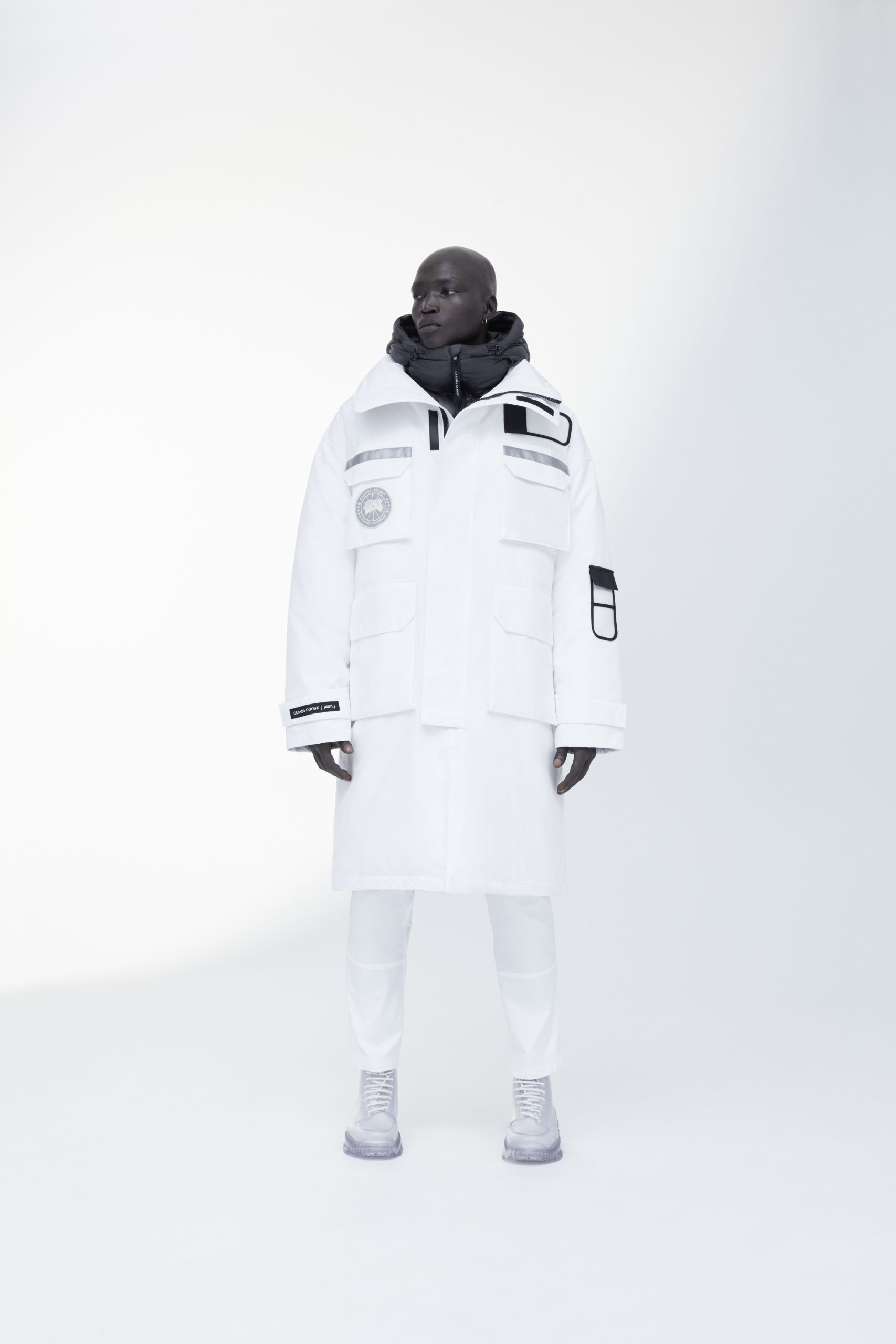 Unpredictability and originality are exactly what this collaboration is all about, from its oversized proportions, to the contrasting reflective details and Canada Goose silver disc, the white color of this new collection has been designed for maximum impact.
