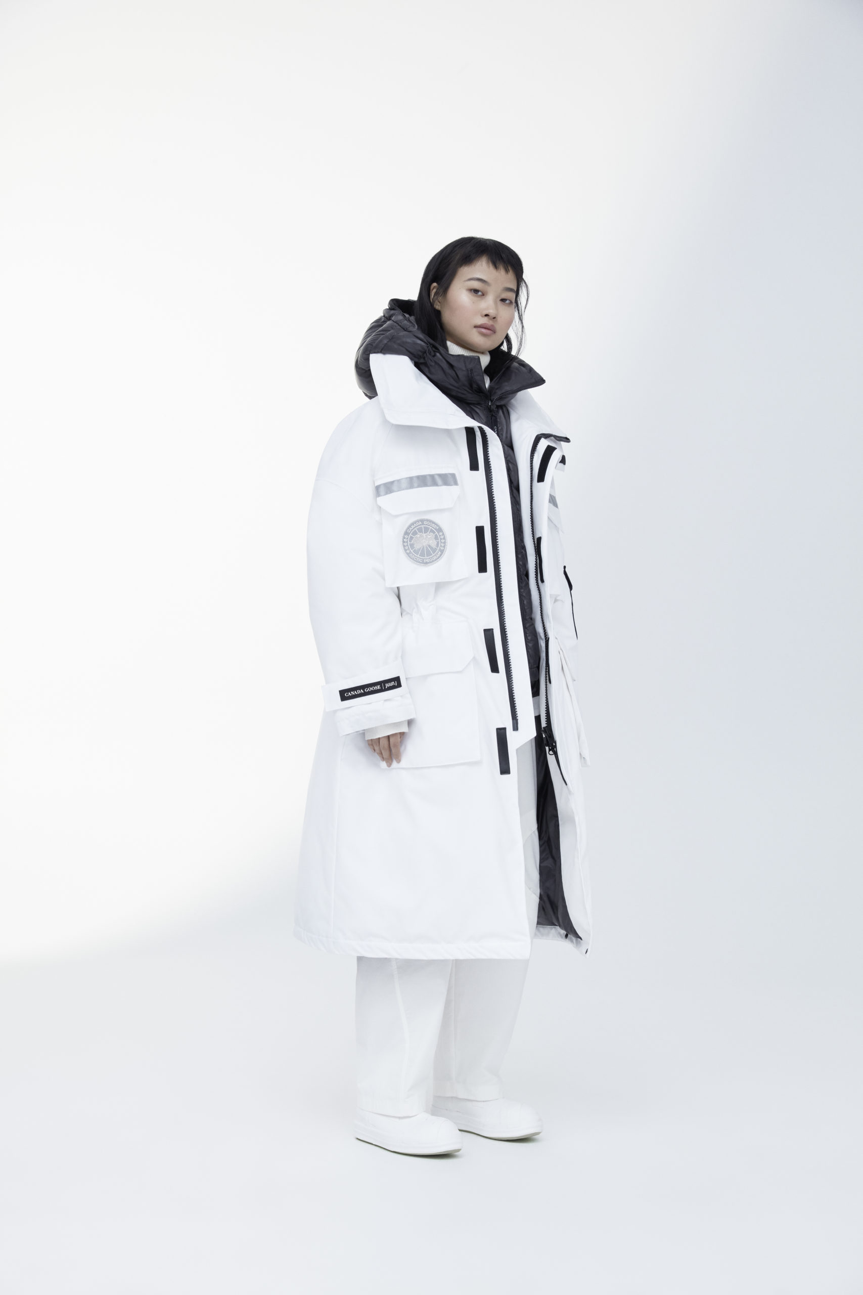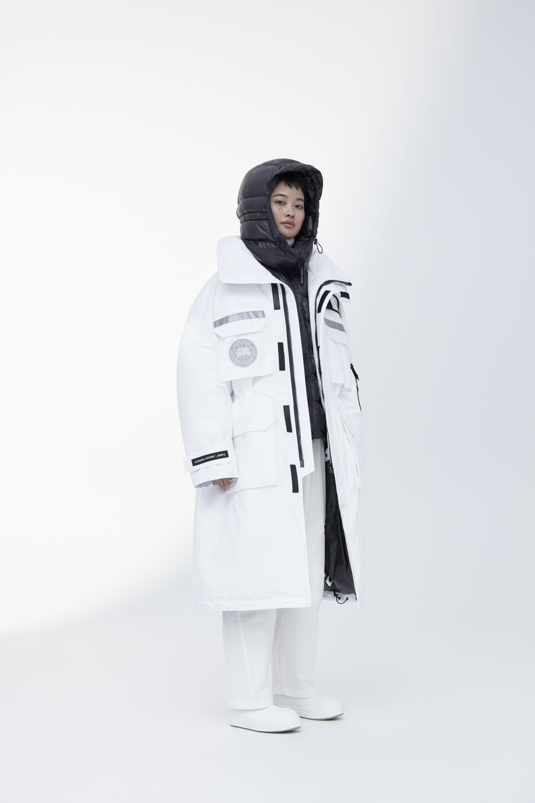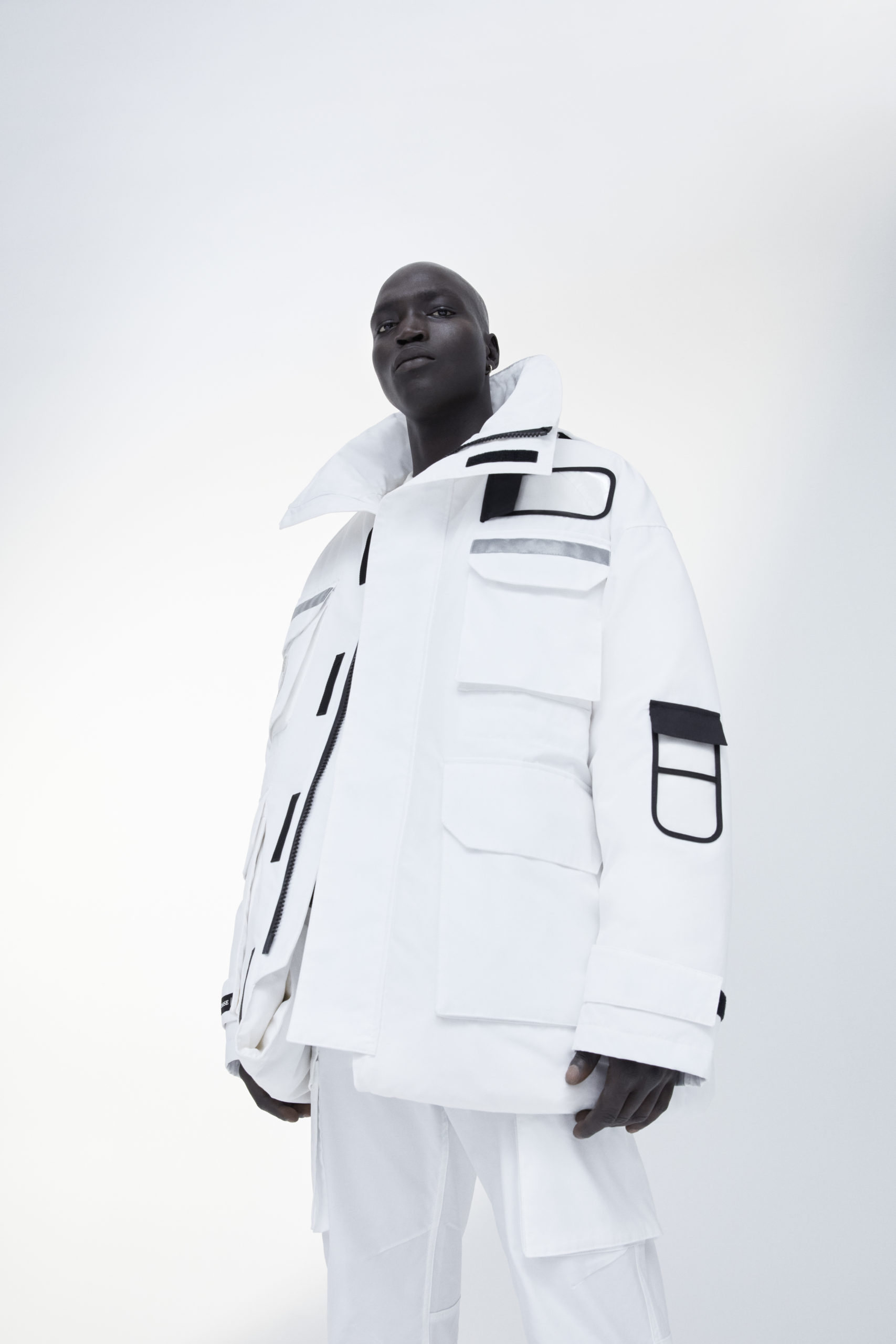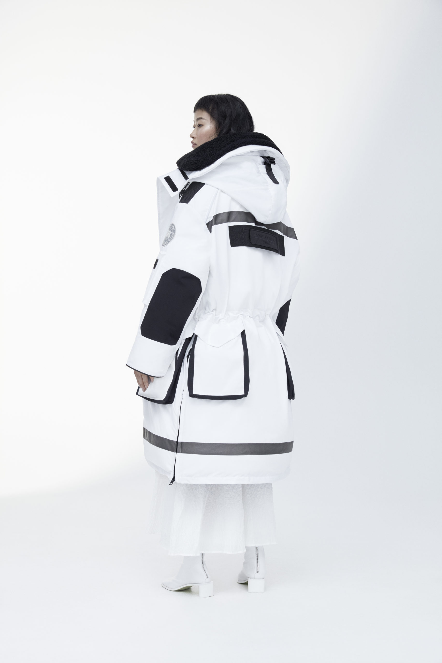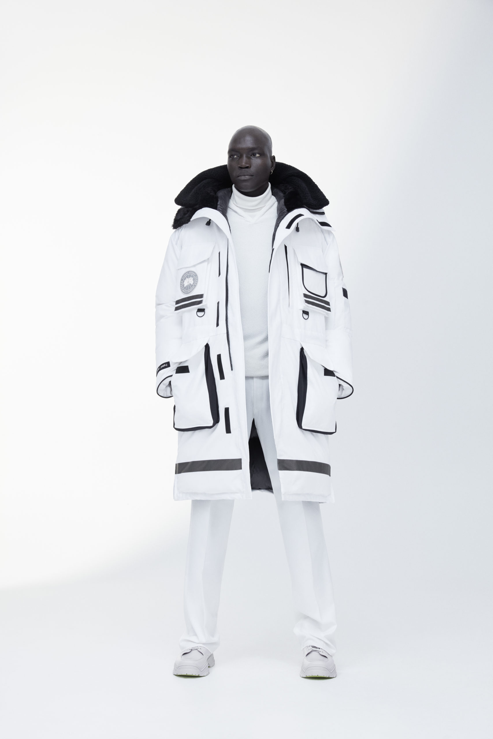 Unpredictability and originality are exactly what this collaboration is all about, from its oversized proportions, to the contrasting reflective details and Canada Goose silver disc, the white color of this new collection has been designed for maximum impact.