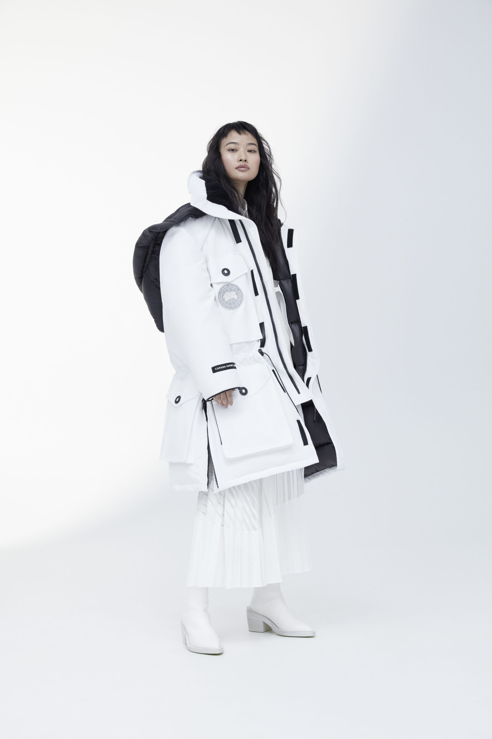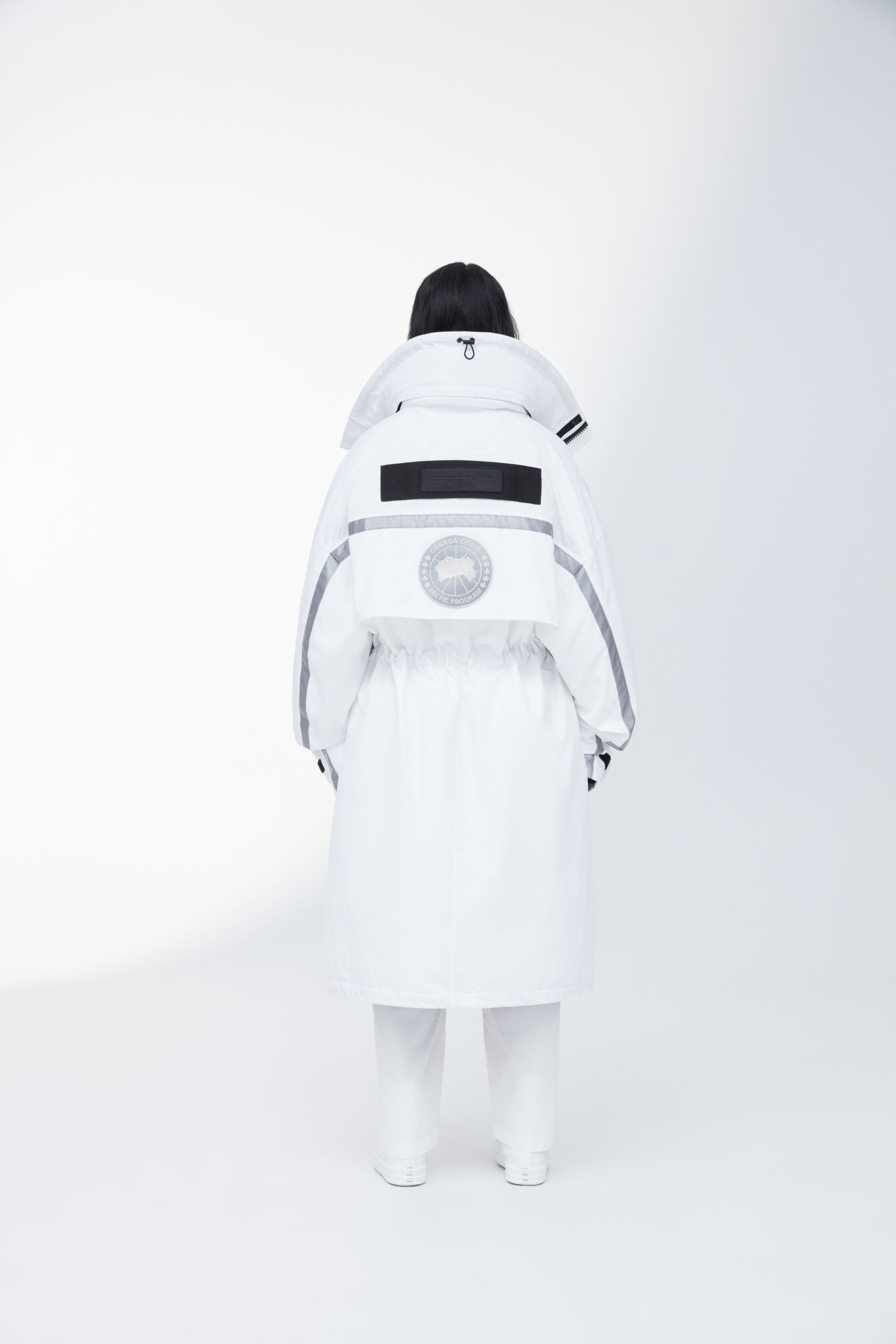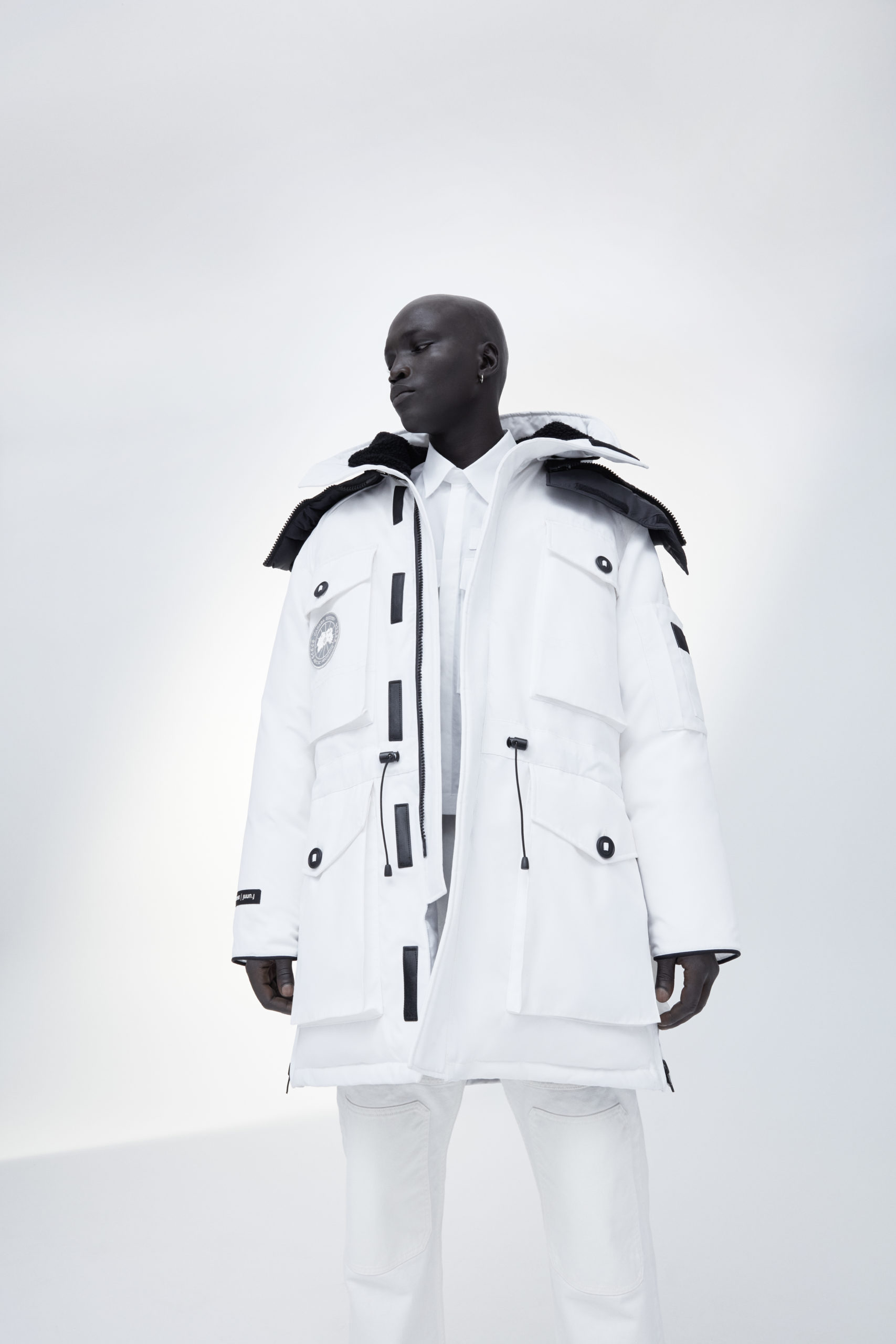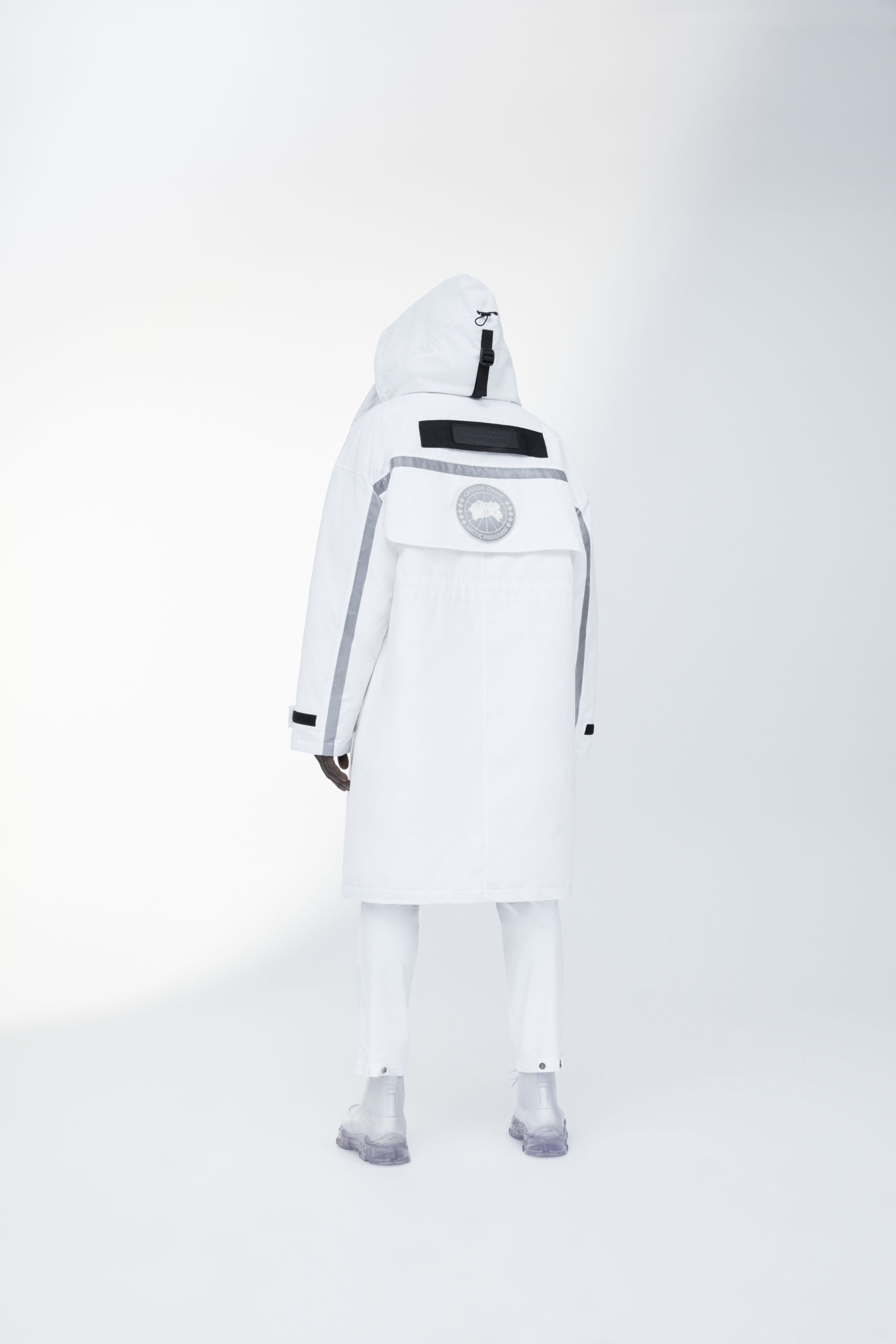 Unpredictability and originality are exactly what this collaboration is all about, from its oversized proportions, to the contrasting reflective details and Canada Goose silver disc, the white color of this new collection has been designed for maximum impact.