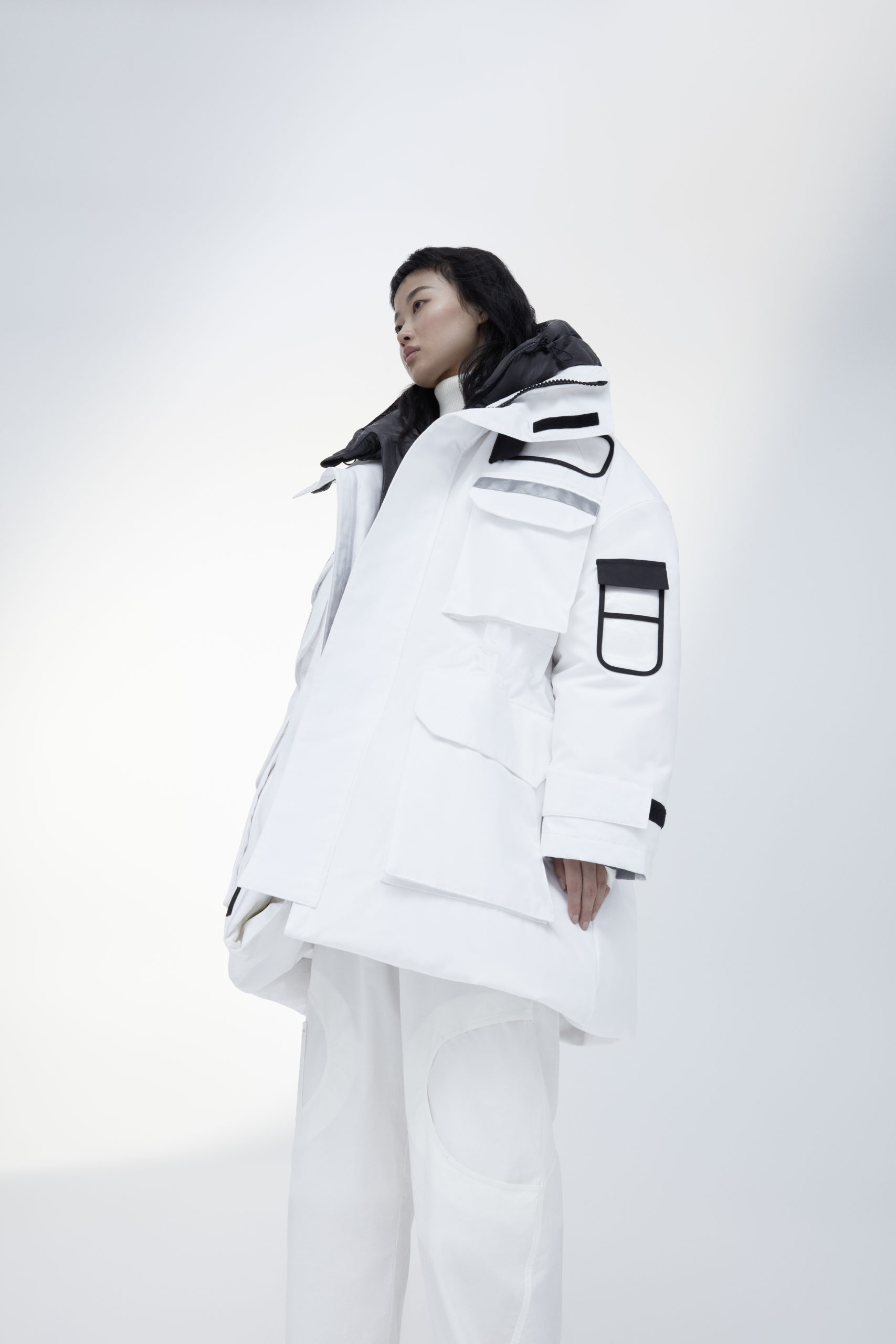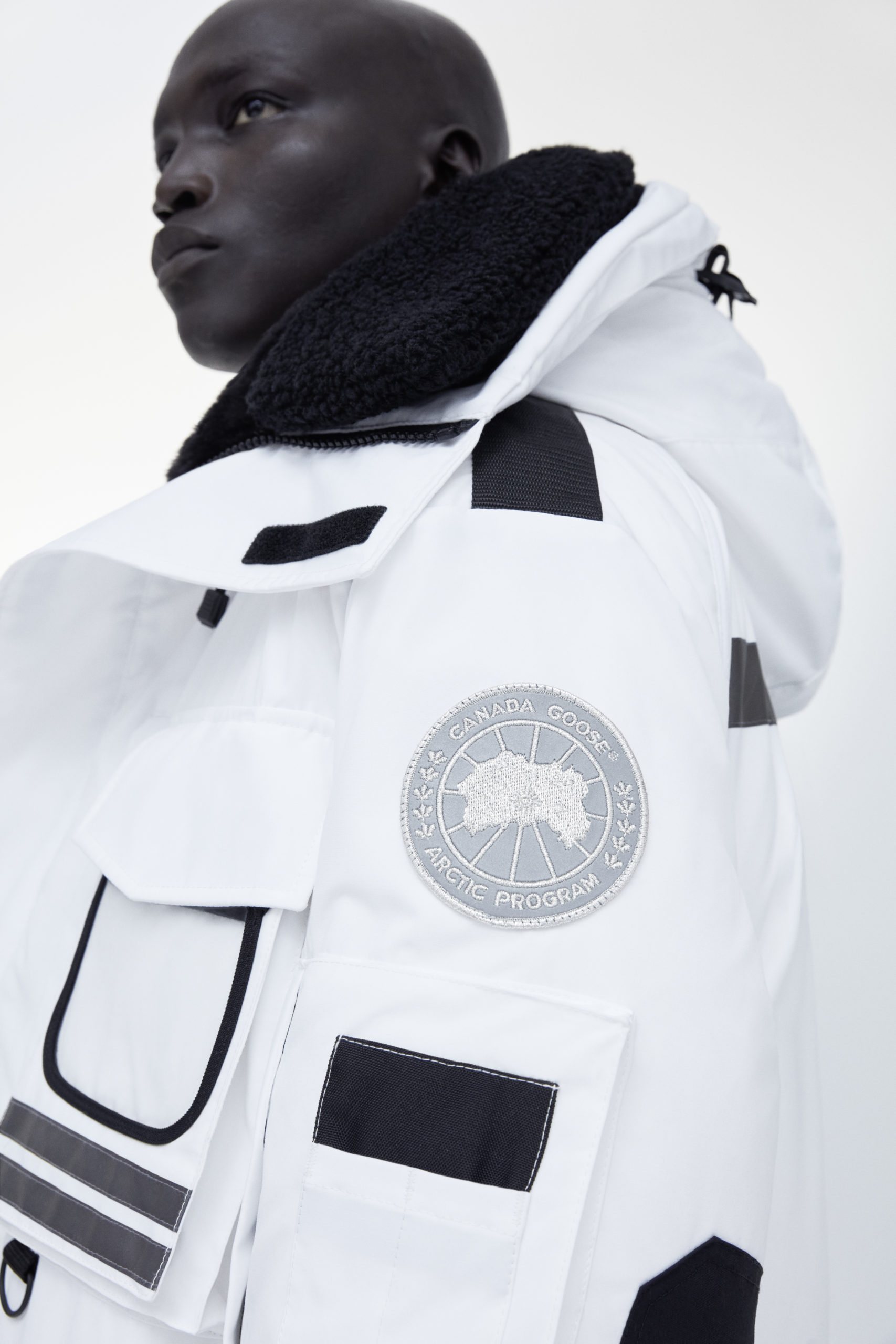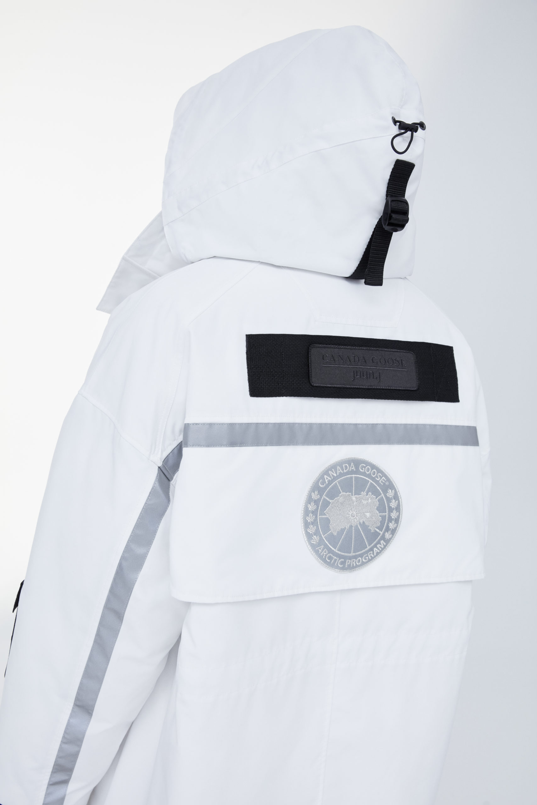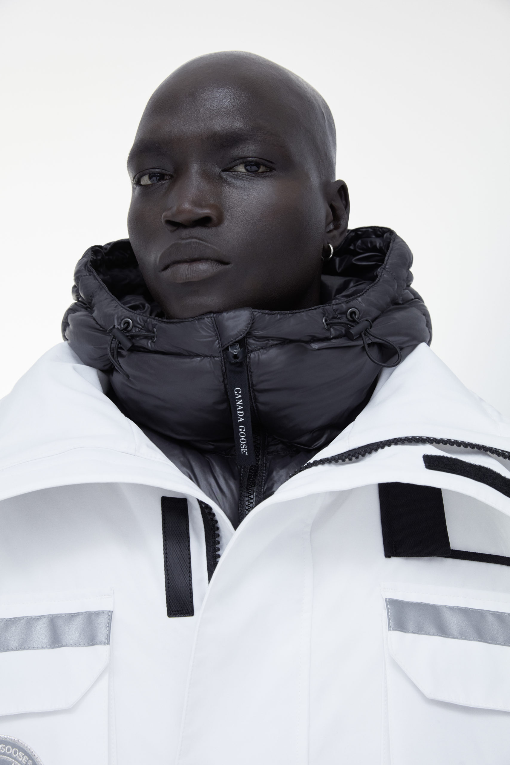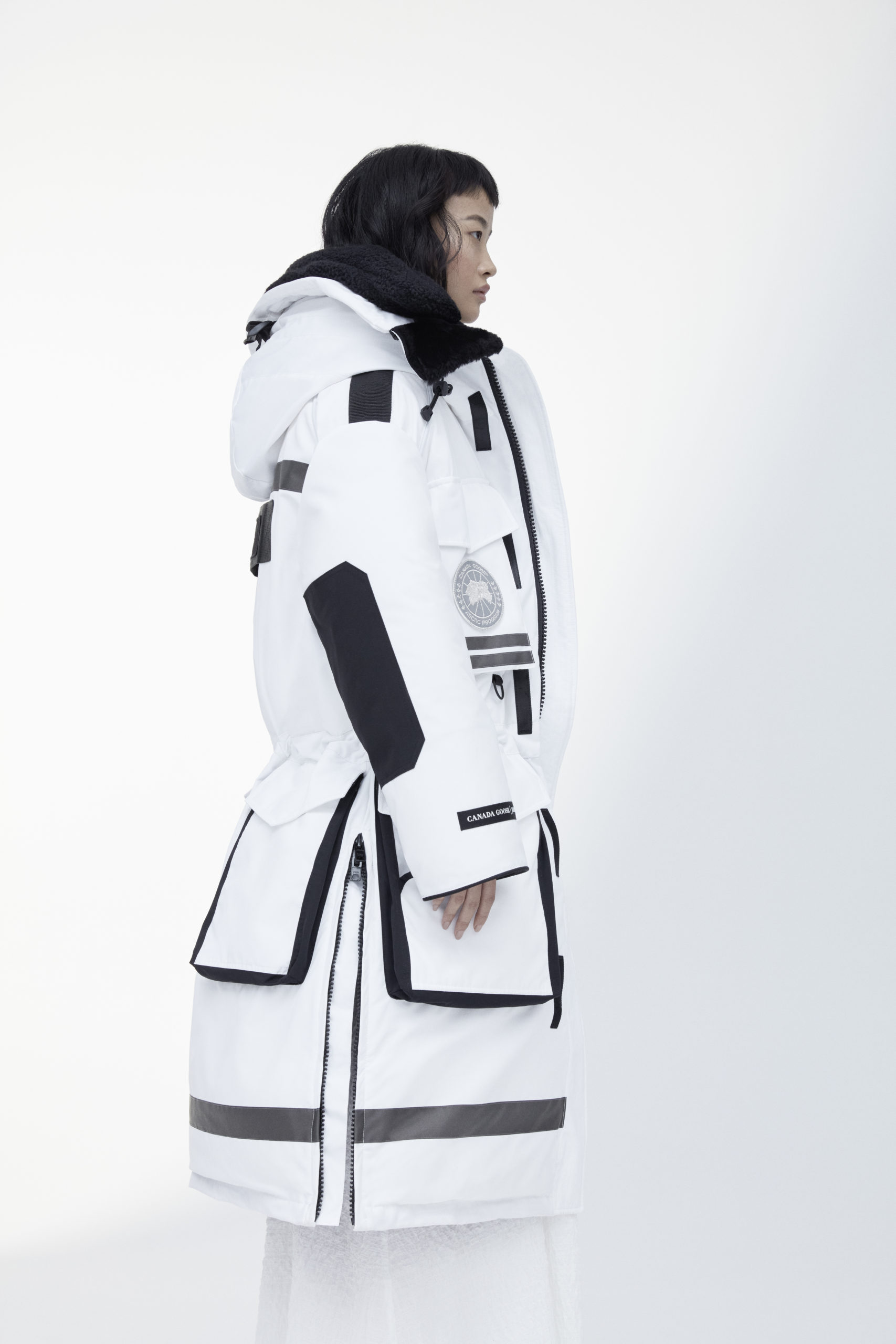 Unpredictability and originality are exactly what this collaboration is all about, from its oversized proportions, to the contrasting reflective details and Canada Goose silver disc, the white color of this new collection has been designed for maximum impact.