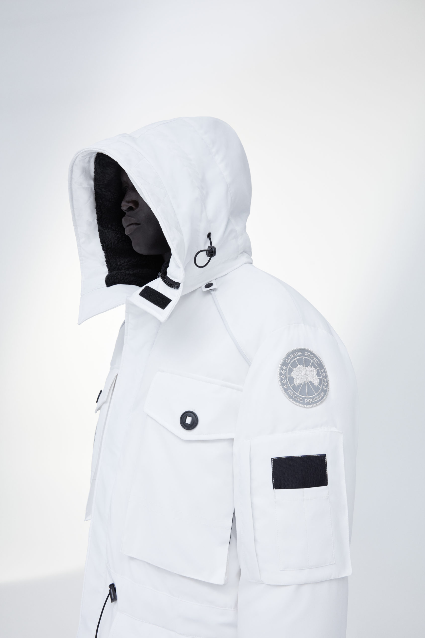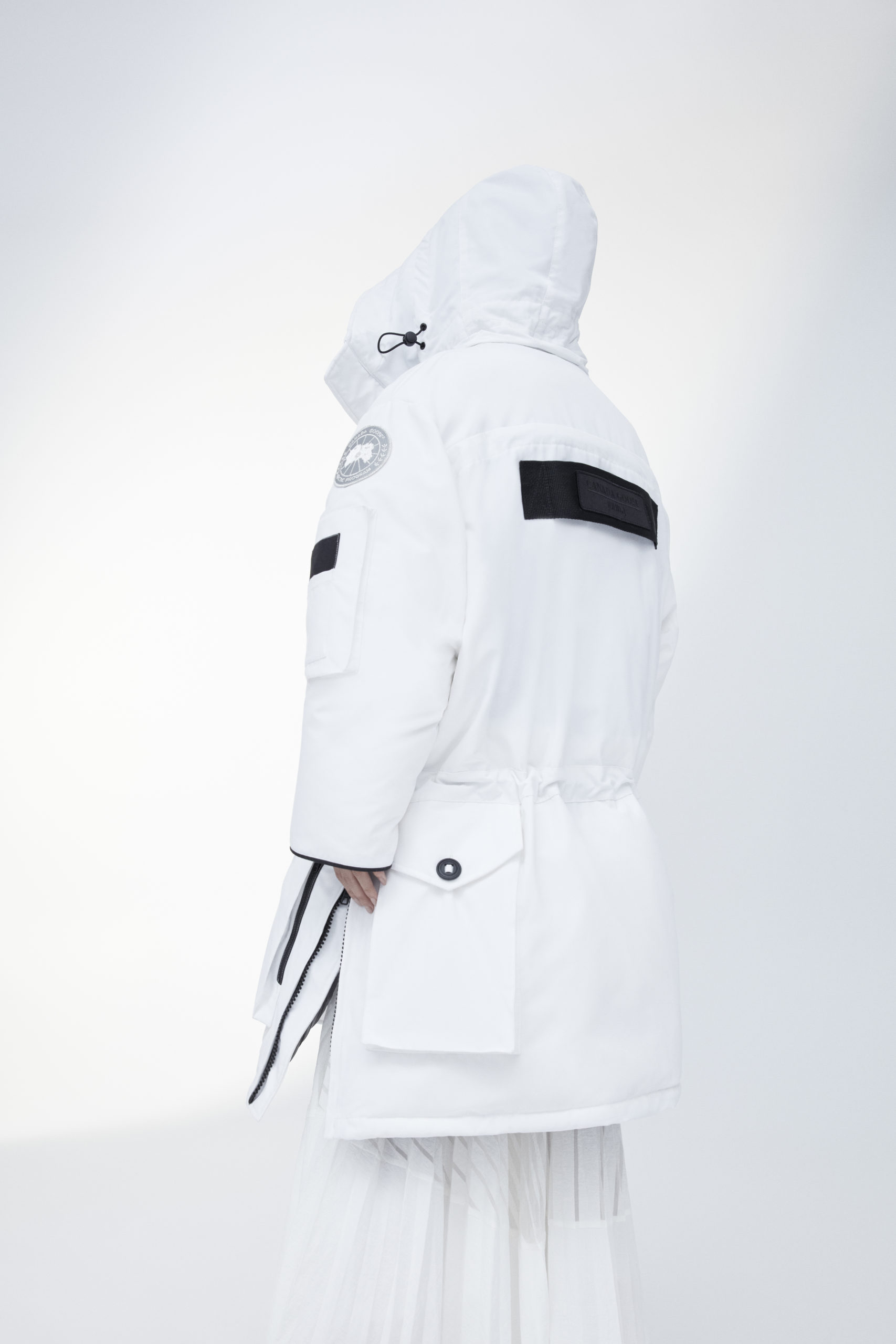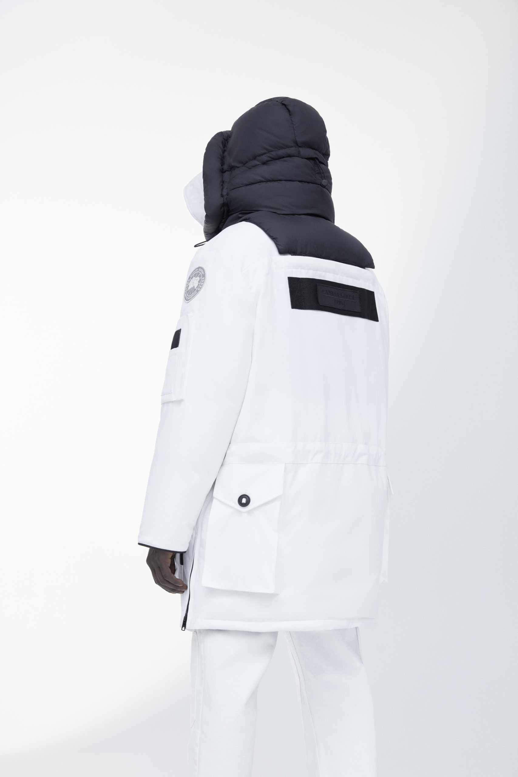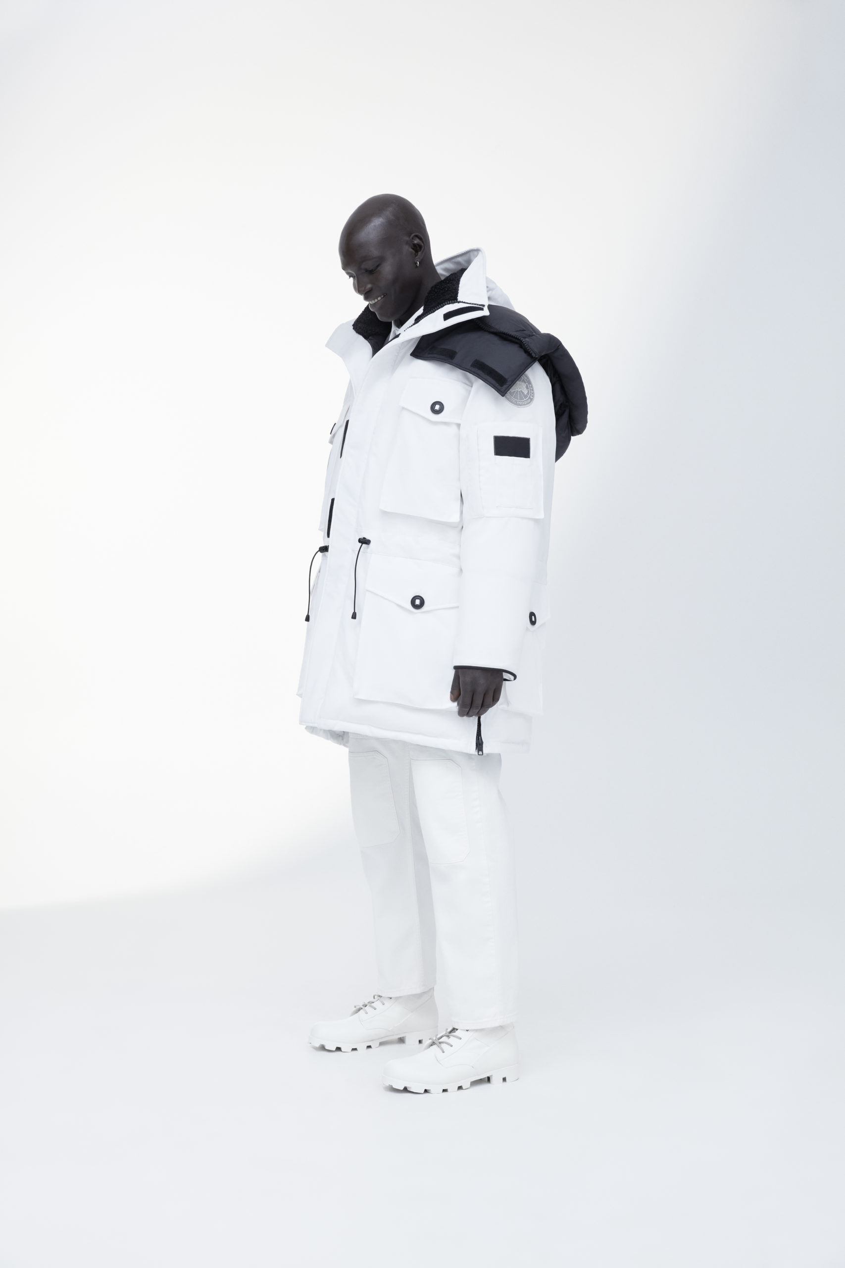 Unpredictability and originality are exactly what this collaboration is all about, from its oversized proportions, to the contrasting reflective details and Canada Goose silver disc, the white color of this new collection has been designed for maximum impact.