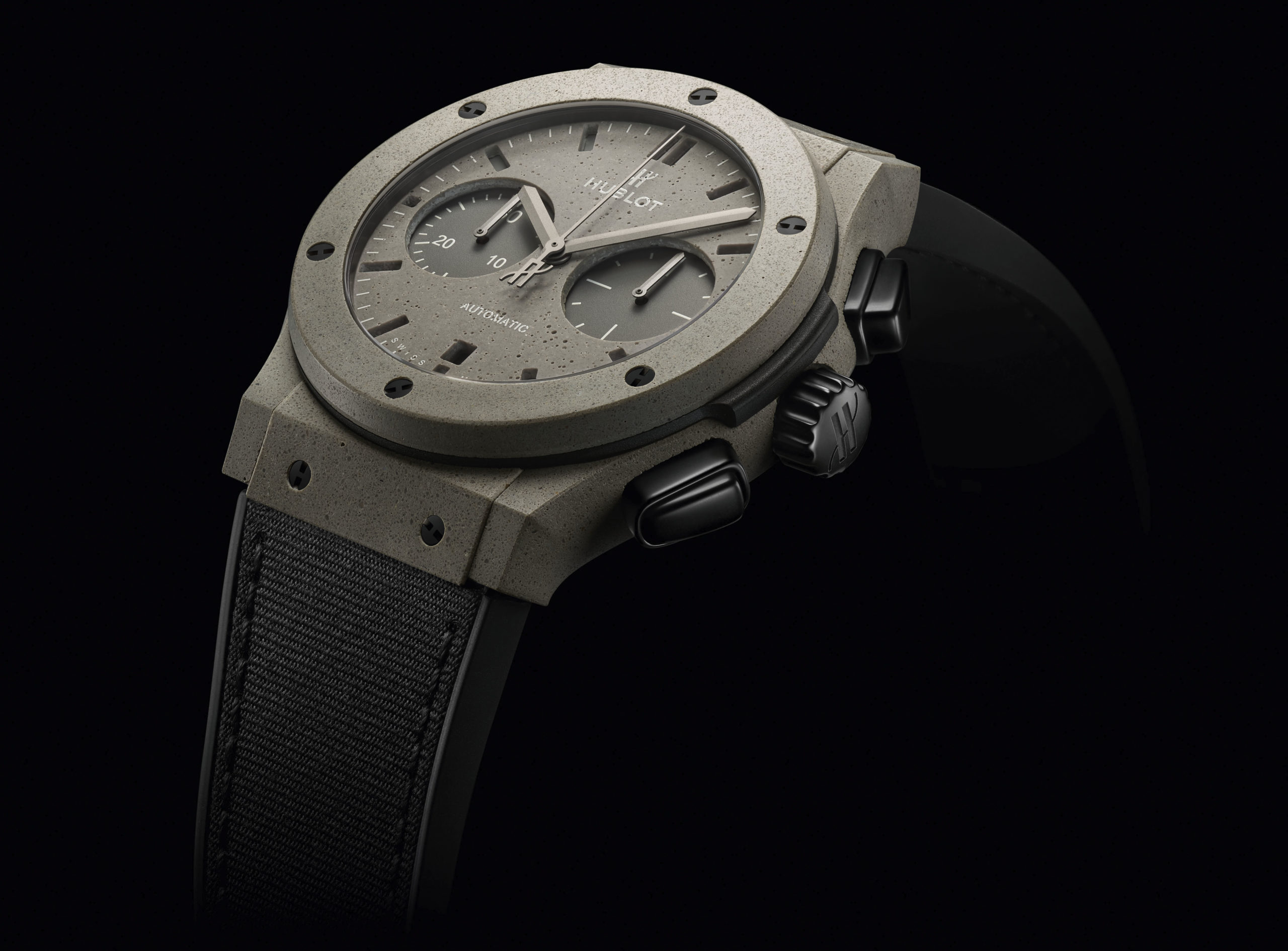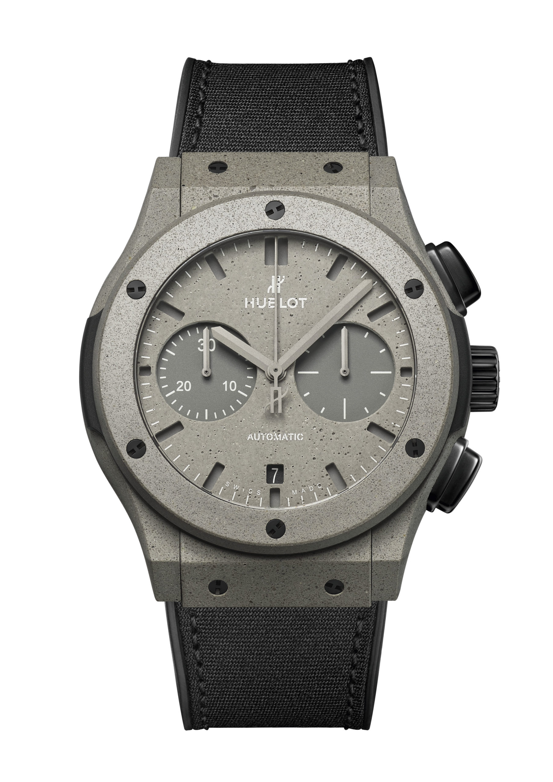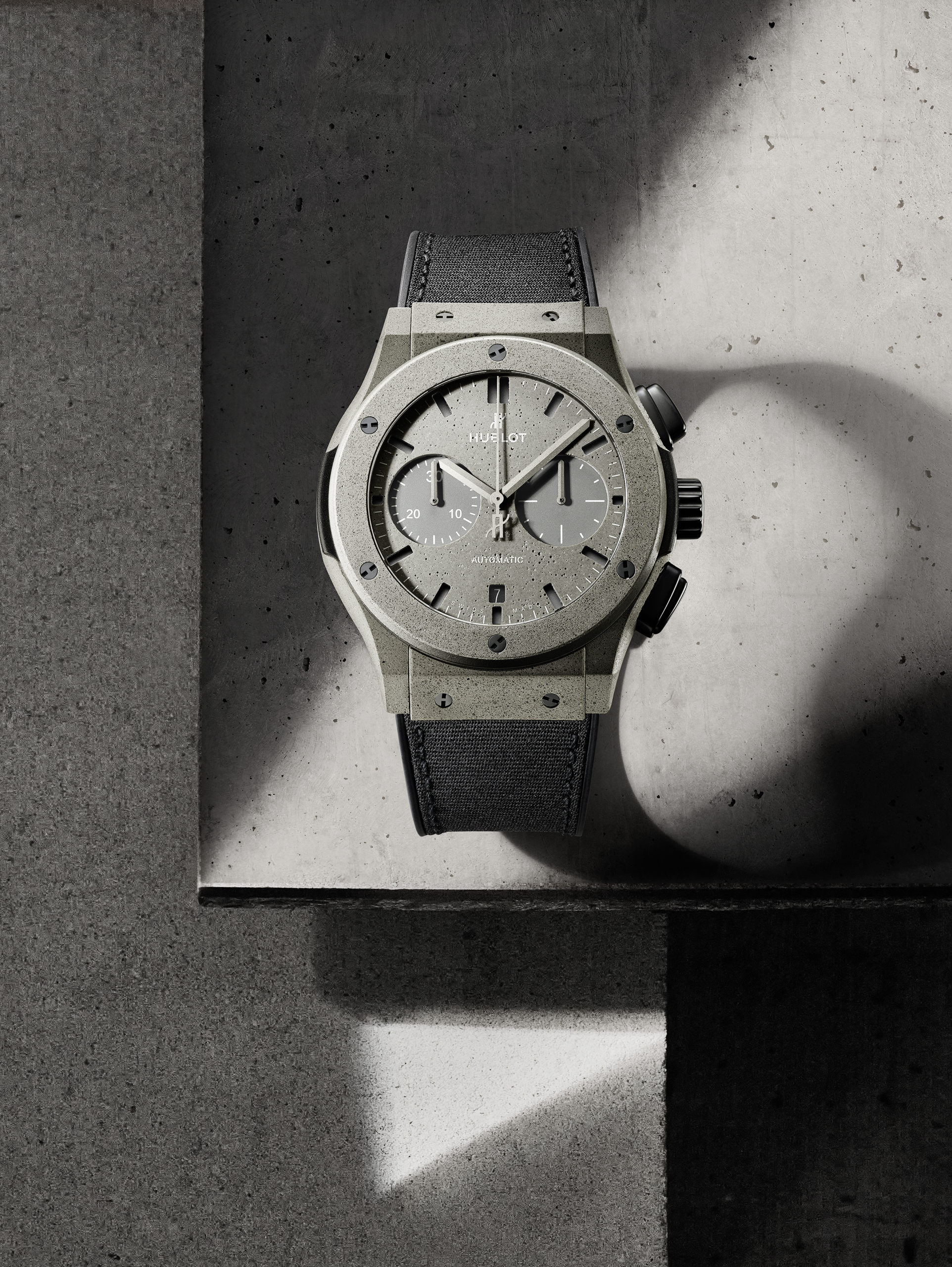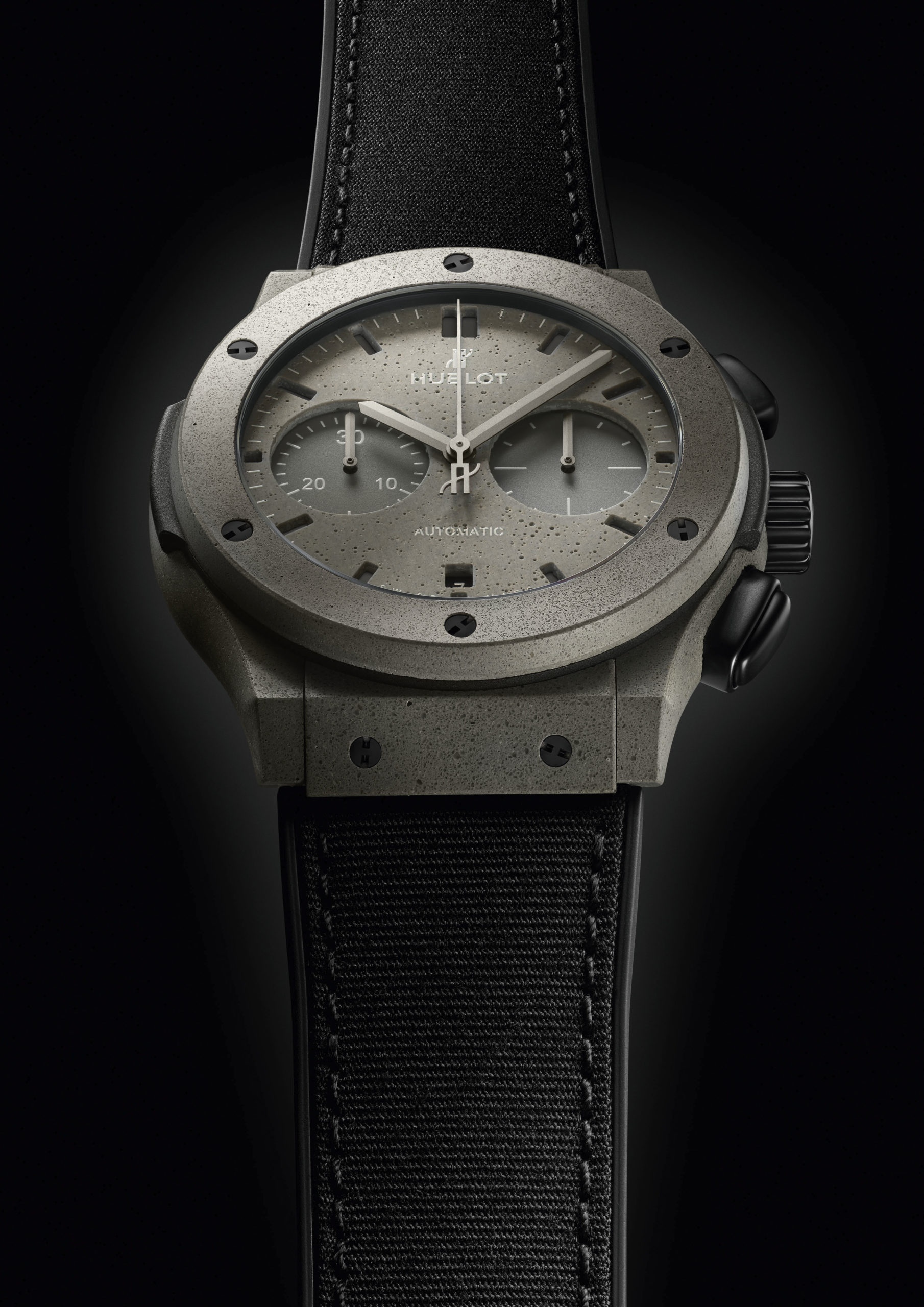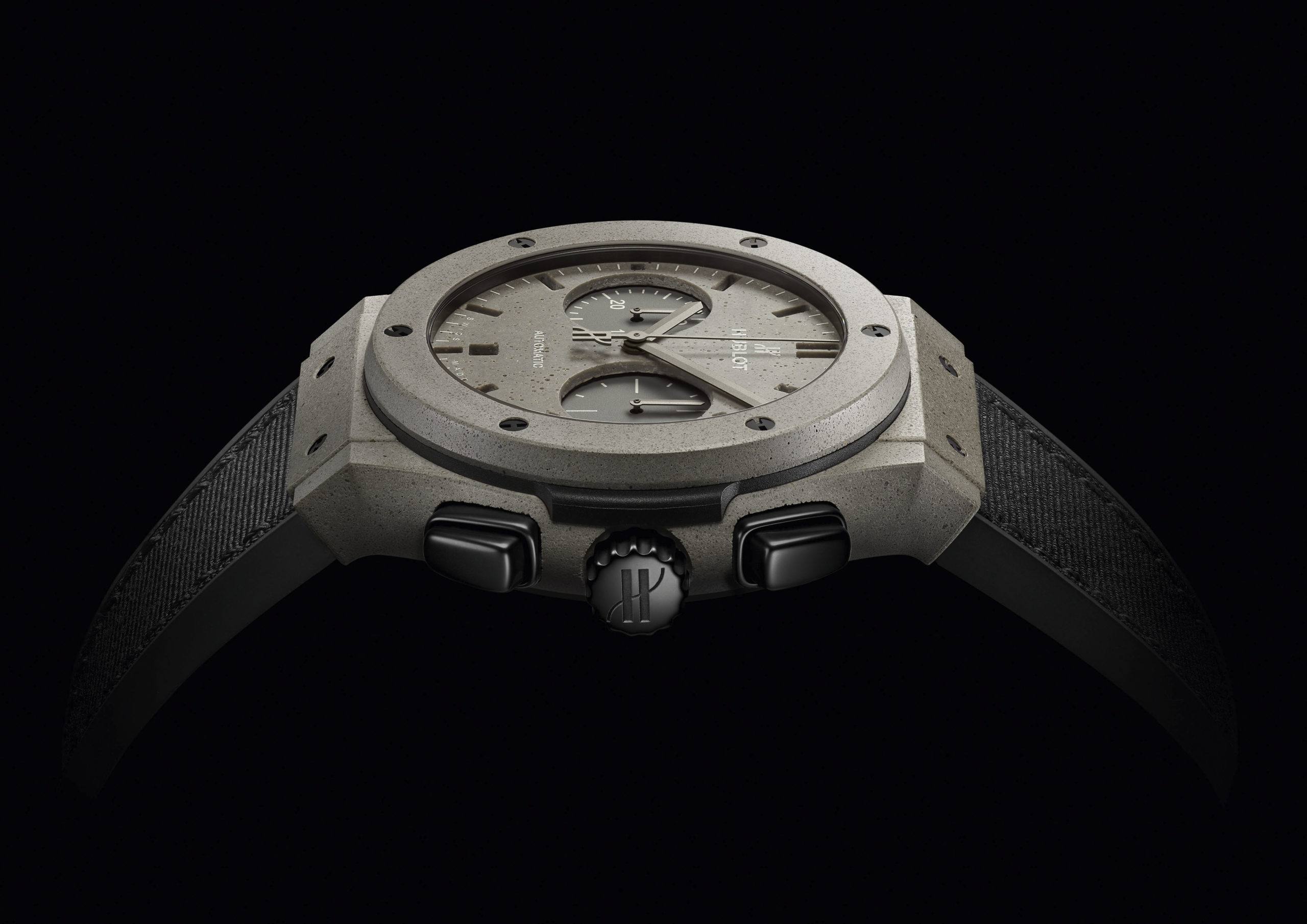 The second installment of Hublot’s Concrete Jungle is reinforced with a more durable concrete material, staying true to the brand’s Art of Fusion principles to promote ultra-modern innovation. The concrete material is composed of 65% to 75% fine cement, 25% to 30% epoxy resin, which replaces water in ordinary concrete, and 5% to 10% fiberglass, which replaces steel to reinforce the concrete. Hublot’s design team in Nyon consolidated the epoxy resin with an anti-UV additive to prevent discoloration over time, and applied an anti-graffiti treatment to the finished components to prevent the concrete from becoming impregnated with other contaminants such as dust. The case and dial, made from this improved concrete, will stand the test of time, underlining the importance of meticulous craftsmanship in creating long-lasting products.