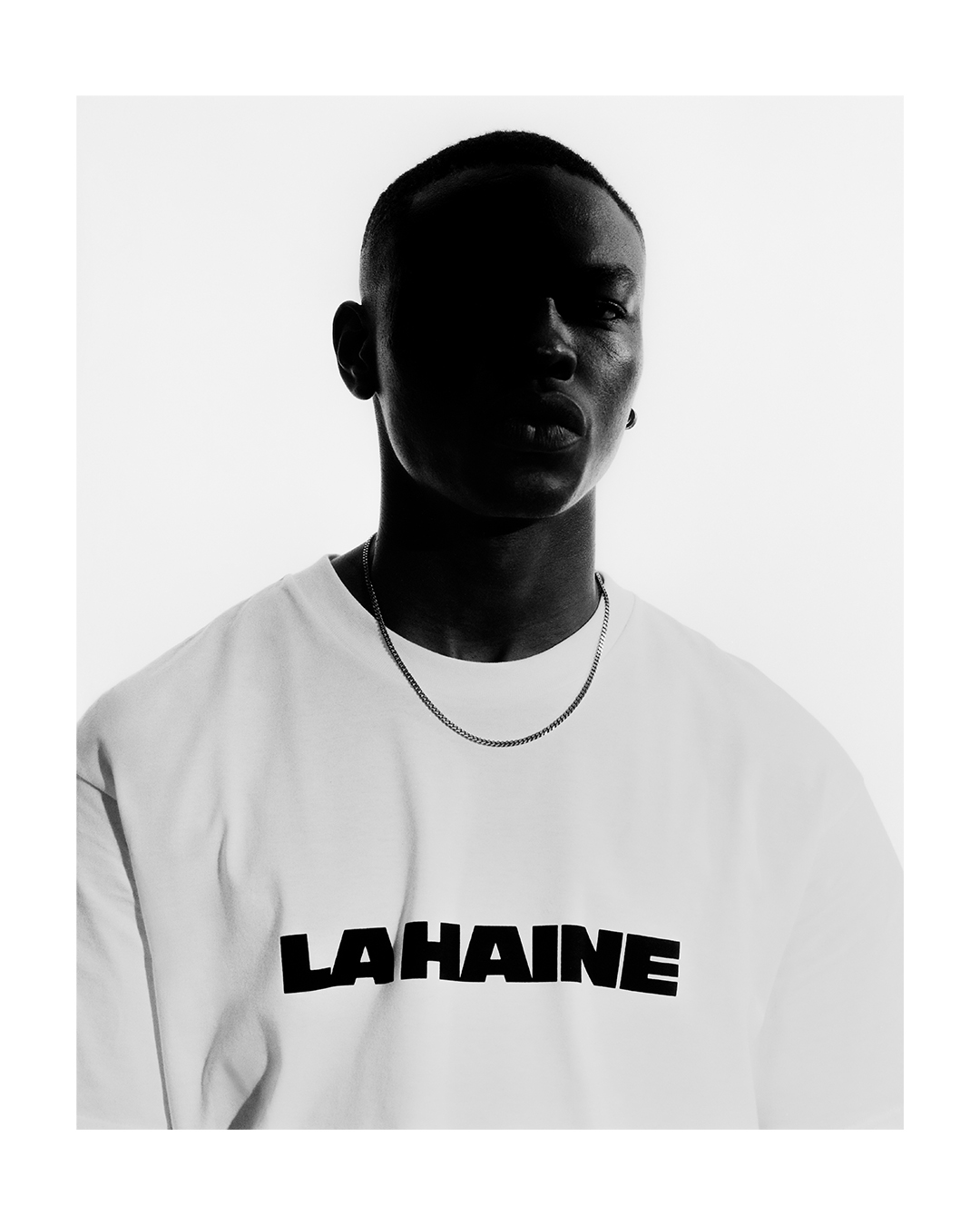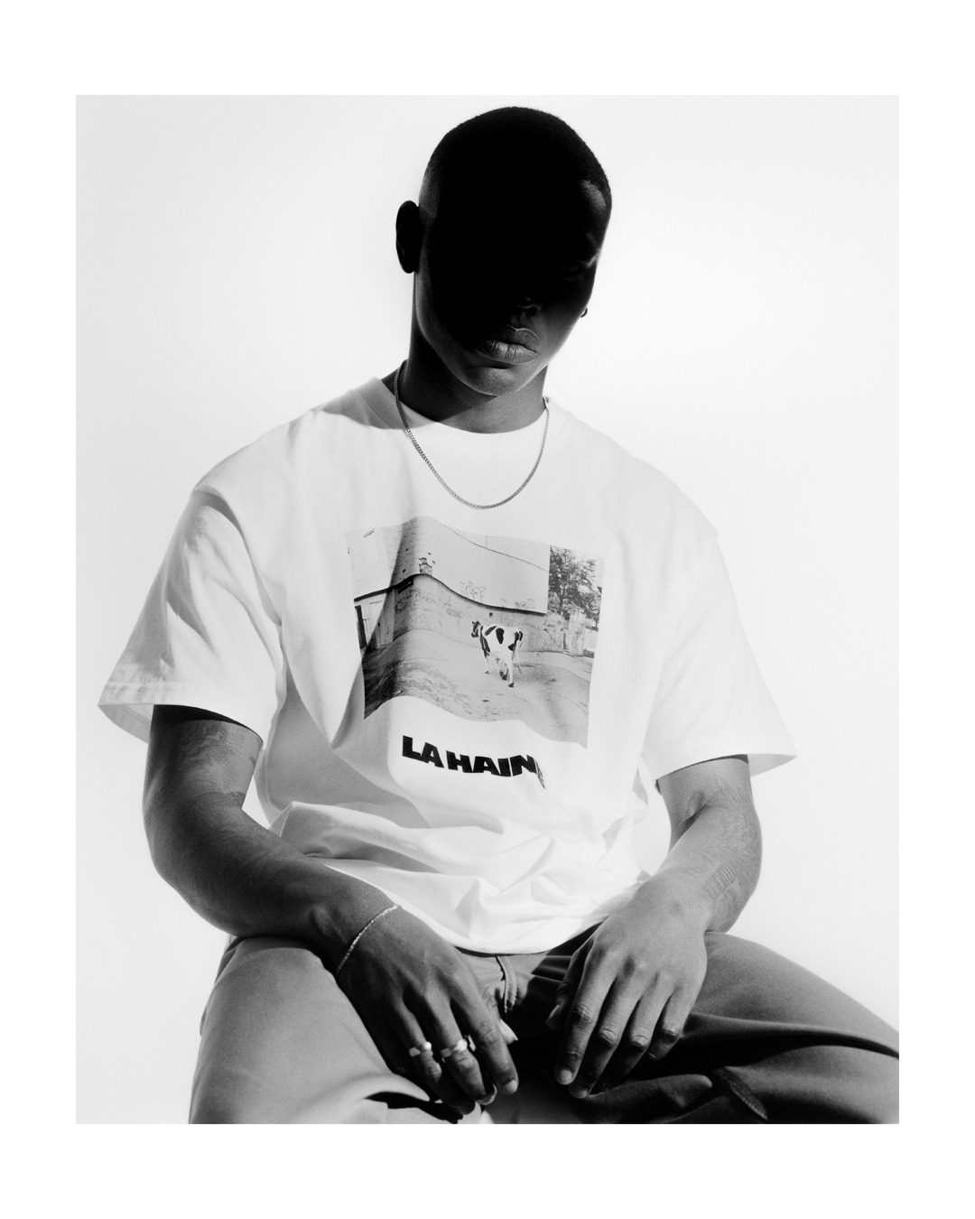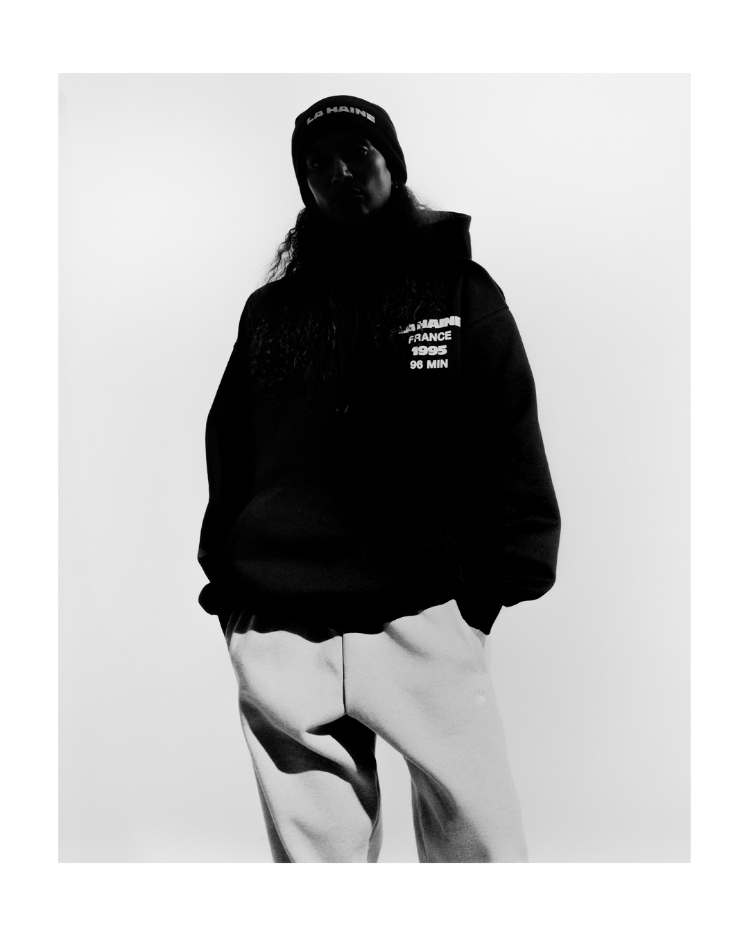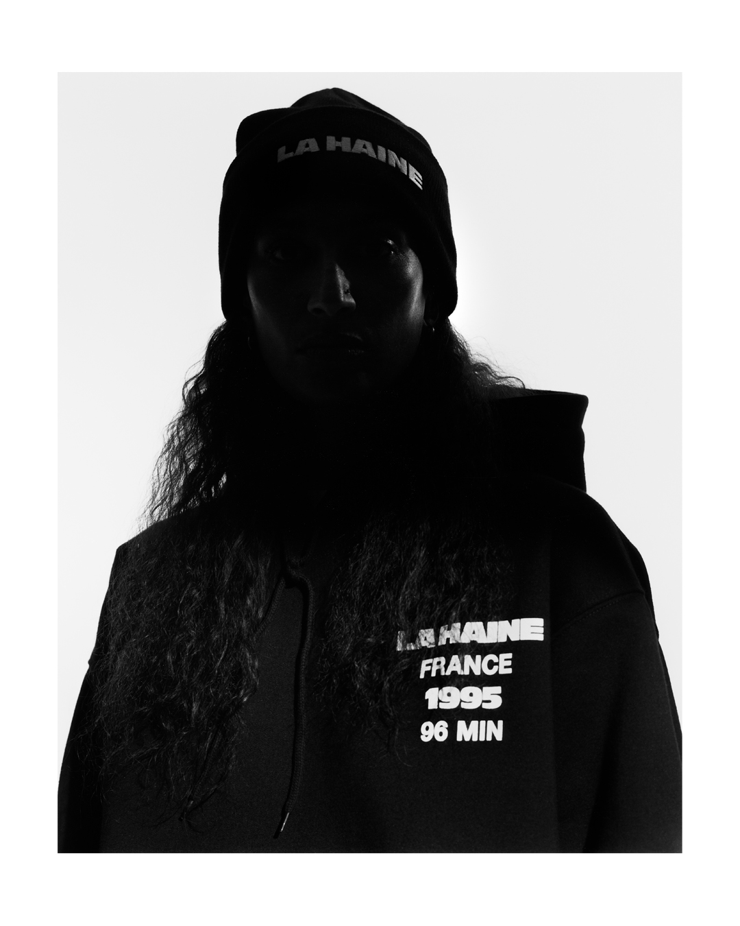 The capsule collection comprises seven pieces, including a hoodie, T-shirts and a beanie similar to the one worn by Hubert’s character. Three of the T-shirts feature behind-the-scenes shots by photographer Gilles Favier*, whose black-and-white photography contributed to the film’s aesthetic.