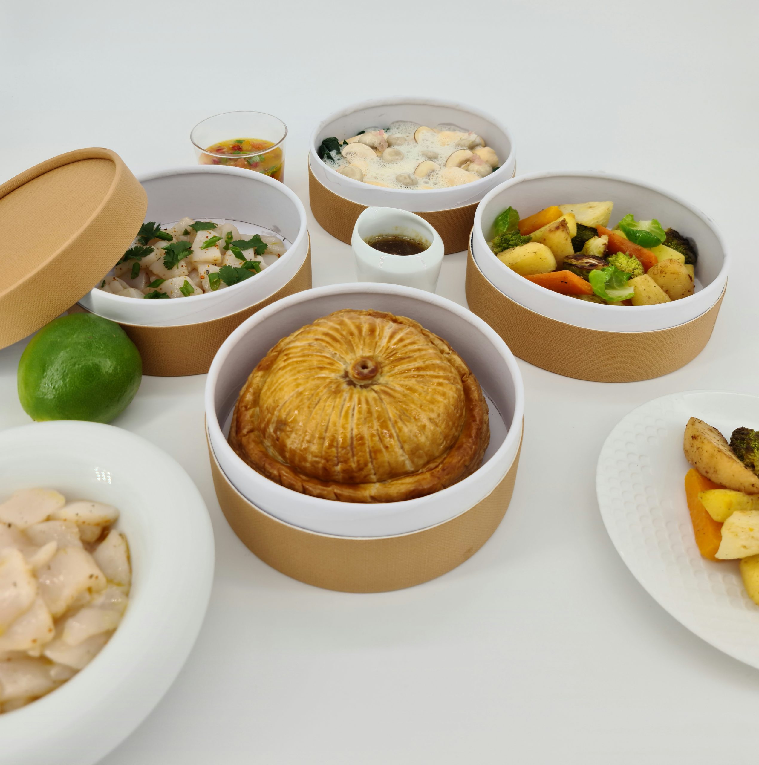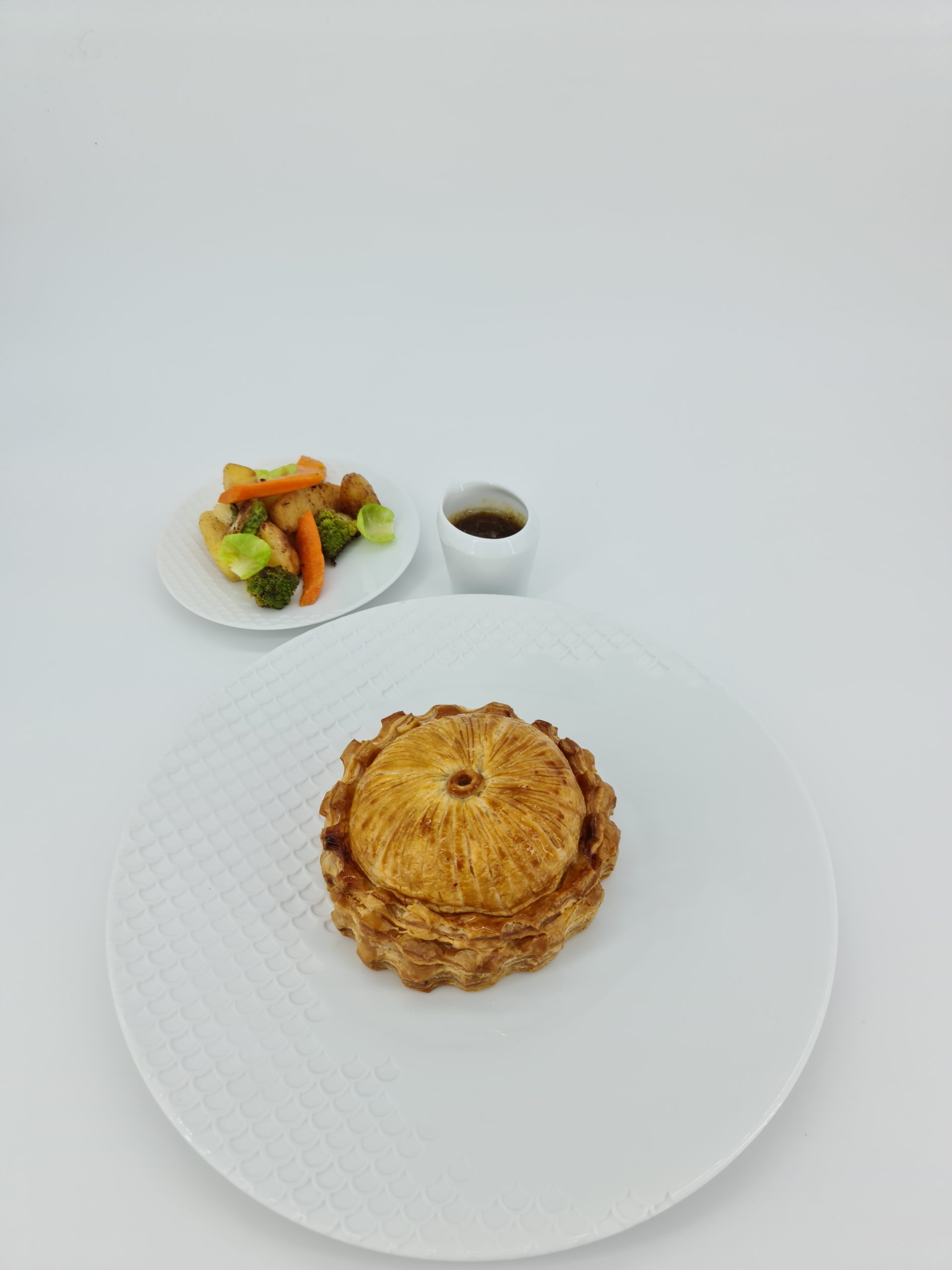 Bresse poultry pie with duck foie gras and black truffle to share, real truffle juice, fricassee of winter vegetables and fruit(sand carrots, celery from Ile de France, butternut, parsnip, tuberous chervil, romanesco cabbage, apple fruit and quince)