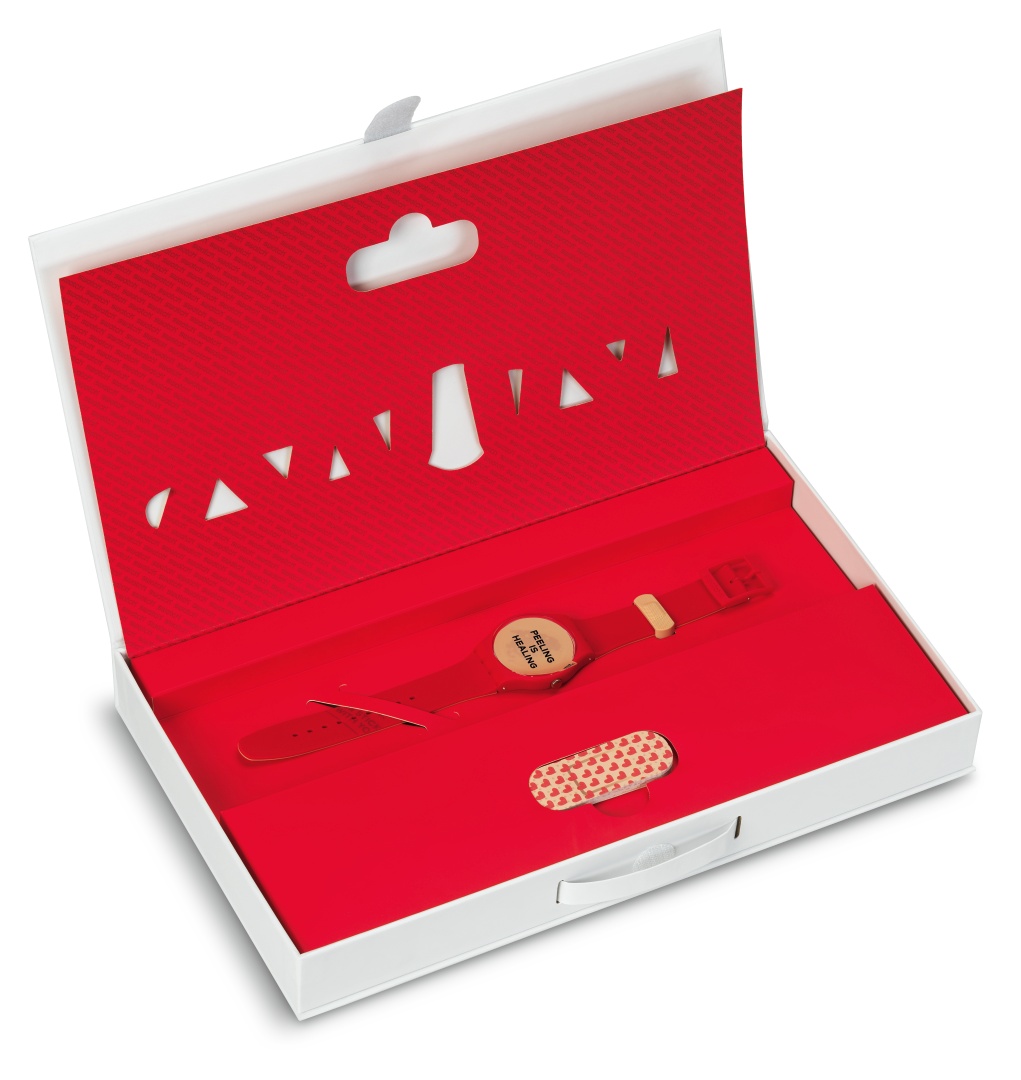 The P(E/A)NSE-MOI special edition features all the traditional symbols of love on the inside of the red bracelet. But that’s not all. The watch comes in a first-aid kit with bandages to soothe and heal the wounds of the heart!