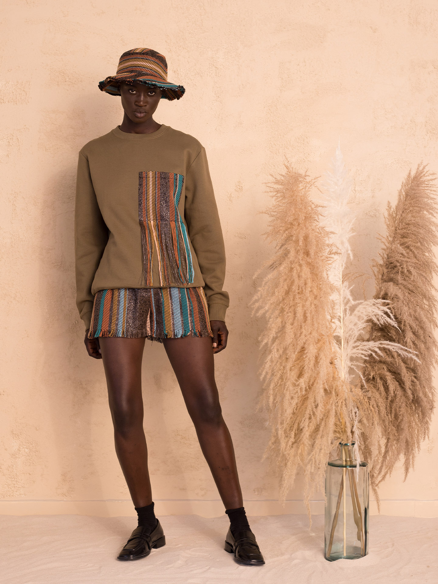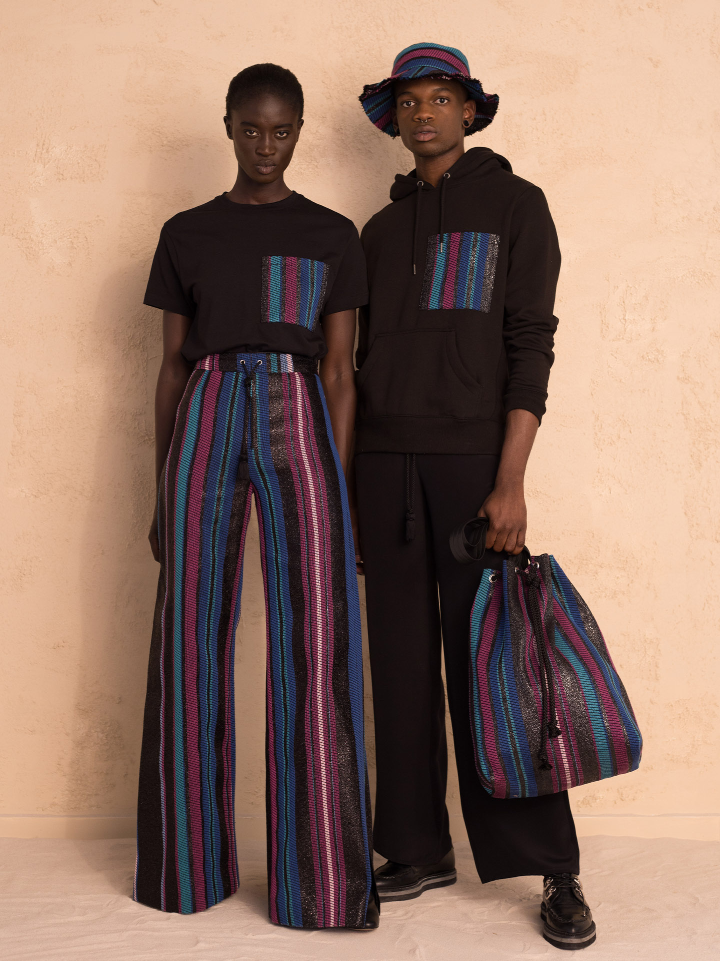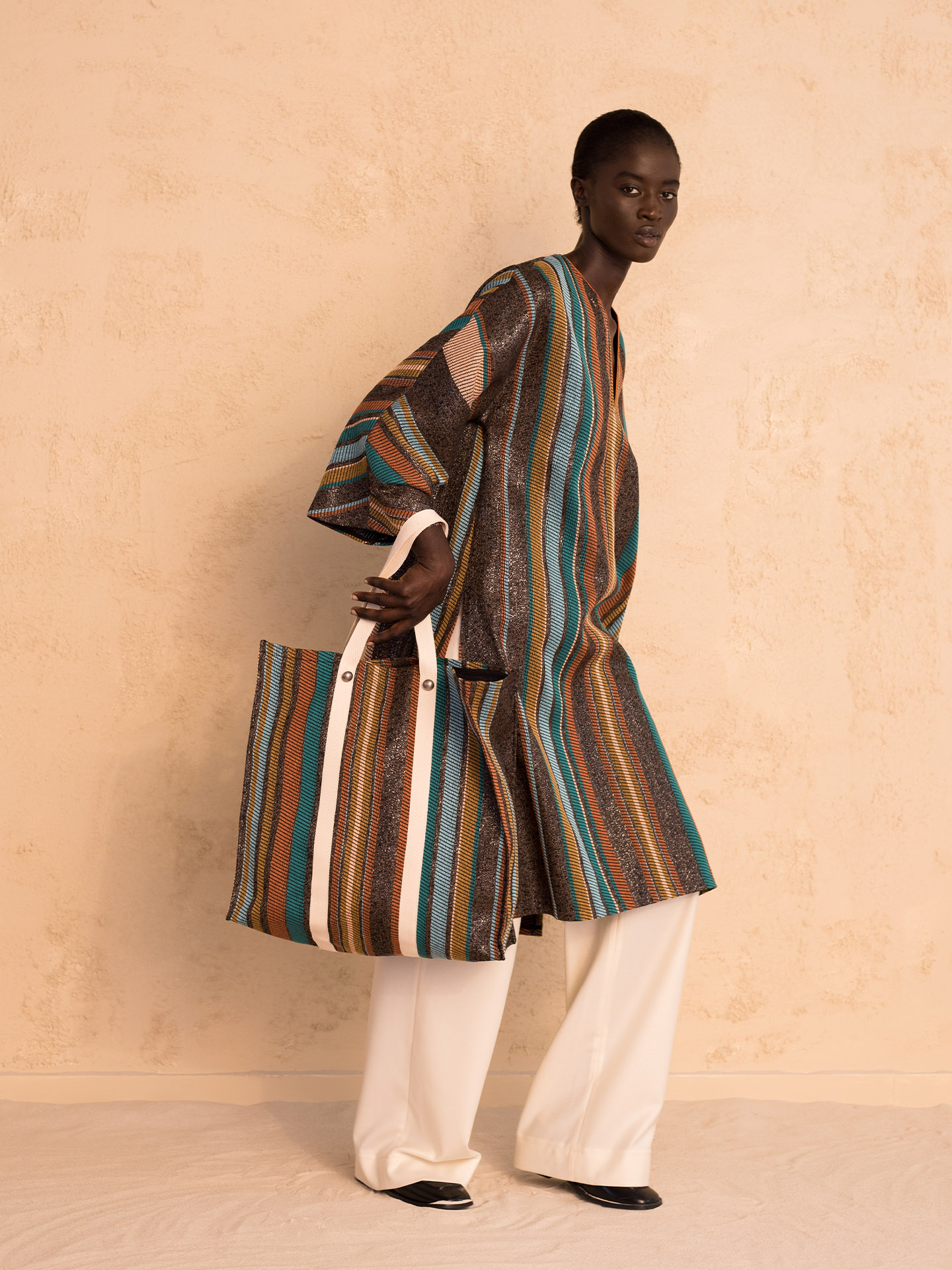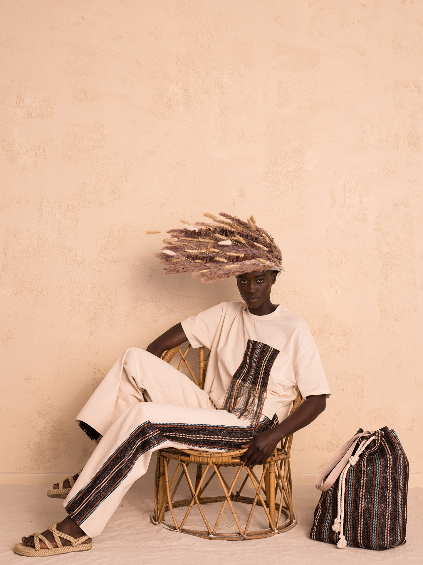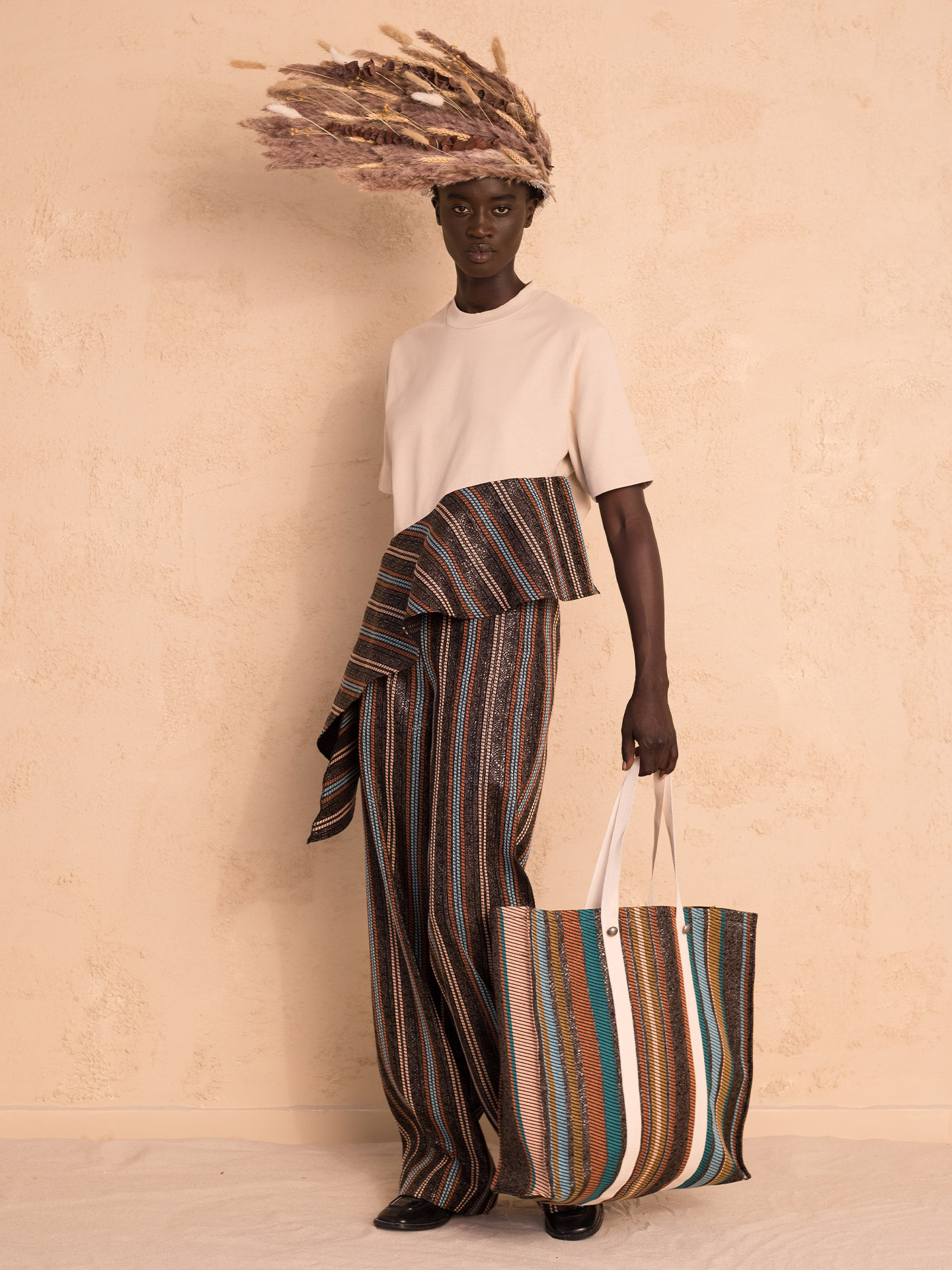 He has industrialized this weaving technique and gathered thousands of kilometers of cassette tapes thanks to the help of recycling charities as well as by collecting the dead stocks of factories closed in the 2000s. Benjamin draws inspiration from his Moroccan origins by focusing on volumes and draperies from traditional outfits as well as by weaving colorful striped fabrics reminiscent of Berber craft and aesthetic.