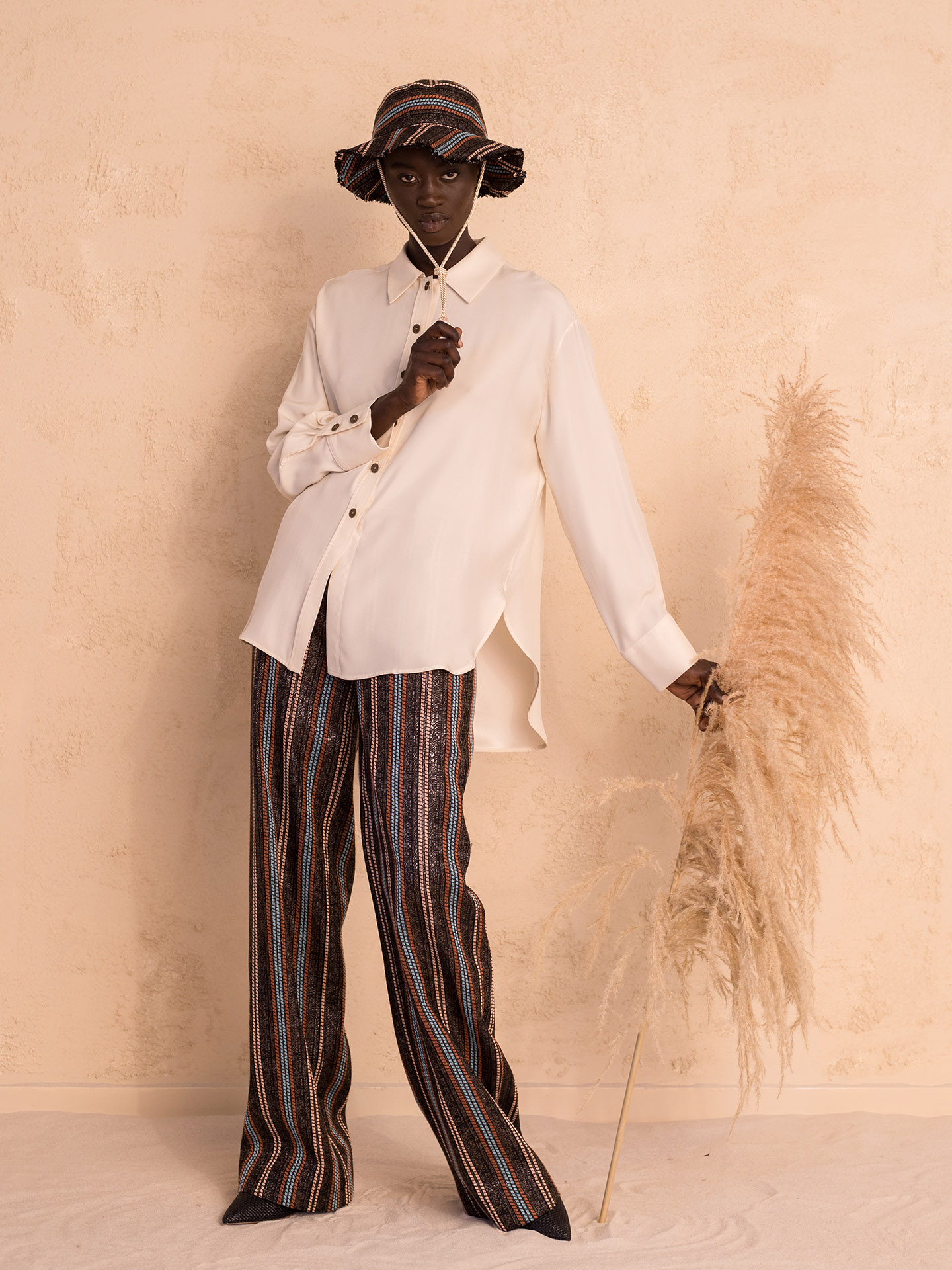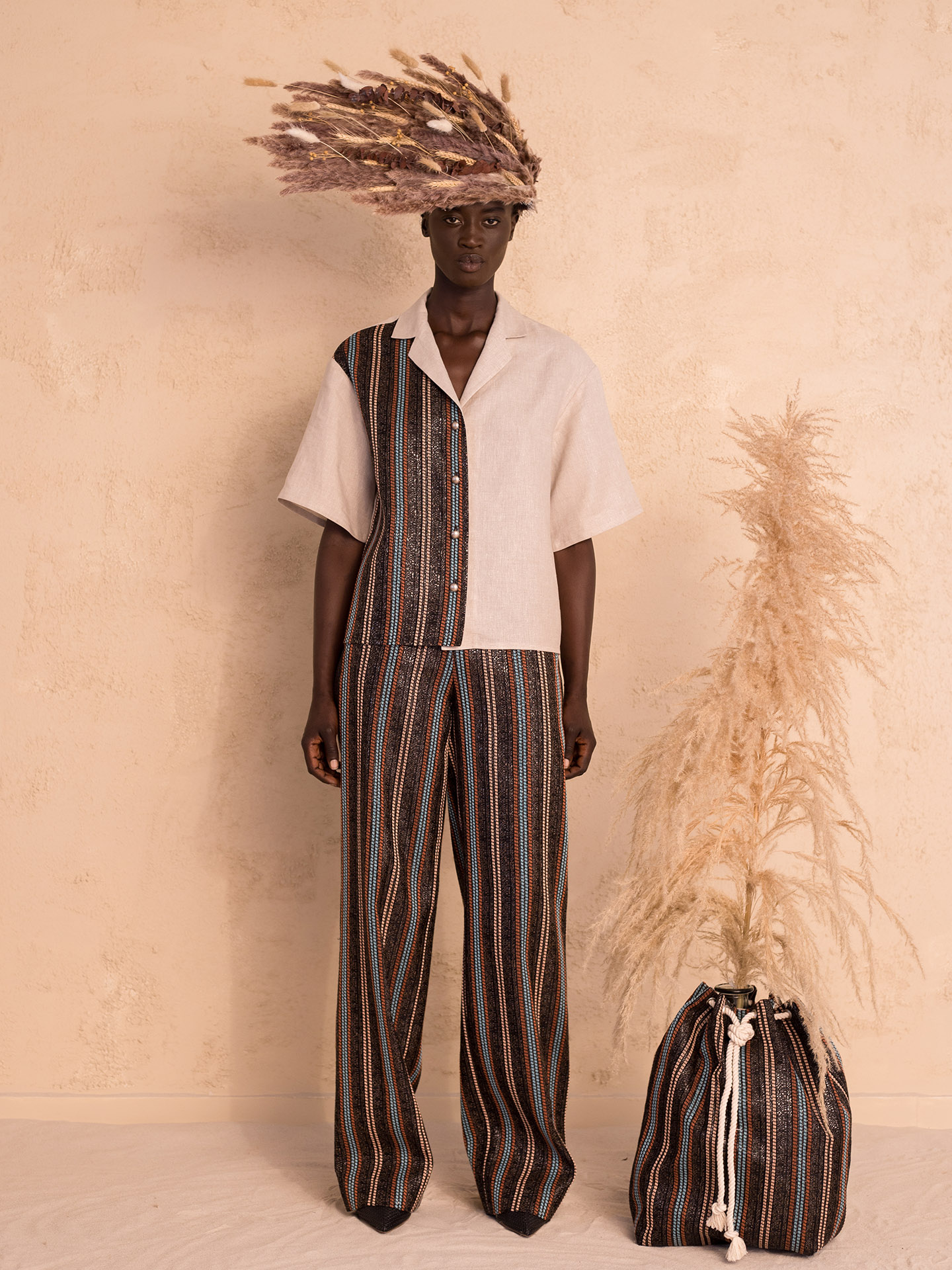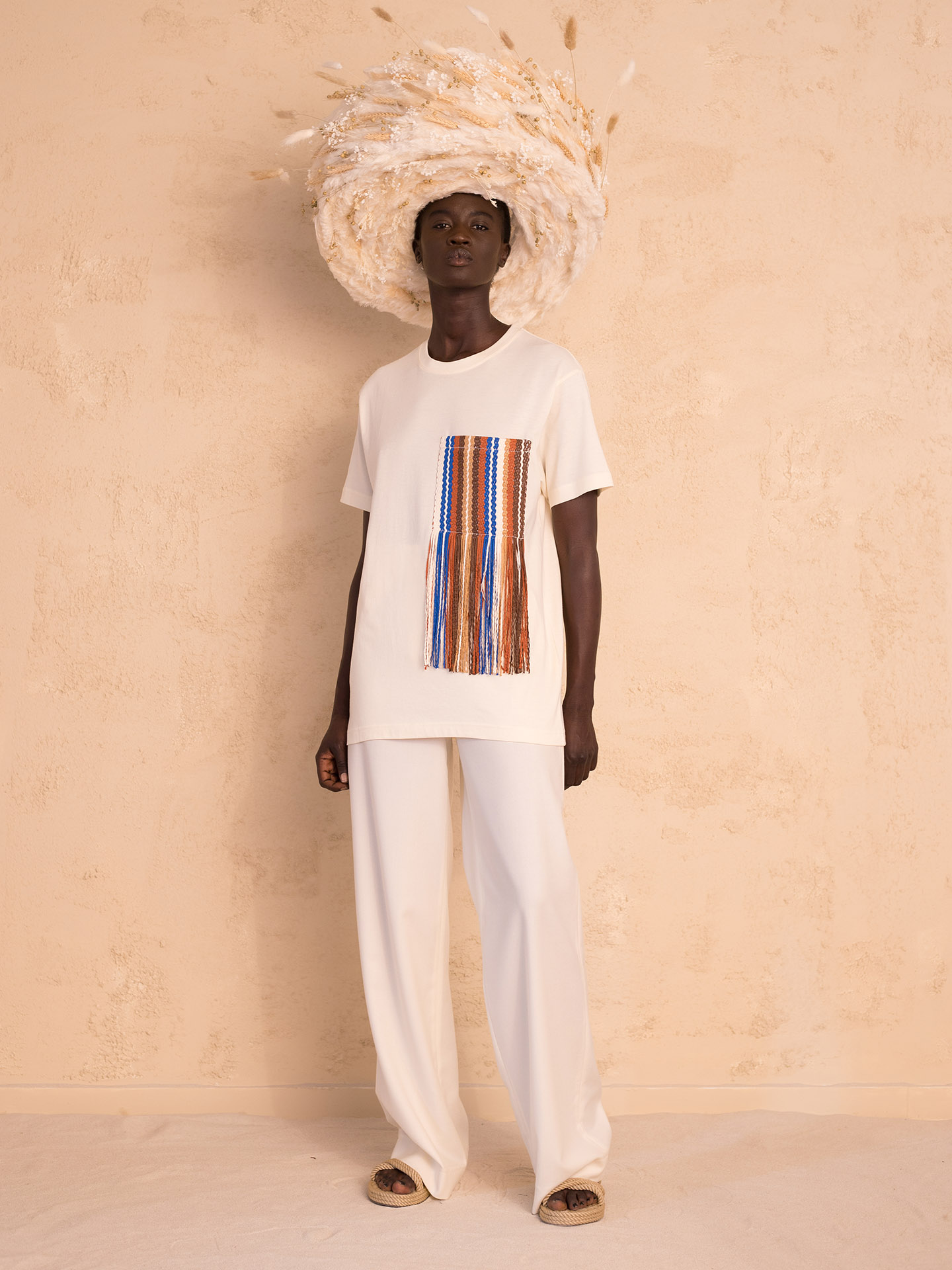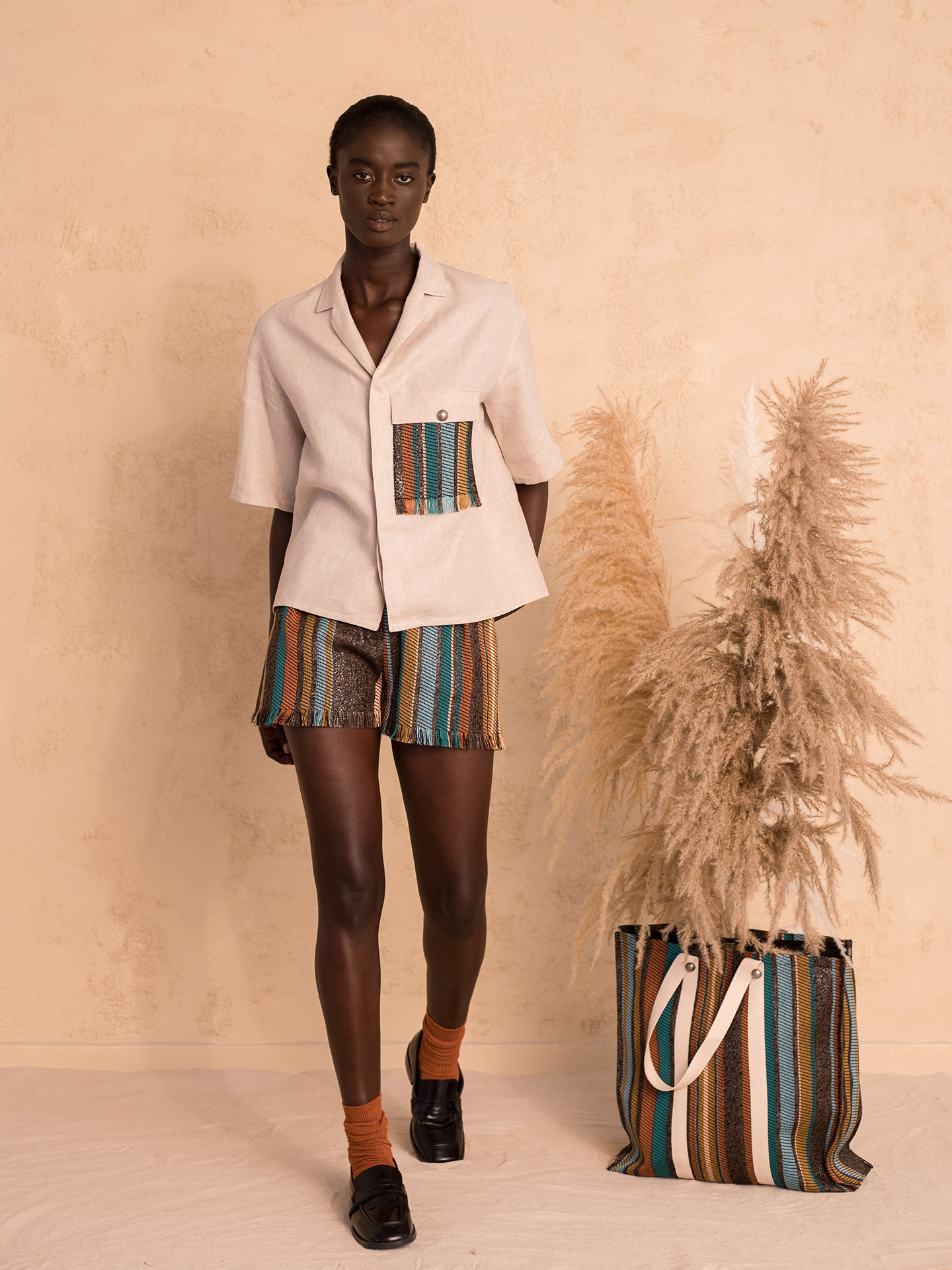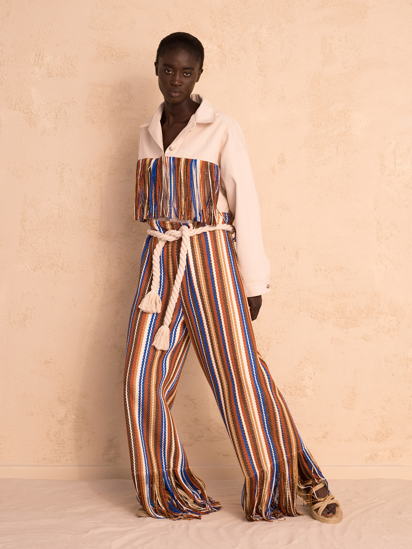 He has industrialized this weaving technique and gathered thousands of kilometers of cassette tapes thanks to the help of recycling charities as well as by collecting the dead stocks of factories closed in the 2000s. Benjamin draws inspiration from his Moroccan origins by focusing on volumes and draperies from traditional outfits as well as by weaving colorful striped fabrics reminiscent of Berber craft and aesthetic.
