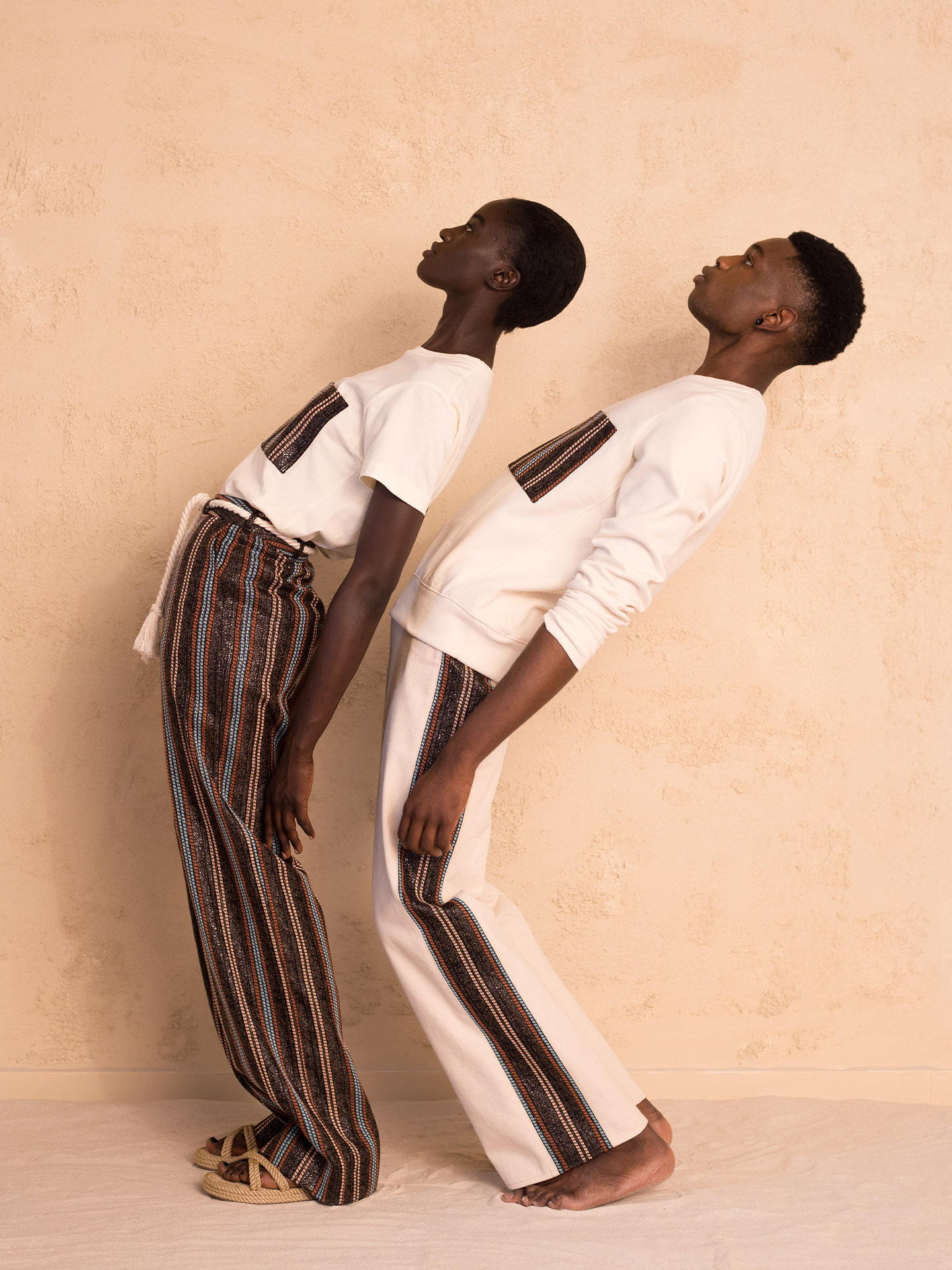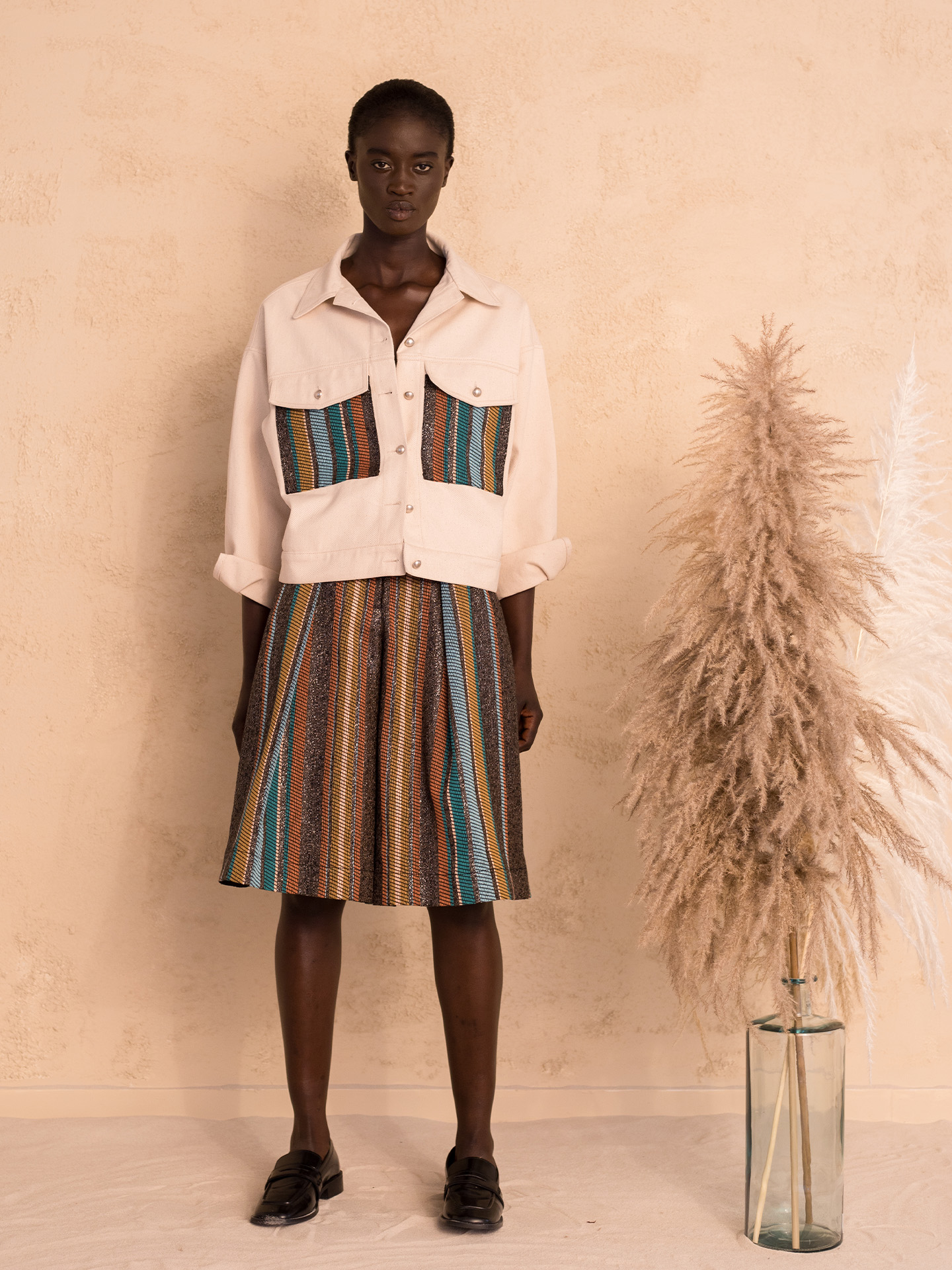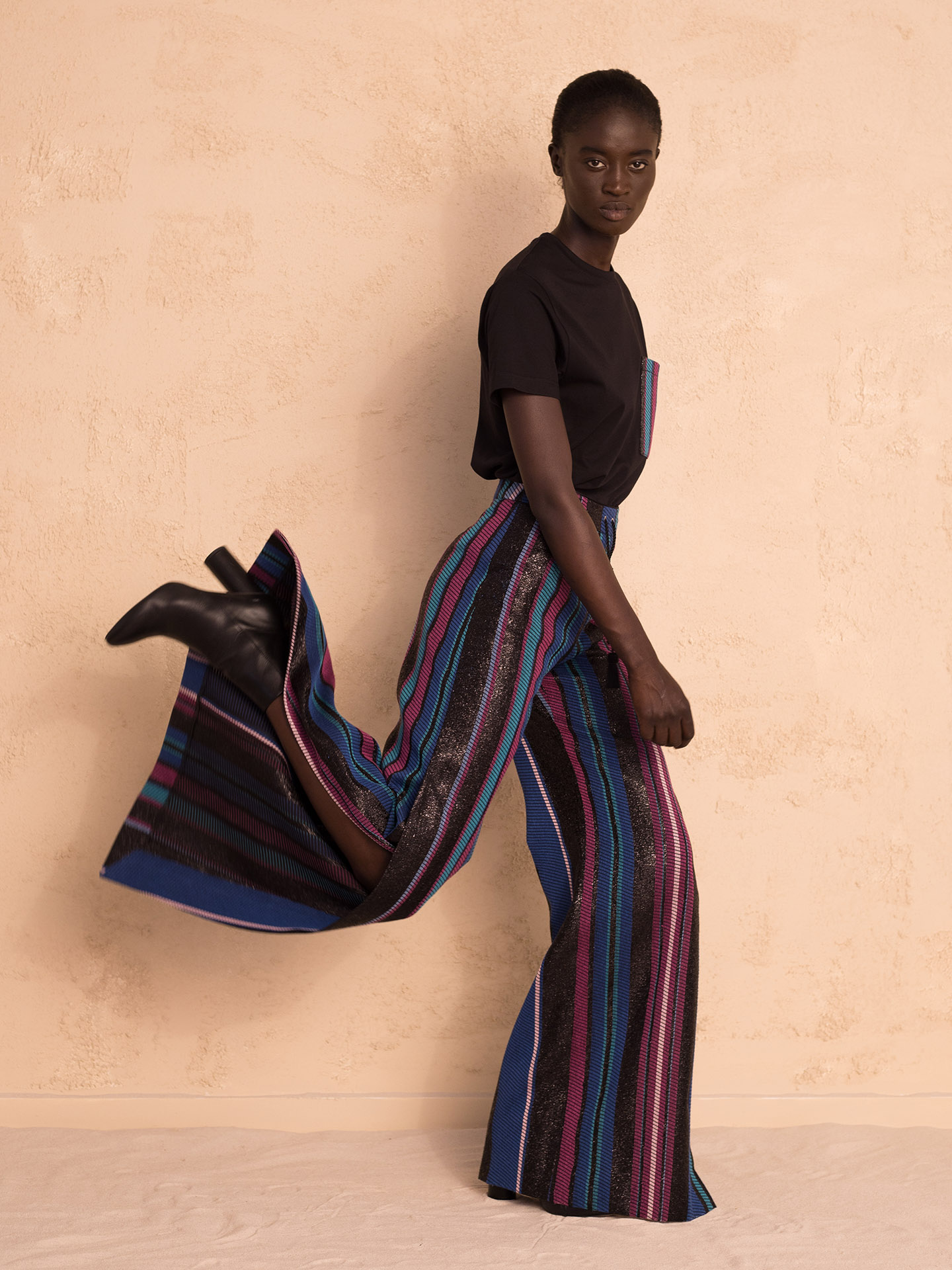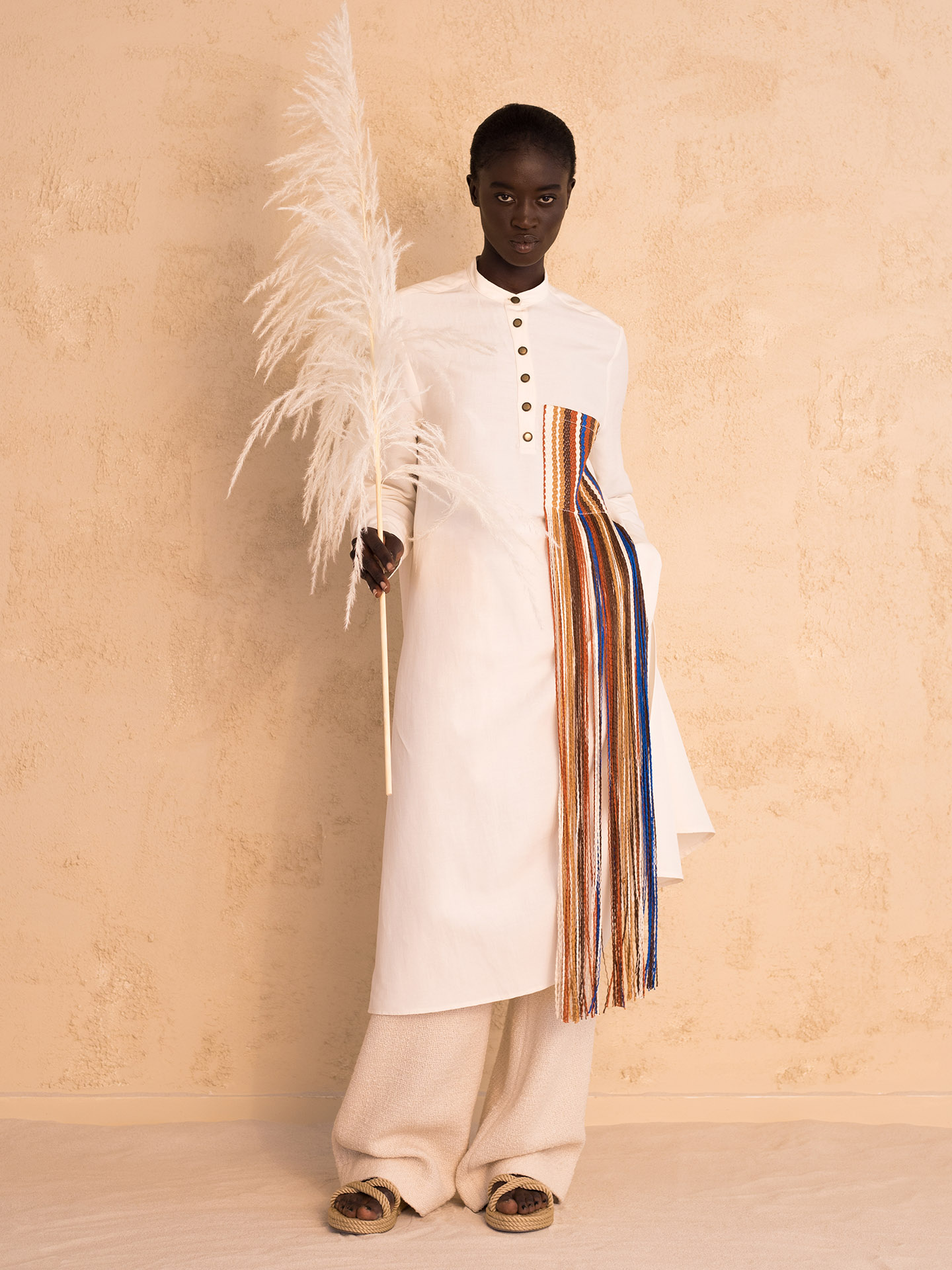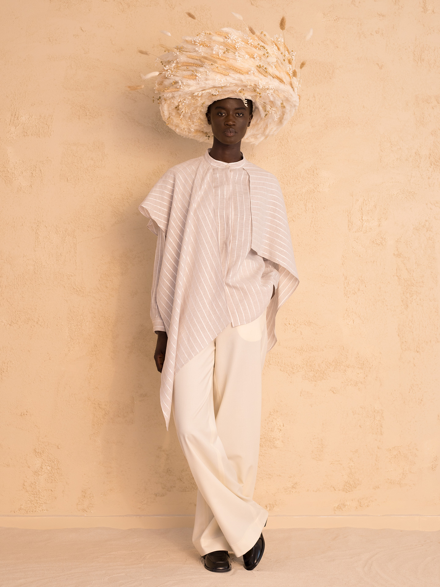 He has industrialized this weaving technique and gathered thousands of kilometers of cassette tapes thanks to the help of recycling charities as well as by collecting the dead stocks of factories closed in the 2000s. Benjamin draws inspiration from his Moroccan origins by focusing on volumes and draperies from traditional outfits as well as by weaving colorful striped fabrics reminiscent of Berber craft and aesthetic.