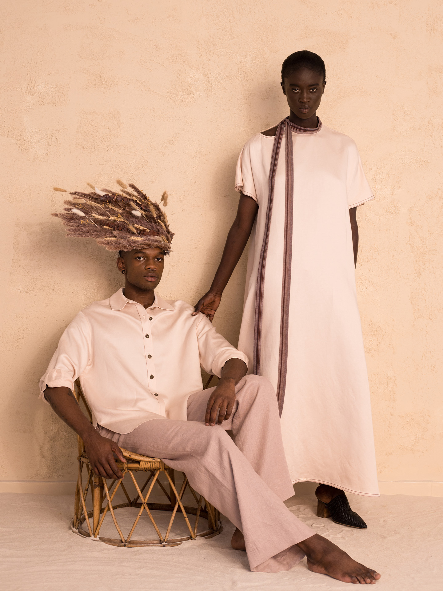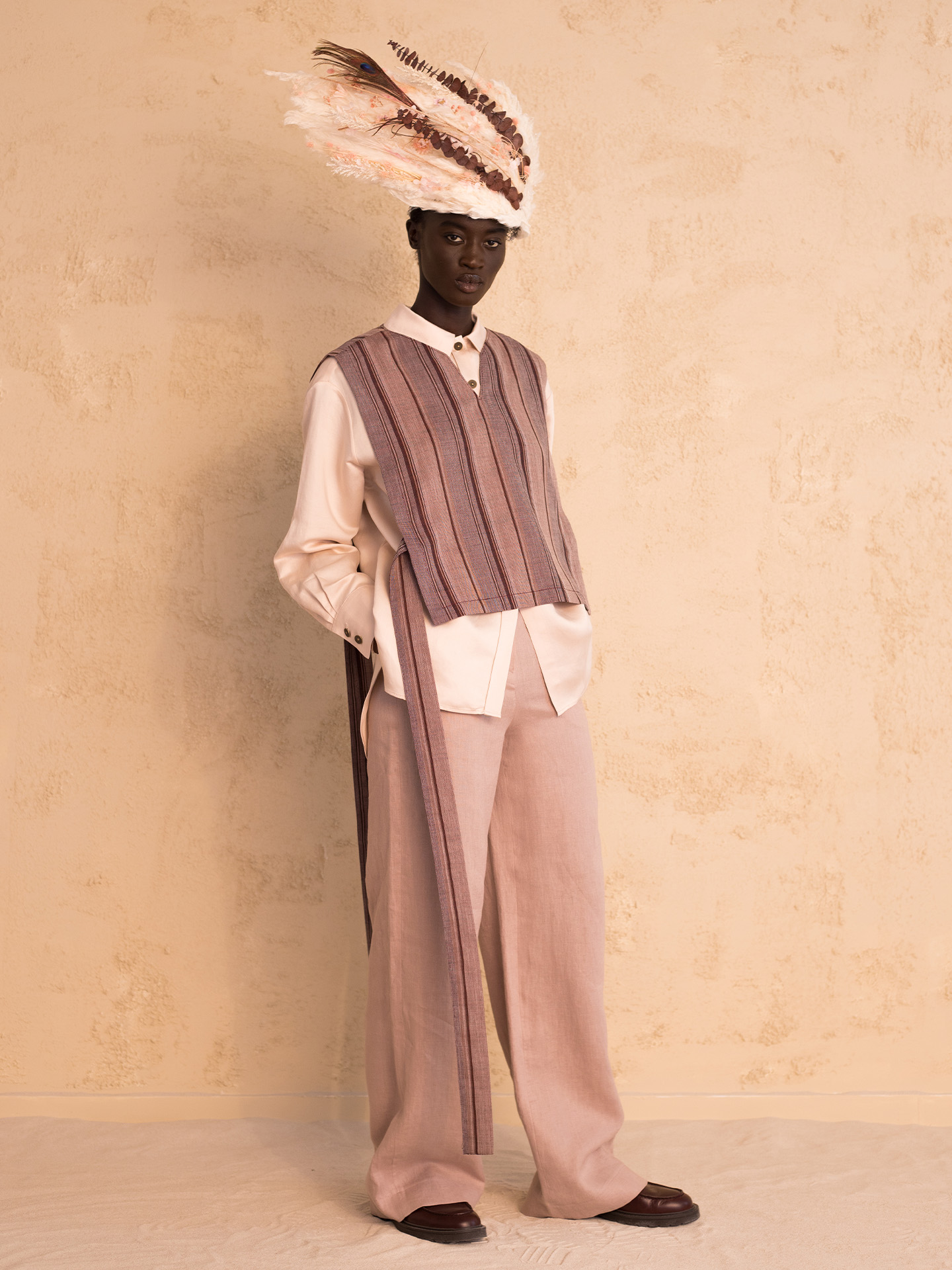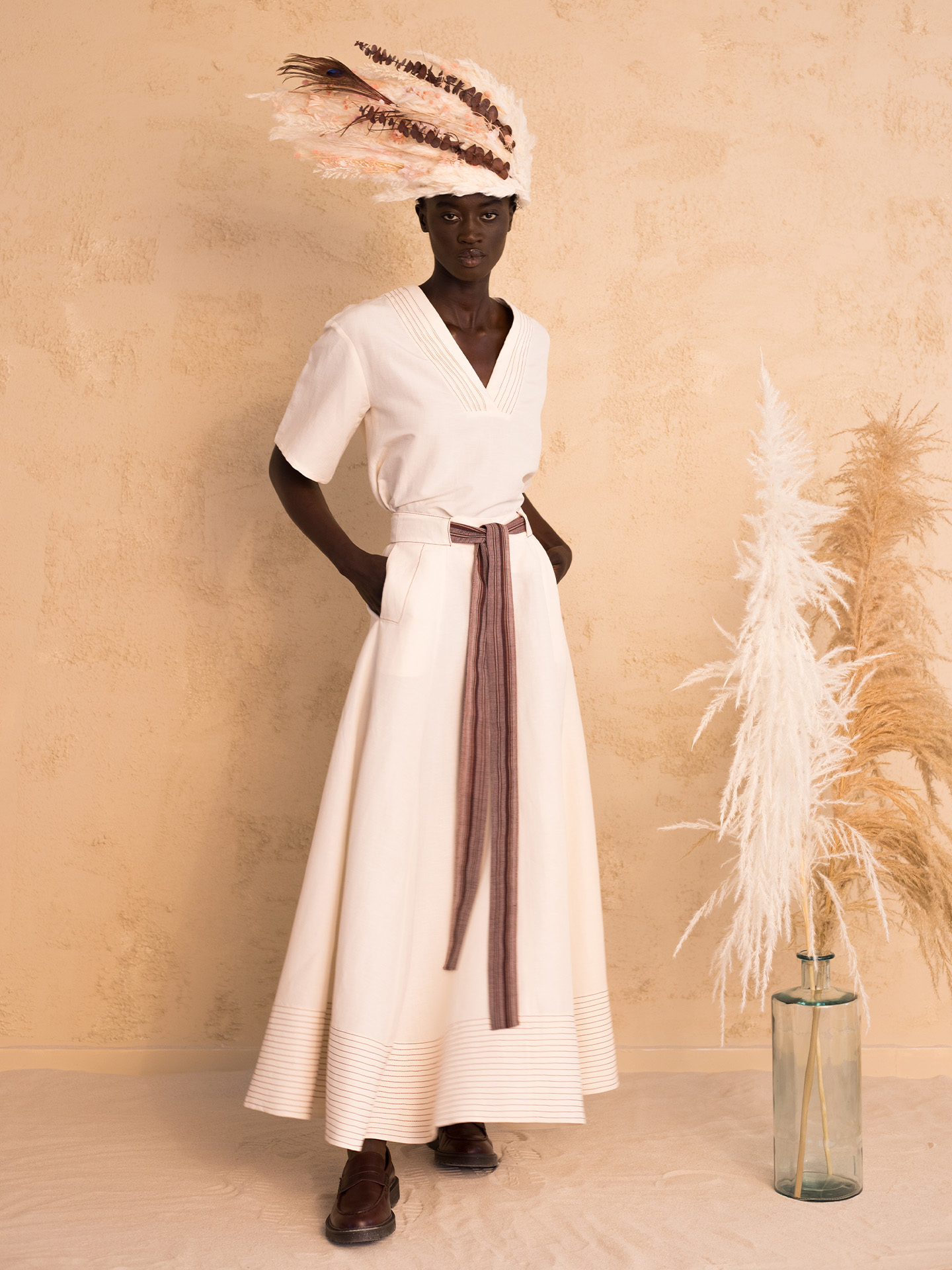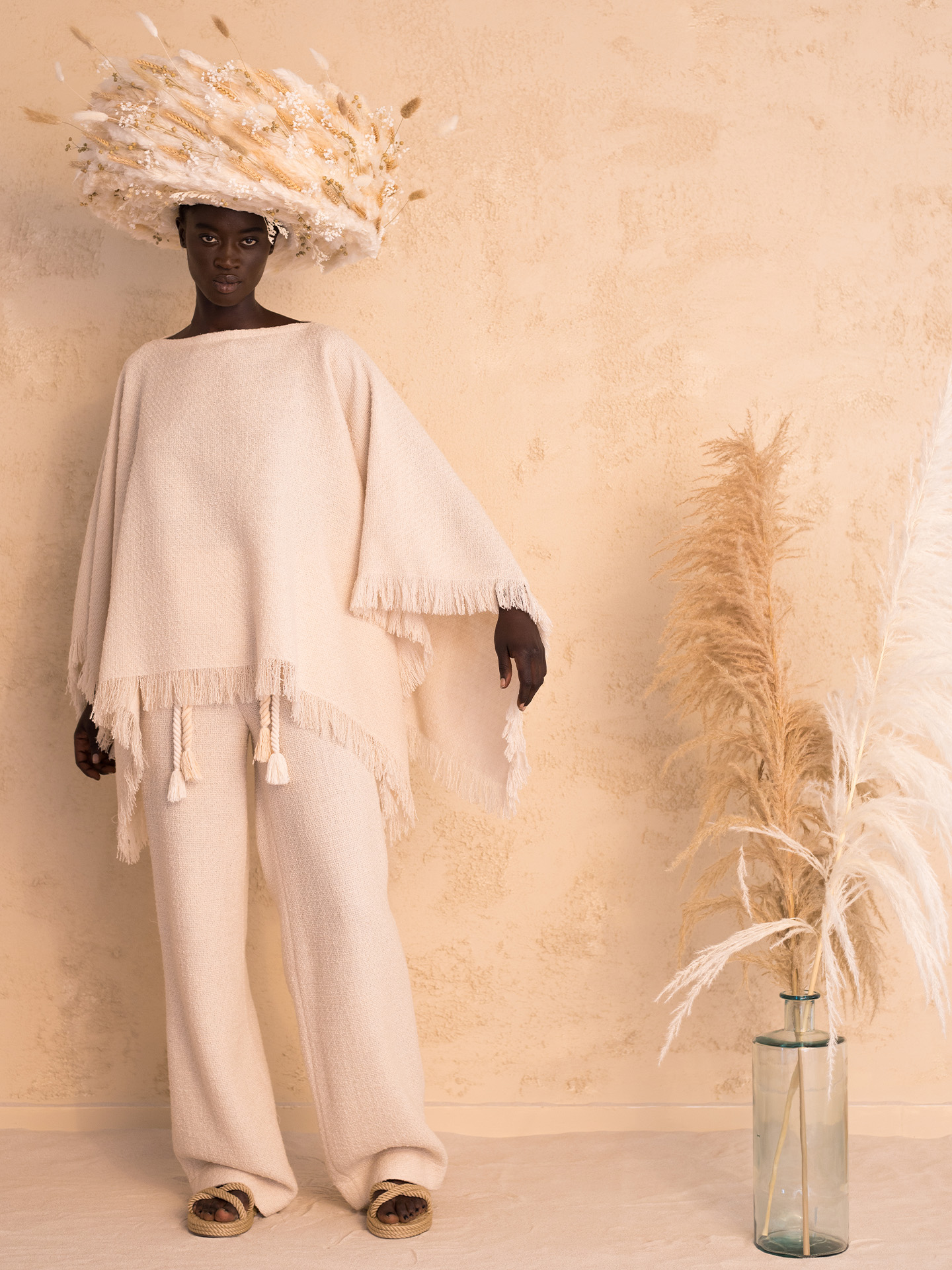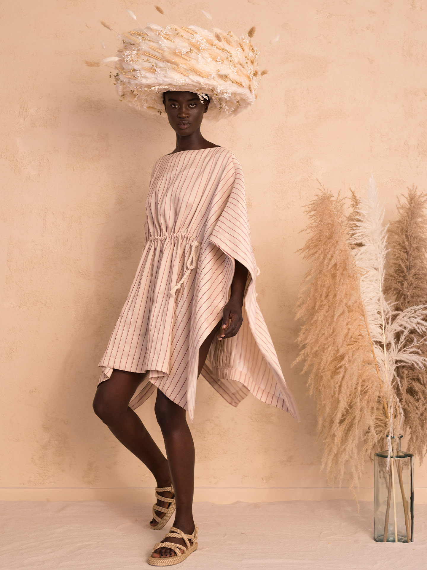 He has industrialized this weaving technique and gathered thousands of kilometers of cassette tapes thanks to the help of recycling charities as well as by collecting the dead stocks of factories closed in the 2000s. Benjamin draws inspiration from his Moroccan origins by focusing on volumes and draperies from traditional outfits as well as by weaving colorful striped fabrics reminiscent of Berber craft and aesthetic.