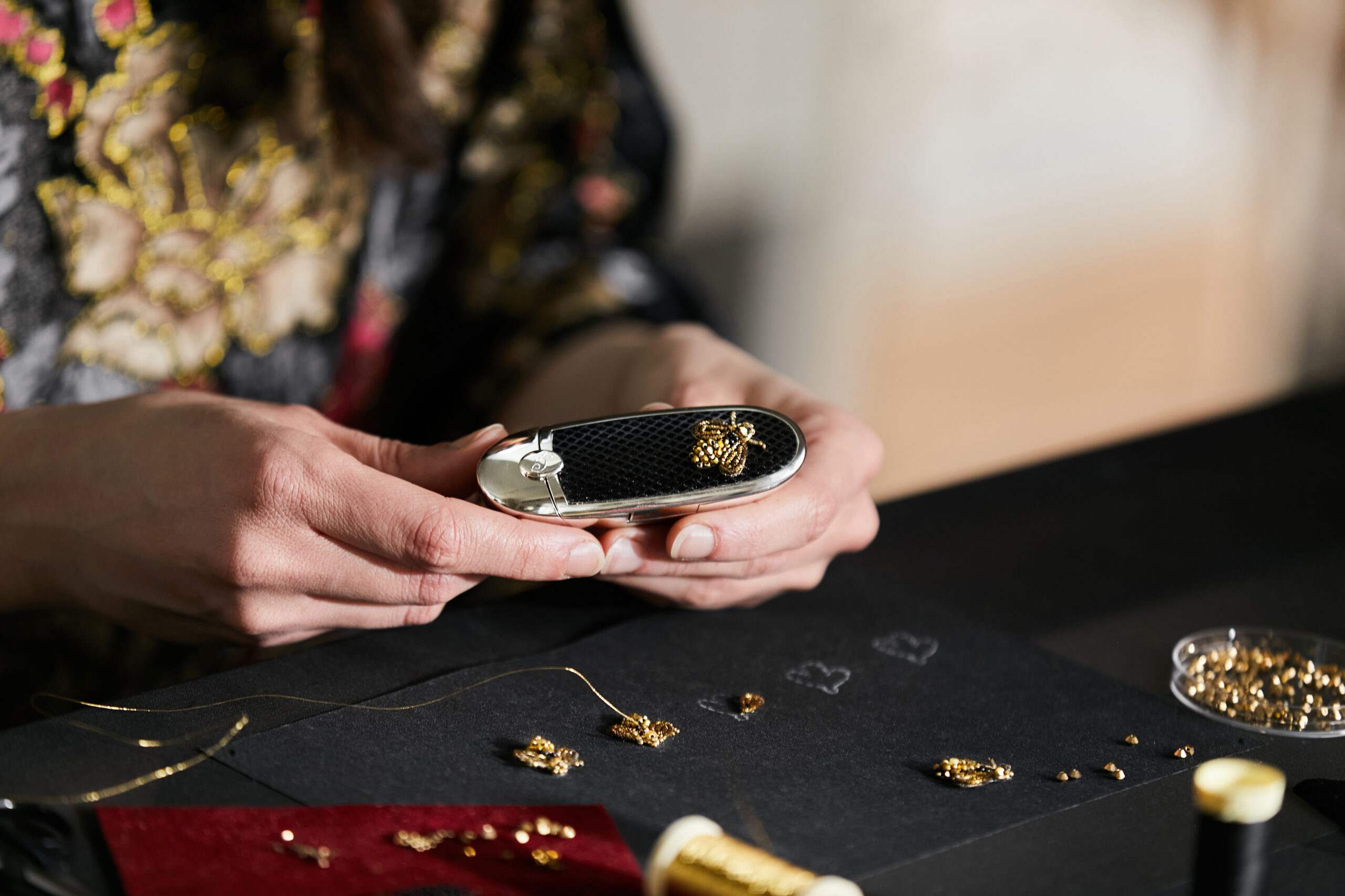 A prodigious bee embroidered with gold thread and sparkling pearls, set in a velvet-quilted case.