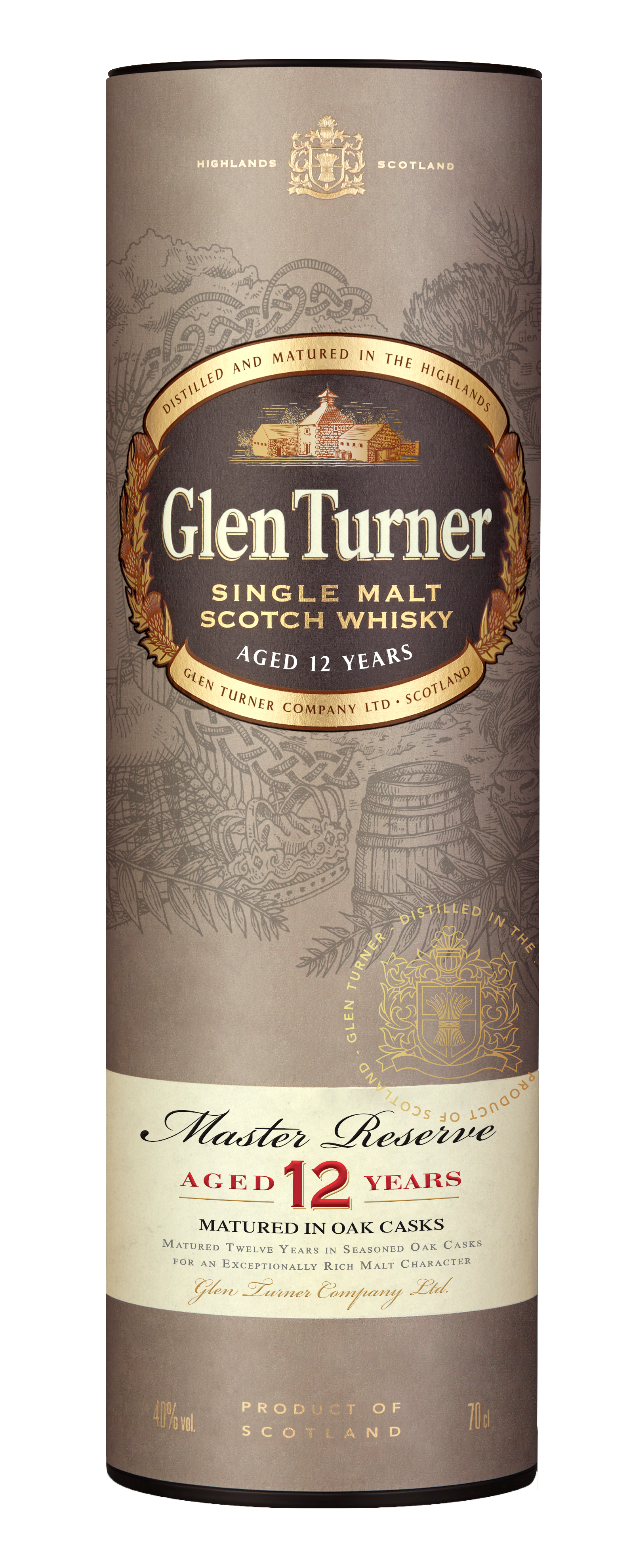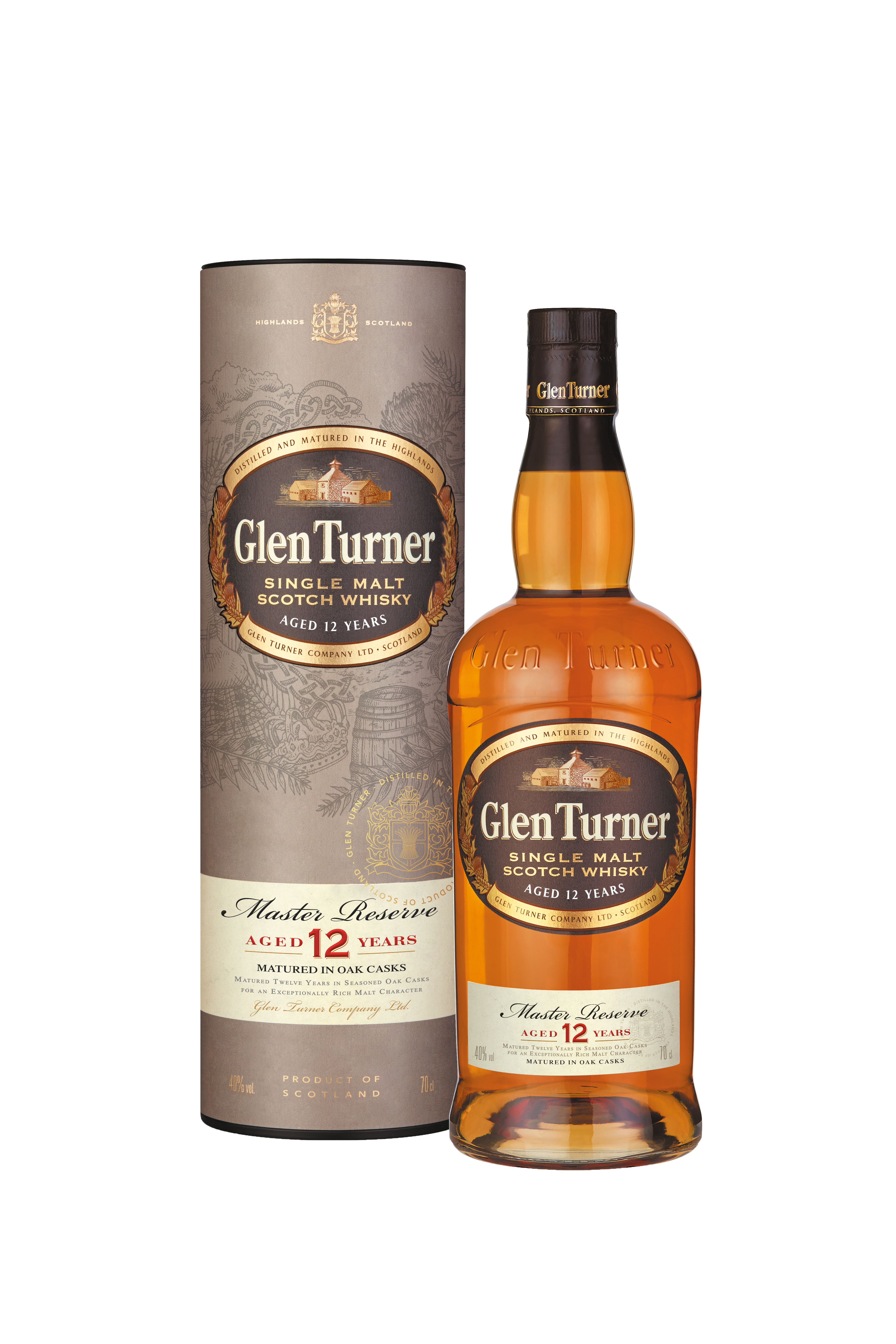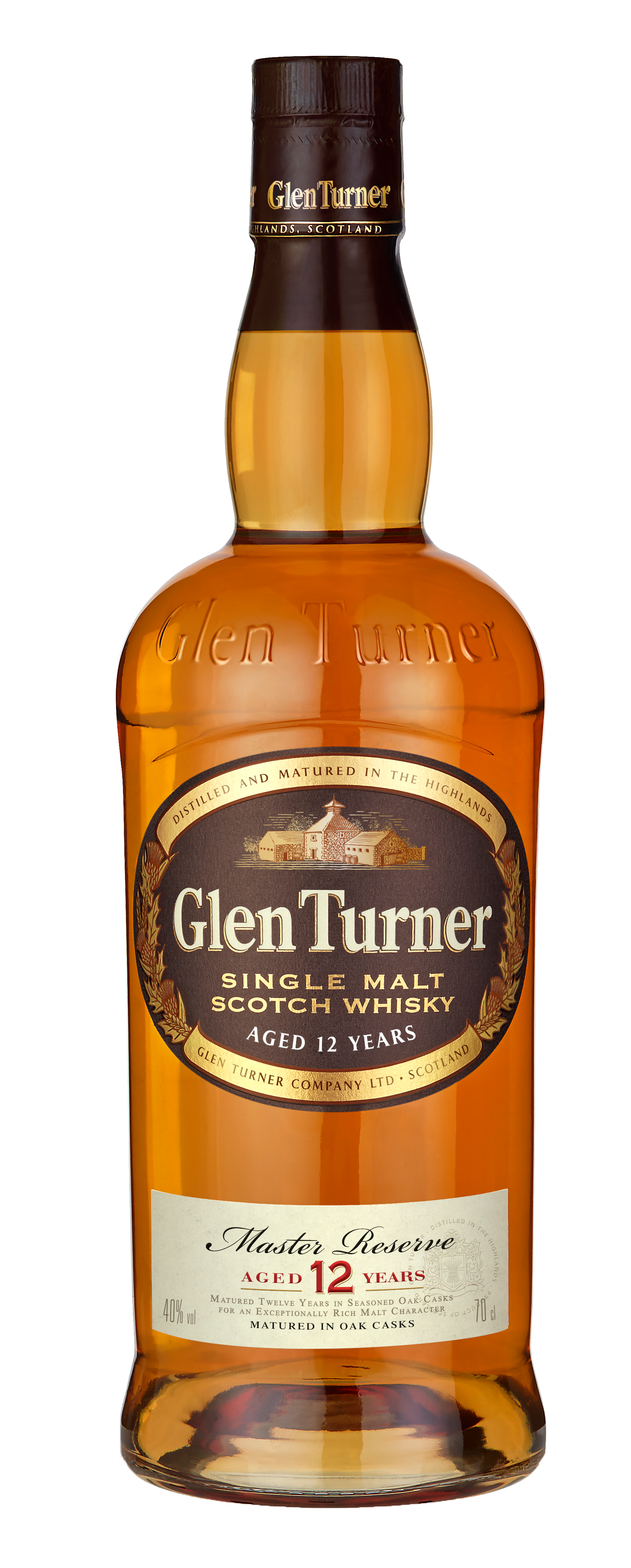GLEN TURNER 12 YEARS OLD is an exceptional Single Malt made in the Highlands, in the heart of Scotland. This single malt is aged for 12 years in Bourbon casks, under the supervision of the Master Distiller. With its elegant, rich and intense aromatic palette, it is the ideal accompaniment to the festive season.