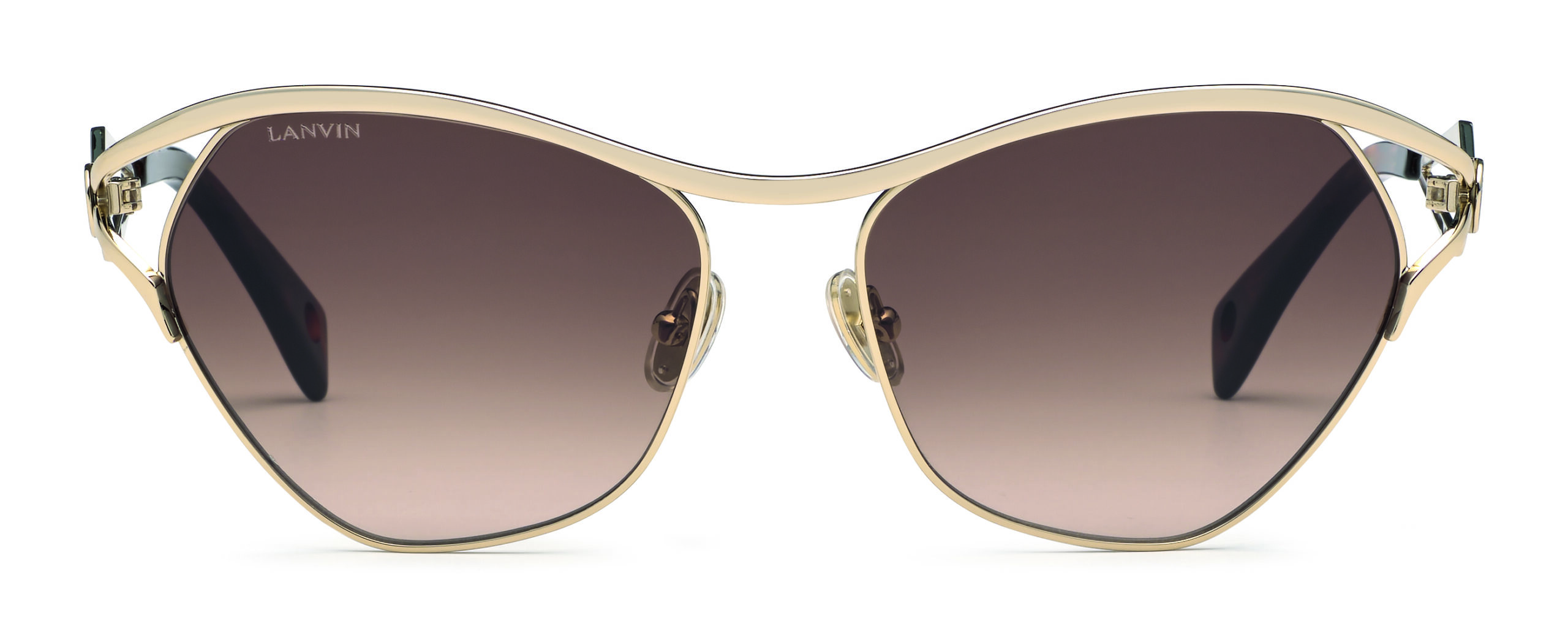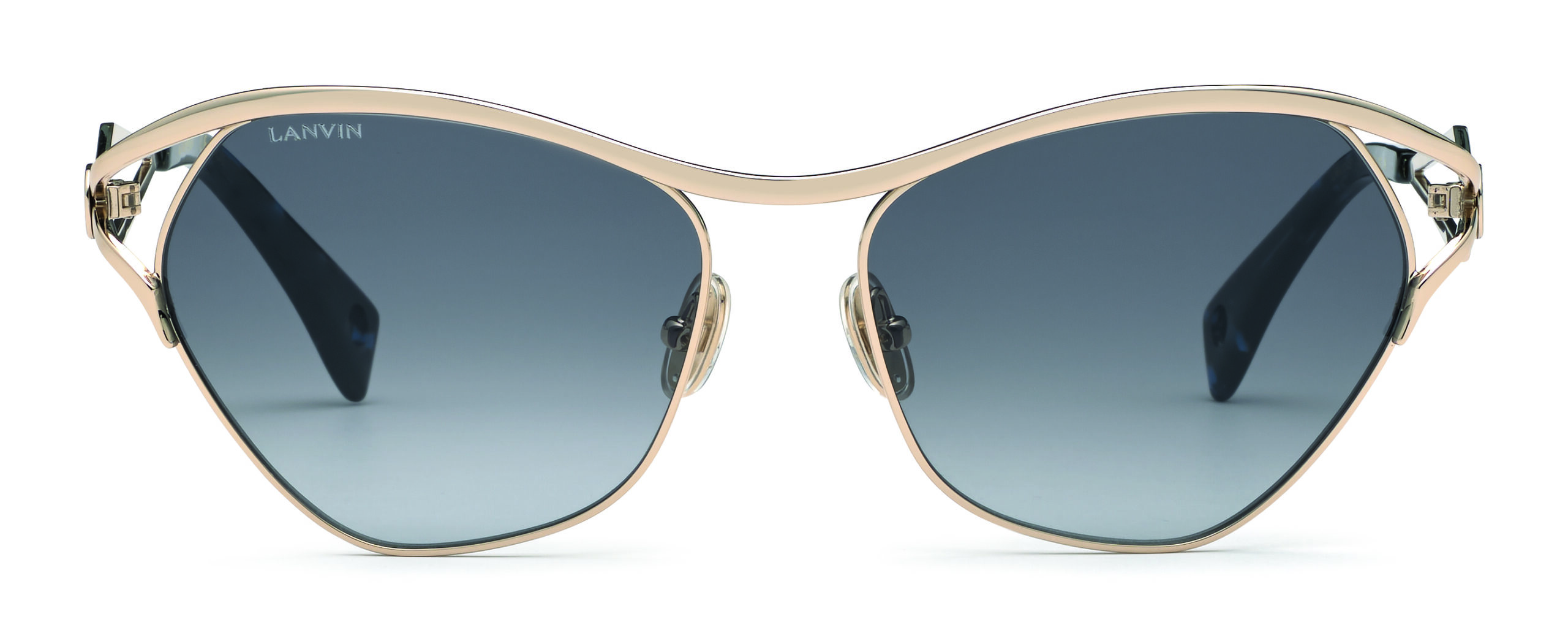 Designed in lightweight metal, these feminine sunglasses feature a soft, butterfly-shaped frame with clean, sleek edges. The temples, which house the golden mother-daughter plaque, are a playful representation of the Lanvin bow, seen on the SS21 runway show. Available in Gold/Gray, Gold/Degraded Blue and Gold/Degraded Brown.