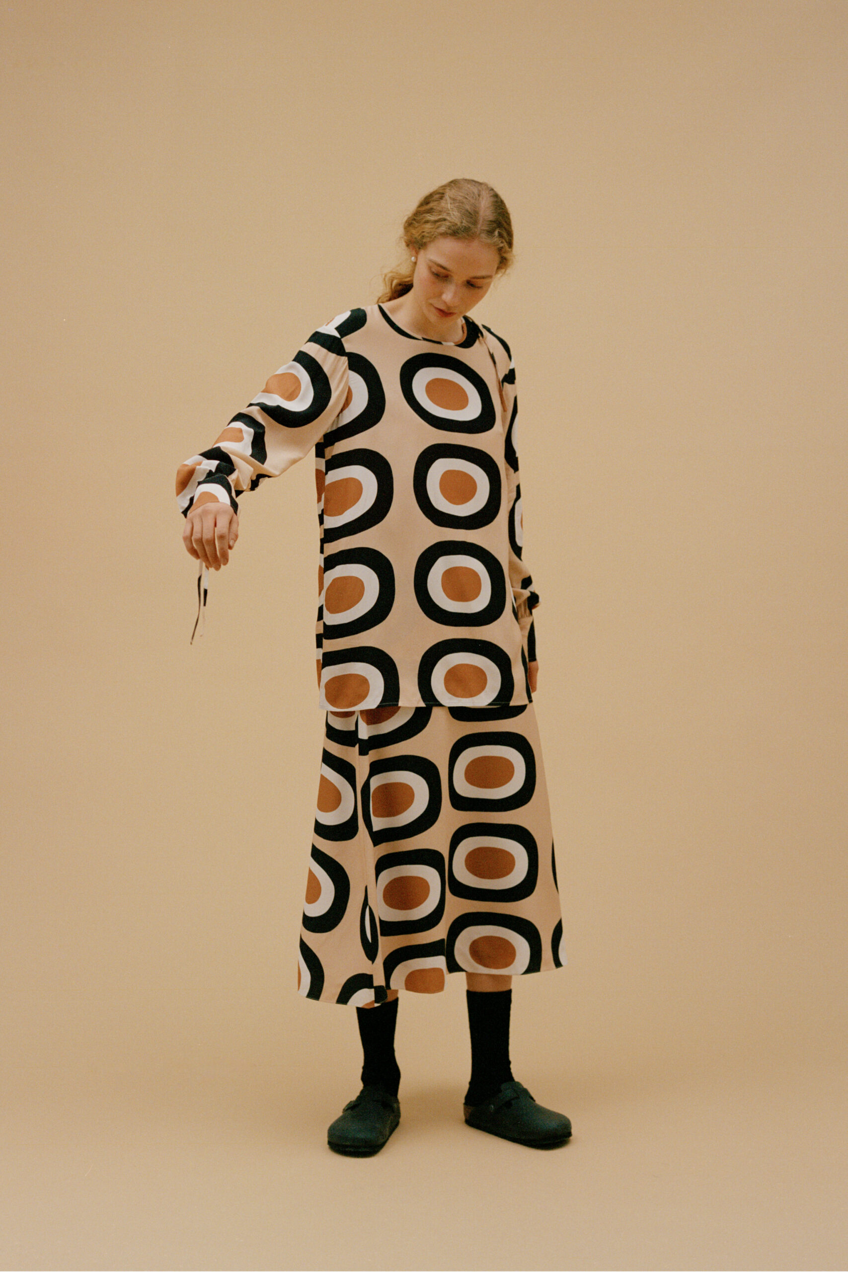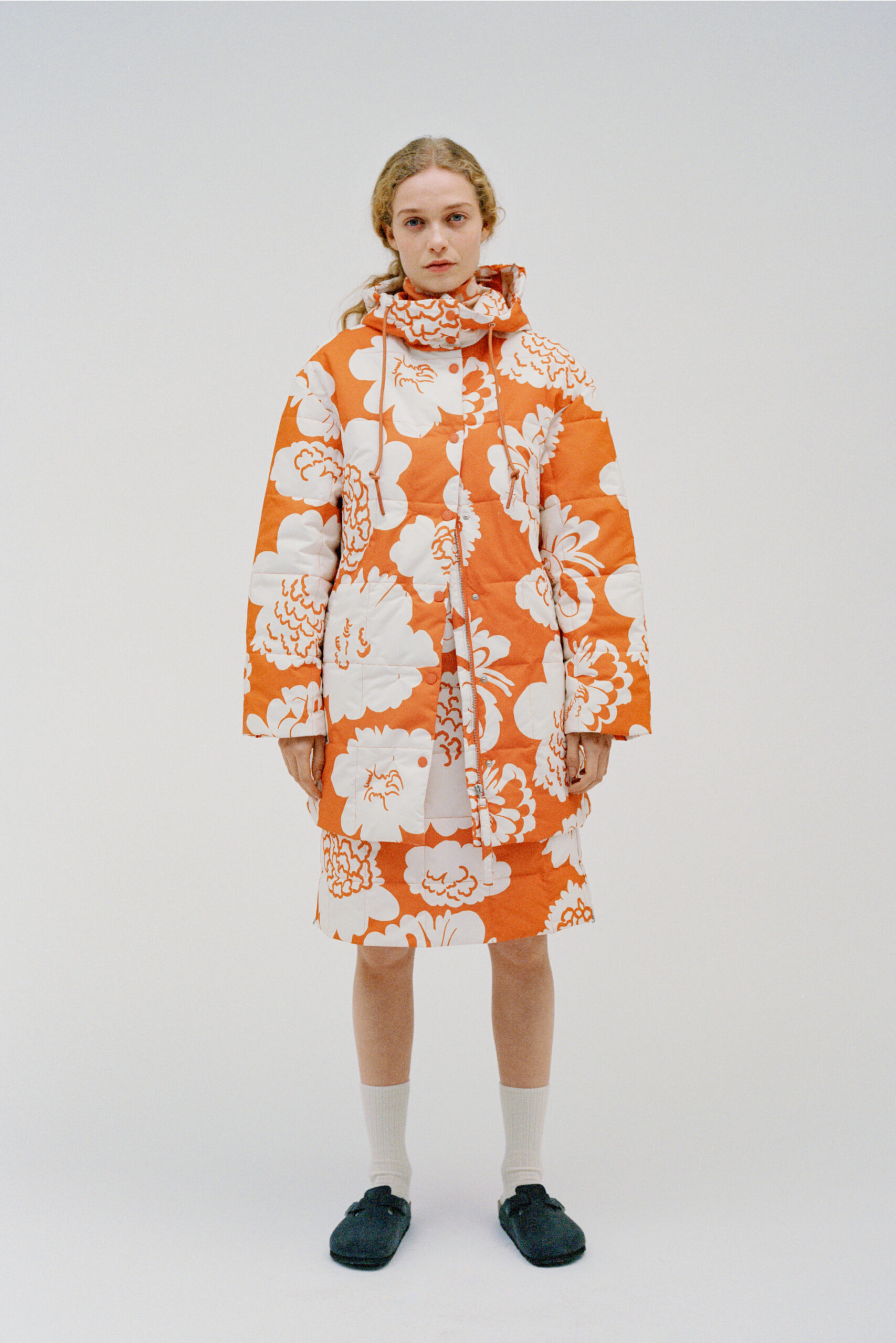 The Fall/Winter 2022 print selection is exclusively composed Marimekko’s archive prints from the 60s, 70s and 80s. Canvas whites and soft grey beiges are complimented with a rich mix of butternut, chanterelle, amber and chestnut blossoming on the bold prints the design house has become famous for.