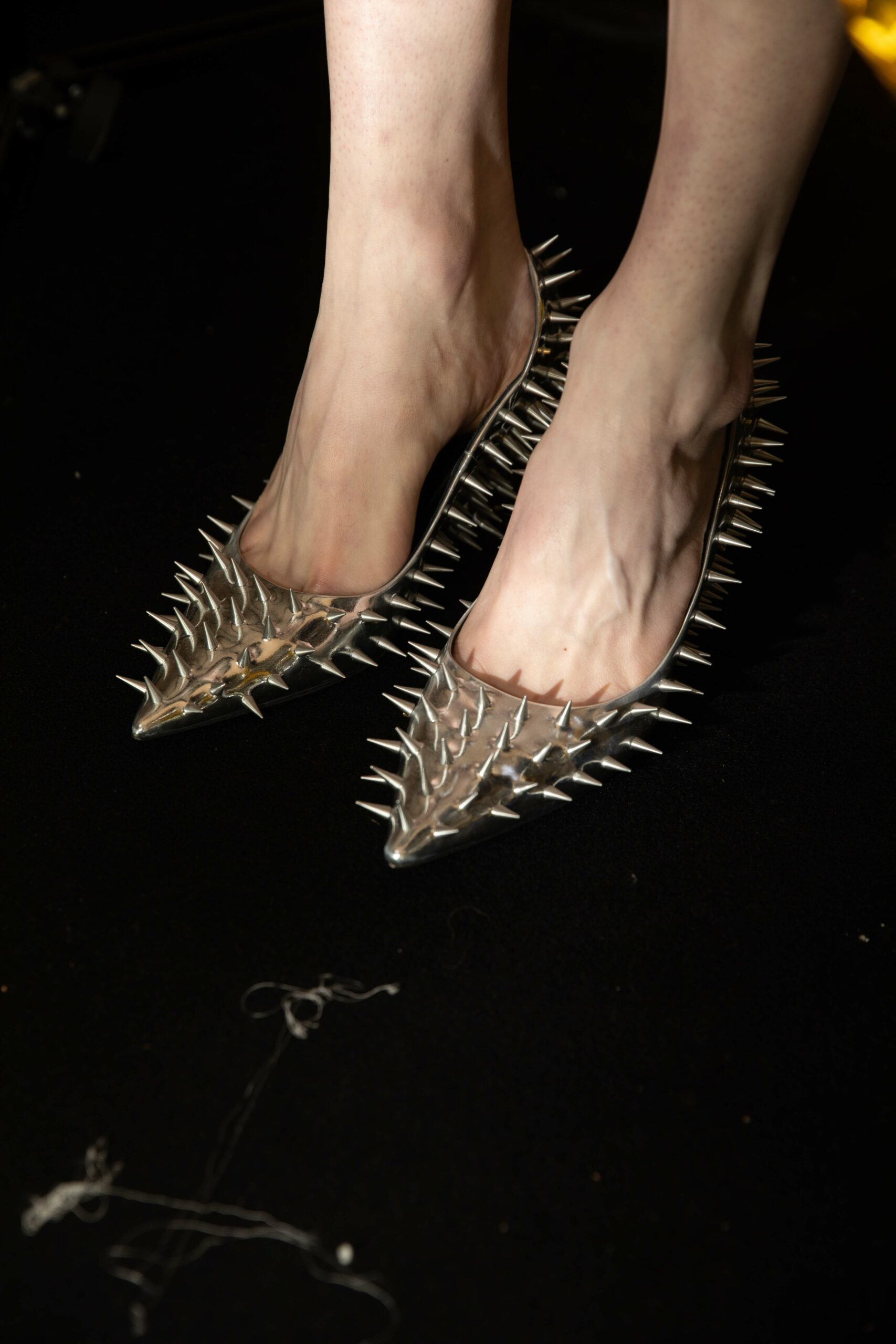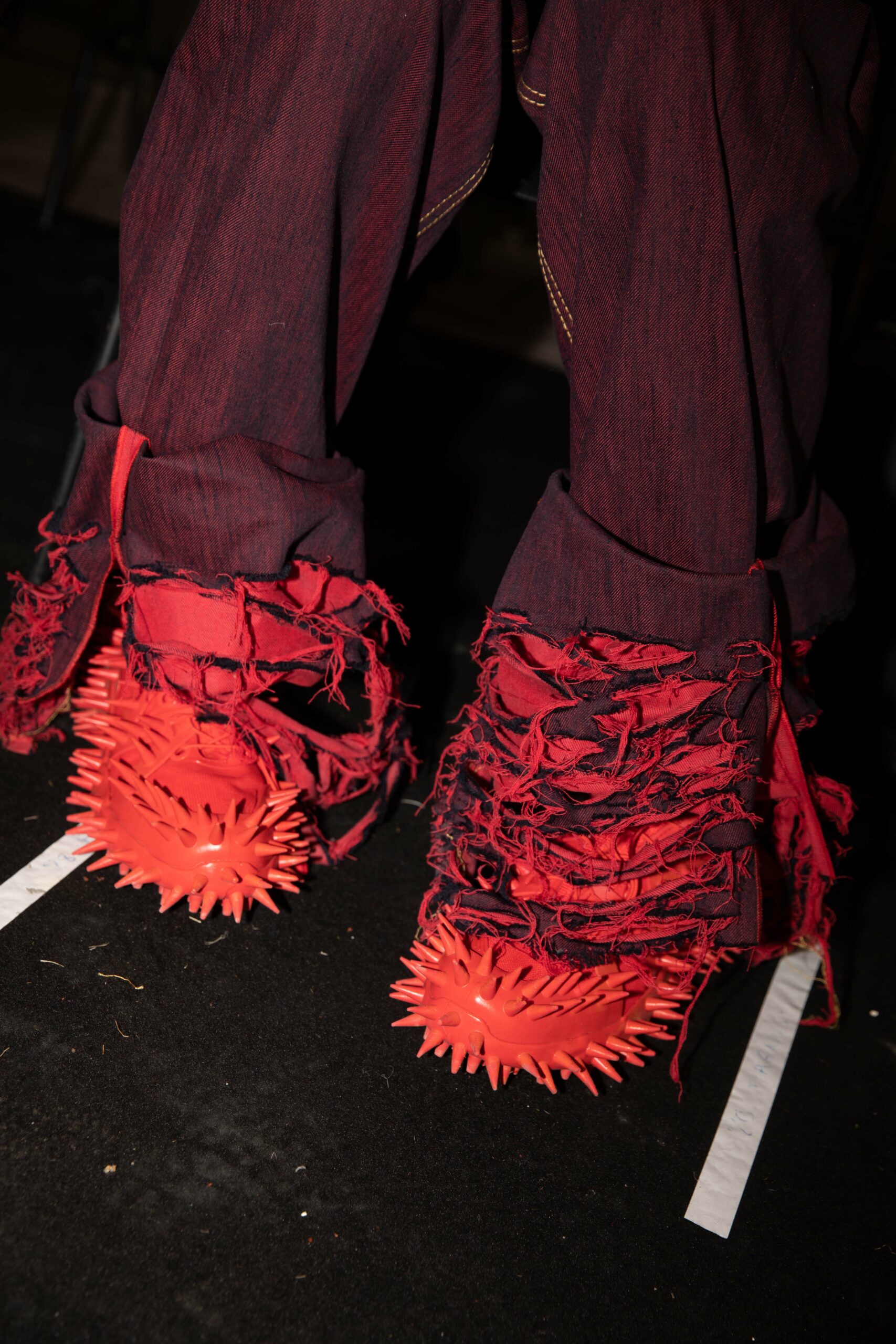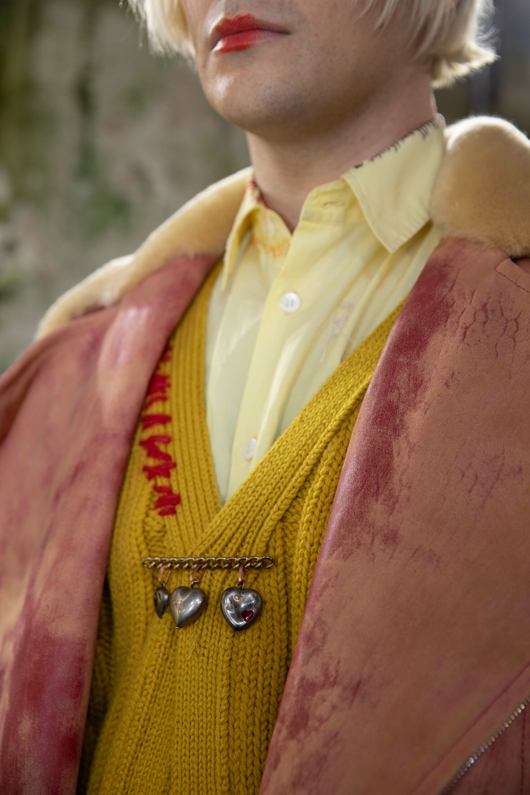 Big coats, big crombies, big jackets. Shrunken jackets. Shredded dresses, shredded shirts, shredded trousers. Mended jumpers, outsized jumpers, jumpers with sleeves dangling to the floor. Trousers falling off. Sartorial suits are completely handmade by Attolini, capturing the emotion of tradition in the touch of the hand, defying mechanical reproduction. Like spectrograms, the words of Dan Colen and Lexie Smith bring a secret code within mending. Mending and stitching everywhere, making old things new, keeping them together with a gesture of affection. Spiky pumps, spiky boots, spiky bags.