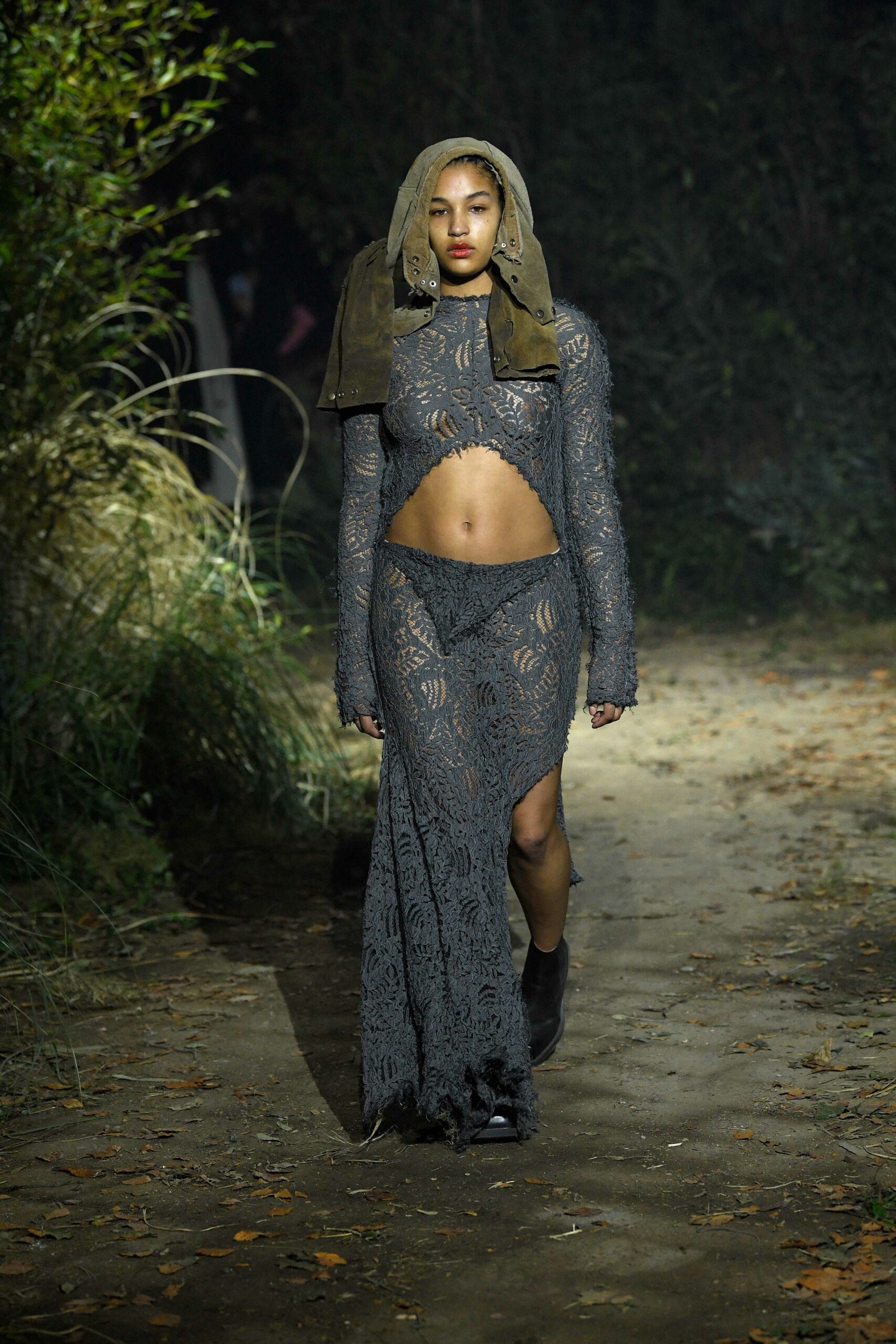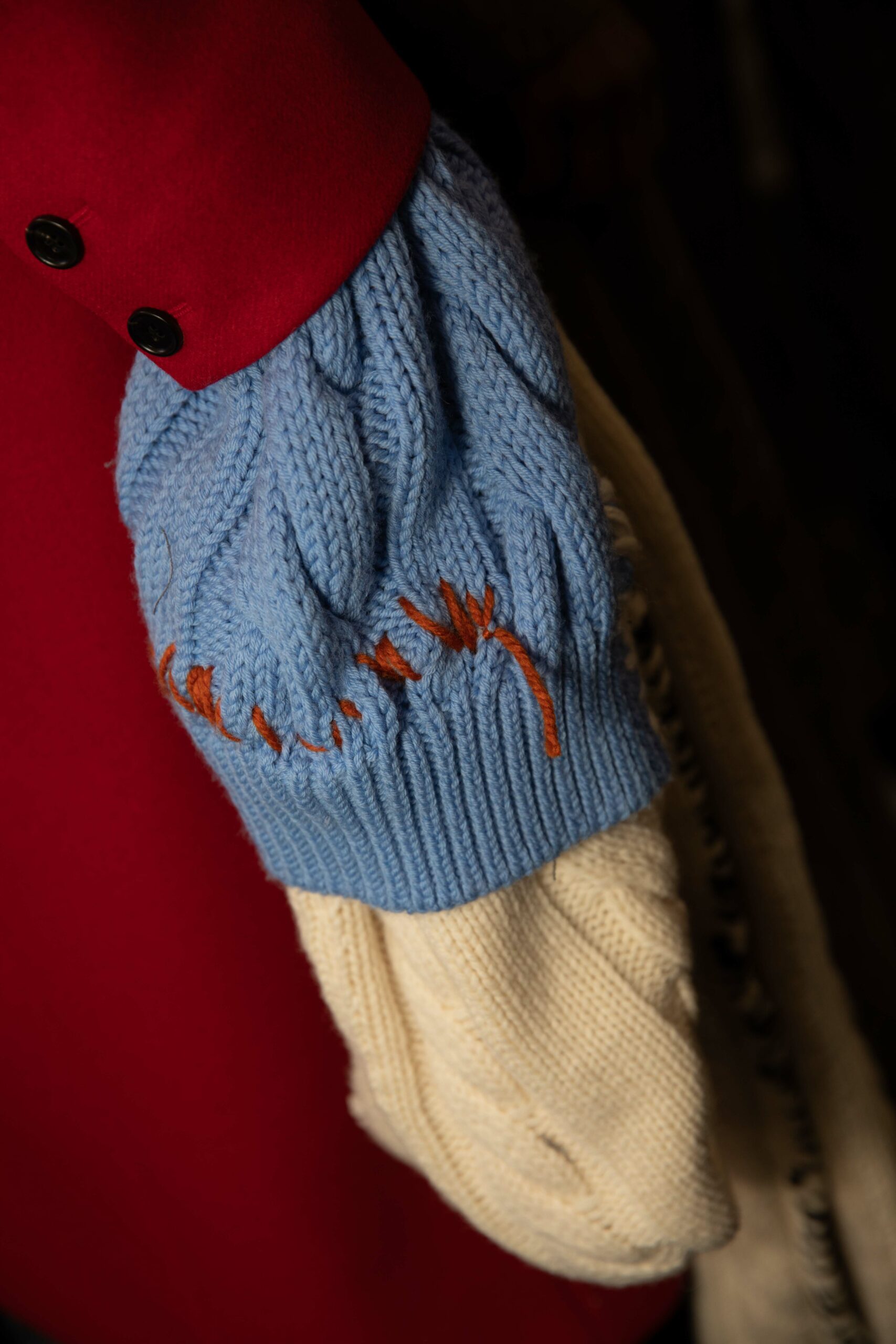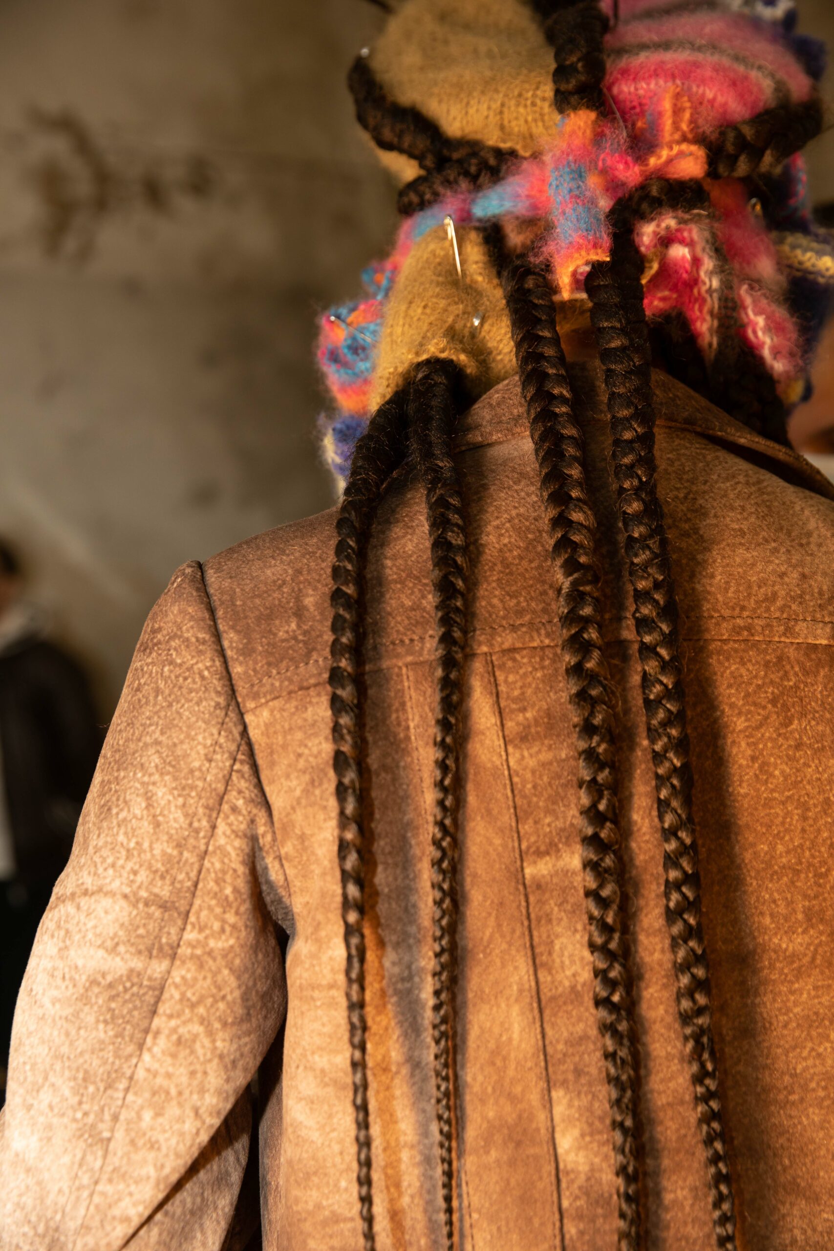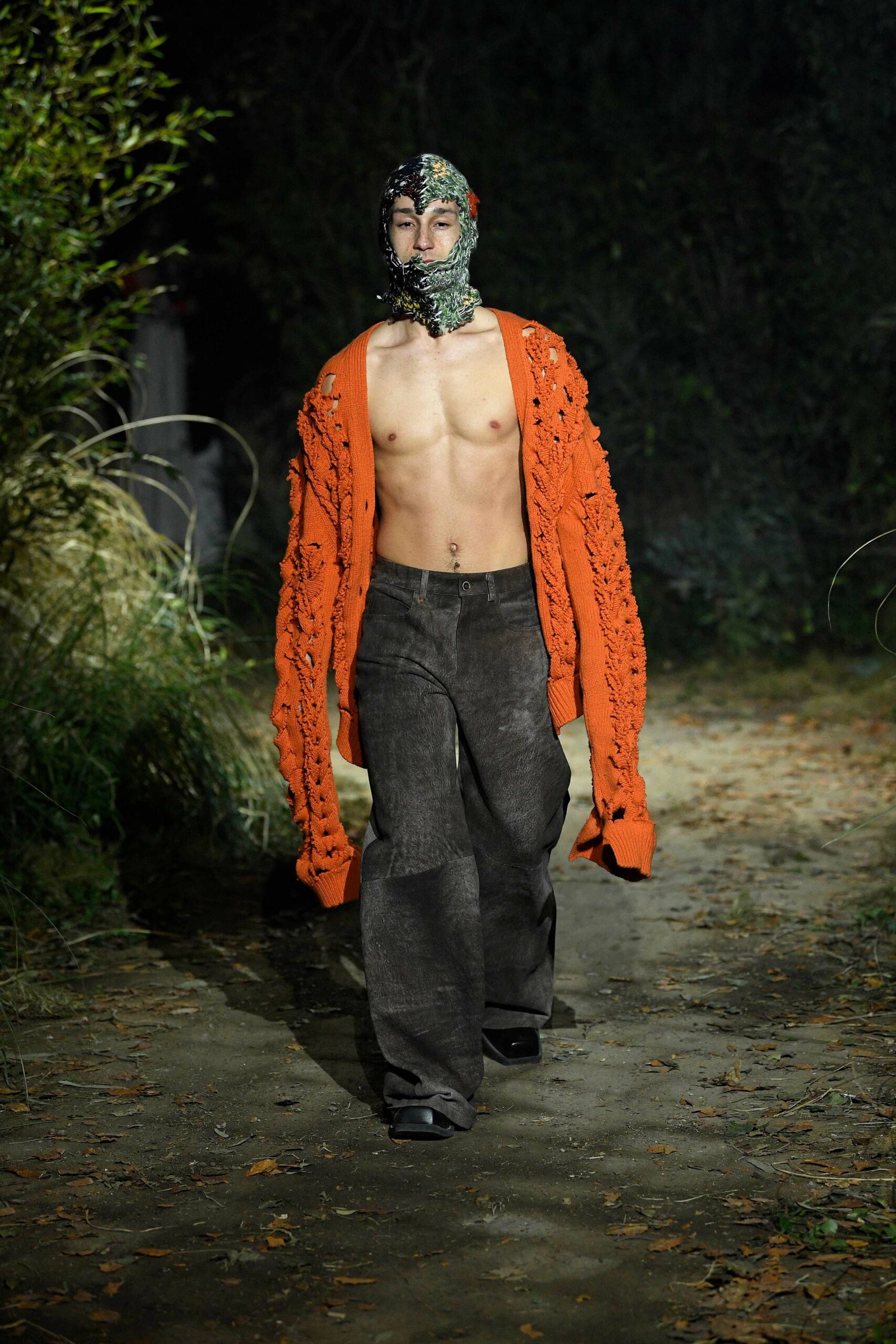 Big coats, big crombies, big jackets. Shrunken jackets. Shredded dresses, shredded shirts, shredded trousers. Mended jumpers, outsized jumpers, jumpers with sleeves dangling to the floor. Trousers falling off. Sartorial suits are completely handmade by Attolini, capturing the emotion of tradition in the touch of the hand, defying mechanical reproduction. Like spectrograms, the words of Dan Colen and Lexie Smith bring a secret code within mending. Mending and stitching everywhere, making old things new, keeping them together with a gesture of affection. Spiky pumps, spiky boots, spiky bags.
